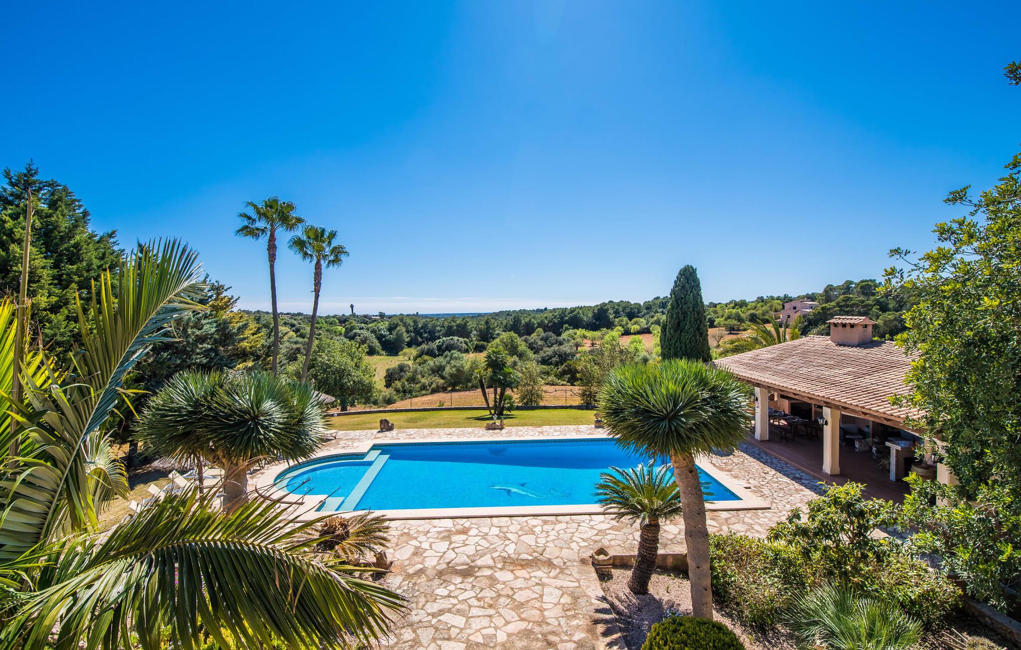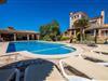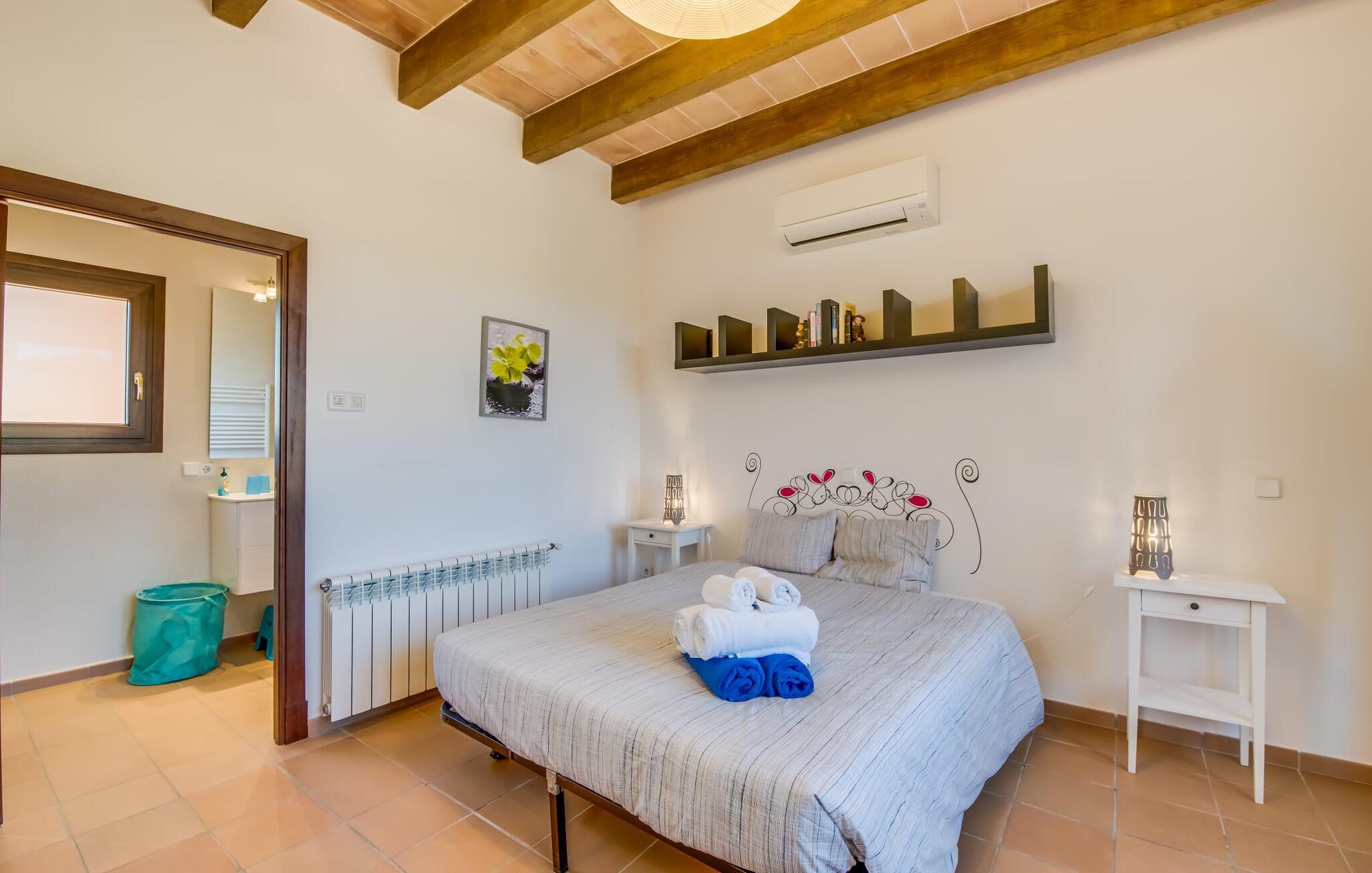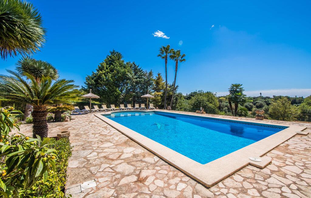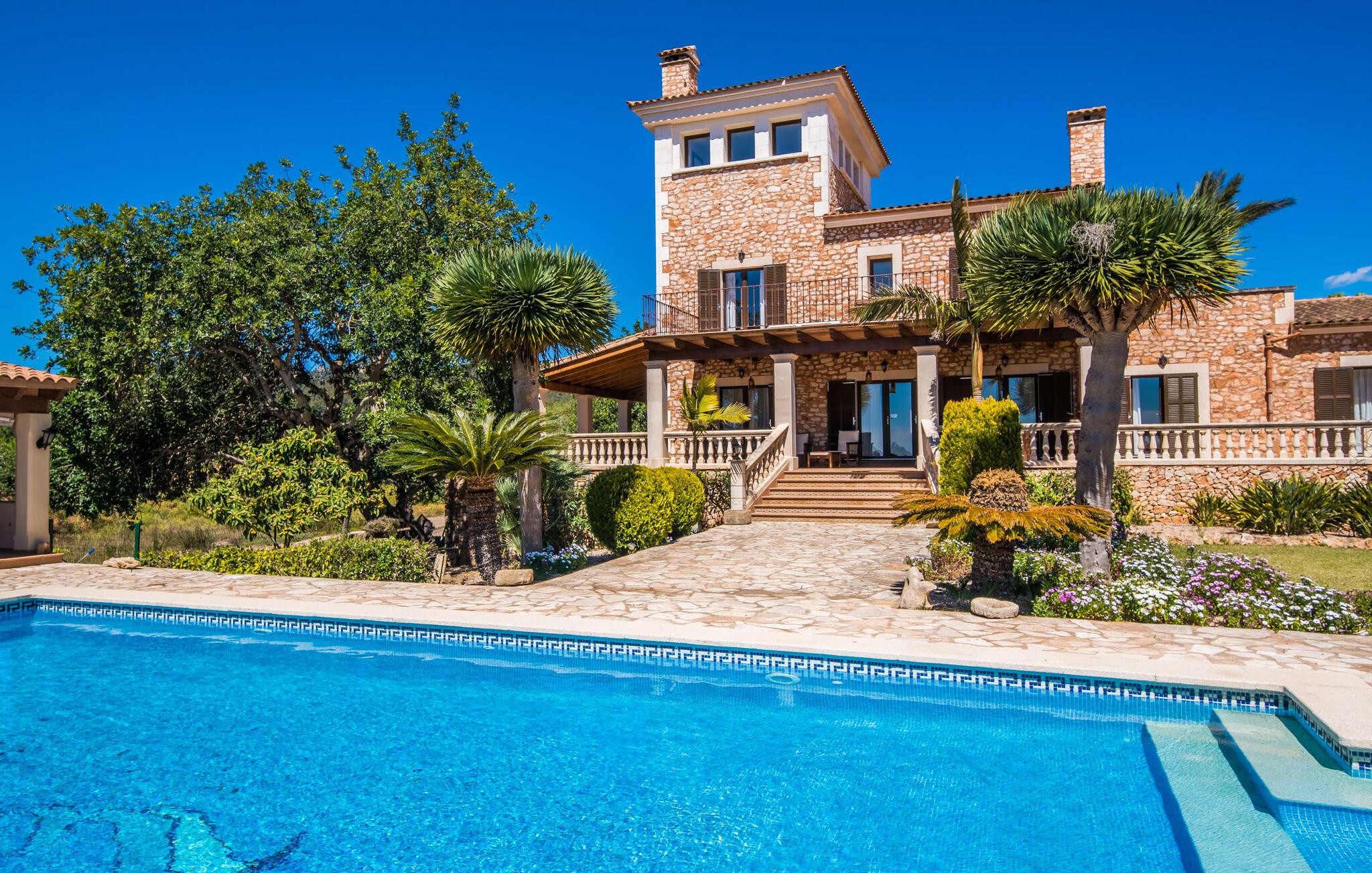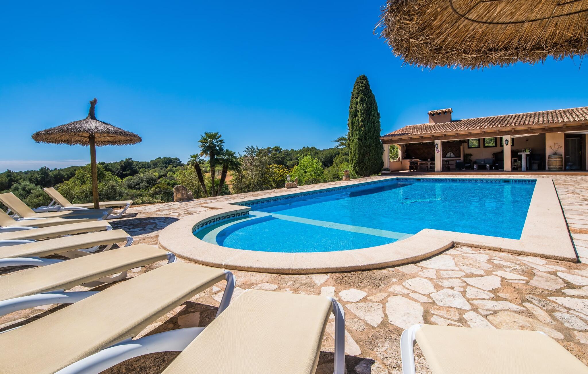 "Villa Can Palleta Nou" er et fantastisk naturstenshus med et imponerende tårn og store terrasseområder, der tilbyder både solrige og skyggefulde steder med udsigt over haven. Slap af ved den store pool på den brolagte terrasse under en parasol eller nyd jeres måltider i det udendørs køkken med spisebord og komfortabelt siddeområde, mens I ser på det smukke grønne område. Den let skrånende pool er ideel til børn, som også har plads nok til at lege på græsplænen eller nyde et spil bordtennis. Denne rummelige villa har et varmt og indbydende interiør domineret af brunt træ og naturlige toner. I stueplan er der et veludstyret køkken, som løber ud i en mindre spiseplads med en charmerende muret pejs. En større spisestue har en stor lysekrone og et slående sort klaver. Stuen byder på en behagelig sofa til afslappende aftener ved pejsen eller foran fjernsynet. Stueetagen har tre soveværelser og fire moderne badeværelser, mens der ovenpå er yderligere to soveværelser og et badeværelse, hvoraf det ene har jacuzzi til ultimativ afslapning efter træning i fitnesscenteret i tårnrummet. Villaen “Can Palleta Nou” nær S'Horta, i den smukke sydlige del af øen, ligger ca. 1 km fra den idylliske landsby Calonge med butikker og restauranter. Den lille by S'Horta med dens supermarkeder, en café og den imponerende kirke Esglesia Sant Isidre ligger 2,6 km derfra. Den nærmeste strand ligger kun ca. 5 km væk. Aircondition i ejendommen er inkluderet i prisen, men dets brug er begrænset til kl. 21.00 til 07.00. Gebyret afregnes herefter kontant på stedet.