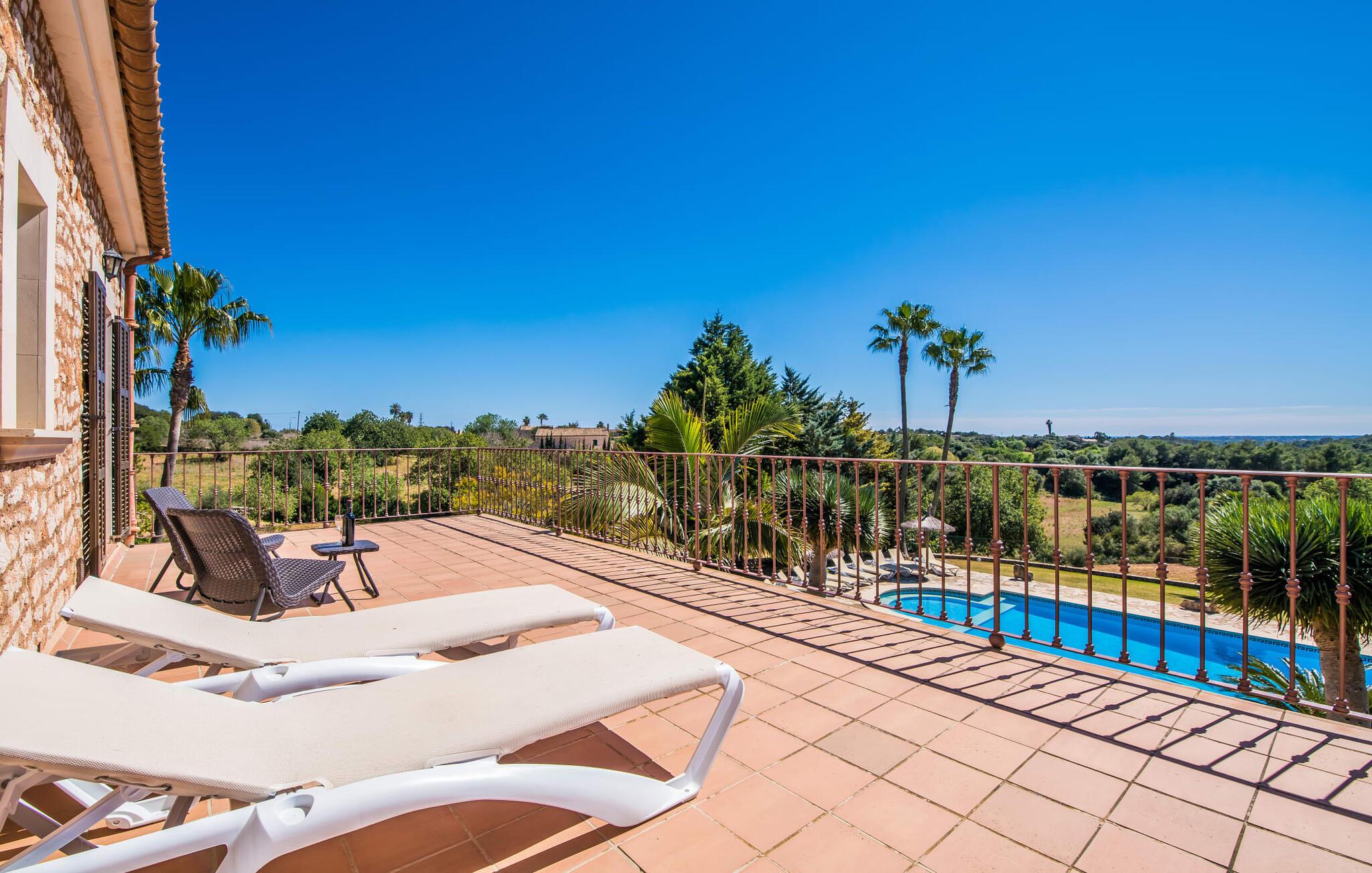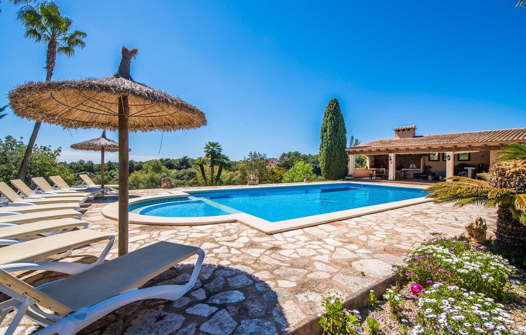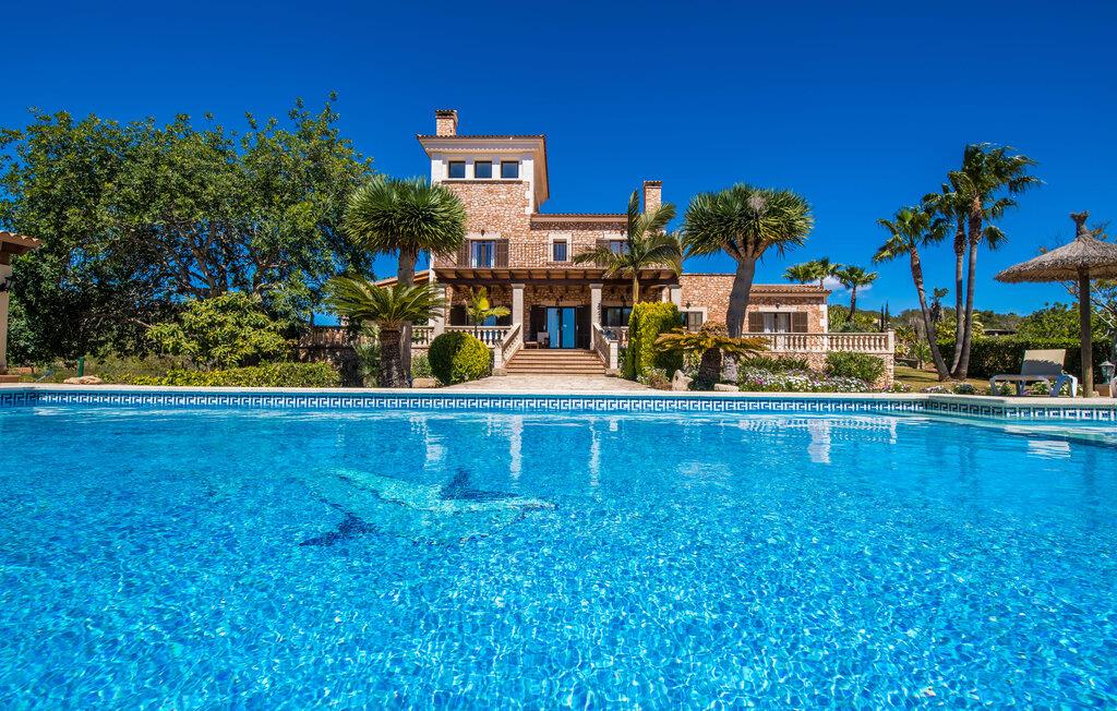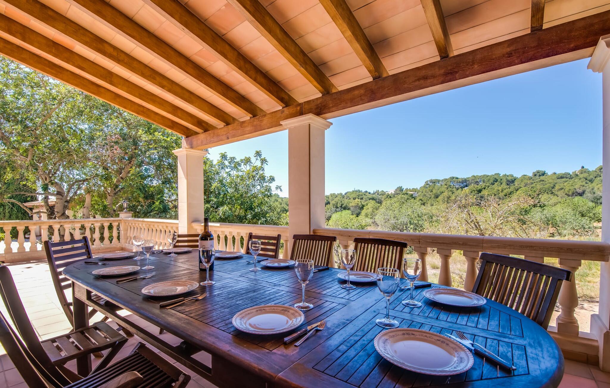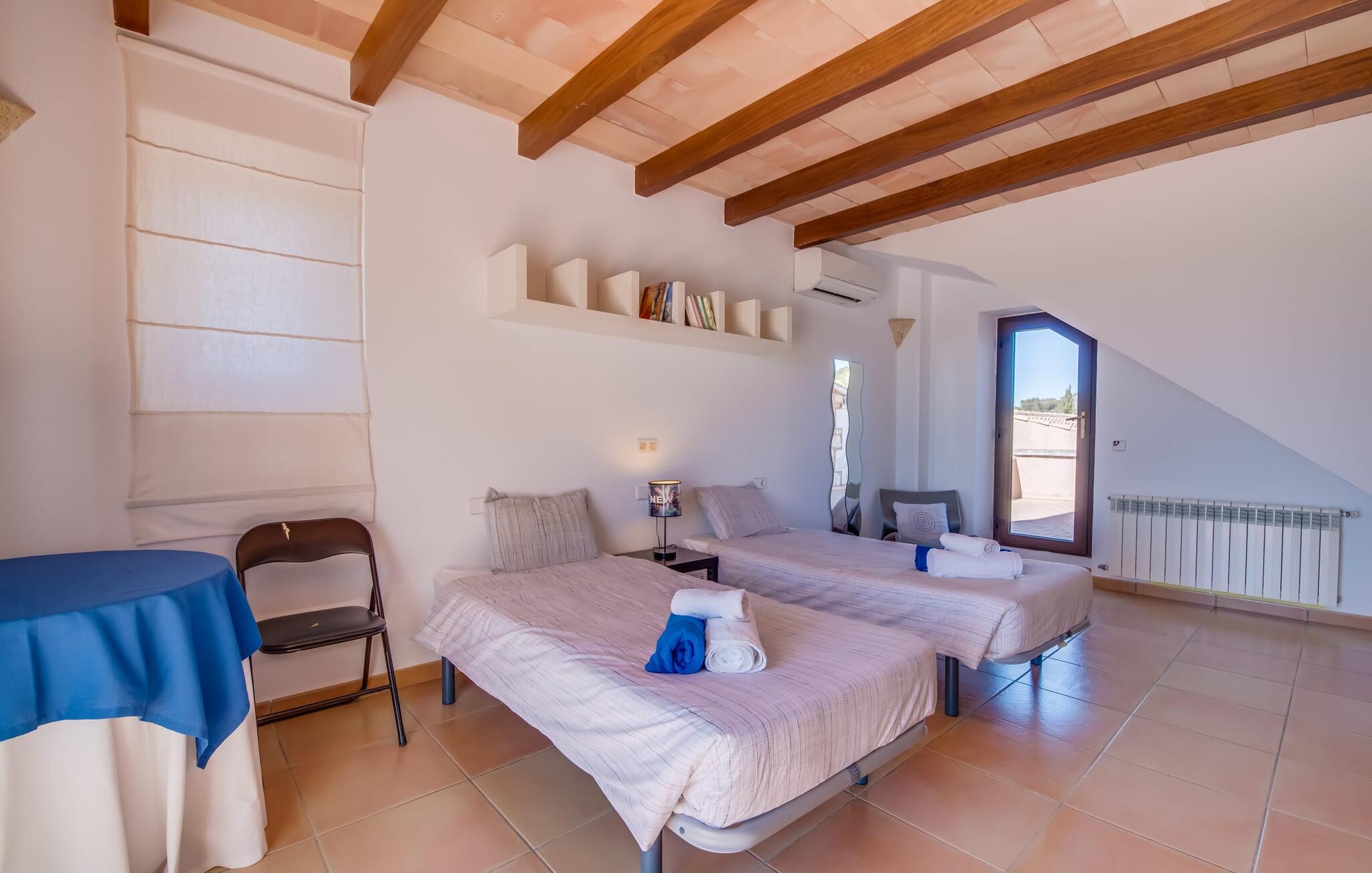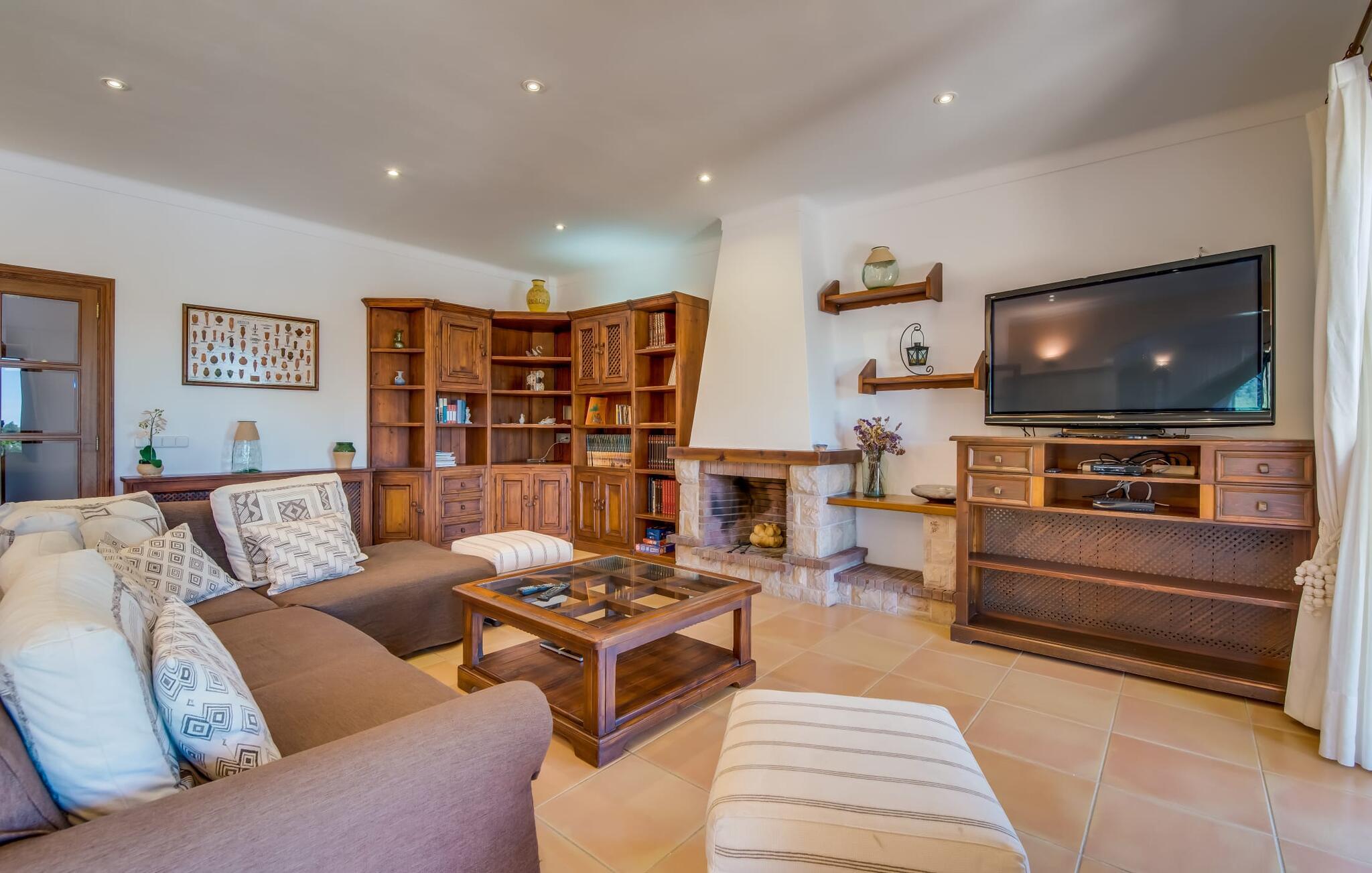 "Villa Can Palleta Nou" er et fantastisk naturstenshus med et imponerende tårn og store terrasseområder, der tilbyder både solrige og skyggefulde steder med udsigt over haven. Slap af ved den store pool på den brolagte terrasse under en parasol eller nyd jeres måltider i det udendørs køkken med spisebord og komfortabelt siddeområde, mens I ser på det smukke grønne område. Den let skrånende pool er ideel til børn, som også har plads nok til at lege på græsplænen eller nyde et spil bordtennis. Denne rummelige villa har et varmt og indbydende interiør domineret af brunt træ og naturlige toner. I stueplan er der et veludstyret køkken, som løber ud i en mindre spiseplads med en charmerende muret pejs. En større spisestue har en stor lysekrone og et slående sort klaver. Stuen byder på en behagelig sofa til afslappende aftener ved pejsen eller foran fjernsynet. Stueetagen har tre soveværelser og fire moderne badeværelser, mens der ovenpå er yderligere to soveværelser og et badeværelse, hvoraf det ene har jacuzzi til ultimativ afslapning efter træning i fitnesscenteret i tårnrummet. Villaen “Can Palleta Nou” nær S'Horta, i den smukke sydlige del af øen, ligger ca. 1 km fra den idylliske landsby Calonge med butikker og restauranter. Den lille by S'Horta med dens supermarkeder, en café og den imponerende kirke Esglesia Sant Isidre ligger 2,6 km derfra. Den nærmeste strand ligger kun ca. 5 km væk. Aircondition i ejendommen er inkluderet i prisen, men dets brug er begrænset til kl. 21.00 til 07.00. Gebyret afregnes herefter kontant på stedet.