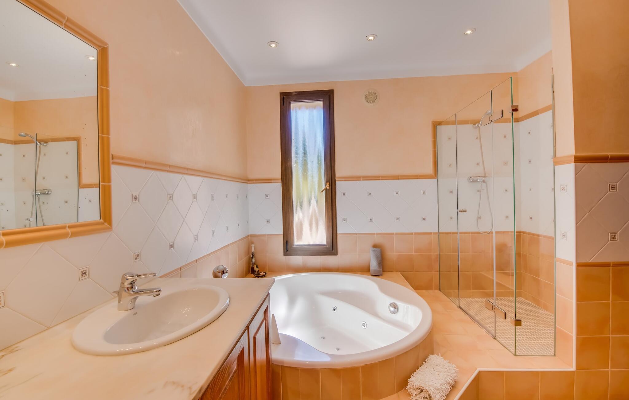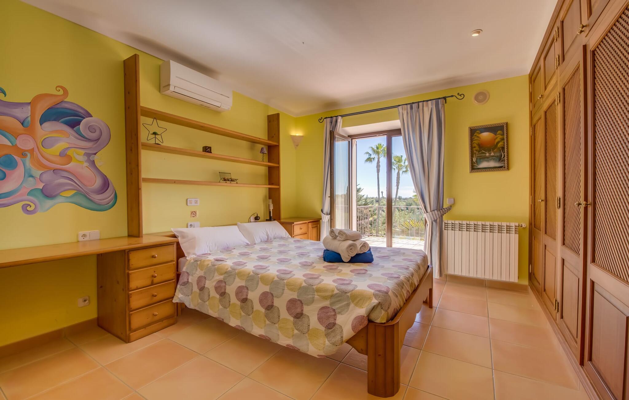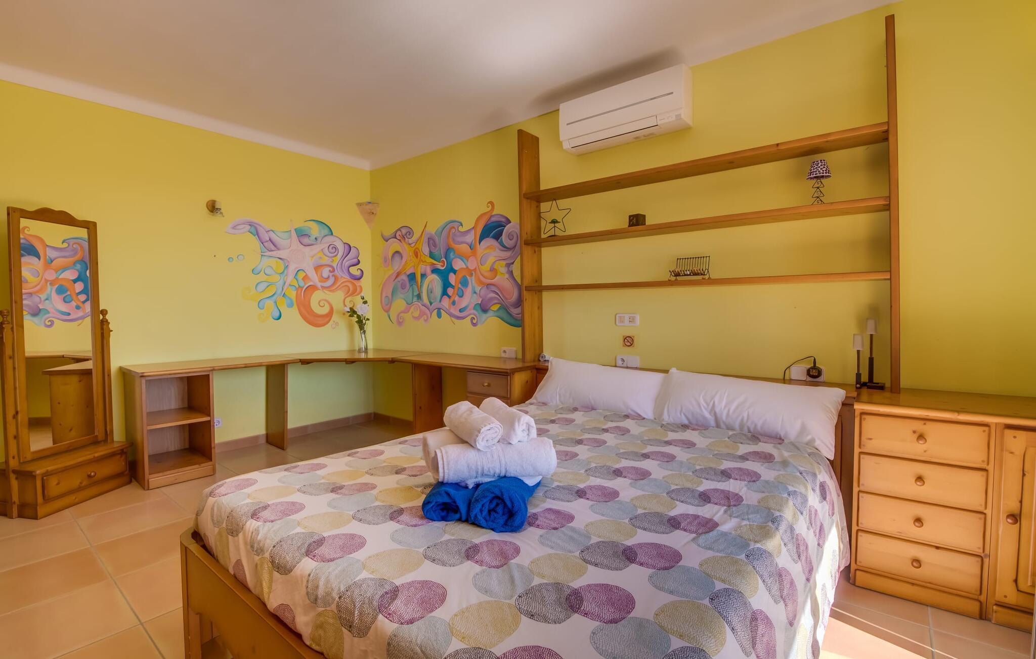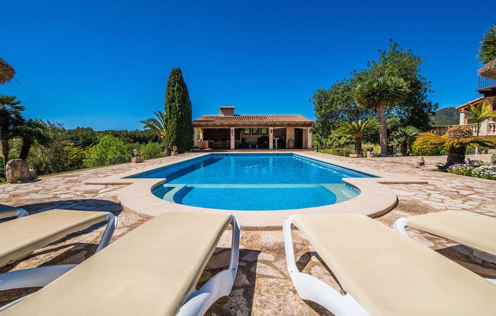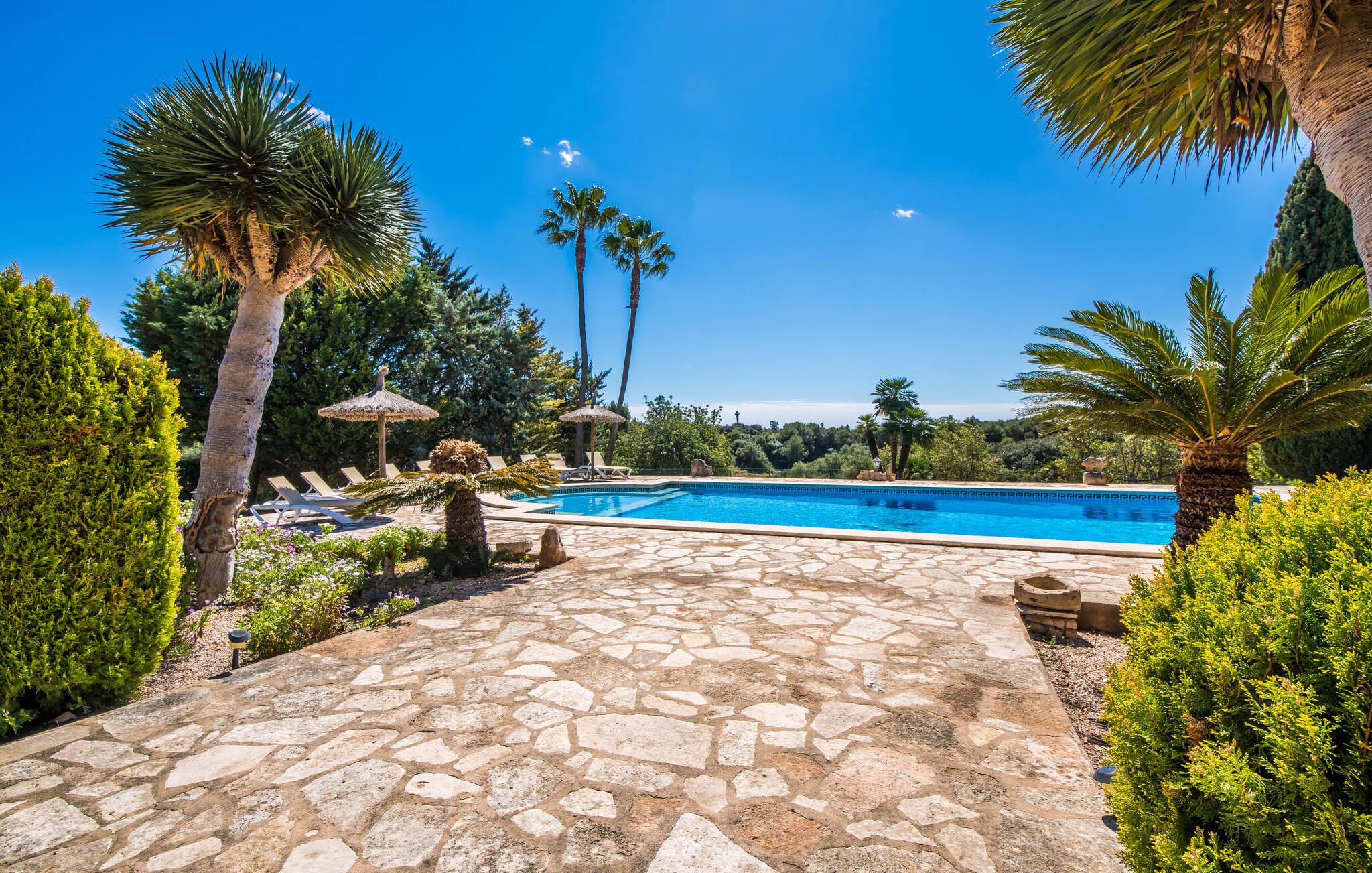 "Villa Can Palleta Nou" er et fantastisk naturstenshus med et imponerende tårn og store terrasseområder, der tilbyder både solrige og skyggefulde steder med udsigt over haven. Slap af ved den store pool på den brolagte terrasse under en parasol eller nyd jeres måltider i det udendørs køkken med spisebord og komfortabelt siddeområde, mens I ser på det smukke grønne område. Den let skrånende pool er ideel til børn, som også har plads nok til at lege på græsplænen eller nyde et spil bordtennis. Denne rummelige villa har et varmt og indbydende interiør domineret af brunt træ og naturlige toner. I stueplan er der et veludstyret køkken, som løber ud i en mindre spiseplads med en charmerende muret pejs. En større spisestue har en stor lysekrone og et slående sort klaver. Stuen byder på en behagelig sofa til afslappende aftener ved pejsen eller foran fjernsynet. Stueetagen har tre soveværelser og fire moderne badeværelser, mens der ovenpå er yderligere to soveværelser og et badeværelse, hvoraf det ene har jacuzzi til ultimativ afslapning efter træning i fitnesscenteret i tårnrummet. Villaen “Can Palleta Nou” nær S'Horta, i den smukke sydlige del af øen, ligger ca. 1 km fra den idylliske landsby Calonge med butikker og restauranter. Den lille by S'Horta med dens supermarkeder, en café og den imponerende kirke Esglesia Sant Isidre ligger 2,6 km derfra. Den nærmeste strand ligger kun ca. 5 km væk. Aircondition i ejendommen er inkluderet i prisen, men dets brug er begrænset til kl. 21.00 til 07.00. Gebyret afregnes herefter kontant på stedet.