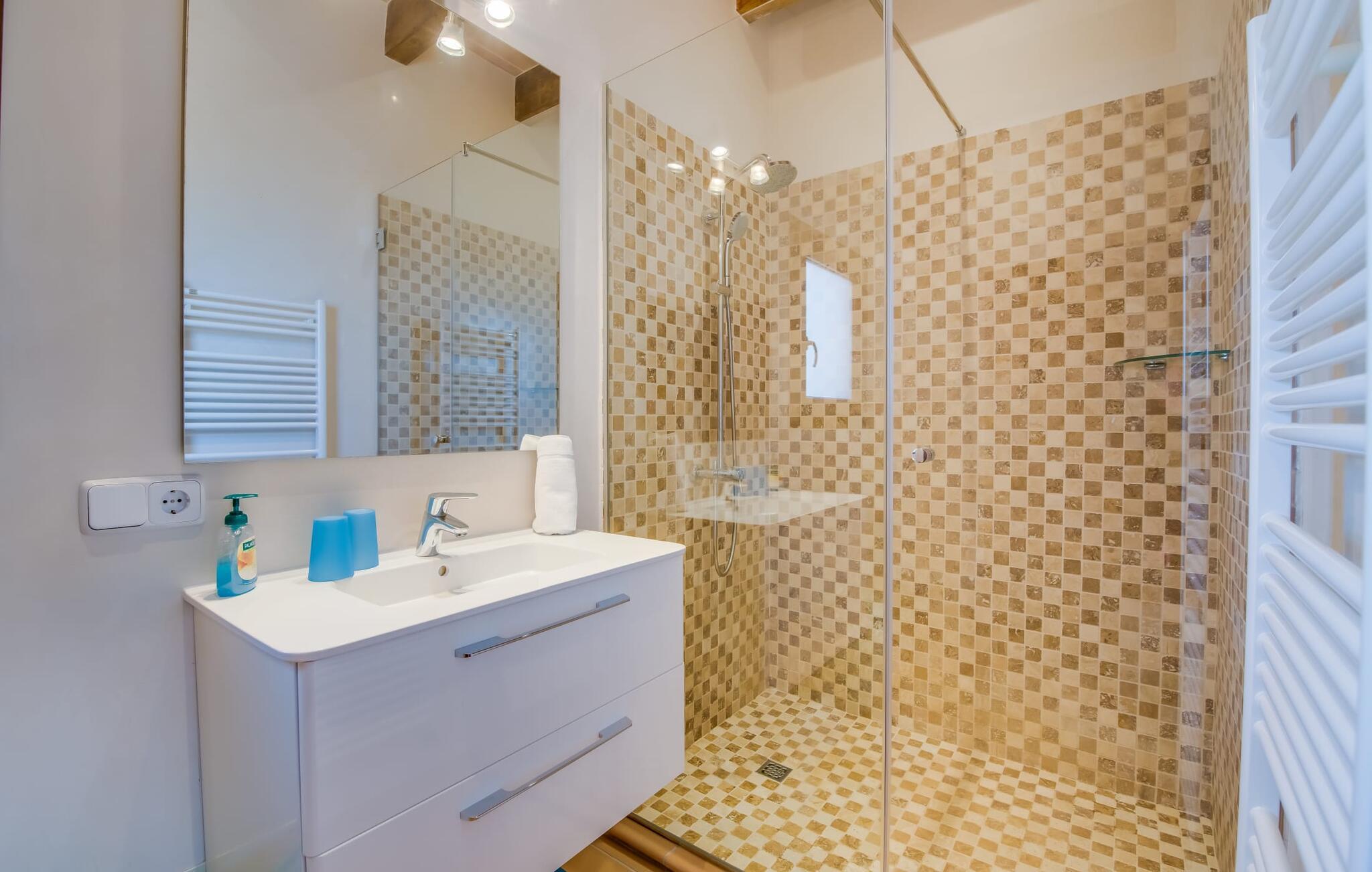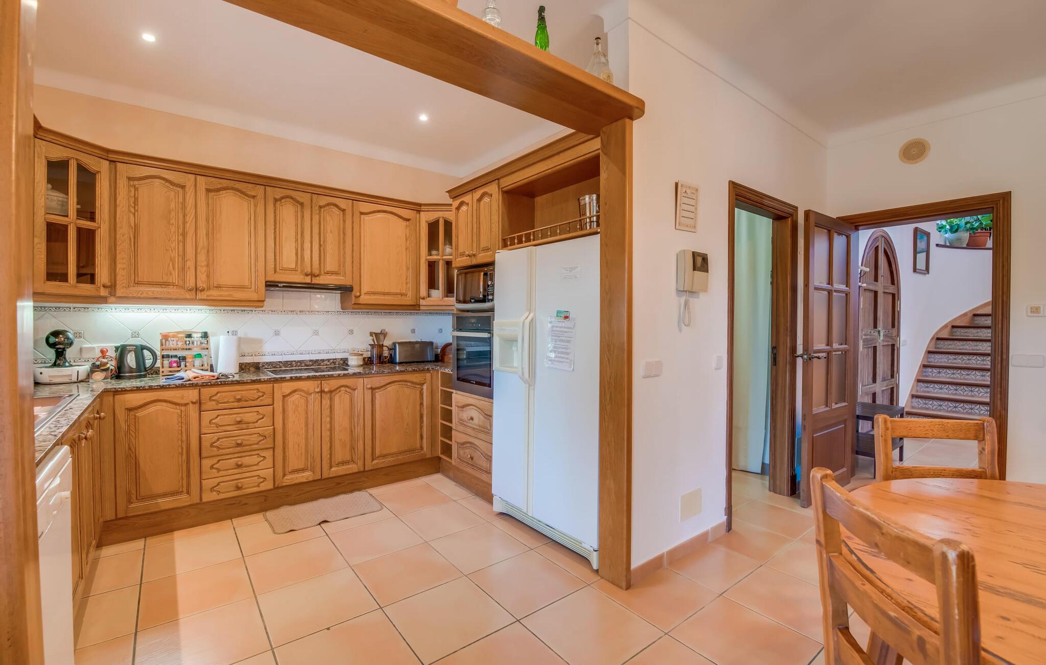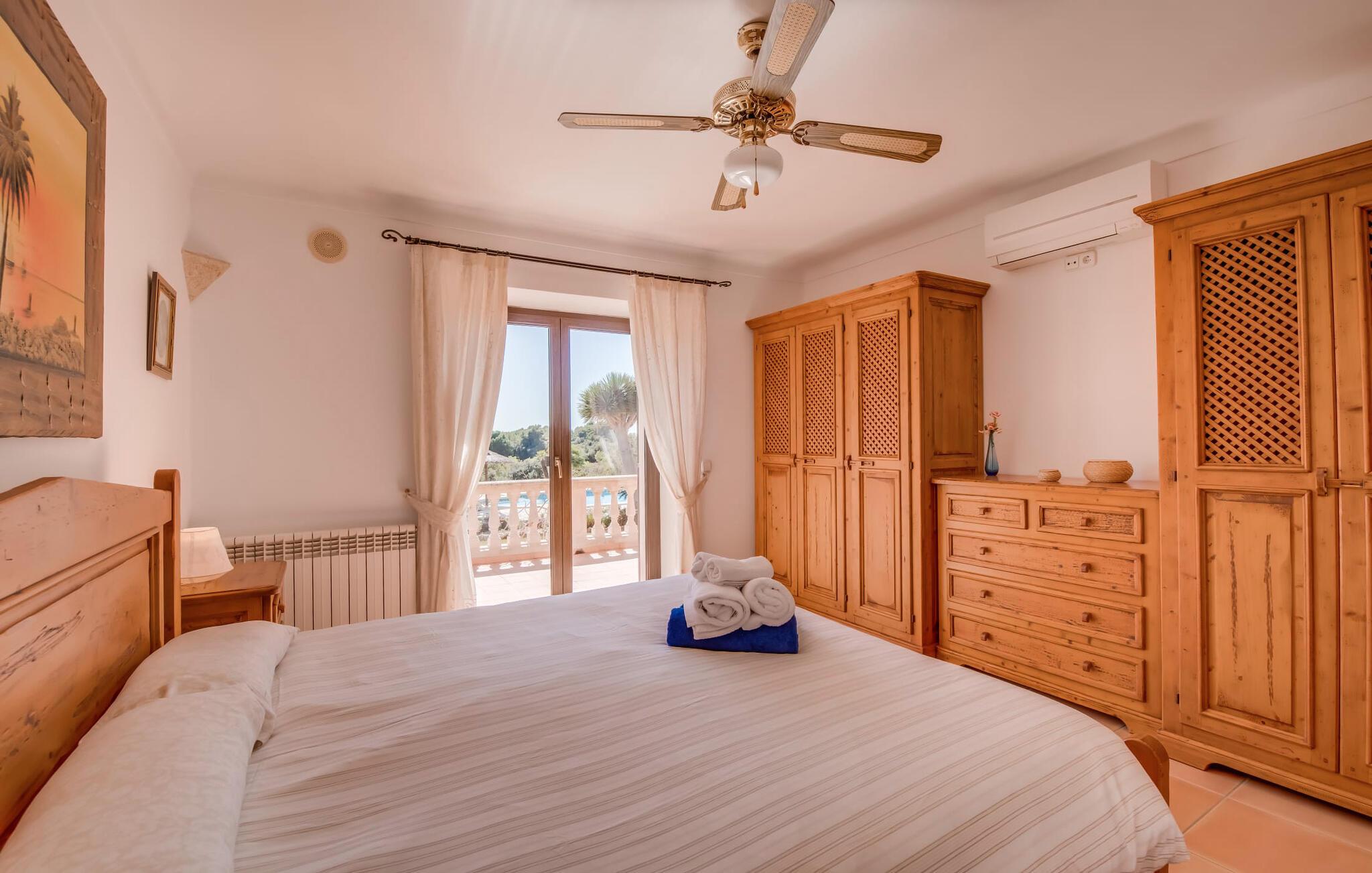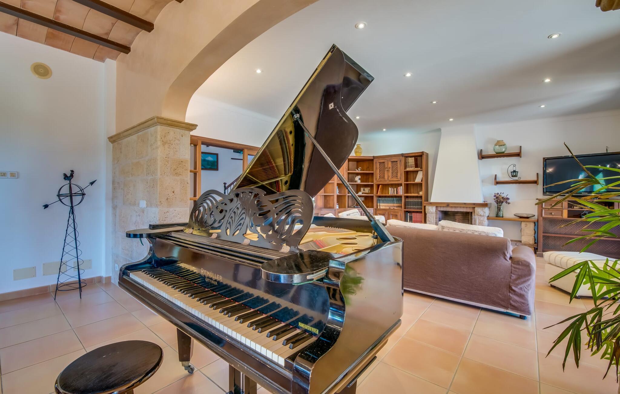 "Villa Can Palleta Nou" er et fantastisk naturstenshus med et imponerende tårn og store terrasseområder, der tilbyder både solrige og skyggefulde steder med udsigt over haven. Slap af ved den store pool på den brolagte terrasse under en parasol eller nyd jeres måltider i det udendørs køkken med spisebord og komfortabelt siddeområde, mens I ser på det smukke grønne område. Den let skrånende pool er ideel til børn, som også har plads nok til at lege på græsplænen eller nyde et spil bordtennis. Denne rummelige villa har et varmt og indbydende interiør domineret af brunt træ og naturlige toner. I stueplan er der et veludstyret køkken, som løber ud i en mindre spiseplads med en charmerende muret pejs. En større spisestue har en stor lysekrone og et slående sort klaver. Stuen byder på en behagelig sofa til afslappende aftener ved pejsen eller foran fjernsynet. Stueetagen har tre soveværelser og fire moderne badeværelser, mens der ovenpå er yderligere to soveværelser og et badeværelse, hvoraf det ene har jacuzzi til ultimativ afslapning efter træning i fitnesscenteret i tårnrummet. Villaen “Can Palleta Nou” nær S'Horta, i den smukke sydlige del af øen, ligger ca. 1 km fra den idylliske landsby Calonge med butikker og restauranter. Den lille by S'Horta med dens supermarkeder, en café og den imponerende kirke Esglesia Sant Isidre ligger 2,6 km derfra. Den nærmeste strand ligger kun ca. 5 km væk. Aircondition i ejendommen er inkluderet i prisen, men dets brug er begrænset til kl. 21.00 til 07.00. Gebyret afregnes herefter kontant på stedet.