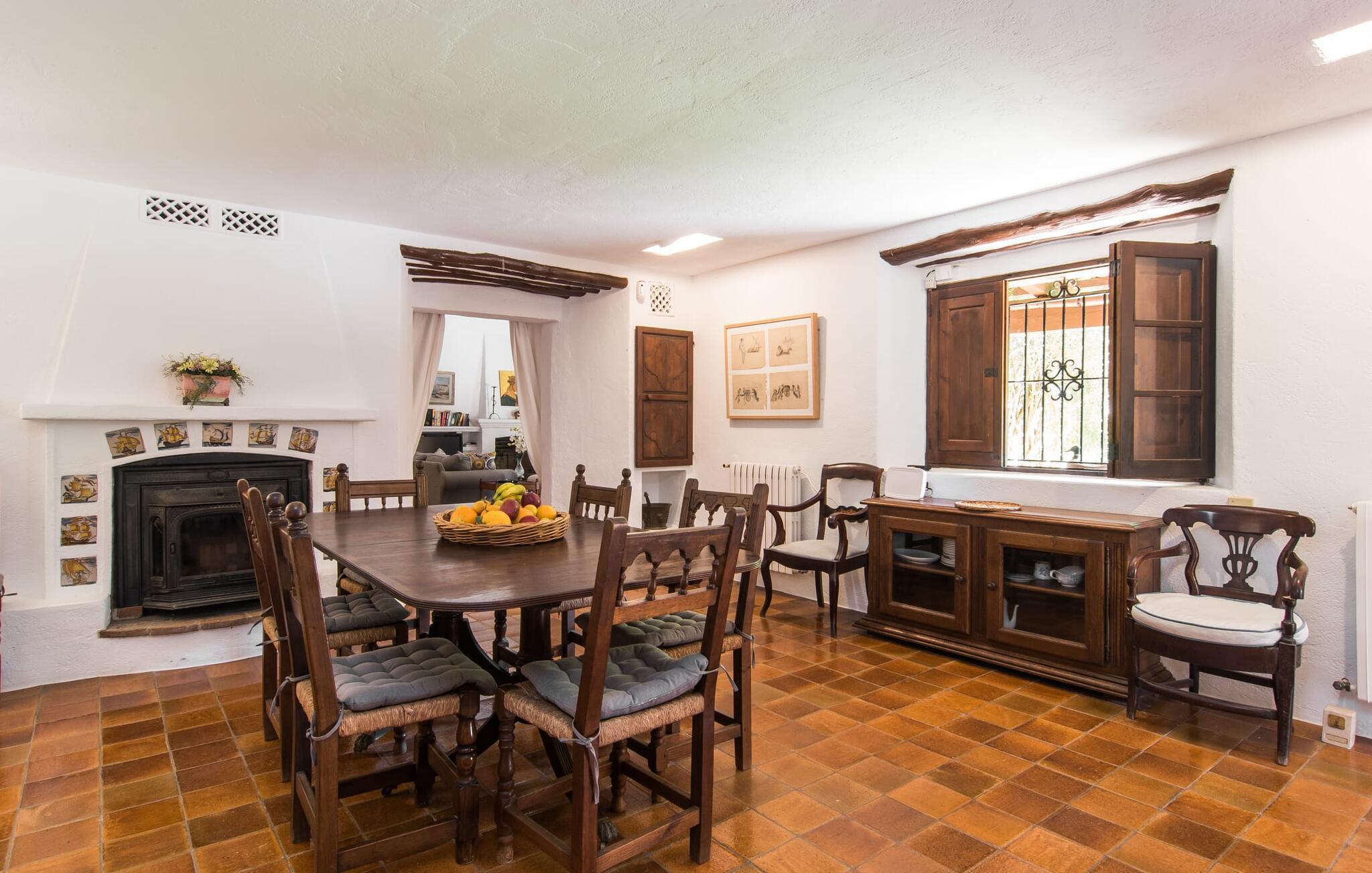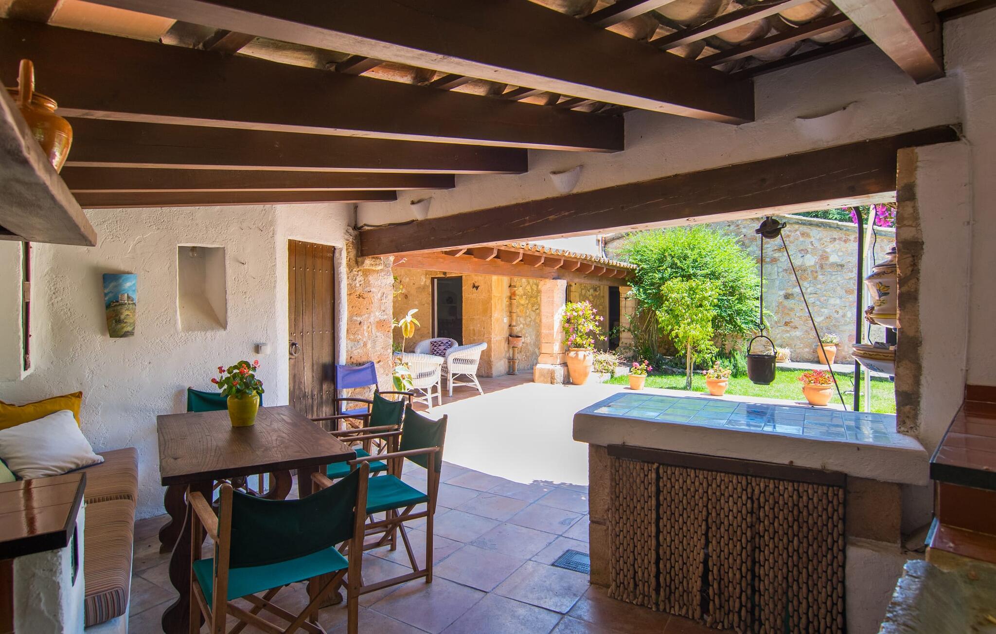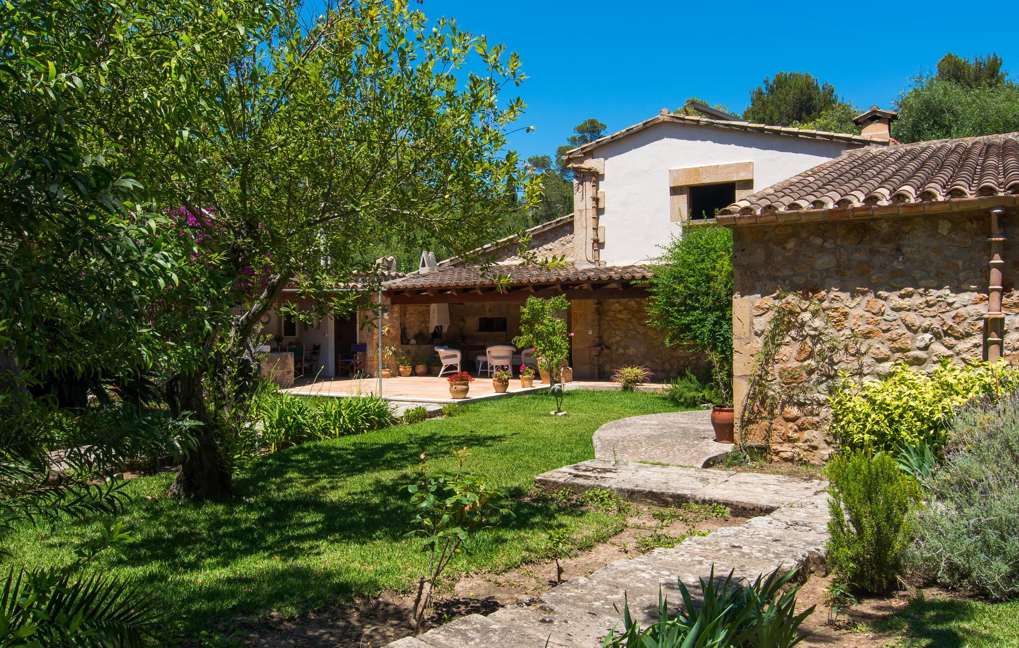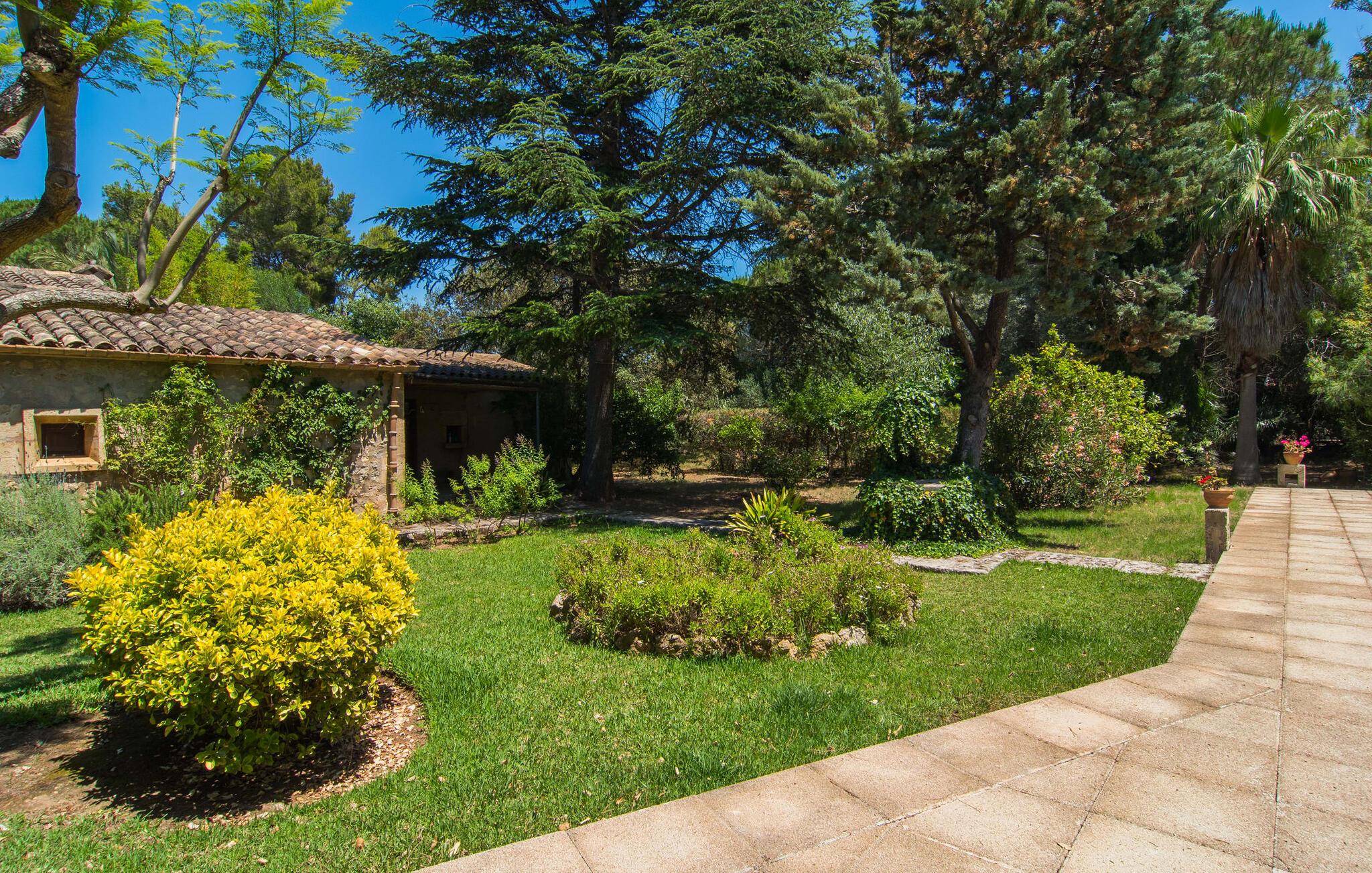 Hvis I leder efter et rigtigt tilflugtssted for en fuldstændig afslappende ferie, finder I det her! På et areal på 2.000 m² med smukke træer og blomster vil I finde ægte fred omkring dette hyggelige feriehus på Mallorca uden umiddelbart at befinde jer på et ensomt sted. De høje, varierede træer og buske giver en indbydende følelse af tryghed og naturligvis en behagelig luftig naturlig skygge. Asfalterede stier fører til de forskellige smukke steder, herunder den lavvandede pool, der let nås via romerske trapper, og den omkringliggende terrasse, hvor komfortable liggestole venter på solbadere. Et overdækket område ved siden af inviterer jer til at slappe af i skyggen, mens I holder øje med de børn, der måske plasker rundt. Bordtennisbordet til den lejlighedsvise kamp står også i skyggen - den praktiske udendørs bruser lover at køle jer ned. Flere overdækkede arealer direkte ved huset byder på ekstra rustikke siddepladser til afslapning eller fællesspisning, for eksempel ved grillen, som kan varmes op i udekøkkenet om aftenen, og hvorpå middelhavsdelikatesser simrer. Det indre af "Can Papalaia" var også kærligt dekoreret. Atmosfæren i rummene kommer fra de mange små detaljer, der skal opdages: forskellige vægmalerier og andre vægdekorationer, smukke lamper, unikt tilbehør. Massive møbler, masser af træ inklusive klassiske træbjælker på lofterne afrunder harmonisk den charmerende mallorcanske flair. Det fuldt udstyrede køkken og spise-/stuen udgør hjertet af stueetagen, hvor der også er tre hyggelige dobbeltværelser - hvoraf det ene er forbundet med et enkeltværelse - og to badeværelser. På øverste etage er der et studielignende soveområde i åbent plan med eget badeværelse. Huset, som byder på 450 m² boligareal, kan bebos året rundt takket være varme og aircondition, pejsen kan også bruges, hvis det ønskes. Den idylliske finca "Can Papalaia" med en frodig have og privat pool er omgivet af grønne områder ved porten til Port de Pollença og bugten af samme navn. Indkøbsmuligheder er kun få minutter væk i bil. Den smukke kystby har også en fin sandstrand og adskillige barer og restauranter. Andre sandstrande kan også nås på kort tid, for eksempel ligger Can Cap de Bou kun 10 minutter væk i bil.