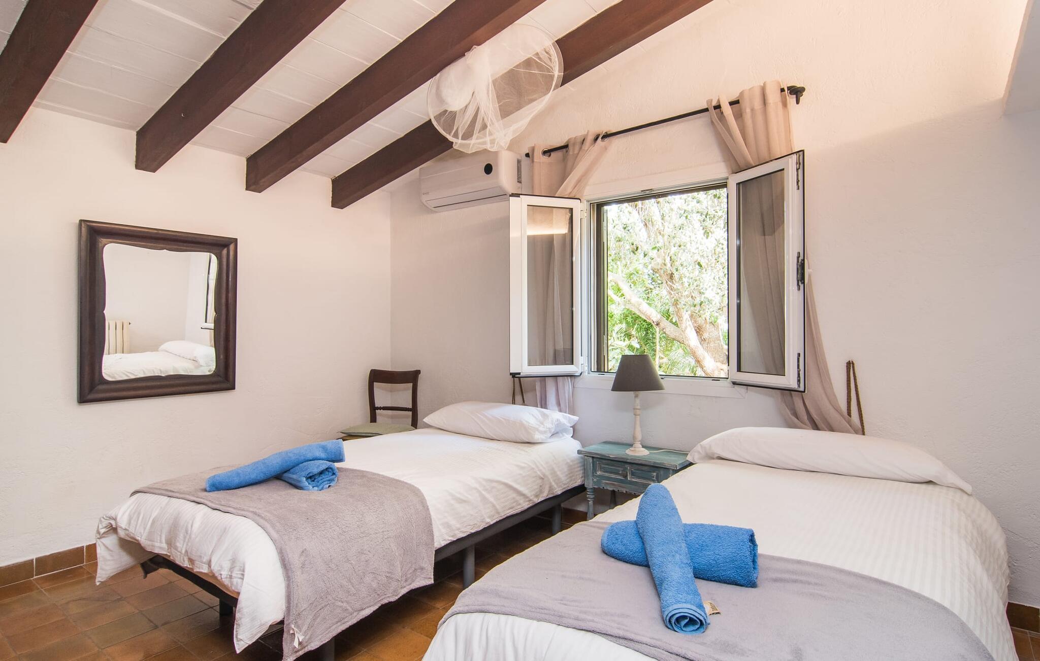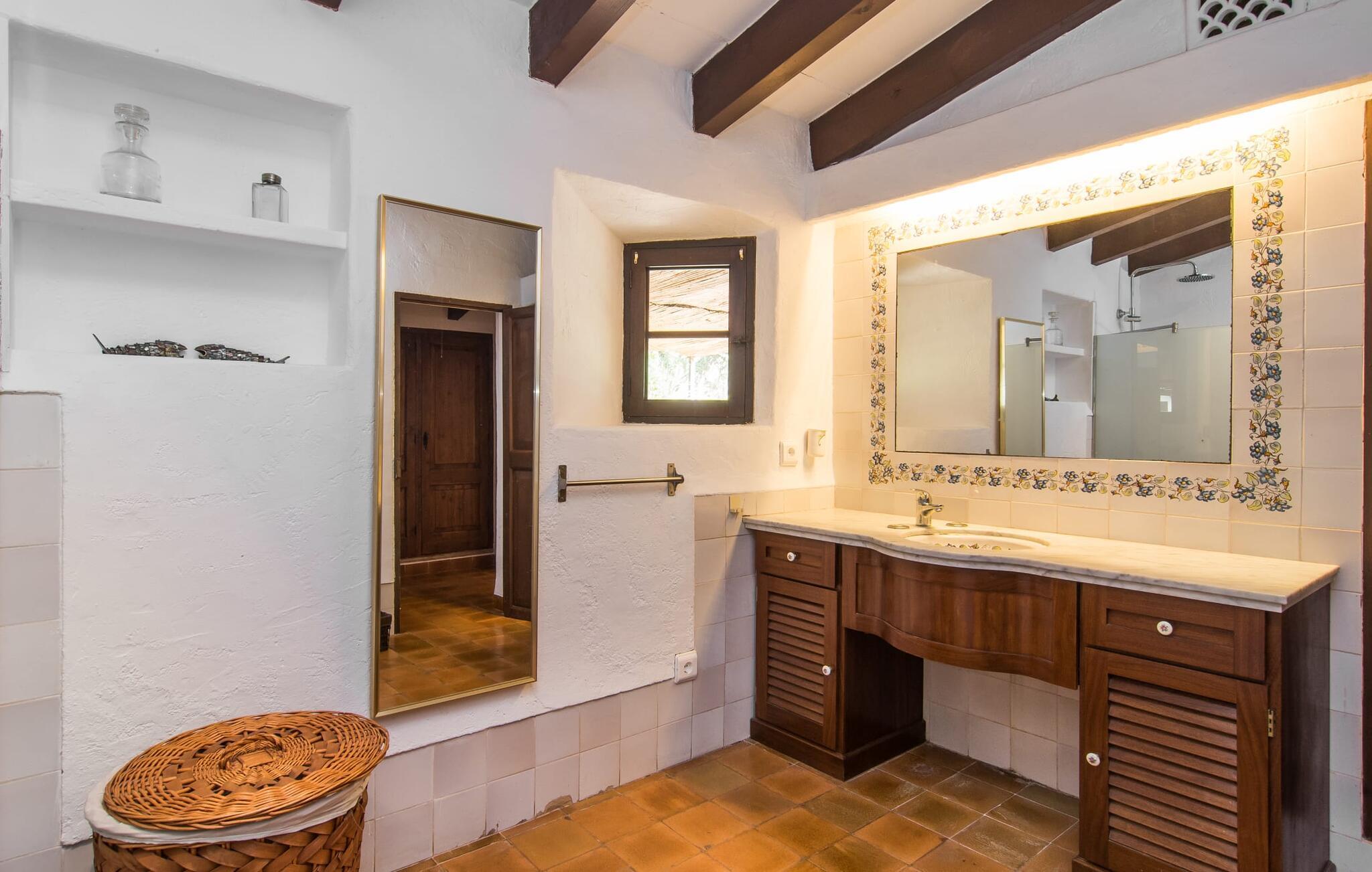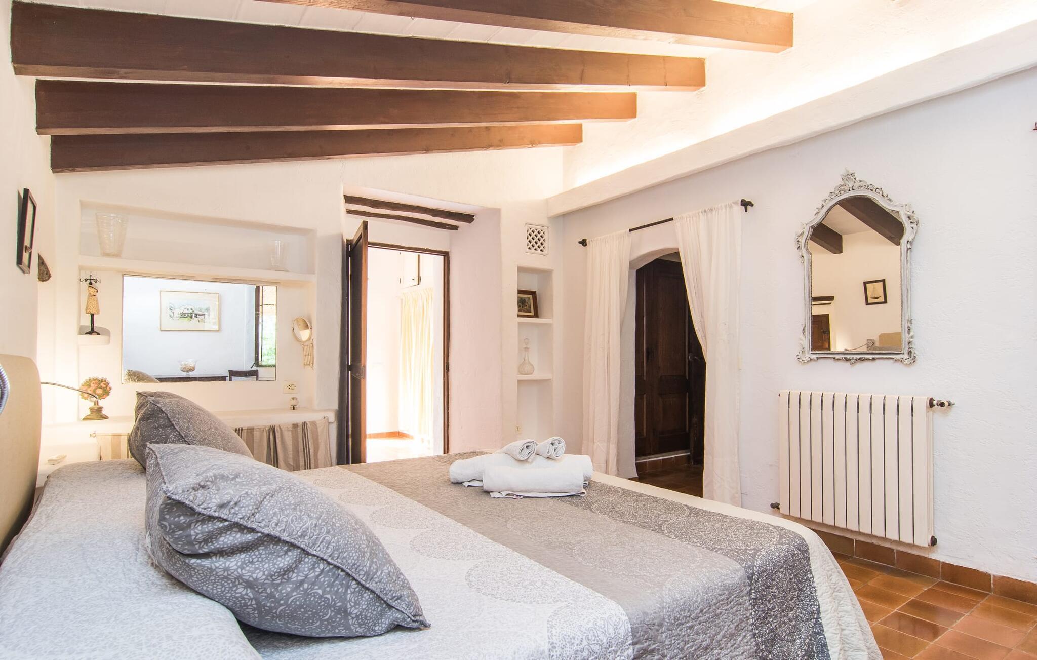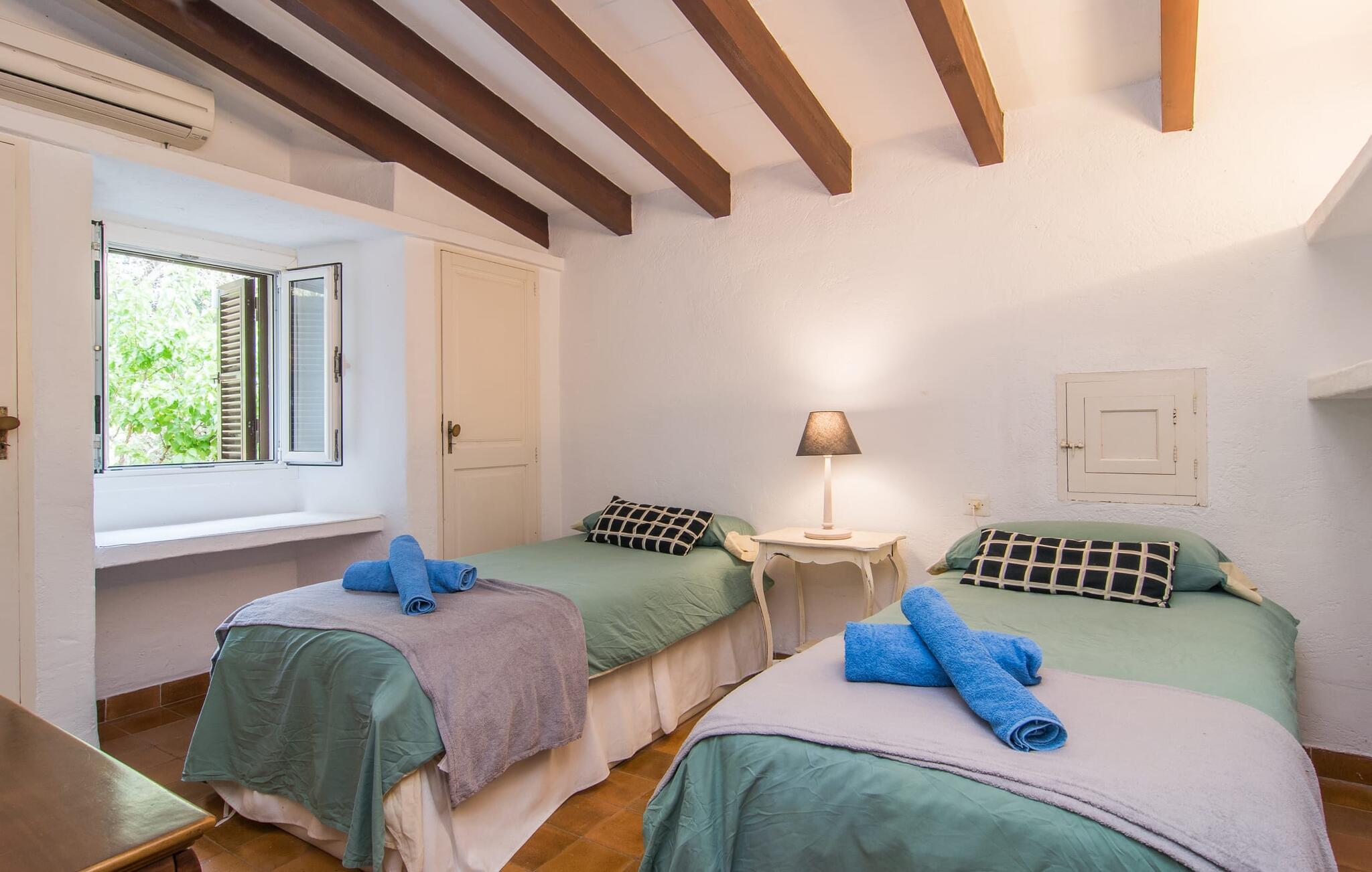 Hvis I leder efter et rigtigt tilflugtssted for en fuldstændig afslappende ferie, finder I det her! På et areal på 2.000 m² med smukke træer og blomster vil I finde ægte fred omkring dette hyggelige feriehus på Mallorca uden umiddelbart at befinde jer på et ensomt sted. De høje, varierede træer og buske giver en indbydende følelse af tryghed og naturligvis en behagelig luftig naturlig skygge. Asfalterede stier fører til de forskellige smukke steder, herunder den lavvandede pool, der let nås via romerske trapper, og den omkringliggende terrasse, hvor komfortable liggestole venter på solbadere. Et overdækket område ved siden af inviterer jer til at slappe af i skyggen, mens I holder øje med de børn, der måske plasker rundt. Bordtennisbordet til den lejlighedsvise kamp står også i skyggen - den praktiske udendørs bruser lover at køle jer ned. Flere overdækkede arealer direkte ved huset byder på ekstra rustikke siddepladser til afslapning eller fællesspisning, for eksempel ved grillen, som kan varmes op i udekøkkenet om aftenen, og hvorpå middelhavsdelikatesser simrer. Det indre af "Can Papalaia" var også kærligt dekoreret. Atmosfæren i rummene kommer fra de mange små detaljer, der skal opdages: forskellige vægmalerier og andre vægdekorationer, smukke lamper, unikt tilbehør. Massive møbler, masser af træ inklusive klassiske træbjælker på lofterne afrunder harmonisk den charmerende mallorcanske flair. Det fuldt udstyrede køkken og spise-/stuen udgør hjertet af stueetagen, hvor der også er tre hyggelige dobbeltværelser - hvoraf det ene er forbundet med et enkeltværelse - og to badeværelser. På øverste etage er der et studielignende soveområde i åbent plan med eget badeværelse. Huset, som byder på 450 m² boligareal, kan bebos året rundt takket være varme og aircondition, pejsen kan også bruges, hvis det ønskes. Den idylliske finca "Can Papalaia" med en frodig have og privat pool er omgivet af grønne områder ved porten til Port de Pollença og bugten af samme navn. Indkøbsmuligheder er kun få minutter væk i bil. Den smukke kystby har også en fin sandstrand og adskillige barer og restauranter. Andre sandstrande kan også nås på kort tid, for eksempel ligger Can Cap de Bou kun 10 minutter væk i bil.
