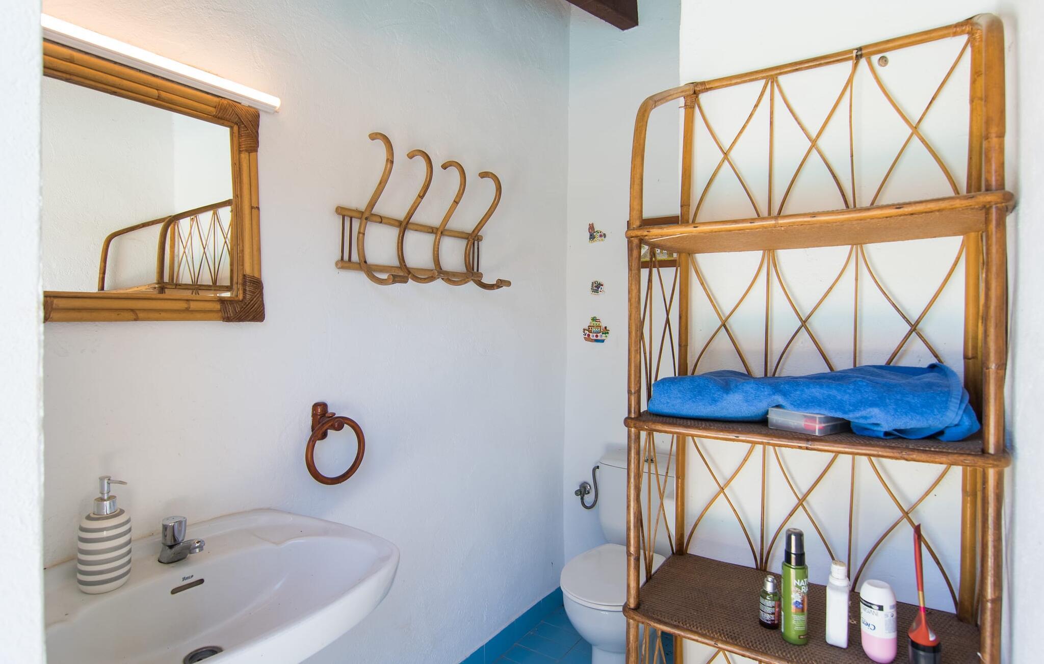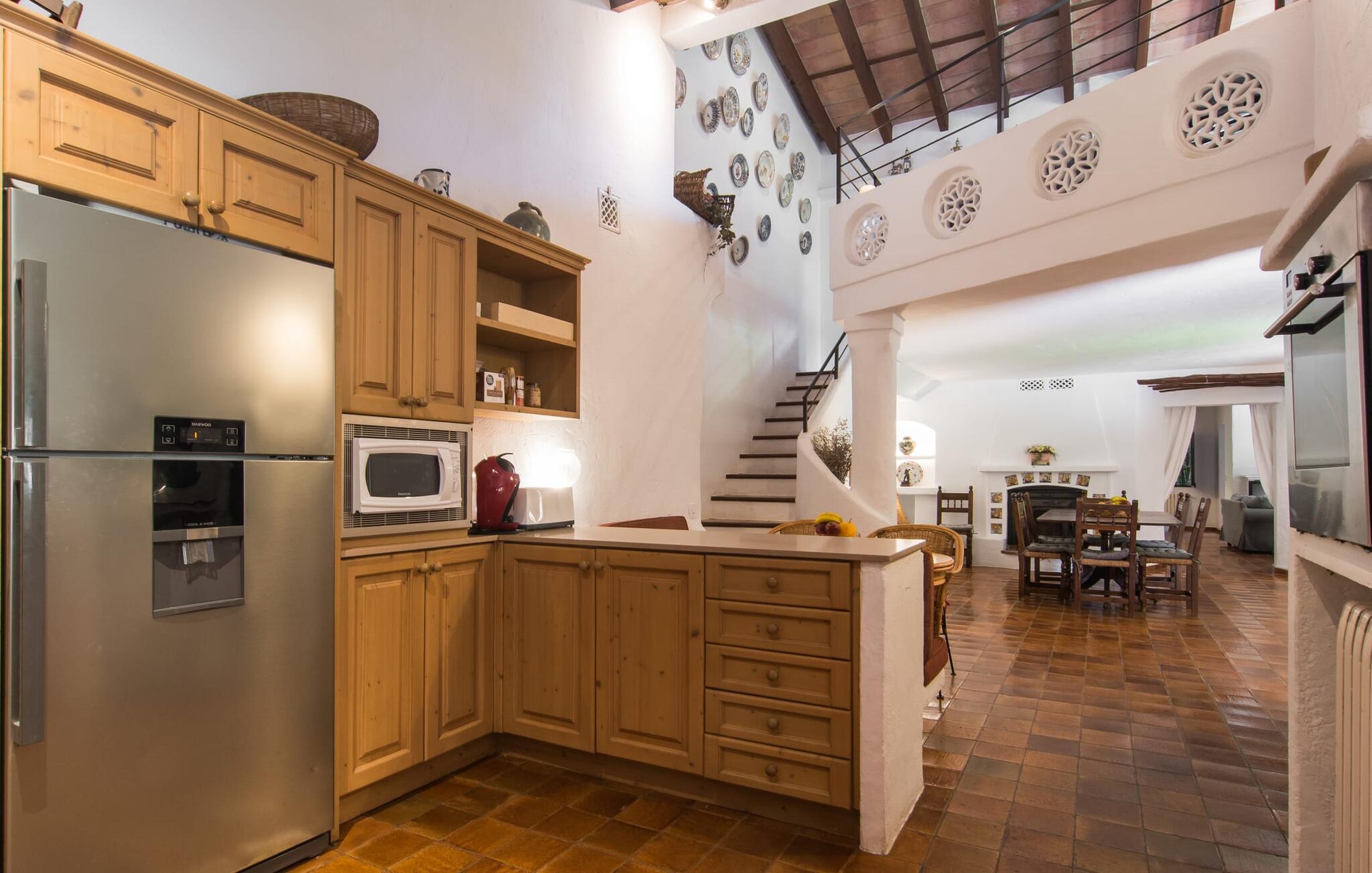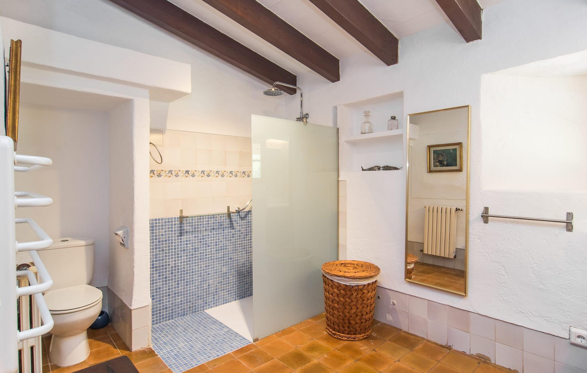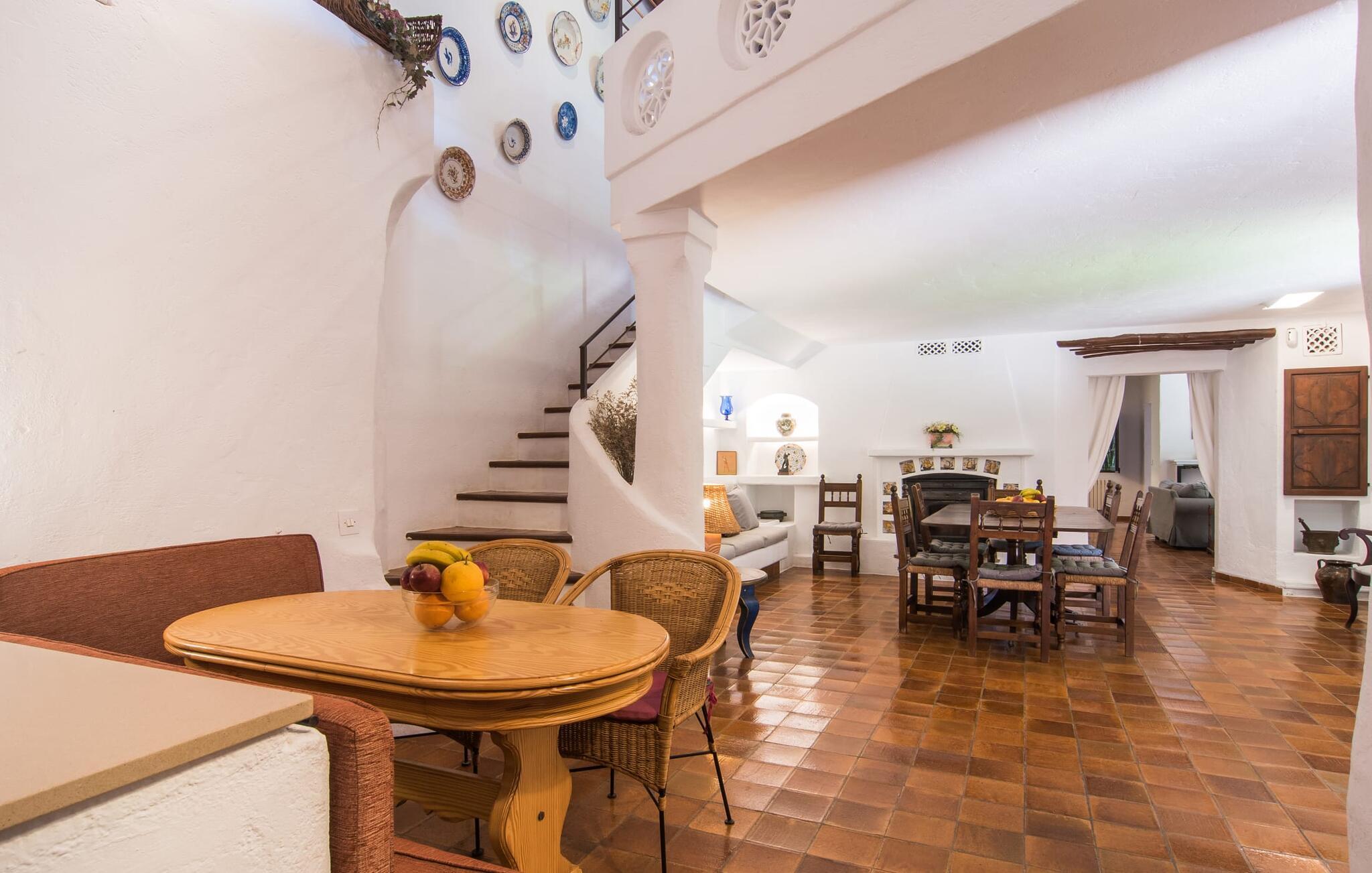 Hvis I leder efter et rigtigt tilflugtssted for en fuldstændig afslappende ferie, finder I det her! På et areal på 2.000 m² med smukke træer og blomster vil I finde ægte fred omkring dette hyggelige feriehus på Mallorca uden umiddelbart at befinde jer på et ensomt sted. De høje, varierede træer og buske giver en indbydende følelse af tryghed og naturligvis en behagelig luftig naturlig skygge. Asfalterede stier fører til de forskellige smukke steder, herunder den lavvandede pool, der let nås via romerske trapper, og den omkringliggende terrasse, hvor komfortable liggestole venter på solbadere. Et overdækket område ved siden af inviterer jer til at slappe af i skyggen, mens I holder øje med de børn, der måske plasker rundt. Bordtennisbordet til den lejlighedsvise kamp står også i skyggen - den praktiske udendørs bruser lover at køle jer ned. Flere overdækkede arealer direkte ved huset byder på ekstra rustikke siddepladser til afslapning eller fællesspisning, for eksempel ved grillen, som kan varmes op i udekøkkenet om aftenen, og hvorpå middelhavsdelikatesser simrer. Det indre af "Can Papalaia" var også kærligt dekoreret. Atmosfæren i rummene kommer fra de mange små detaljer, der skal opdages: forskellige vægmalerier og andre vægdekorationer, smukke lamper, unikt tilbehør. Massive møbler, masser af træ inklusive klassiske træbjælker på lofterne afrunder harmonisk den charmerende mallorcanske flair. Det fuldt udstyrede køkken og spise-/stuen udgør hjertet af stueetagen, hvor der også er tre hyggelige dobbeltværelser - hvoraf det ene er forbundet med et enkeltværelse - og to badeværelser. På øverste etage er der et studielignende soveområde i åbent plan med eget badeværelse. Huset, som byder på 450 m² boligareal, kan bebos året rundt takket være varme og aircondition, pejsen kan også bruges, hvis det ønskes. Den idylliske finca "Can Papalaia" med en frodig have og privat pool er omgivet af grønne områder ved porten til Port de Pollença og bugten af samme navn. Indkøbsmuligheder er kun få minutter væk i bil. Den smukke kystby har også en fin sandstrand og adskillige barer og restauranter. Andre sandstrande kan også nås på kort tid, for eksempel ligger Can Cap de Bou kun 10 minutter væk i bil.