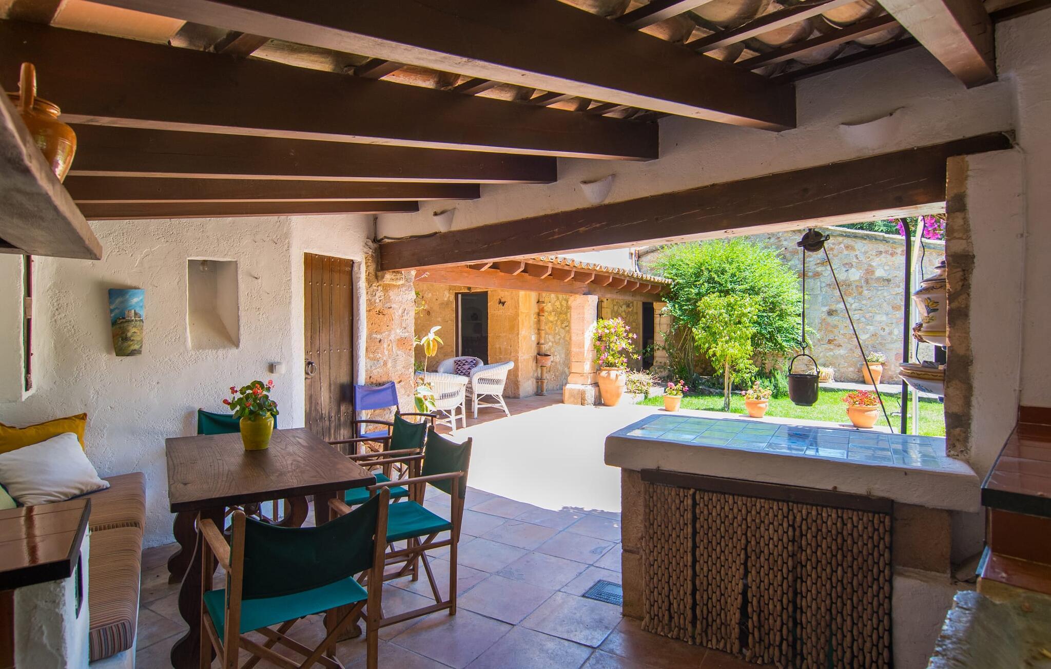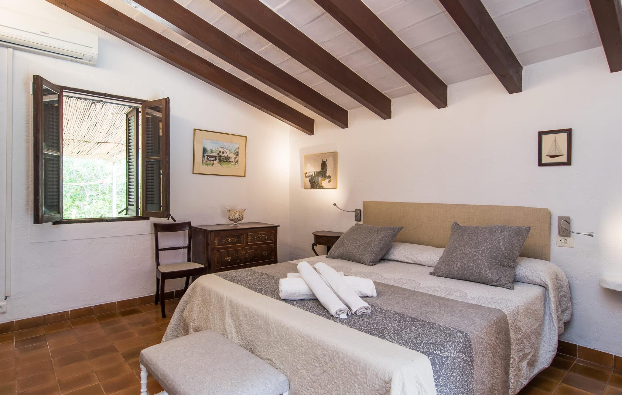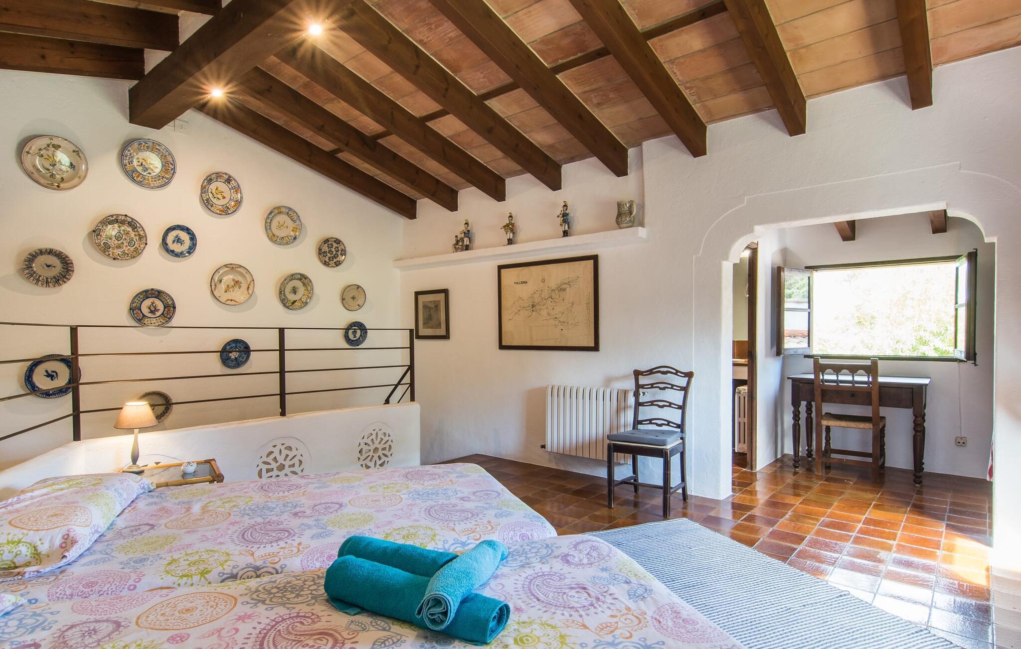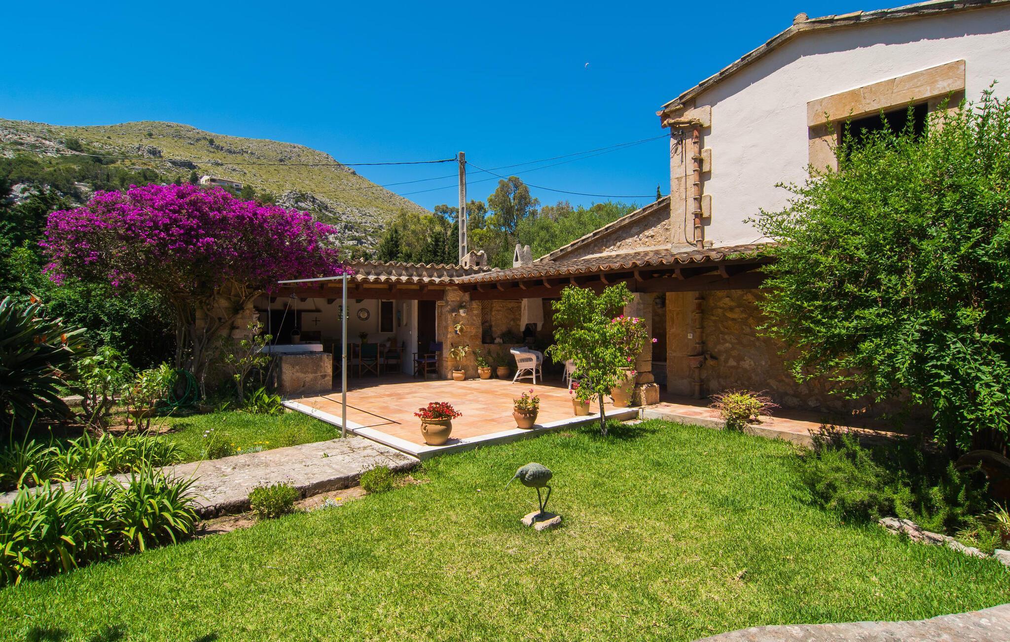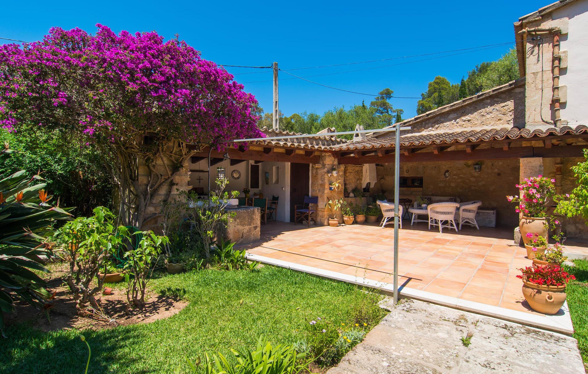 Hvis du leder efter et rigtigt tilflugtssted for en fuldstændig afslappende ferie, finder du det her! På et areal på 2.000 m² med smukke træer og blomster vil du finde ægte fred omkring dette hyggelige feriehus på Mallorca uden umiddelbart at befinde dig på et ensomt sted. De høje, varierede træer og buske giver en indbydende følelse af tryghed og naturligvis en behagelig luftig naturlig skygge. Asfalterede stier fører til de forskellige smukke steder, herunder den lavvandede pool, der let nås via romerske trapper, og den omkringliggende terrasse, hvor komfortable liggestole venter på solbadere. Et overdækket område ved siden af inviterer dig til at slappe af i skyggen, mens du holder øje med de børn, der måske plasker rundt. Bordtennisbordet til den lejlighedsvise kamp står også i skyggen - den praktiske udendørs bruser lover at køle dig ned. Flere overdækkede arealer direkte ved huset byder på ekstra rustikke siddepladser til afslapning eller fællesspisning, for eksempel ved grillen, som kan varmes op i udekøkkenet om aftenen, og hvorpå middelhavsdelikatesser simrer. Det indre af "Can Papalaia" var også kærligt dekoreret. Atmosfæren i rummene kommer fra de mange små detaljer, der skal opdages: forskellige vægmalerier og andre vægdekorationer, smukke lamper, unikt tilbehør. Massive møbler, masser af træ inklusive klassiske træbjælker på lofterne afrunder harmonisk den charmerende mallorcanske flair. Det fuldt udstyrede køkken og spise-/stuen udgør hjertet af stueetagen, hvor der også er tre hyggelige dobbeltværelser - hvoraf det ene er forbundet med et enkeltværelse - og to badeværelser. På øverste etage er der et studielignende soveområde i åbent plan med eget badeværelse. Huset, som byder på 450 m² boligareal, kan bebos året rundt takket være varme og aircondition, pejsen kan også bruges, hvis det ønskes. Den idylliske finca "Can Papalaia" med en frodig have og privat pool er omgivet af grønne områder ved porten til Port de Pollença og bugten af samme navn. Indkøbsmuligheder er kun få minutter væk i bil. Den smukke kystby har også en fin sandstrand og adskillige barer og restauranter. Andre sandstrande kan også nås på kort tid, for eksempel ligger Can Cap de Bou kun 10 minutter væk i bil. Dette er et Fincallorca feriehus.