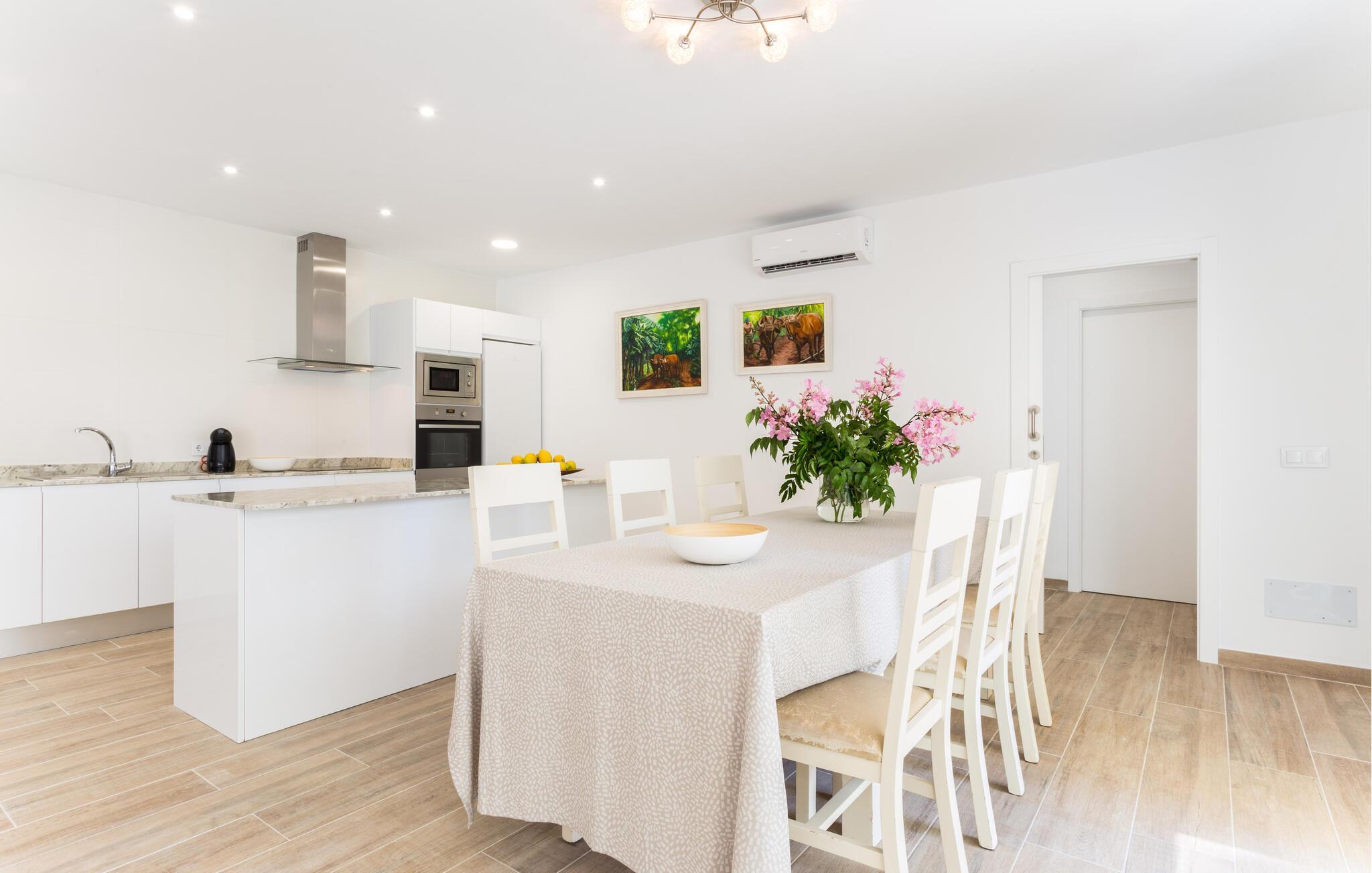 Lad os nu tage et kig på jeres personlige drømmehus på land. De hvide vægge udstråler en lethed, som I straks vil bemærke. Det moderne køkken med bordplader i natursten er svært at slå. Uanset om det er frisk frugt fra det ugentlige marked eller hjemmelavet antipasti, bliver madlavning her en feriefornøjelse. Den åbne hems-stil giver jer mulighed for at holde kontakten med familien ved spisebordet. Der er ingen trapper. Alle værelser er i ét plan og hyggelig indrettet i diskrete naturtoner. Sov bedre i den mallorcanske sol. I vil tilbringe vidunderligt fredfyldte nætter her.