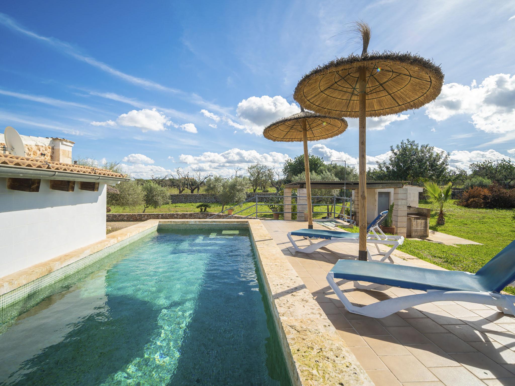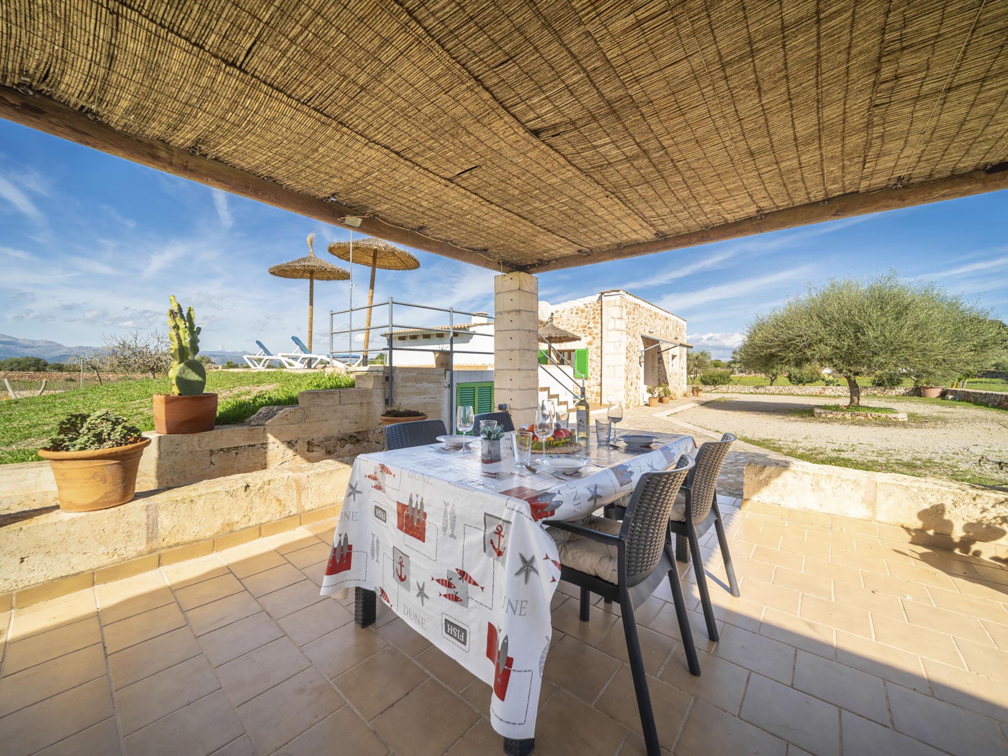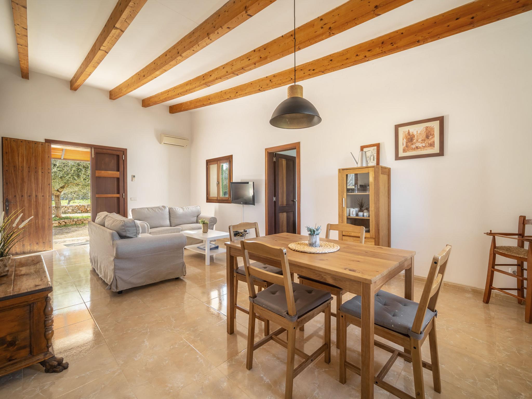 "Son Ulari Petit", 3-room house 75 m2. Object suitable for 4 adults. Rustic and cosy furnishings: open living/dining room with dining table, satellite TV, digital TV, flat screen and fan. Exit to the patio, to the swimming pool. 2 double bedrooms, each room with 2 beds (90 cm, length 200 cm), air conditioning and forced-air heating. Kitchen (oven, dishwasher, 4 ceramic glass hob hotplates, toaster, kettle, microwave, freezer, electric coffee machine). Shower/WC. Terrace 10 m2, terrace 15 m2, roofed, patio. Terrace furniture, barbecue, deck chairs (4). View of the swimming pool, the garden and the countryside. Facilities: washing machine, dryer, iron, children's high chair, baby cot for up to 2 year olds, hair dryer. Internet (WiFi, free). Please note: suitable for families. Non-smoking house. Maximum 1 pet/ dog allowed. ETV/16269