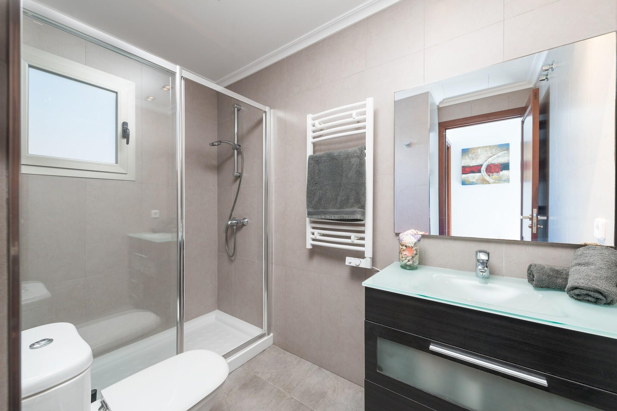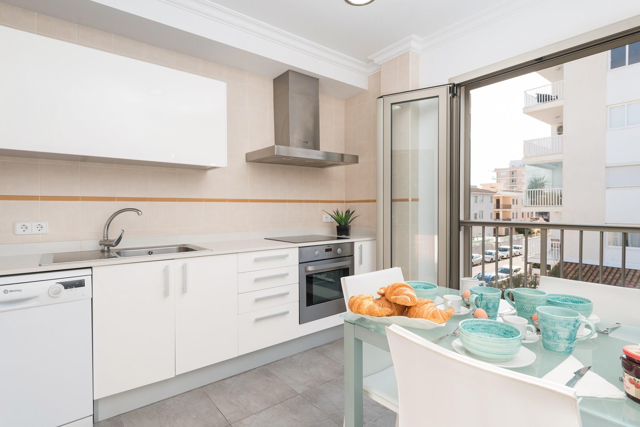 Havet Balkon Charme Træd ind på den lille, indbydende altan og lad den friske havbrise omslutte dig. Det er det perfekte sted til morgenkaffe, et aftenglas vin eller stille læsning, mens du nyder solen og havudsigten. Kun to minutters gang bringer dig til Can Picafort-strandens gyldne sand, hvor du kan tage en forfriskende dukkert eller slentre langs kysten i ro og mag. Lejlighedens beliggenhed kombinerer fred med den livlige kystenergi i denne charmerende by. Moderne interiør komfort Indvendigt byder lejligheden på et luftigt, moderne rum designet til komfort og afslapning. Opholds-/spiseområdet har store vinduer, der indrammer havet, hvilket gør hvert måltid til en naturskøn oplevelse. Køkkenet er fuldt udstyret med keramisk kogeplade, ovn og alt det nødvendige til at tilberede hjemmelavede måltider. Tre soveværelser inkluderer en dobbeltseng, to enkeltsenge og en enkeltseng, mens to badeværelser har badekar og bruser for nemheds skyld. Førsteklasses kystbeliggenhed Beliggende kun 100 meter fra stranden, er denne lejlighed perfekt placeret til at udforske Can Picaforts pulserende promenade med barer, restauranter, isbarer og butikker. Golfentusiaster kan nå Alcanada Golf på 15 km, mens havnen ligger 13 km derfra. Offentlig transport og busstoppesteder er inden for rækkevidde, hvilket gør udflugter ubesværede. Denne lejlighed på anden sal (uden elevator) tilbyder både komfort og bekvemmelighed for rejsende, der søger en afslappet ferie ved stranden.