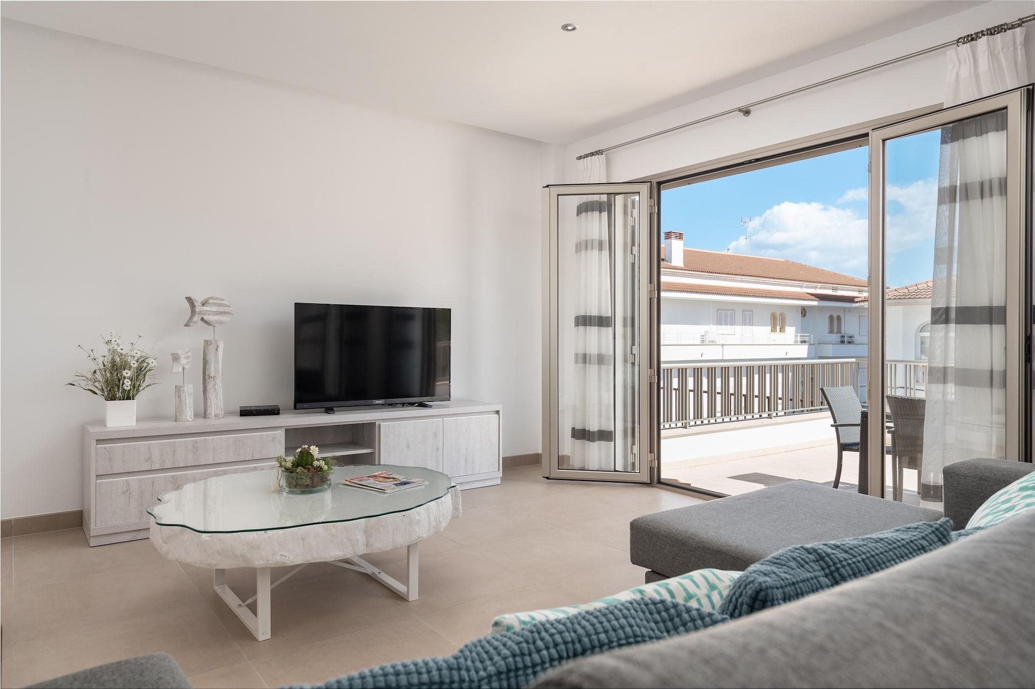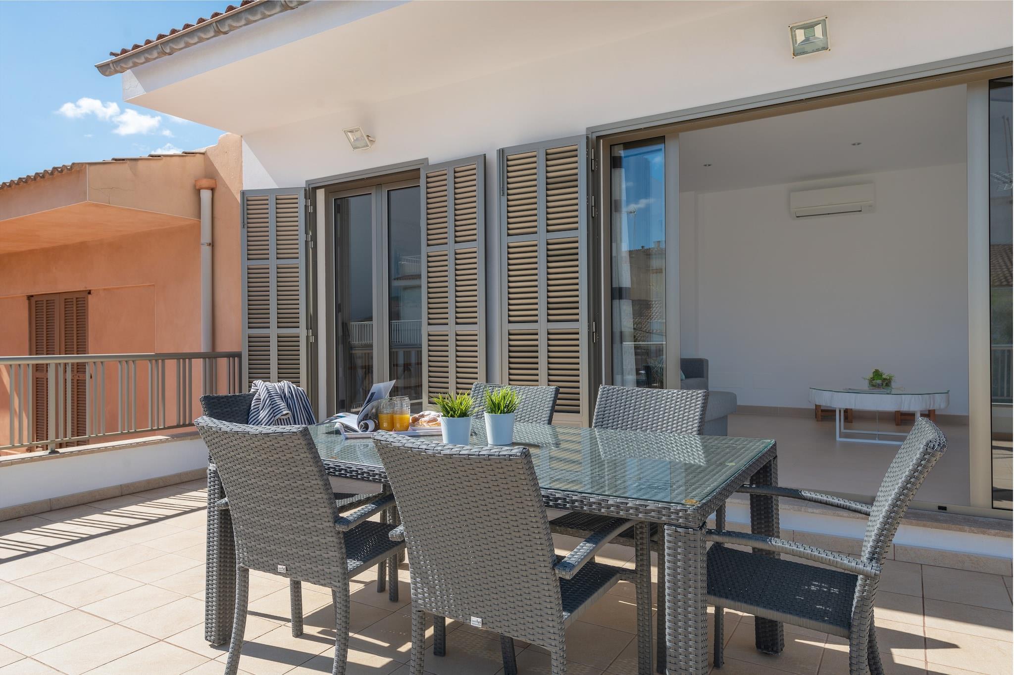 Afslappet kystliv Et par skridt over gaden bringer dig til en rummelig privat terrasse, ideel til at nyde lange måltider i øens brise, mens du får et glimt af havet for enden af ??banen. Denne lejlighed på første sal har sin egen uafhængige indgang og kun én anden nabo, der tilbyder rolige boligomgivelser. Med sit indbydende udendørsrum og moderne interiør er det et behageligt valg for rejsende, der værdsætter både privatliv og bekvemmelighed. Moderne komfort indeni Interiøret er designet med en moderne, men hyggelig stil, hvilket gør det nemt at finde sig til rette i. Stuen har aircondition og satellit-tv, mens det fuldt udstyrede køkken/alrum omfatter en keramisk kogeplade, ovn, opvaskemaskine og kaffemaskine. En vaskemaskine, strygejern og strygebræt er også tilgængelige. Begge soveværelser har dobbeltsenge, garderobeskabe og AC, mens master inkluderer en-suite med bruser. Et andet badeværelse sikrer ekstra komfort, og for familier kan en barneseng og høj stol arrangeres efter anmodning. Kæledyr er ikke tilladt. Strande og lokal smag Beliggende kun 200 meter fra Can Picaforts sandede kystlinje, placerer lejligheden dig i gåafstand fra supermarkeder, butikker og en række restauranter, der serverer middelhavs- og internationale retter. I nærheden kan du udforske Playa de Muro eller Ses Casetes dels Capellans, eller tage en dagstur til de historiske byer Alcudia og Pollensa. Golfspillere vil sætte pris på Alcanadas naturskønne kystbane kun 16 km væk.