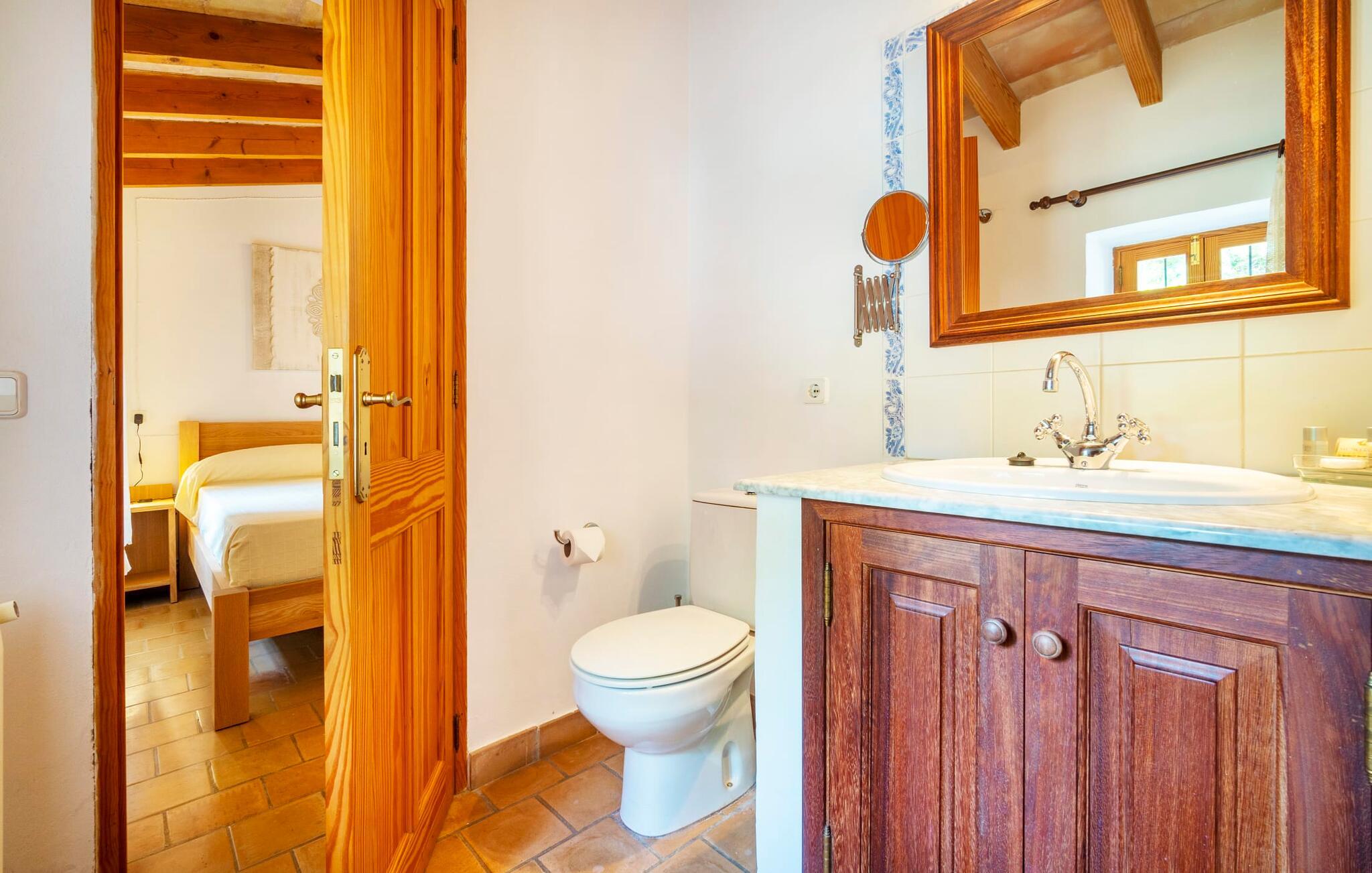 Med en indbydende, rustik, naturlig atmosfære byder den let forhøjede "Can Pistola" sine gæster velkommen med en vidunderlig udsigt. Hele ejendommen på 35.000 m² byder på mange muligheder, når det kommer til at finde dejlige steder at sidde og slappe af. Fra disse små steder kan I også nyde den vidunderlige udsigt og lægge hverdagens bekymringer langt bag jer. En stor græsplæne beplantet med palmer og andre middelhavsplanter, små stier og vægge samt en række siddemuligheder præger det rummelige udeareal. I de varmere måneder er det så fristende og nemt bare at spise alle jeres måltider udenfor. Hertil kan de talrige åbne og overdækkede terrassearealer bruges. Måske kan I nyde den smukke natur, mens I spiser morgenmad og stille spisebordet op, så alle kan nyde den bedste udsigt. Om aftenen kan I forkæle jer selv med en solid BBQ og lave mad og nyde friske regionale delikatesser sammen som en gruppe. Poolen, sikret af et hegn, er i en panoramisk position og er omgivet af et smukt loungeområde. Adgang til poolen er let via trapper. Fire komfortable liggestole er tilgængelige for omfattende afslapning under den blå himmel. Afhængigt af tidspunktet på dagen finder I også luftige, naturligt skyggefulde steder på og omkring pladsen. Villaens indre er indrettet med en masse kærlighed og udstråler en høj komfort. Lyse vægge, synlige loftsbjælker og masser af træ bidrager væsentligt til denne charmerende atmosfære. Omhyggeligt udvalgt indretning komplementerer den hjemlige atmosfære. Det store centrale rum forbinder med succes opholds- og spiseområdet. I kan slappe skønt af i sofaen og lænestolene, måske med en god bog eller en underholdende film, da fjernsynet også er installeret her. På kølige aftener giver pejsen ekstra varme og en hyggelig atmosfære. Det massive spisebord er ideelt til fællesspisning indendørs. Det rummelige køkken ligger lige ved siden af og byder på alt hvad I har brug for til jeres daglige behov, herunder en kedel og filterkaffemaskine. I finder en god nats søvn i de to hyggelige soveværelser, hvoraf det ene har eget badeværelse. Der er i alt tre senge til rådighed for gæster, en der måler 1,50x2,00m og to måler 0,90x1,90m. Badeværelserne er både funktionelle og meget venlige. Der er strygejern og hårtørrer på stedet. Vi har nævnt dette før, men det skal virkelig understreges, at denne villas beliggenhed og udsigt er helt unik. Feriestederne Cala Millor, Canyamel, Cala Rajada, Capdepera og Artà kan nås meget hurtigt og nemt i bil. En af de nærmeste strande er i Costa de los Pinos og er kun omkring 5 kilometer væk. Her finder I en naturlig, uberørt kystlinje, der byder på indbydende badeområder, bugter og vandrestier. Villaen “Can Pistola” ligger helt idyllisk i den nordøstlige del af øen, kun 6 km nordøst for den lille by Son Servera. Det byder på en fantastisk panoramaudsigt over bjergene og havet mod øst. Son Servera er et af de mest populære feriesteder på Mallorca, ikke mindst på grund af sine smukke strande. Forskellige golfbaner, restauranter og indkøbsmuligheder findes ikke langt fra villaen.