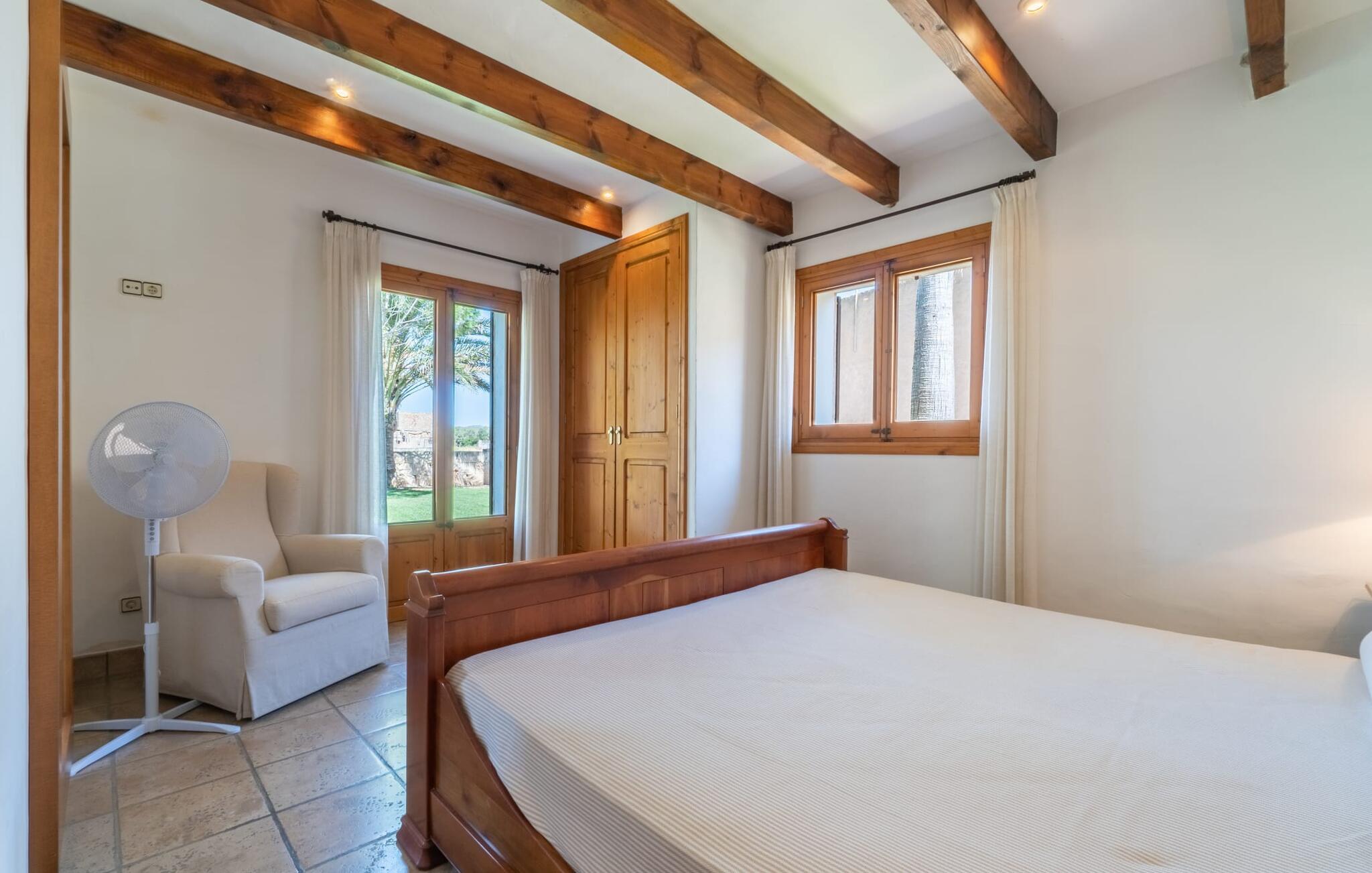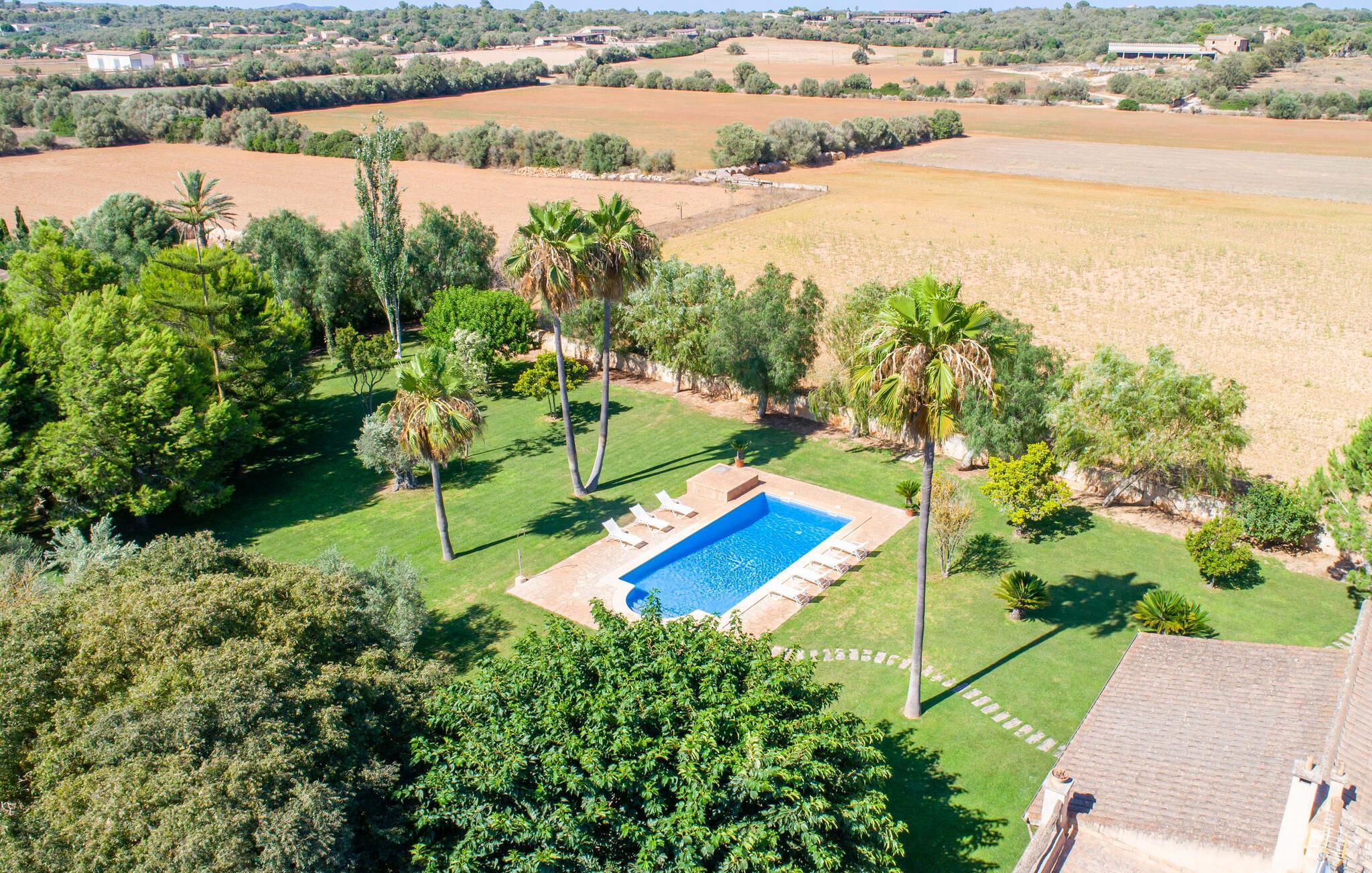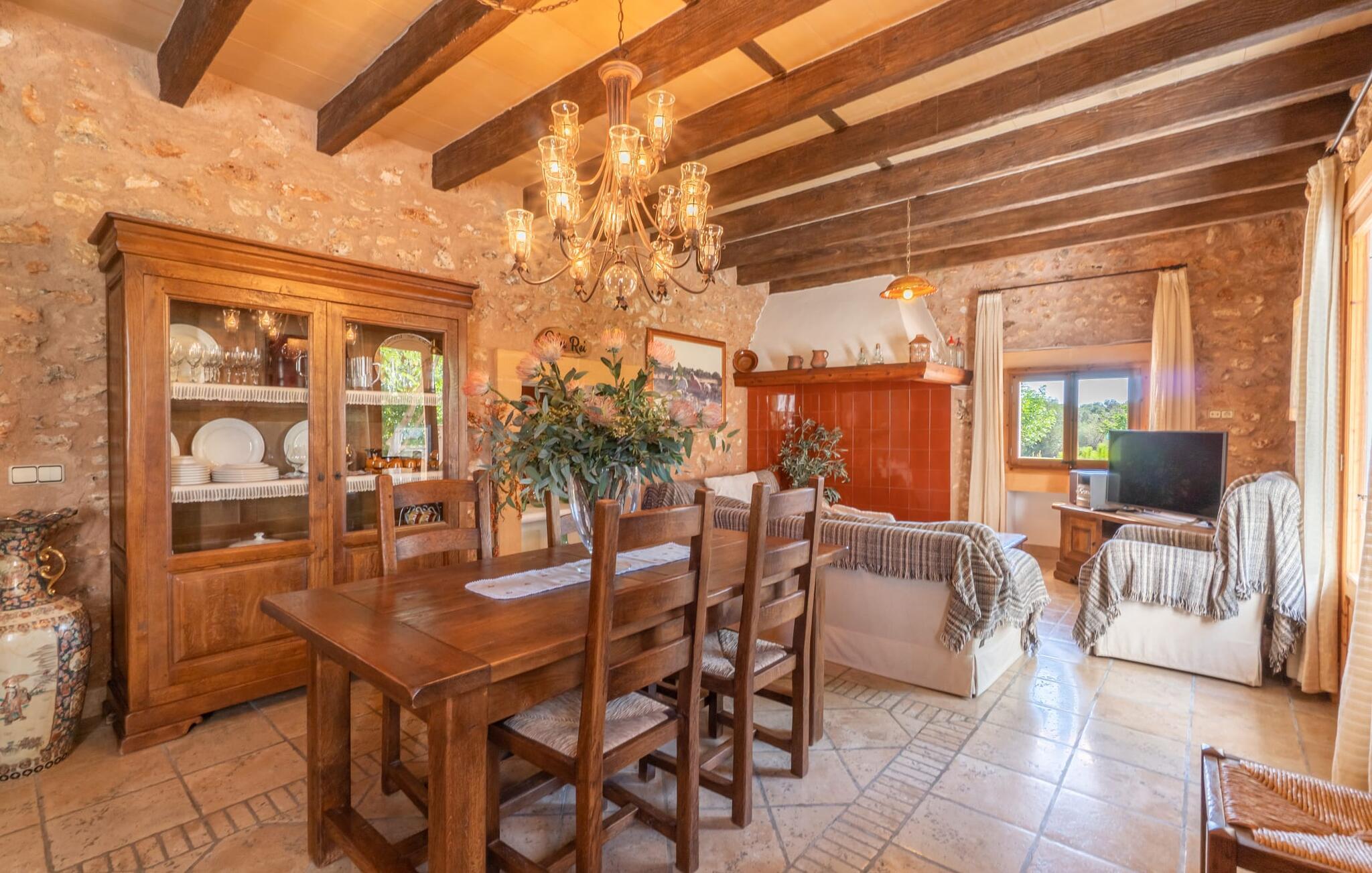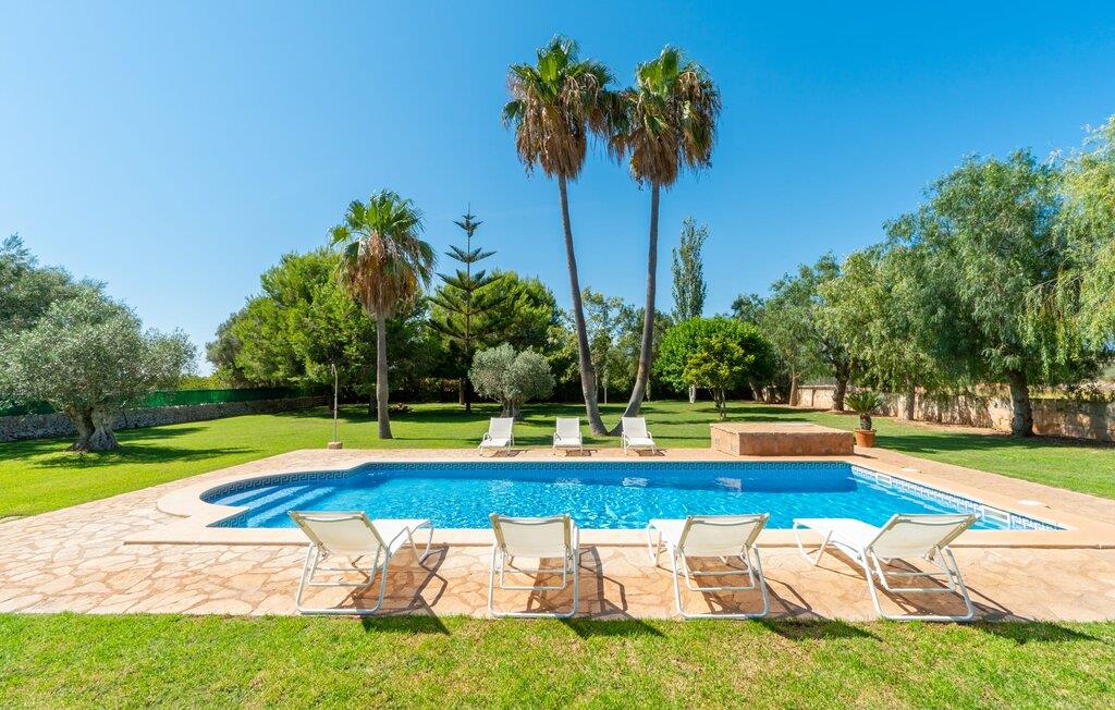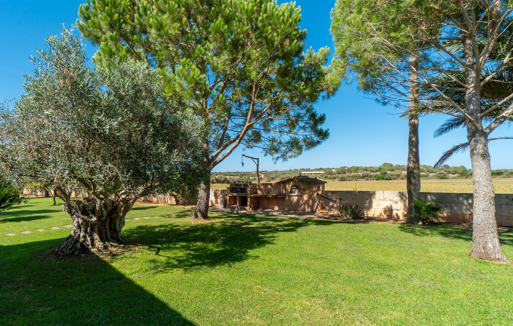 Din ferieejendom “Can Rei” har en stor have med naturplæne og indhegnet pool samt solterrasser, palmer og generelt smukke planter, fast grillplads og stor overdækket terrasse. Husets hjerte er den store og hyggelige stue-spisestue. Gennem en bred dobbeltdør kommer I ind i det rummelige køkken med pejs og endnu et spisebord. Fire soveværelser og to badeværelser kan nås via en entre. Tre af soveværelserne er udstyret med en dobbeltseng (180x200, 210x200, 135x200), et med to enkeltsenge (2 x 110x200) og et kontorhjørne. Stuehuset er komfortabelt udstyret, inklusive internet og fladskærms-tv. Det smukke bondehus "Can Rei" ligger kun ca. 6 km sydøst for Campos på den sydlige del af øen. I den lille by er der barer, restauranter og butikker til jeres daglige behov; Et særligt højdepunkt er markedet med mange lækkerier lørdag. Godt 15 minutters kørsel væk byder Santanyi på en smuk gågade og flere kunstgallerier. Den velkendte Es Trenc strand, omkring 17 km fra stuehuset, er let at nå selv med små børn takket være dens lave skråning. Bemærk venligst, at denne ejendom ikke accepterer ungdomsgrupper eller polterabender. En ungdomsgruppe på denne ejendom består af personer under 30 år. Book ikke denne ejendom, hvis I er en ungdomsgruppe eller polterabend, da jeres reservation vil blive afvist, når den er booket, hvilket også kan være tilfældet ved ankomst til ejendommen eller under jeres ophold, og I vil ikke modtage en refusion.