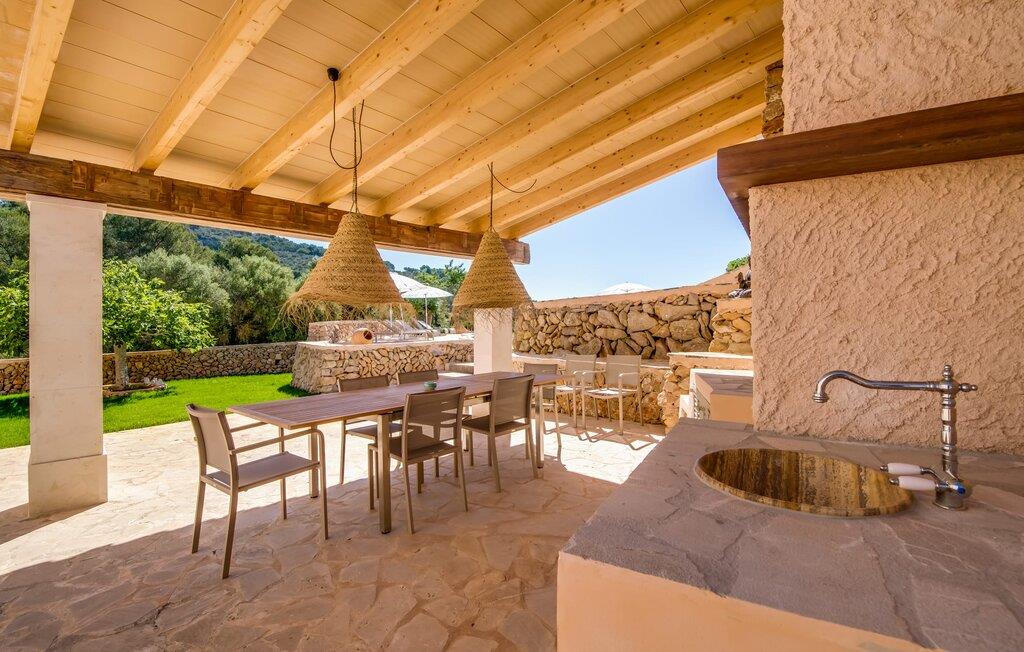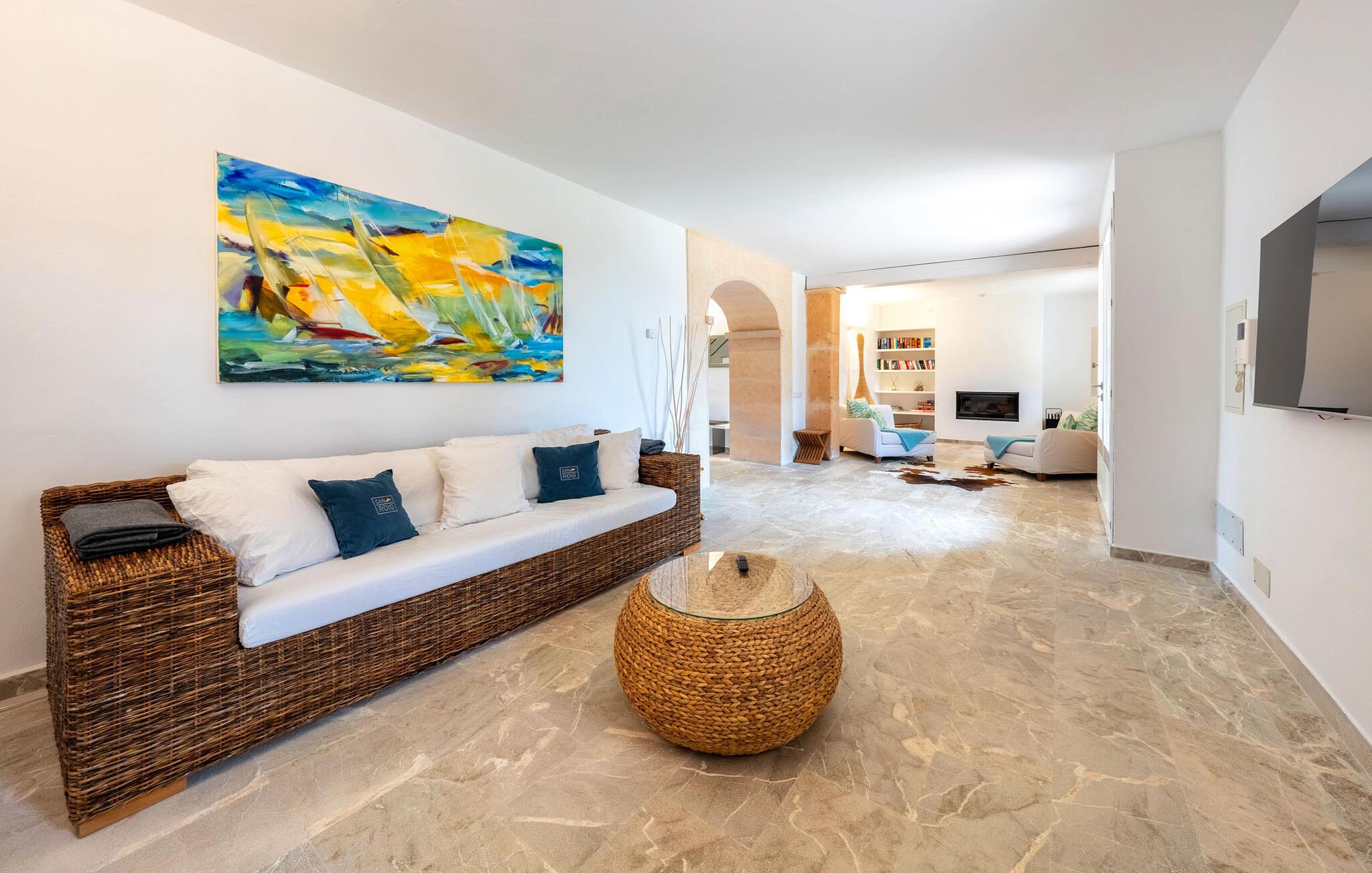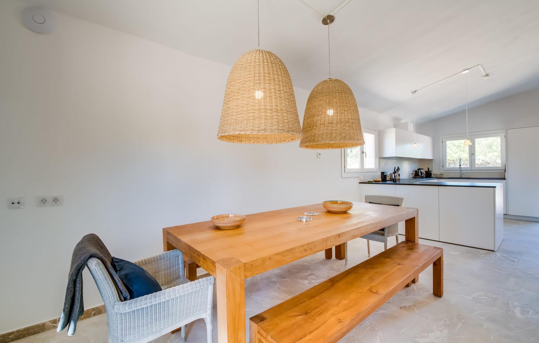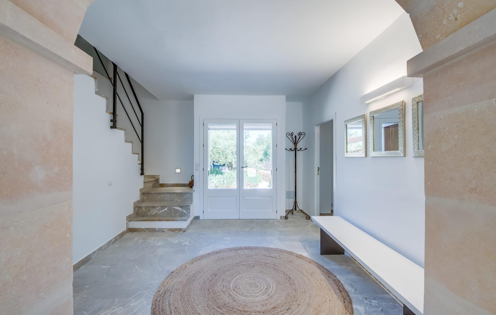 Den smukke villa "Can Roig de Na Llatzer" lader jer selv opleve betydningen af synestesi. Fordi de friske, livlige farver og duften fra det kærligt designede udeareal giver jer mulighed for at mærke og mærke afslapning, nærhed til naturen, ro og også selskabeligt samvær. Besøgende vil føle sig tilfredse takket være den afslappede middelhavsatmosfære i denne strålende smukke villa, som præsenterer et traditionelt ydre, men er blevet fuldstændig renoveret. Men lad os starte med udendørsområdet, som respektfuldt falder naturligt ind i denne let bakkede region mellem Felanitx og havet. Naturstensmure og terrasser giver sammen med det frodige grønne græs haven en harmonisk struktur. Den afslappede maritime livsstilsstemning kommer også til udtryk i det organisk formede poollandskab ved siden af et separat soppebassin til de yngre gæster - som er særligt velkomne her. Forkæl jeres smagsløg ved at tilberede lækre regionale specialiteter med intense smage i det overdækkede udekøkken. Usædvanligt stilfulde havemøbler byder på komfortable siddepladser og en afslappet livsstil. Det indre af den generøse bygning er et glimrende eksempel på den prestigefyldte "Rustic Moderno"-stil. De solbeskinnede værelser kombinerer klare farver som lyse hvide, varme cremetoner og rustikke stenbrud med bæredygtige materialer som flet, træ og sten i en puristisk symbiose. Samtidig emmer rummene af en blid intimitet og enkelhed, der kan nydes året rundt med en eller to familier eller venner. Stilfuldt udvalgte møbler - som det fuldt udstyrede, hvide køkken i amerikansk stil med et ret puritansk træbord - nyfortolker det rustikke bondehus med pejs. Den anden murede pejs er i stuen med chaiselonger og et lounge-lignende tv-hjørne. På øverste etage vil I opdage endnu et tv-område med sækkestole samt tre af de fire komfortable dobbeltværelser - udstyret med delikate pynteting. Nyd ren badeværelsesluksus med brusekabine og yderligere to fuldt udstyrede badeværelser. Rent, overskueligt og ukompliceret - sådan skal en ferie være. Den strålende smukke villa "Can Roig de Na Llatzer" er med sin smukt anlagte have og udendørsområde et fortryllende paradis. Denne perfekte ejendom ligger i en attraktiv og rolig beliggenhed mellem kysten og Felanitx. I kan gøre jeres indkøb her, men om søndagen kan I også besøge det afslappede Sant Miquel-marked. Det smukke Calas de Mallorca, herunder det fjordlignende Cala D'Or eller Cala Gran, ligger kun 7 km væk.