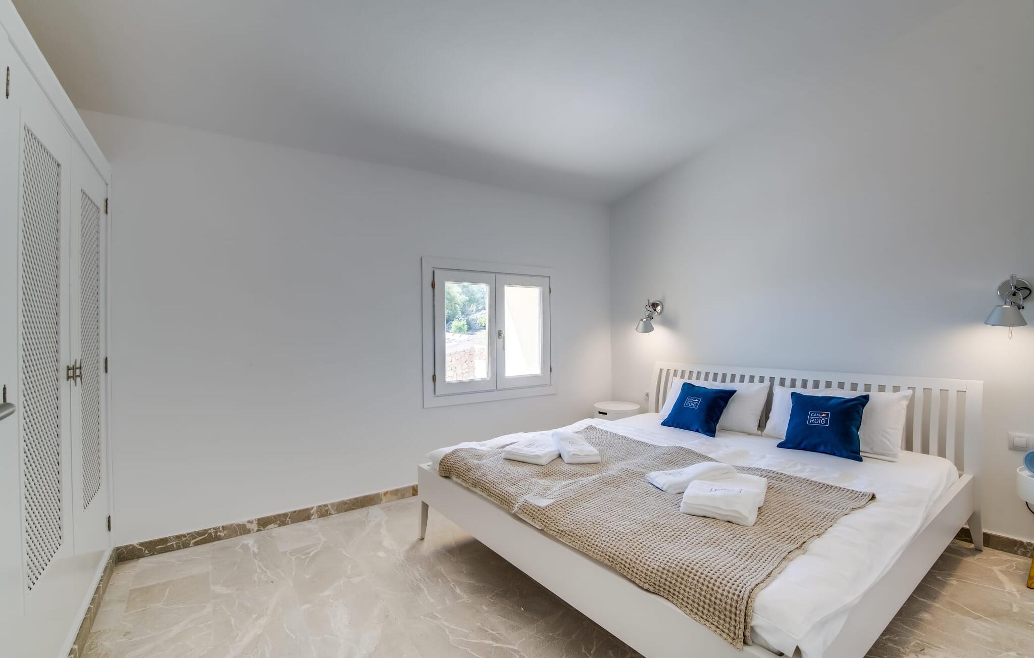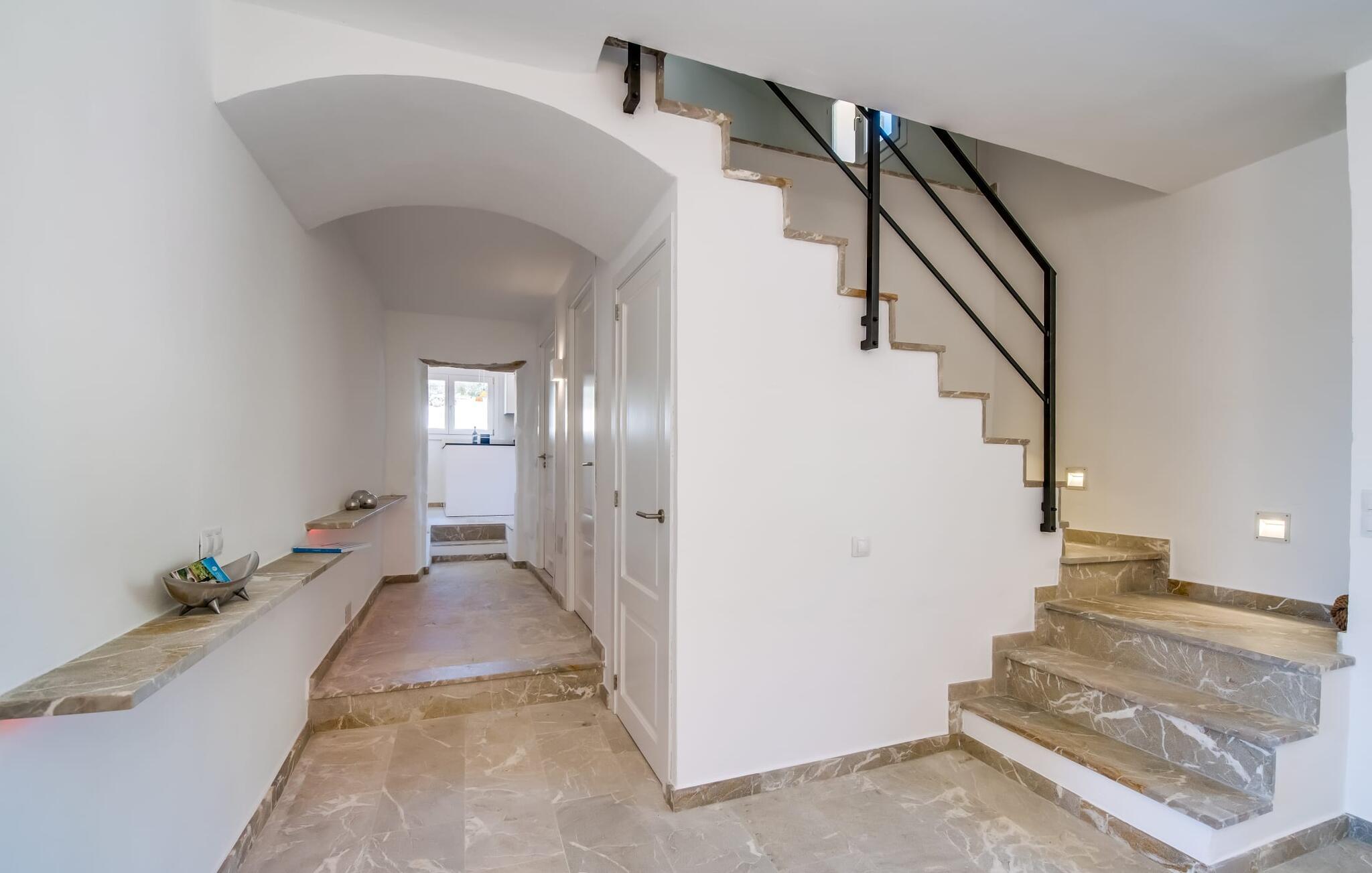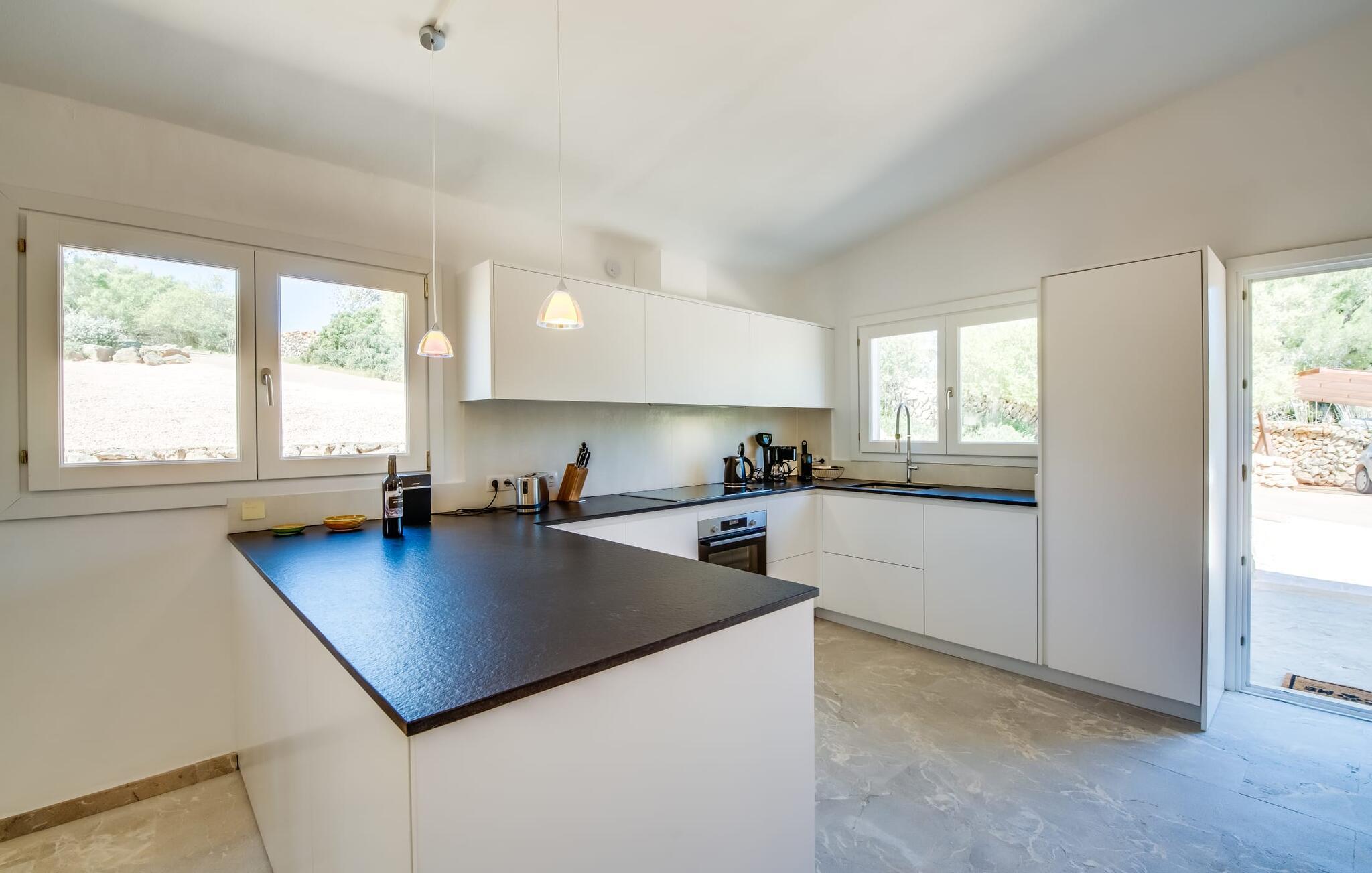 Den smukke villa "Can Roig de Na Llatzer" lader jer selv opleve betydningen af synestesi. Fordi de friske, livlige farver og duften fra det kærligt designede udeareal giver jer mulighed for at mærke og mærke afslapning, nærhed til naturen, ro og også selskabeligt samvær. Besøgende vil føle sig tilfredse takket være den afslappede middelhavsatmosfære i denne strålende smukke villa, som præsenterer et traditionelt ydre, men er blevet fuldstændig renoveret. Men lad os starte med udendørsområdet, som respektfuldt falder naturligt ind i denne let bakkede region mellem Felanitx og havet. Naturstensmure og terrasser giver sammen med det frodige grønne græs haven en harmonisk struktur. Den afslappede maritime livsstilsstemning kommer også til udtryk i det organisk formede poollandskab ved siden af et separat soppebassin til de yngre gæster - som er særligt velkomne her. Forkæl jeres smagsløg ved at tilberede lækre regionale specialiteter med intense smage i det overdækkede udekøkken. Usædvanligt stilfulde havemøbler byder på komfortable siddepladser og en afslappet livsstil. Det indre af den generøse bygning er et glimrende eksempel på den prestigefyldte "Rustic Moderno"-stil. De solbeskinnede værelser kombinerer klare farver som lyse hvide, varme cremetoner og rustikke stenbrud med bæredygtige materialer som flet, træ og sten i en puristisk symbiose. Samtidig emmer rummene af en blid intimitet og enkelhed, der kan nydes året rundt med en eller to familier eller venner. Stilfuldt udvalgte møbler - som det fuldt udstyrede, hvide køkken i amerikansk stil med et ret puritansk træbord - nyfortolker det rustikke bondehus med pejs. Den anden murede pejs er i stuen med chaiselonger og et lounge-lignende tv-hjørne. På øverste etage vil I opdage endnu et tv-område med sækkestole samt tre af de fire komfortable dobbeltværelser - udstyret med delikate pynteting. Nyd ren badeværelsesluksus med brusekabine og yderligere to fuldt udstyrede badeværelser. Rent, overskueligt og ukompliceret - sådan skal en ferie være. Den strålende smukke villa "Can Roig de Na Llatzer" er med sin smukt anlagte have og udendørsområde et fortryllende paradis. Denne perfekte ejendom ligger i en attraktiv og rolig beliggenhed mellem kysten og Felanitx. I kan gøre jeres indkøb her, men om søndagen kan I også besøge det afslappede Sant Miquel-marked. Det smukke Calas de Mallorca, herunder det fjordlignende Cala D'Or eller Cala Gran, ligger kun 7 km væk.