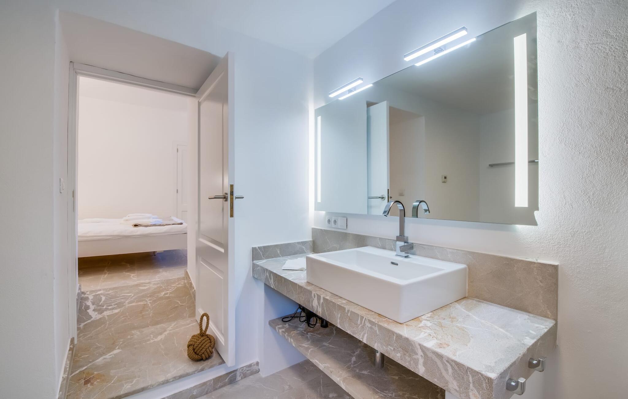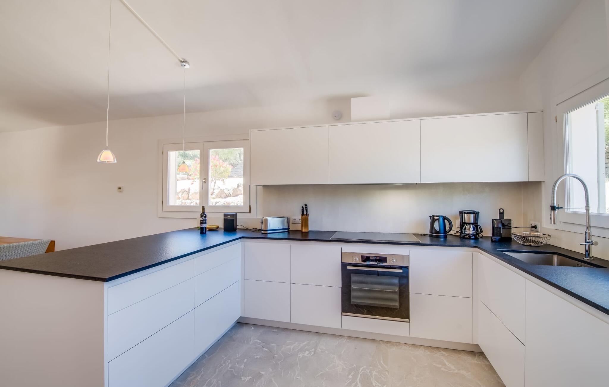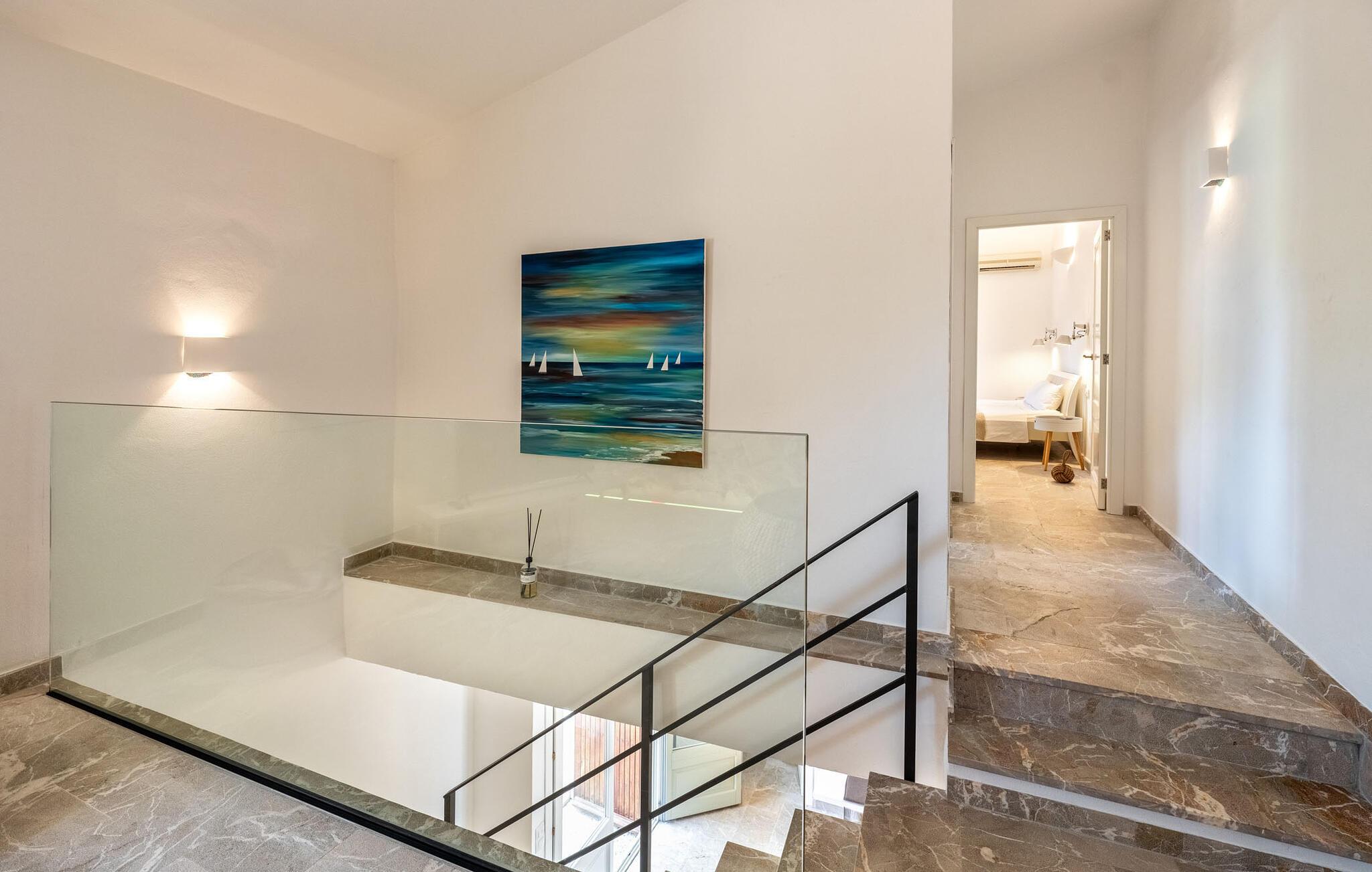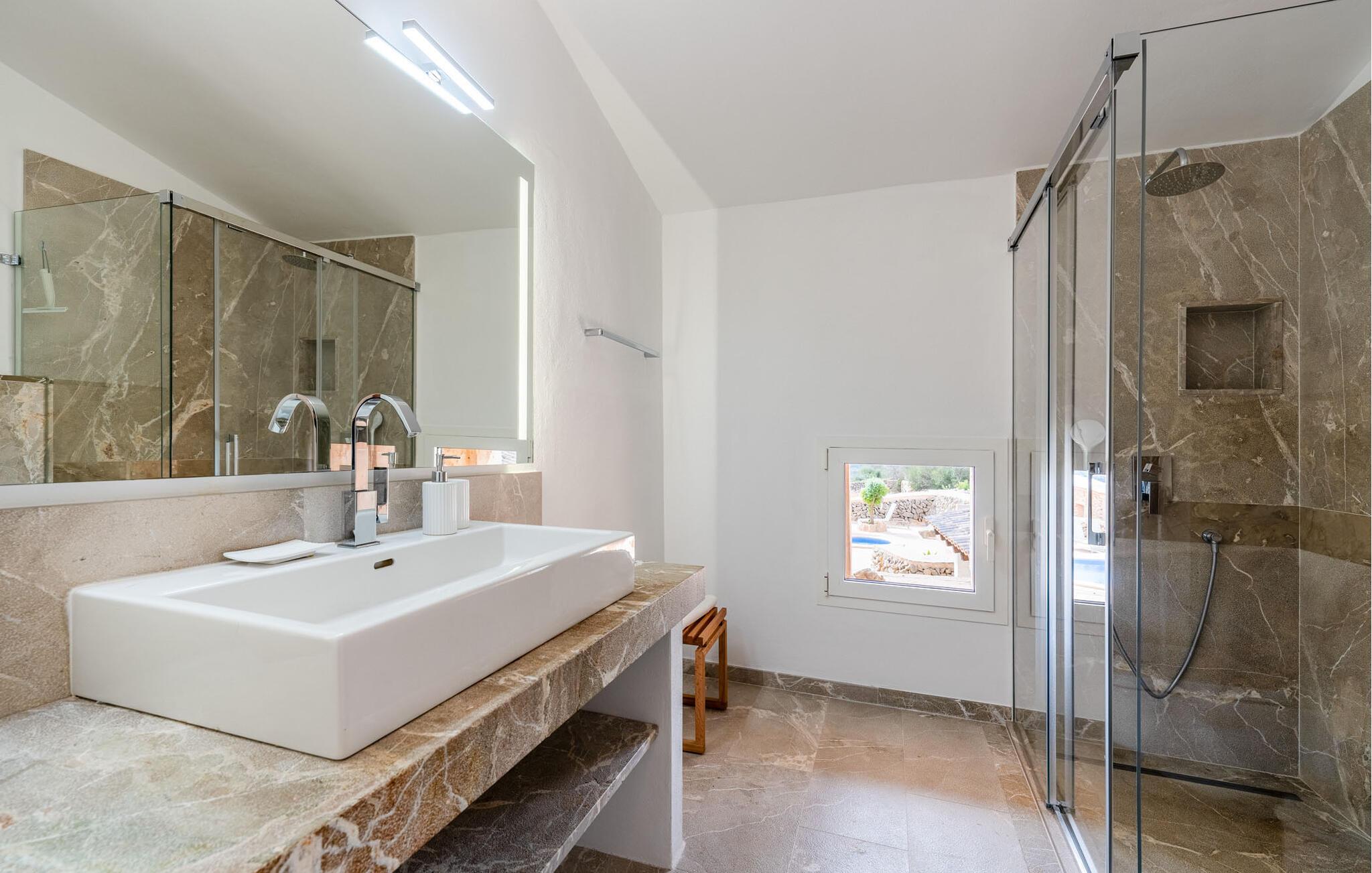 Den smukke villa "Can Roig de Na Llatzer" lader jer selv opleve betydningen af synestesi. Fordi de friske, livlige farver og duften fra det kærligt designede udeareal giver jer mulighed for at mærke og mærke afslapning, nærhed til naturen, ro og også selskabeligt samvær. Besøgende vil føle sig tilfredse takket være den afslappede middelhavsatmosfære i denne strålende smukke villa, som præsenterer et traditionelt ydre, men er blevet fuldstændig renoveret. Men lad os starte med udendørsområdet, som respektfuldt falder naturligt ind i denne let bakkede region mellem Felanitx og havet. Naturstensmure og terrasser giver sammen med det frodige grønne græs haven en harmonisk struktur. Den afslappede maritime livsstilsstemning kommer også til udtryk i det organisk formede poollandskab ved siden af et separat soppebassin til de yngre gæster - som er særligt velkomne her. Forkæl jeres smagsløg ved at tilberede lækre regionale specialiteter med intense smage i det overdækkede udekøkken. Usædvanligt stilfulde havemøbler byder på komfortable siddepladser og en afslappet livsstil. Det indre af den generøse bygning er et glimrende eksempel på den prestigefyldte "Rustic Moderno"-stil. De solbeskinnede værelser kombinerer klare farver som lyse hvide, varme cremetoner og rustikke stenbrud med bæredygtige materialer som flet, træ og sten i en puristisk symbiose. Samtidig emmer rummene af en blid intimitet og enkelhed, der kan nydes året rundt med en eller to familier eller venner. Stilfuldt udvalgte møbler - som det fuldt udstyrede, hvide køkken i amerikansk stil med et ret puritansk træbord - nyfortolker det rustikke bondehus med pejs. Den anden murede pejs er i stuen med chaiselonger og et lounge-lignende tv-hjørne. På øverste etage vil I opdage endnu et tv-område med sækkestole samt tre af de fire komfortable dobbeltværelser - udstyret med delikate pynteting. Nyd ren badeværelsesluksus med brusekabine og yderligere to fuldt udstyrede badeværelser. Rent, overskueligt og ukompliceret - sådan skal en ferie være. Den strålende smukke villa "Can Roig de Na Llatzer" er med sin smukt anlagte have og udendørsområde et fortryllende paradis. Denne perfekte ejendom ligger i en attraktiv og rolig beliggenhed mellem kysten og Felanitx. I kan gøre jeres indkøb her, men om søndagen kan I også besøge det afslappede Sant Miquel-marked. Det smukke Calas de Mallorca, herunder det fjordlignende Cala D'Or eller Cala Gran, ligger kun 7 km væk.