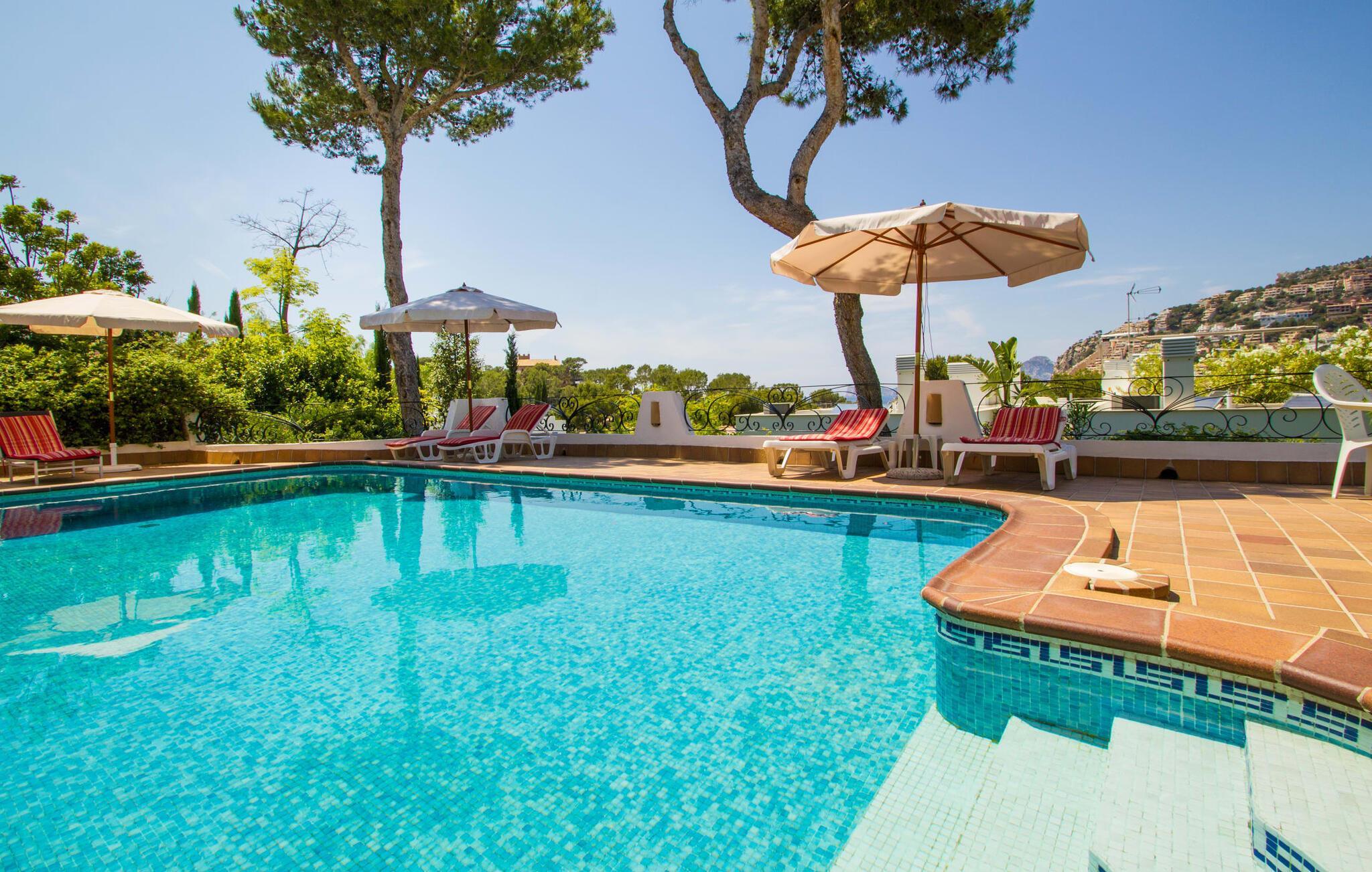"Sikke en vidunderlig udsigt!" kan du udbryde, når du ankommer til den skinnende hvide villa "Can Rubi" og først nyder panoramaet af Port d'Andratx-bugten, der strækker sig ud foran dig. Og faktisk er den utroligt smukke udsigt over havet det mest markante træk ved dette feriehus. Beliggende i et boligbyggeri nær havnen, rejser huset sig lidt højere end naboejendommene, hvilket giver uhindret udsigt over hustagene til det dybe blå vand i bugten og dele udenfor. Fra stuen er der direkte adgang til en delvis overdækket terrasse, hvor man kan læne sig tilbage og nyde udsigten. Den er selvfølgelig også ideel til at dele måltider sammen i det fri. På lune aftener vil du helt sikkert gerne tænde op for grillen og fylde grillen med friske lokale råvarer. På grund af villaens beliggenhed på bjergsiden er poolen lidt lavere og kan nås via trapper fra terrassen eller via trapperne på siden af huset. Med en længde på næsten 9 m og varierende dybder byder poolen på en kølig forandring på varme dage; brede trin fører ud i vandet. Terrassen ved siden af poolen er udstyret med liggestole og parasoller, hvor du kan ligge og slappe af i det varme solskin, så længe du har lyst. En havegynge og andre siddemuligheder gør også dette til et godt sted at tilbringe tid udendørs. Ejendommen er omgivet af middelhavsflora, herunder to høje fyrretræer, hvilket giver villaens udendørsarealer en hyggelig, forfriskende privat atmosfære. Du kan parkere din lejebil på den lille gade, der løber forbi huset eller på indkørslen foran huset. Lige så behageligt tiden udenfor vil være, byder interiøret også på en tiltalende, afslappet atmosfære. Værelserne er fordelt på forskellige niveauer, hvilket yderligere forstærker indtrykket af rummelighed og orden. Lyse vægge, masser af træ og matchende accentfarver skaber en atmosfære fuld af varme og komfort. Klimaanlægget giver dig mulighed for at justere temperaturen efter din smag, uanset årstiden. En stærkt oplyst, rummelig entré fører ned et par trin til stuen, hvor komfortable sofaer, en pejs og et fladskærms-satellit-tv skaber et miljø, der er velegnet til timers afslapning. Dette værelse fører direkte tilbage til terrassen. Til højre for indgangen er der et soveværelse med eget badeværelse og et ekstra toilet. En bred buegang i stuen fører til et værelse, hvor en disk adskiller køkkenet fra et lille opholdsområde. Udover en elkedel, en filterkaffemaskine og en Dolce Gusto-kaffemaskine er der også større hvidevarer som ovn, komfur, vaskemaskine og to køleskabe – og god plads til arbejde og opbevaring. I det næste værelse kan I takket være den åbne spiseplads og det store træbord spise sammen med stil, mens I nyder udsigten over bugten! Der er yderligere tre soveværelser ovenpå. En af dem har eget badeværelse, de to andre deler badeværelse. Alle værelser er komfortabelt indrettede og giver nem adgang til terrassen. Nyd en afslappende søvn på følgende sengestørrelser: en seng, der måler 1,80 x 2 m, to, der måler 1,50 x 1,90 m og en anden, der måler 0,90 x 1,90 m. De smukke badeværelser, som har tre funktioner hårtørrer og andre faciliteter, giver naturligt lys og nok plads til alle på turen. Hvis du er interesseret i at udforske nogle af øens kulturskatte, er der flere værdifulde destinationer i nærheden. For eksempel kan du på en vandretur til ruinerne af et trappistkloster i La Trapa komme helt tæt på det smukke bjerglandskab i denne vestlige del af øen. Hvis du er interesseret i moderne kunst og arkitektur, anbefaler vi et besøg på Studio Weil i Port d'Andratx. Fra Port d'Andratx har du mulighed for at tage en tur til den ubeboede klippeø Sa Dragonera og opdage den ekstraordinære flora og fauna der. Nyd en vidunderlig dag på stranden, herunder i Camp de Mar eller Cala Egos. Det, der gør den vestlige del af Mallorca så speciel, er mangfoldigheden i denne region, som gør hver dag i din ferie til en helt ny oplevelse. Udnyt alt, hvad området har at byde på, og vend derefter tilbage til den smukke villa "Can Rubi" og nyd hvert øjeblik af de lange ferieaftener. Den velholdte villa "Can Rubi" har en vidunderlig udsigt over havet fra sin bjergskråning på den vestlige del af øen, kun omkring 1,3 km fra centrum af havnebyen Port d'Andratx. Nyd en betagende udsigt i alle retninger fra villaens unikke udsigtspunkt. Byen Andratx er ideel til shopping eller gå en tur med bjergene som kulisse. Sandstranden i Camp de Mar kan nås på 15 minutter i lejebil. Dette er et Fincallorca feriehus.