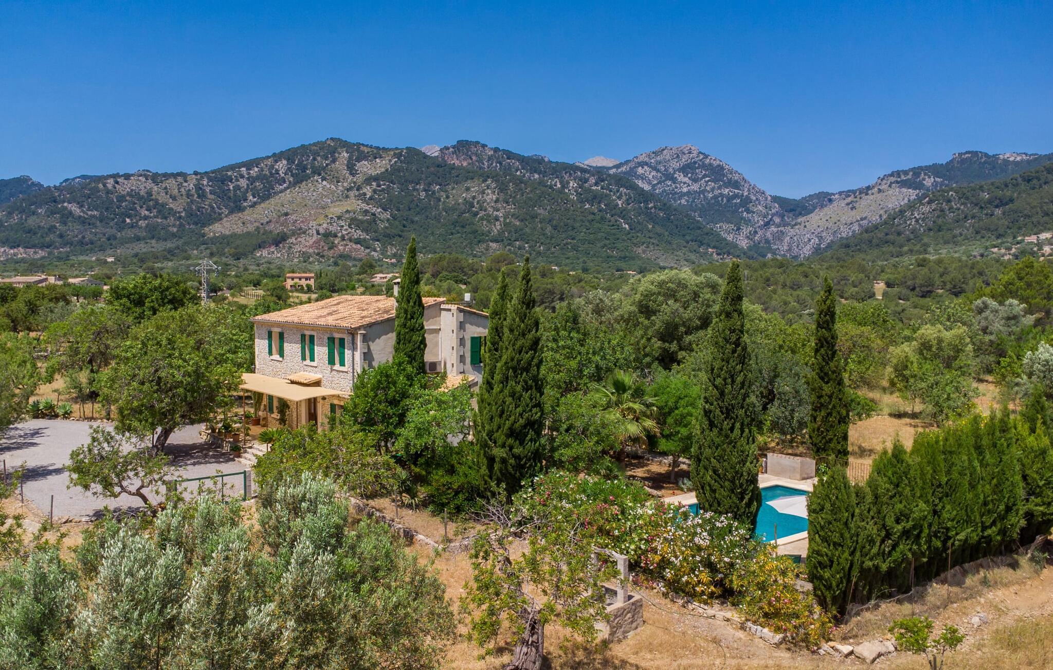 Ren natur og et klassisk landsted at have det godt i, vi er glade for at præsentere fincaen "Can Tabou" for jer. Omgivet af Mallorcas grønne frodighed året rundt, vil I opleve et to-etagers feriehus, der er ideelt for familier og venner. Hvor end I kigger hen, ser I mandel-, citron- og johannesbrødtræer på den mægtige baggrund af Tramuntana-bjergene. Denne finca glæder ikke kun natur- og sportsentusiaster, der nyder at vandre og spille golf. I kan også nyde det unikke privatliv i den forfriskende pool - til afkøling ind imellem eller til en nattesvømning. Mellem duftende oleander og palmer kan I spille et spil bordtennis eller nyde middelhavssolen på de medfølgende liggestole. Hvis I ønsker det, kan I også hvile i skyggen af træerne eller under paraplyerne omkring poolen. Der er yderligere udendørs siddepladser omkring huset, hvoraf nogle er overdækket. I kan afslutte dagen afslappet med en hyggelig grillaften, inden I vender tilbage til det velholdte sommerhus. Der vil I opleve det afslappede, landlige Mallorca, som vi kender og elsker det. De generelle værelser venter på jer i stueetagen. Dette inkluderer også det lyse, fabelagtigt fuldt udstyrede køkken - ideelt til bevidst valgt selvforplejning i dette charmerende feriehus i rustik stil. Køkkenet er forbundet med stue og spisestue med pejs via en rund, stenbeklædt buegang. En separat tv-stue fuldender hyggen. Der er et badeværelse på hver etage (brusebadeværelse i stueetagen og hyggeligt badekar mellem de tre airconditionerede soveværelser på øverste etage). Værelserne er generelt meget rummelige og har dobbeltsenge eller enkeltsenge. For alle, der af og til flytter deres hjemmekontor til deres feriehus, mens de er på ferie, er der et særligt højdepunkt i form af et studie med en fænomenal udsigt over Tramuntana-bjergene. "Can Tabou" formidler en behagelig følelse af fred og frihed. Simpelthen uimodståelig, eller hvad synes du? Stuehuset "Can Tabou" afspejler perfekt fordelene ved et traditionelt mallorcansk feriehus. Det statelige stenbrudshus er omgivet af masser af natur og fred - lige hvad I ønsker. For shopping, besøg den nærliggende bjerglandsby Campanet, et romantisk, men arkitektonisk tiltalende sted på den nordlige del af øen. For en dag på stranden kan I tage til de varierede bugter i Pollença eller Alcúdia, cirka 30 minutter væk i bil.