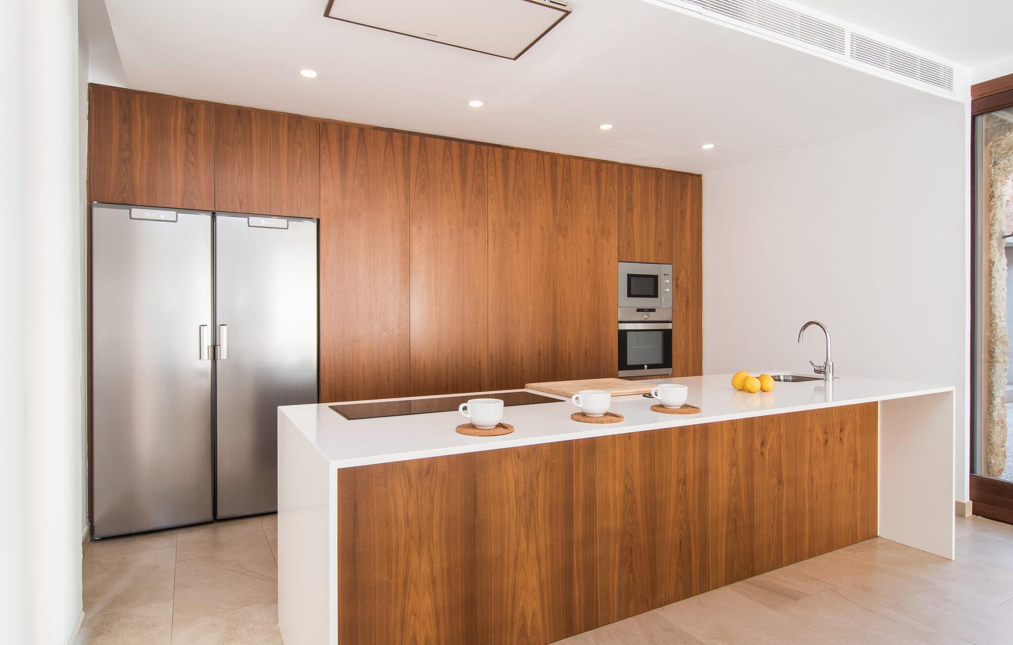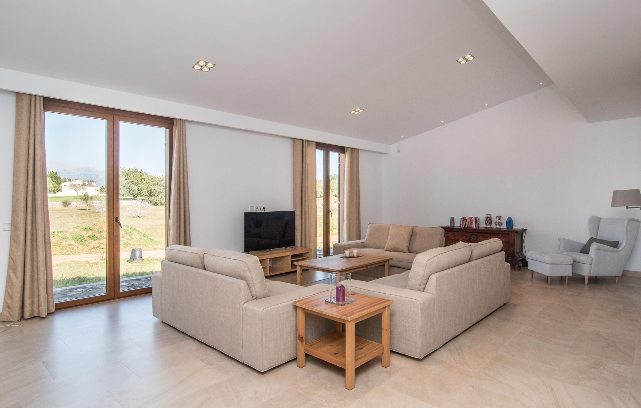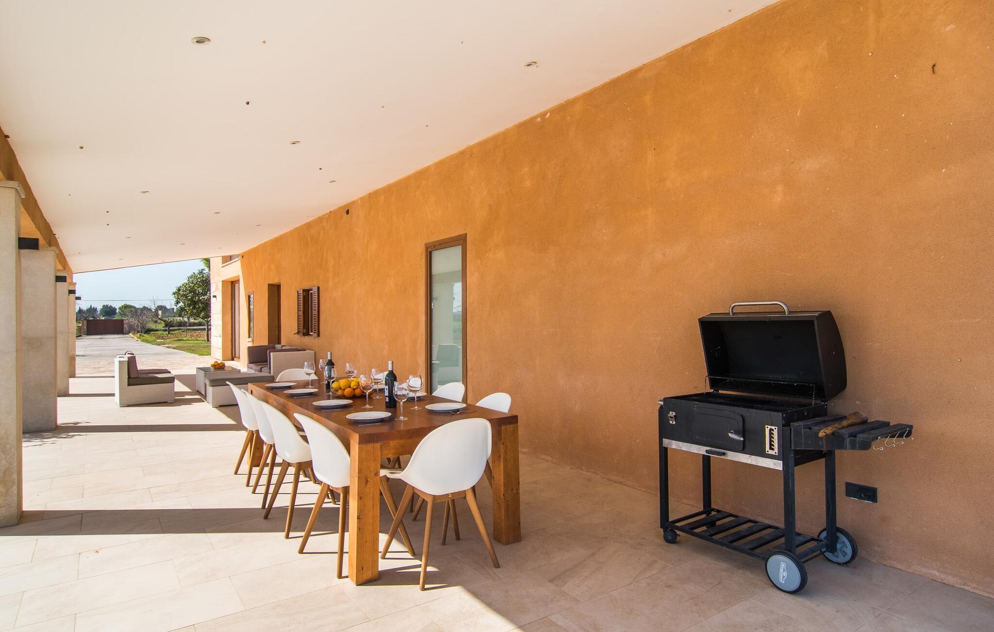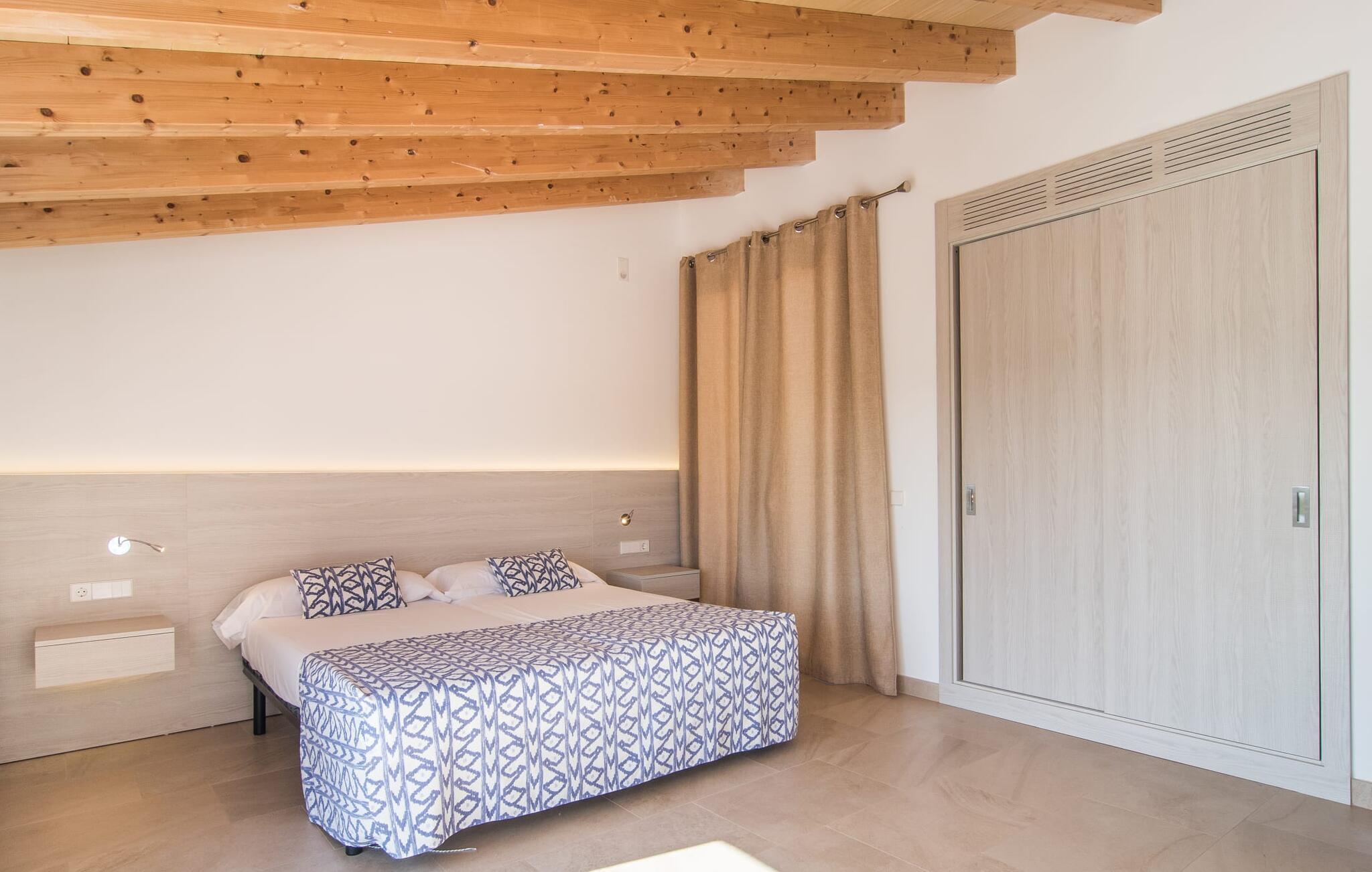 Et landsted i en afsondret beliggenhed, udstyret med alle de moderne bekvemmeligheder, du kan ønske dig, vidunderligt rustikt og samtidig usædvanligt stilfuldt - villaen "Can Tano" nær Inca i centrum af øen kombinerer disse formodede modsætninger. Det ligger på en kæmpe ejendom midt i det typiske middelhavsgrønne landskab på Mallorca, omgivet af brede marker og mandel-, oliven- og appelsintræer, hvoraf man kan nyde en vidunderlig udsigt fra den brolagte solterrasse. Omdrejningspunktet for det velholdte udendørsområde er helt klart den store, opvarmede pool, der er lige så velegnet til at slappe af på liloen som til sporty træning. Bagefter kan du gøre dig godt tilpas til en velfortjent siesta på en af de behagelige liggestole omkring poolen - stedet i skyggen af et af de to smukke appelsintræer er særligt hyggeligt. Den overdækkede terrasse er også meget behagelig at sidde på, enten på de smarte udendørs loungemøbler eller ved det lange træbord med designerstole til spisning. Interiøret i “Can Tano” får enhver indretningselskers hjerte til at banke hurtigere: Her blev noget helt nyt skabt af ruinerne af en gammel bygning – og der blev leget smart med. Puristisk design møder rustikke naturstensvægge, hvide vægge i kombination med store vinduespartier og smart placerede loftspots lader lyset komme ind. I såvel møbler som lofter og nogle møbler er træ i forskellige nuancer brugt til at skabe farvenuancer. Et særligt kendetegn er den indre gårdhave, som er separat tilgængelig gennem alle rum i stueetagen - bortset fra indgangspartiet med gæstetoilet. Det gælder blandt andet det stilrene køkken med træfronter og en disk i en varm brun tone, naturstensvæggen og højkvalitets hvidevarer - fra det store køleskab til indbygningsovnen i øjenhøjde. I den tilstødende spiseplads inviterer et langbord med tilhørende bænke til at nyde en banket. Ved siden af finder du den rummelige stue med tre komfortable sofaer, hvor du kan gøre dig godt tilpas. Apropos komfort: Dette kendetegn gælder også for de i alt seks diskret indrettede dobbeltværelser, hvoraf fem er i stueetagen og et på øverste etage, alle med eget badeværelse - privatlivets fred garanteret! Hvis du kan lide gåture eller cykelture gennem naturen, er "Can Tano" det perfekte udgangspunkt. Til daglige indkøb eller en afslappende shoppingtur kan du køre de 5,1 km til Inca ad vejen, som kan høres afhængigt af vindretningen. Mallorcas tredjestørste by er bedst kendt for sin læderproduktion og skomageri. Du kan gå på jagt efter gode tilbud i de mange outlet-butikker, især i udkanten af byen. Men der er også meget at opdage i butikkerne i midtbyen – og det gælder også byens restauranter. Uanset om det er typisk mallorcansk eller internationalt køkken: Inca byder på restauranter, tapasbarer og caféer for enhver smag. Derudover finder øens største ugentlige marked sted i det fri hver torsdag. Til en dag ved havet anbefaler vi den mangfoldige Alcúdia-bugt med dens forskellige smukke kyststrækninger, som kan nås efter 25 km i bil. Et landsted med en idyllisk beliggenhed med en høj kølighedsfaktor: Dette er den uimodståelige, originale blanding, som villaen “Can Tano” tilbyder, beliggende kun 5 km fra byen Inca i centrum af øen. Det ultra-chikke feriehus ligger på en kæmpe grund - fra solterrassen med den store pool kan du få en vidunderlig udsigt over de typisk middelhavs, skønt grønne omgivelser. Den nærmeste strand, Alcúdia-bugten, ligger kun 25 km væk i bil. Dette er et Fincallorca feriehus.
