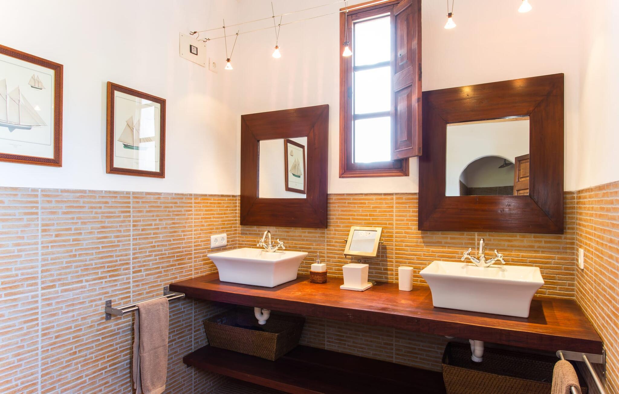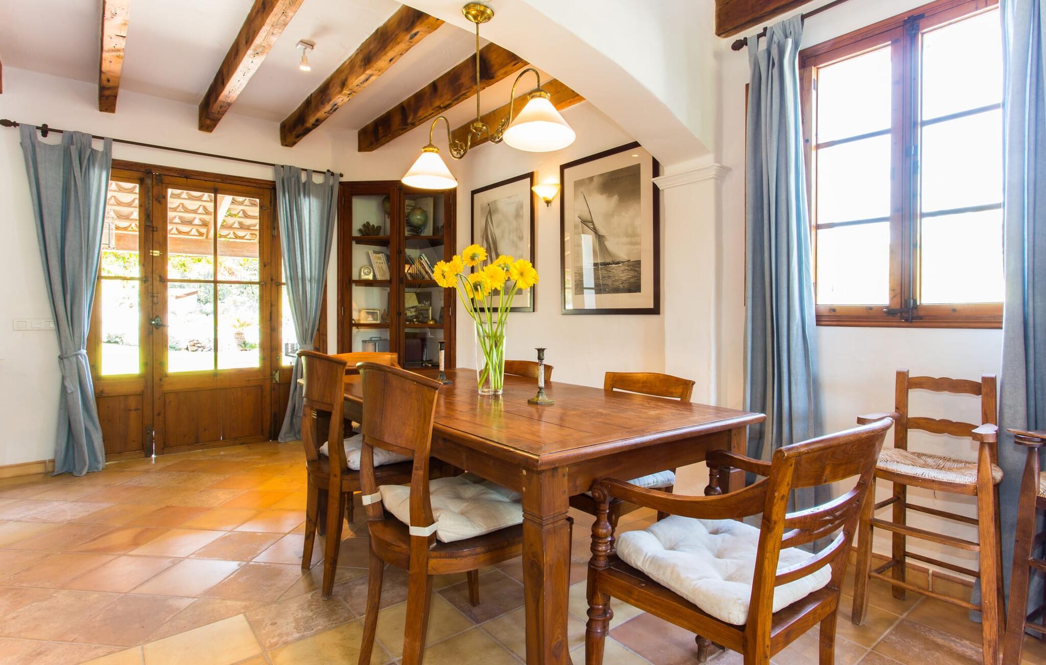 Efter at have kørt ad nogle små lokale veje, ankommer vi på en solskinsdag for at besøge villaen "Can Teulada". Vores første indtryk er: "Sikke et malerisk sted dette er!" Fra første øjeblik mærker vi den overordnede hyggelige atmosfære, der gennemsyrer alt her, og føler os spændte på at udforske ejendommen yderligere. Undervejs stopper vi for at beundre det frodige middelhavsgrønt i form af palmer, buske og blomster, der dekorerer grunden. Foran huset er der en veranda med et kæmpe spisebord i træ. Alle i jeres gruppe kan sidde og spise sammen i dette luftige, overdækkede område. Det bliver også dejligt at få en solid morgenmad herude og hilse på den nye dag med udsigt til haven. På den anden side af verandaen er der en rattan sofa og en anden lavet af mursten, hvilket gør det til et fantastisk sted at slappe af udendørs. Lav jer en god drink og nyd den bare herude på dette hyggelige sted. De grønne skodder på huset, de rustikke synlige loftsbjælker og naturstensgulvene bidrager til følelsen af ??komfort og komfort; Om aftenen fuldender romantiske pendellamper effekten. Blot få skridt væk ligger poolen, hvis afrundede form næsten får det til at ligne en stor dam. Dette indtryk forstærkes yderligere af de store sten, der er placeret rundt om kanterne. Dette fantasifulde design gør poolen til et enestående sted at køle af på en varm sommerdag. Trin, der fører ned i vandet, gør det lettere at komme ind og ud. Så læg jer ned på en af ??de otte komfortable liggestole og forkæl jer selv med den varme middelhavssol, så længe I har lyst. Og foretrækker I at ligge i skyggen, kan I gøre det hele dagen lang i træernes naturlige skygge eller herude under parasollen. Vil I hellere lave noget andet end bare at nyde lediggang ved poolen, så er bordtennisbordet perfekt til jer. Da vi træder ind i villaen, bliver vi straks overrasket over den fortryllende effekt af de forskellige stoffer, farver og møbler i rumsammensætningen. Lyse vægge, synlige loftsbjælker, afrundede buegange og terracotta gulvfliser giver rummet en hyggelig og varm atmosfære, mens unikke kunstværker forstærker den overordnede indbydende atmosfære på dette sted. I stueetagen er der en stor stue med komfortable sofaer og en pejs, der giver ekstra atmosfære på køligere aftener. Lige rundt om hjørnet ligger det traditionelle mallorcanske køkken med et smukt antikt træbord i midten af ??rummet, perfekt til en overdådig indendørs fest. Køkkenet er fuldt udstyret med alt hvad I behøver til hverdagsbrug, herunder ovn, komfur, køleskab med fryser, opvaskemaskine, brødrister, elkedel og filterkaffemaskine. Der er endnu et bord mellem stue og køkken, så der skal altid være plads nok til alle. Der er også et soveværelse og et badeværelse på denne etage; de andre tre soveværelser og to badeværelser er ovenpå. Alle værelser er varme og indbydende og har et højt niveau af æstetik. Intet må forstyrre jeres fred og ro her i dette miljø – også selvom I af og til hører naboernes hunde gø i det fjerne. De moderne badeværelser tilbyder plads og komfort nok til alle på turen; Der er også to hårtørrere til rådighed, så I ikke behøver at tage dem med hele vejen hjemmefra. Et særligt højdepunkt i dette hus er den ombyggede kælder med et stærkt oplyst hovedrum med et spisebord og to senge. Der er også tekøkken med køleskab og komfur. Dette originale opholdsrum er afrundet af yderligere to soveværelser og et badeværelse. Dette område er ideelt for alle teenagere, der tager på turen eller andre, der værdsætter deres privatliv. En anden fordel er, at det på grund af designet holder sig ret køligt her, også når det er rigtig varmt udenfor. Udover alle de ting, vi allerede har nævnt, er en af ??hovedtrækkene ved Villa "Teulada" naturligvis den fantastiske beliggenhed. På den ene side er I omgivet af grønt, men på den anden side er I kun få minutter væk fra havet i bil. Sandstrandene omkring Port de Pollença har en lavvandet indgang til vandet, hvilket gør dem særligt attraktive for familier. Og Pollença er en ideel destination, hvis I nogensinde ønsker at forlade den landlige komfort i jeres villa for et stykke tid. Byen Pollença ligger omkring 7 km fra kysten og har et par egne attraktioner, herunder en smuk kirke. Når I bestiger bakken til Golgata-kapellet, vil I blive belønnet med en storslået udsigt fra oven. Den utroligt charmerende villa "Can Teulada" ligger på en smukt anlagt ejendom kun 3 km fra Pollença. Og den smukke Port de Polleça ligger kun 7 km væk. Denne attraktive lille kystby har en indbydende havnefront med hyggelige caféer, butikker og restauranter. Der er også nogle sandstrande kun en kort køretur væk. For eksempel er der kun 5 km til Platja de Port de Pollença.