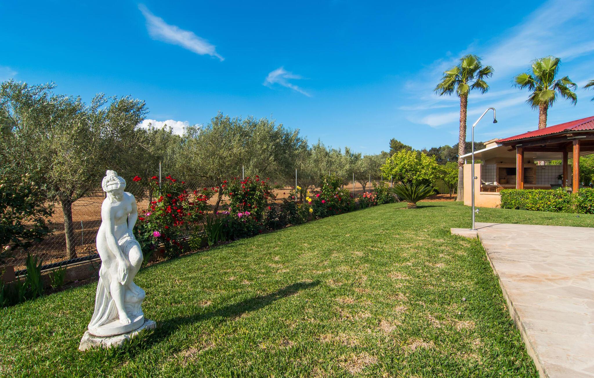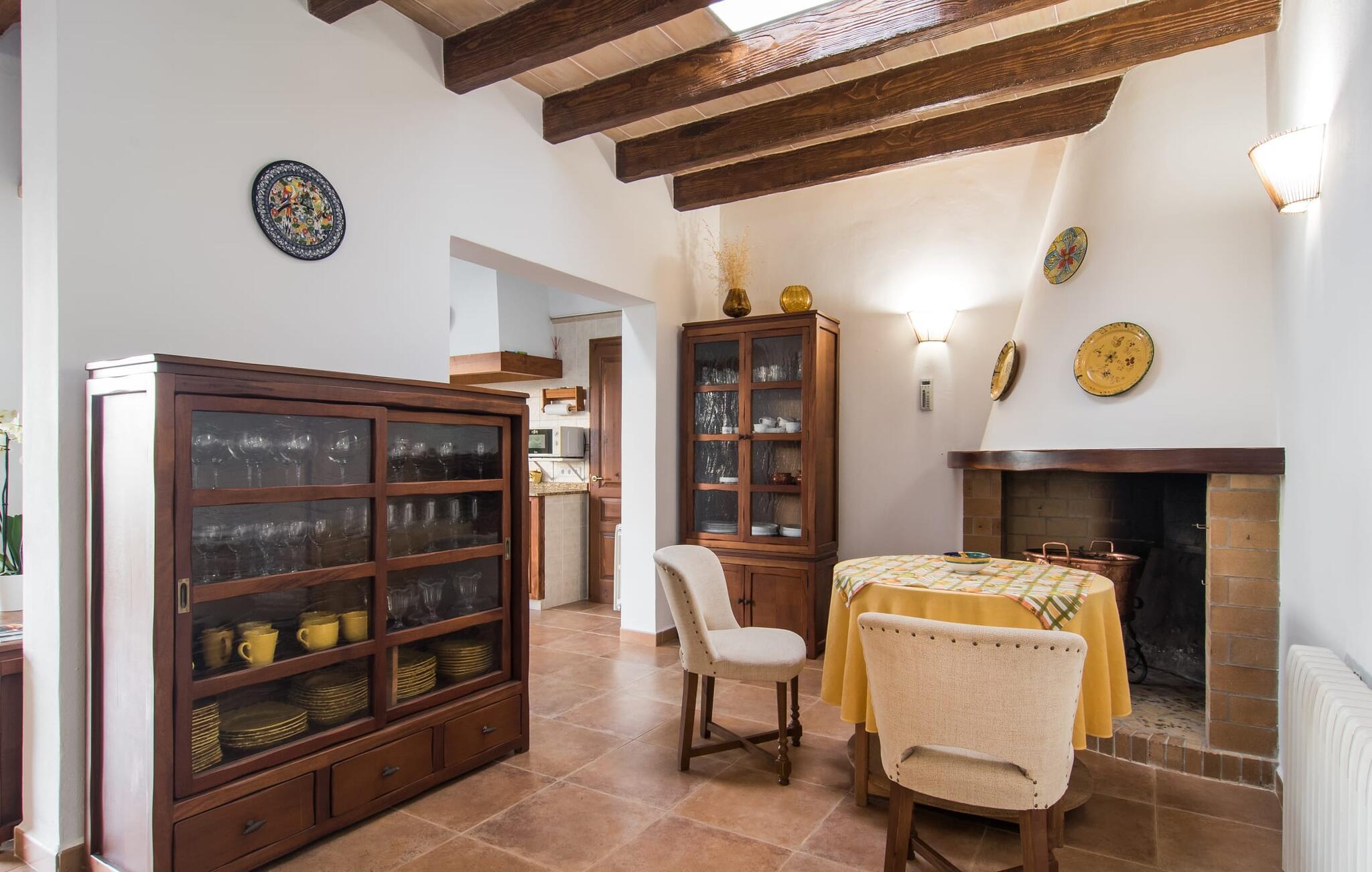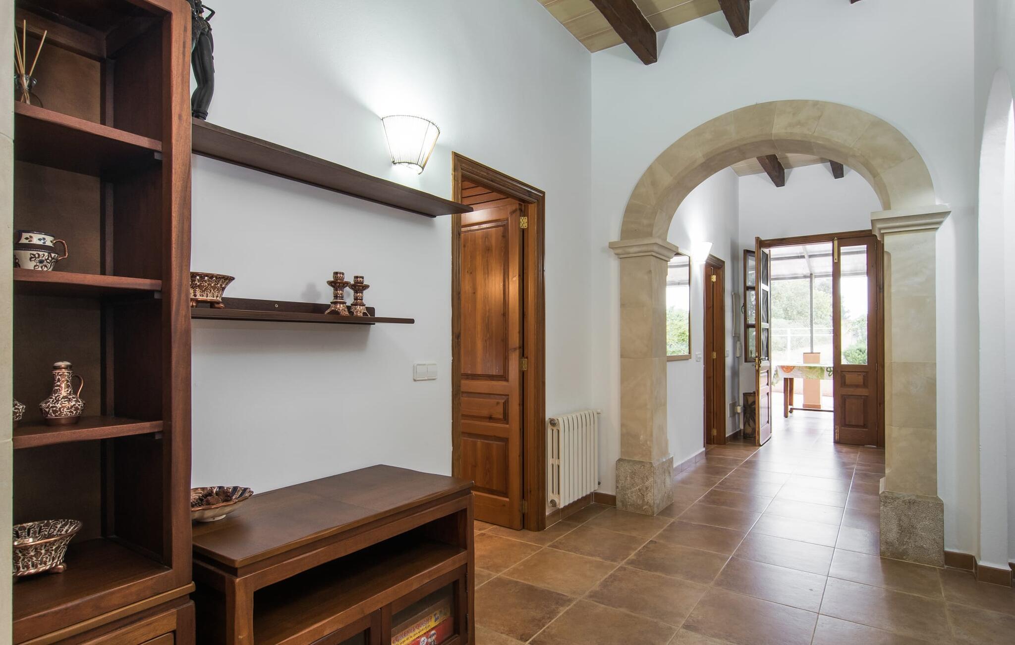 Det rustikke landsted "Can Tomeu de Son Negre" er tæt forbundet med omgivelserne - for den sydlige del af Mallorca byder på en betagende naturskønhed, azurblå bugter med sandstrande og overraskende små byer med talrige seværdigheder. Det autentiske bondehus lover ikke kun en afvekslende ferietid, men tilbyder jer også alt, hvad I ønsker jer af jeres ferie: fred, afslapning og skøn tid sammen. Det rige design af middelhavshaven med høje palmer, oliventræer og græsplæner alene bidrager til værdifuld afslapning. Beliggende i frodige grønne områder tilbyder den mosaik-dækkede pool jer en hudvenlig måde at køle af om morgenen eller sent om aftenen. På den tilstødende naturstensolterrasse kan I nyde den rene blå himmel eller læse en god bog, mens børnene kan bruge deres energi i poolen. Skift jeres yndlings udendørssteder under en afslappende dag på jeres gård. Vi er glade for både havekøkkenet under den sekskantede pavillon med spiseplads og det andet udekøkken under den overdækkede terrasse, som støder direkte op til huset. Indretningen i det hyggelige sommerhus er også alsidig og har naturligvis hyggelig og praktisk indretning, der har fokus på komfort og velvære. Dette opnås gennem en rustik indretning med komfortable møbler i en kombineret opholds- og spisestue med pejs. I tilknytning hertil ligger det halvåbne køkken og spisekammer, som er tilgængeligt fra to sider. Det fuldt udstyrede køkken gør det nemt for jer at vælge bevidst selvforsyning. Naturligheden i det autentiske sommerhus garanterer en behagelig nattesøvn i tre dobbeltværelser. Alle værelser er på samme niveau. Komforten for seks personer – ideel til to familier – rundes af af tre forskelligt designede badeværelser. Særligt praktisk: Det "blå" brusebad har udgang til haven og fungerer derfor også som et yderst behageligt udendørs badeværelse. Oplev det afslappede mallorcanske landliv og fordyb jer i besøg på de omkringliggende vingårde. Tidlig søndag morgen på markedet i Felanitx, ture til smukke Santanyí eller længerevarende strandbesøg til Cales på Mallorca – I er garanteret en varieret ferie. "Can Tomeu de Son Negre" gør det muligt! Det klassiske bondehus "Can Tomeu de Son Negre" præsenterer sig selv som et fritliggende landsted med en middelhavshave og en smuk pool. Feriehuset ligger i den sydlige del af øen mellem Felanitx og Cas Concos de Cavaller. Begge steder kan nås på en behagelig kort køretur på grund af nærheden til landevejen, som kun kan høres lejlighedsvis i visse vinde. Hvis I kan lide en badeferie, vil I opdage smukke sandstrande omkring 15 km væk. Fantastisk landlig beliggenhed nær Felanitx i syd.