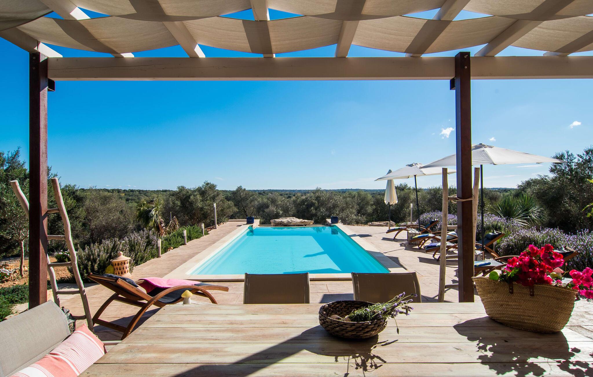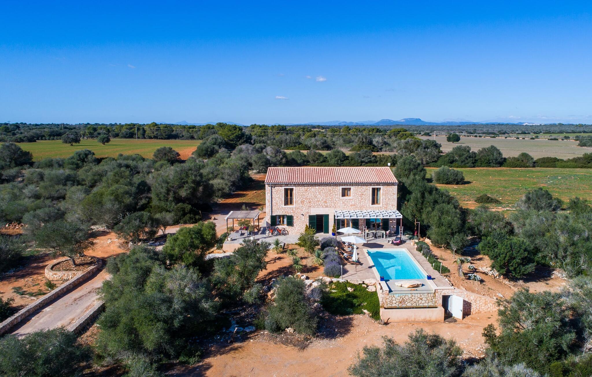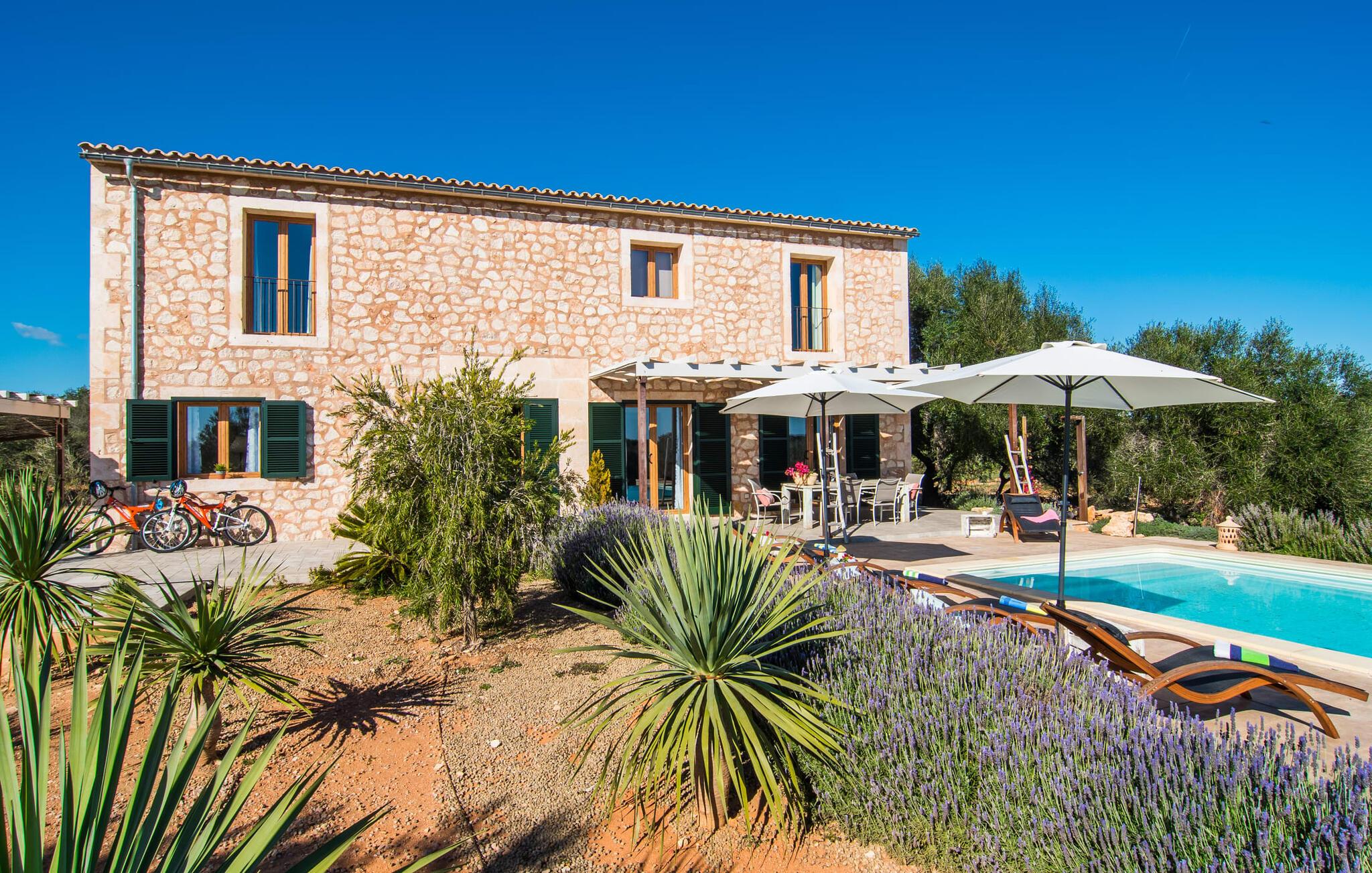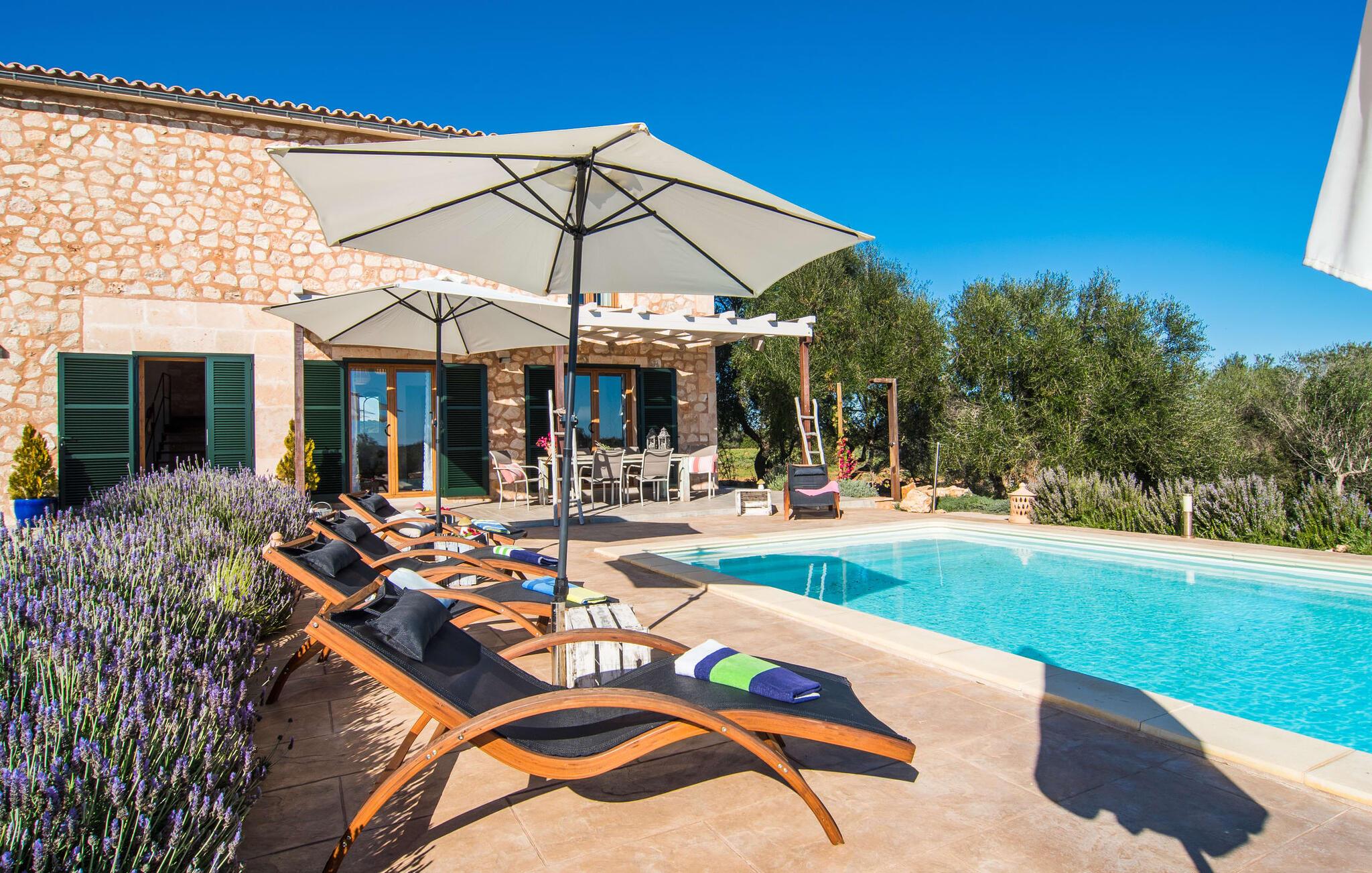 Enhver, der ønsker at opleve den flair, der opstår fra den perfekte blanding af tradition og modernitet, vil have et sandt held med villaen "Can Xesquet". For her er der opnået noget helt særligt, nemlig den meget smarte kombination af traditionel mallorcansk stemning med fordelene ved en moderne nybygning. Denne symbiose er genkendelig ved første øjekast: Natursten møder store, smarte terrasseplader, klassisk arkitektur møder moderne tagkonstruktioner over udendørsserveringen. Sidstnævnte er til gengæld udstyret med dekorative og komfortable siddepladser. Originalt tilbehør som malede vinkasser tilføjer stilfulde accenter og er også praktiske. Det stilfulde pallebord ved siden af ??poolen inviterer jer til at sidde og se ud over infinity-poolen og de omkringliggende oliventræer. Disse hyggelige timer udendørs er ledsaget af vidunderlig fred og ro. Når I vil, kan I nemt glide de få trin ned i det kølige vand og nyde det klare, forfriskende vand på jeres hud. Forhåbentlig venter der allerede en god bog på en af ??de komfortable liggestole, for det er et godt sted at fordybe sig i en spændende læsning og glemme alt omkring sig. Måske kommer en appetitlig lugt fra grillen mod jer og indvarsler den varme aften: en solid grillmad med delikatesser fra Middelhavet overflod af friske, regionale råvarer.