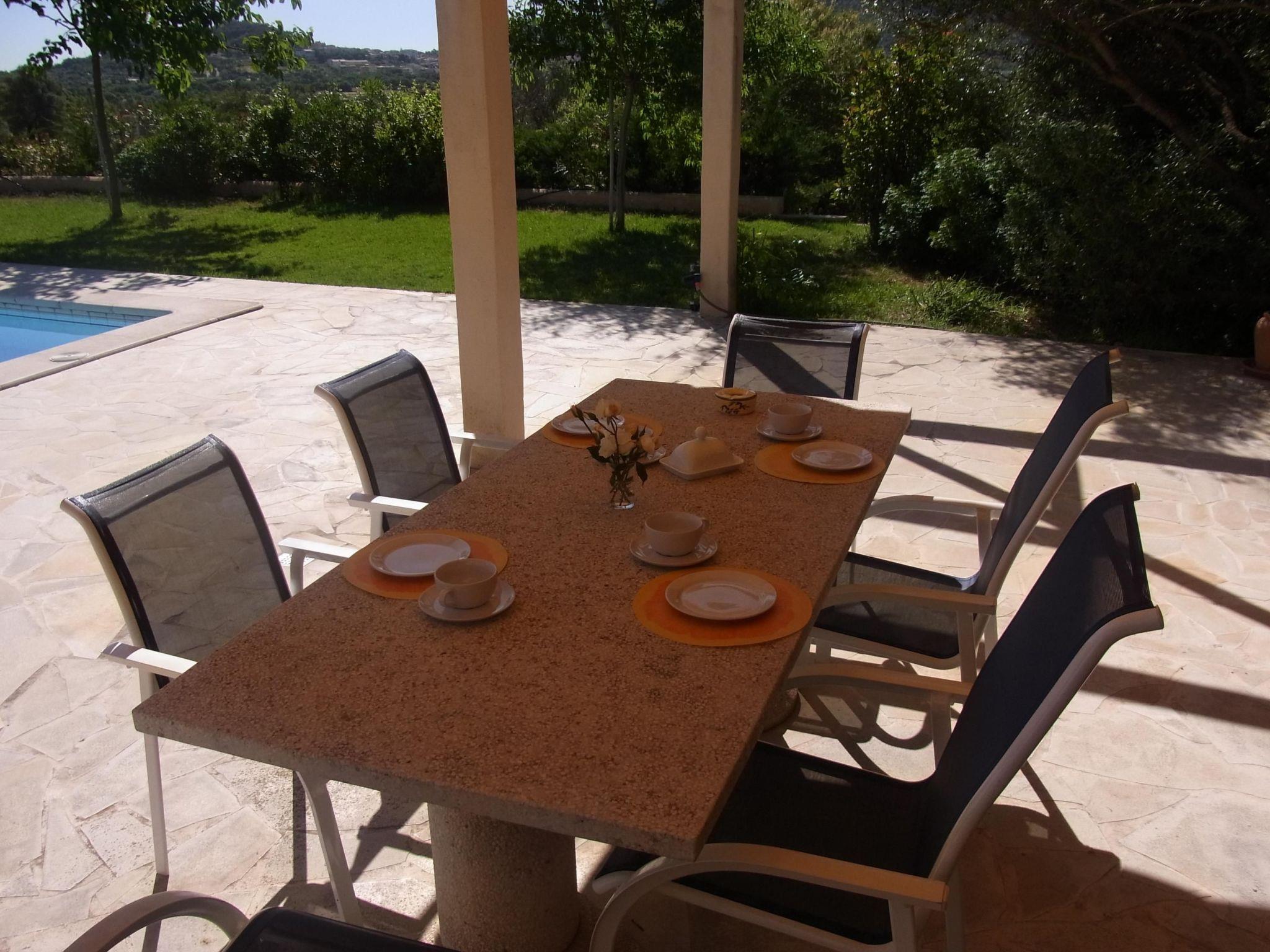 The finca is comfortably furnished with modern appliances and is divided into three double bedrooms, two bathrooms with shower, a spacious living and dining area and a fully equipped kitchen. In all bedrooms, you can sleep comfortably in a double bed (200 cm x 180 cm), which is surrounded by two bedside tables with reading lamps on both sides. Wardrobes provide ample storage space for your travelling wardrobe. The third bedroom leads to the second shower room, which is a private bathroom en suite. The spacious living area invites you to relax together after a day out on a three-seater sofa and two armchairs. The wall-mounted flat-screen TV with satellite TV, TV-USB connection and DVD player provides entertainment in the evening. If you want to be available while on holiday, there is a workstation with desk and office chair. Naturally, a free WLAN internet connection is available. In the separate kitchen you will find everything you need for extensive self-catering. In addition to the four-burner gas hob with oven, a dishwasher and a fridge with freezer compartment, there are also the usual small electrical appliances such as a coffee machine, toaster and kettle. The dining table in the living room seats up to eight people for a cosy meal on upholstered high-backed chairs. From the living room, you can easily access the terrace and the pool area outside. The two bathrooms are each designed as a shower room with WC and wash hand basin. The property is also equipped with a washing machine and heating in all rooms for the winter months.