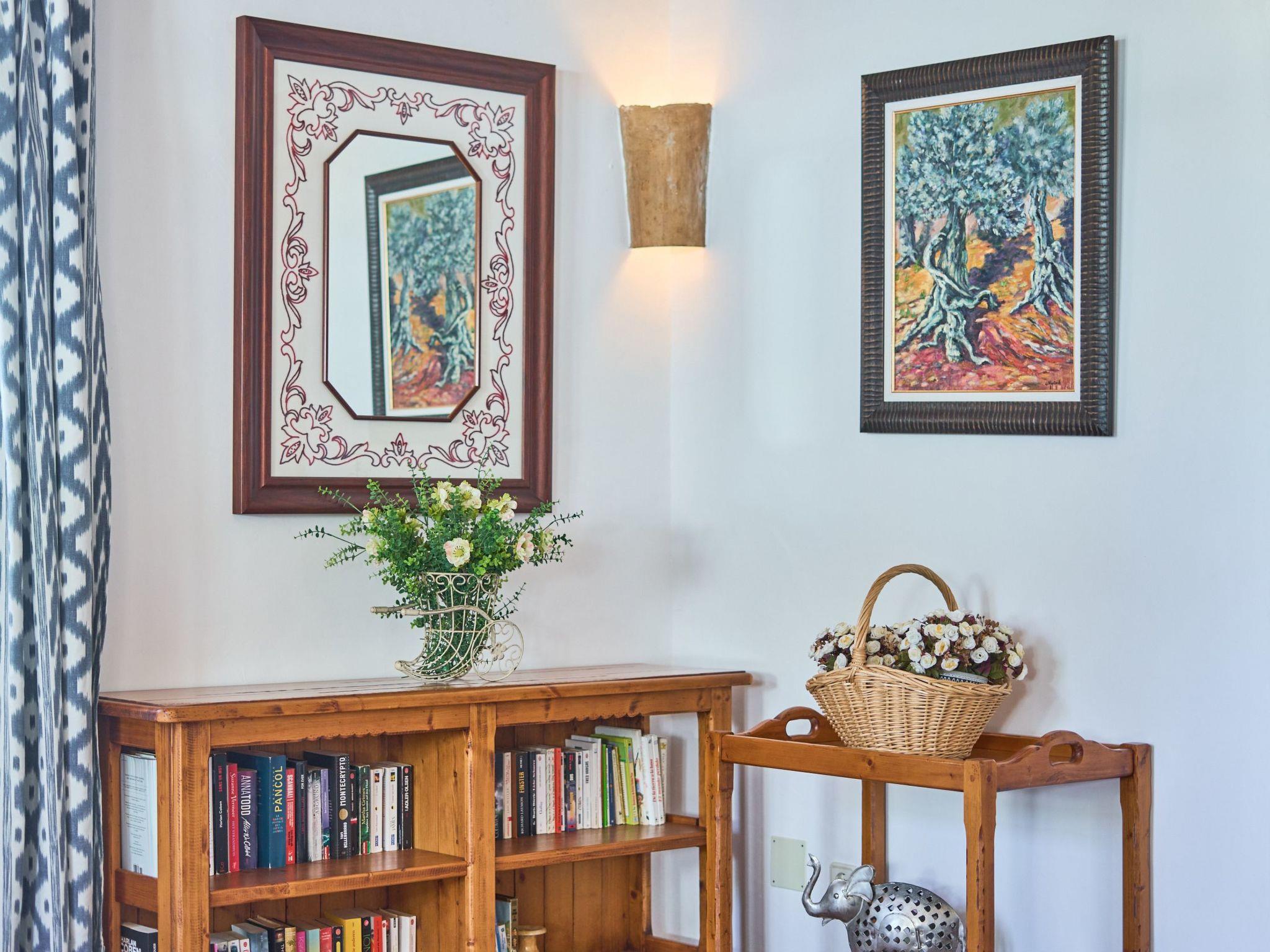 On the first floor there are three bedrooms and two bathrooms. The master bedroom with a double bed has access to a terrace with panoramic views of the surrounding area. The other two bedrooms each have two single beds and share two bathrooms with a bathtub. Here you will also find two lounge areas with sofas, ideal for relaxing or reading.