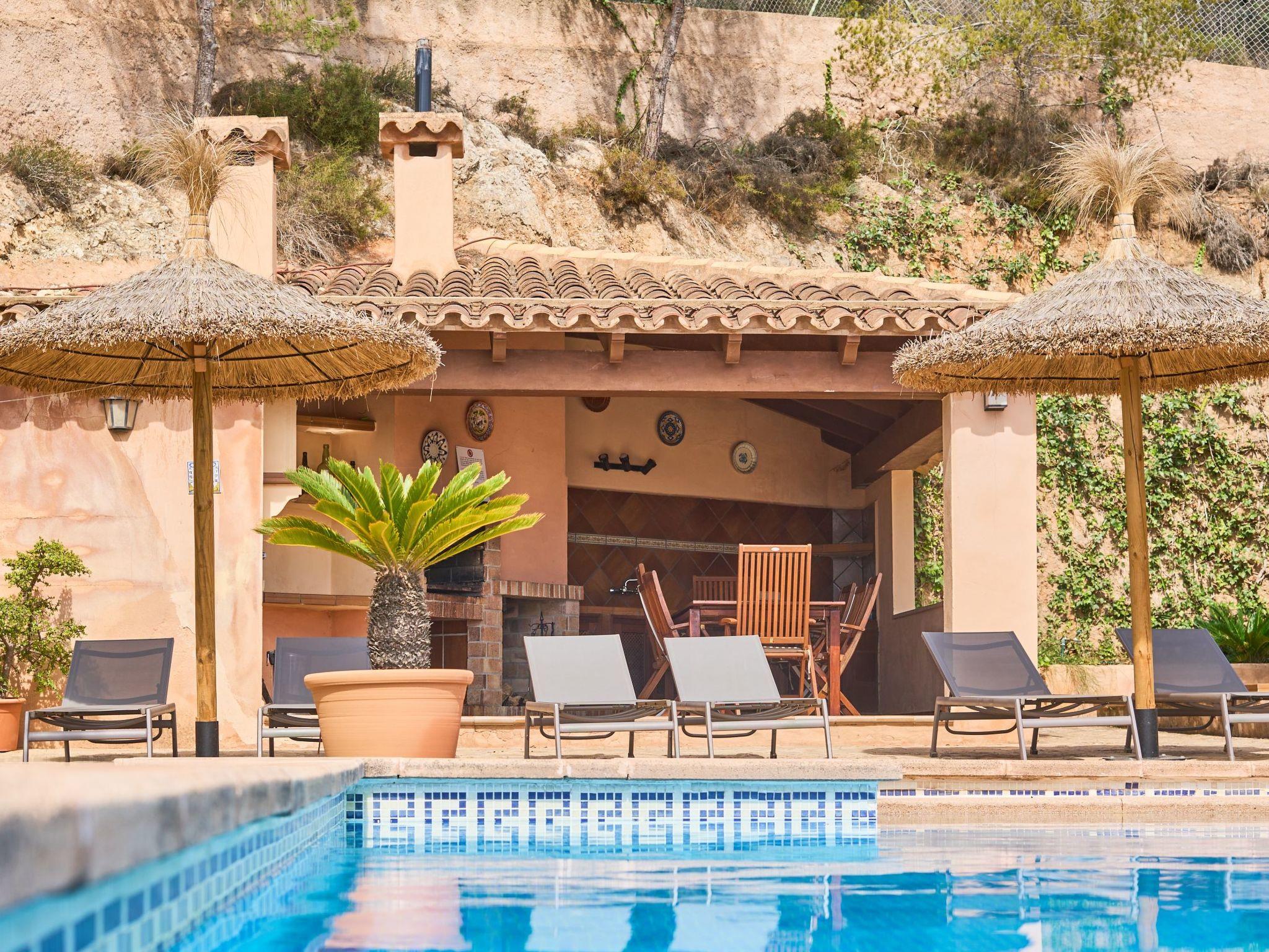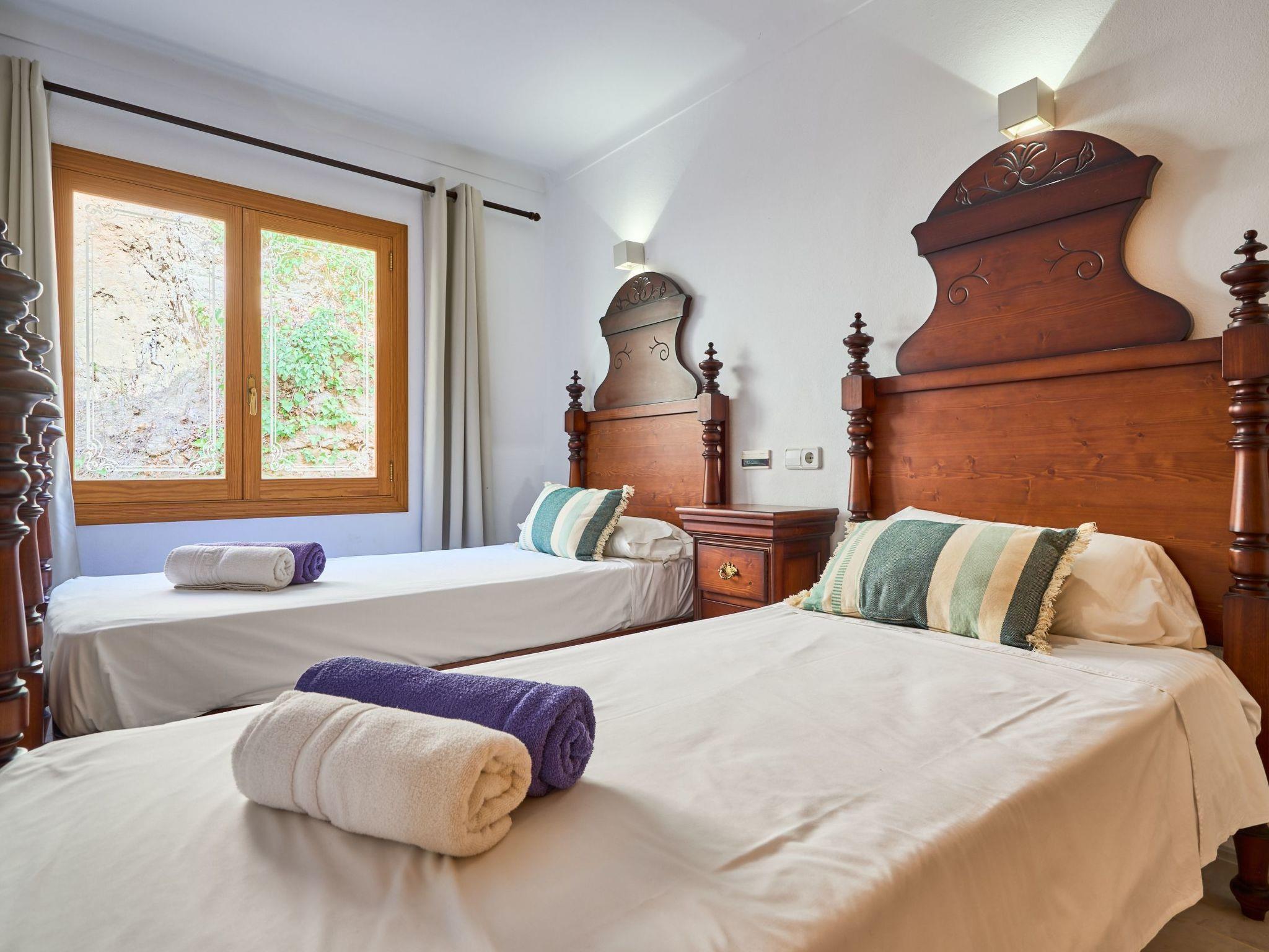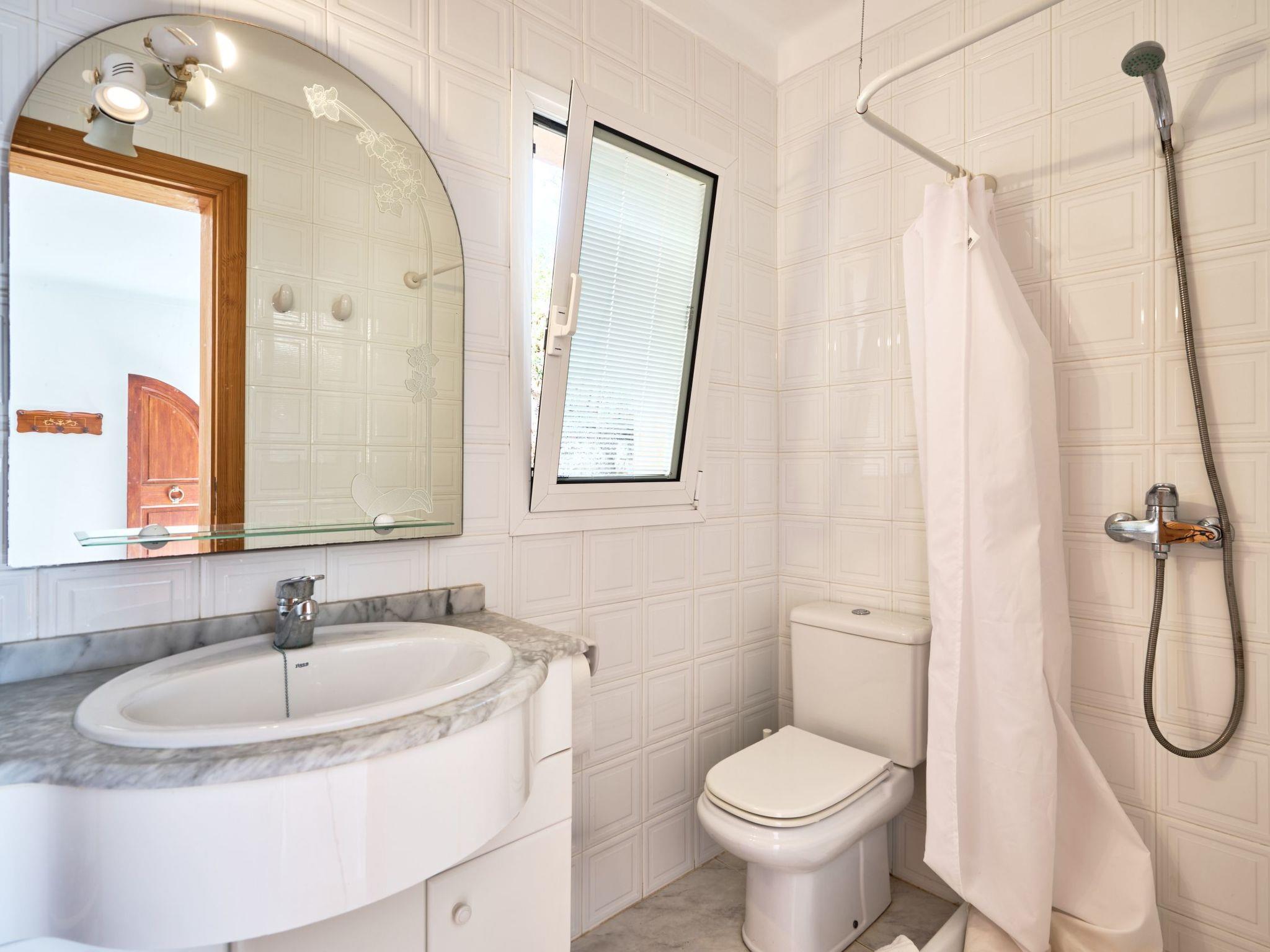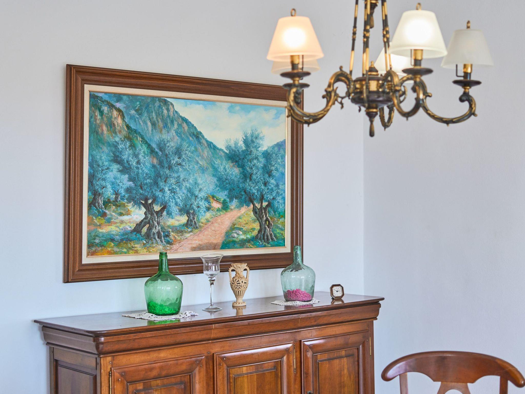 On the ground floor, the living and dining rooms are connected by a round arch and have access to a small terrace with panoramic views of the coast and access to the pool area. The kitchen, which is equipped for holiday use, also has another side door with access to the outside and pool area. The ground floor also has two double bedrooms and two separate bathrooms, one with a shower and the other with a bathtub.