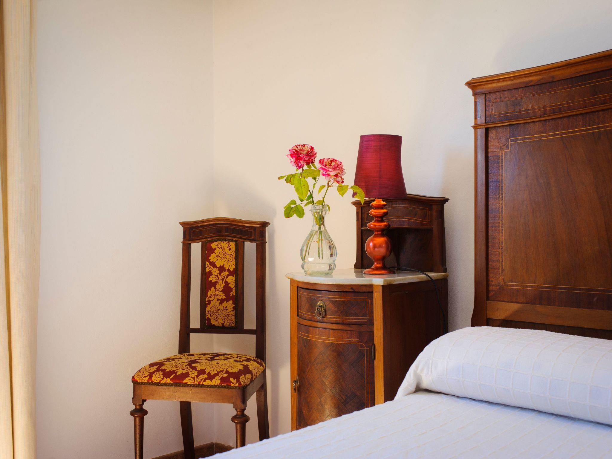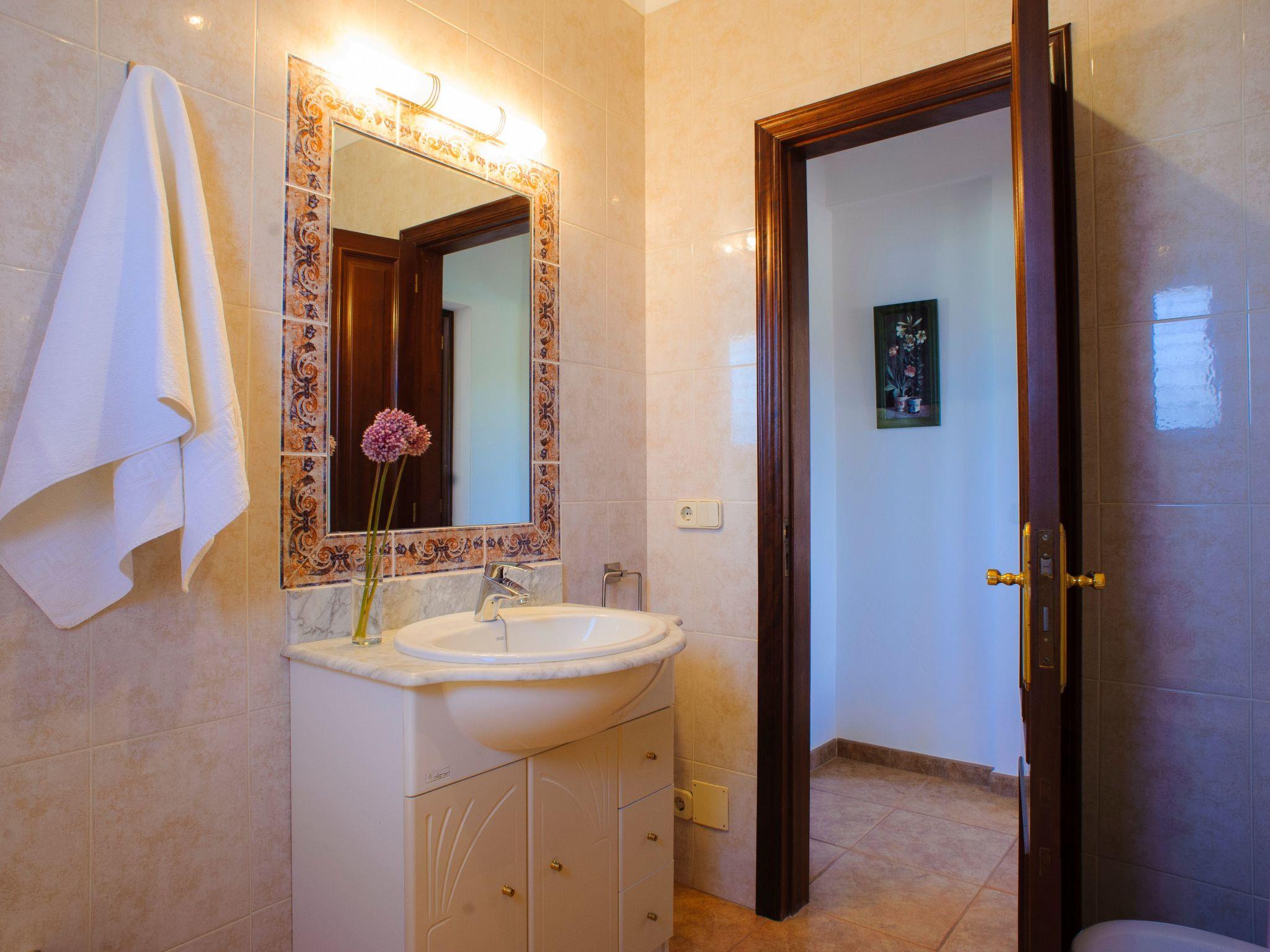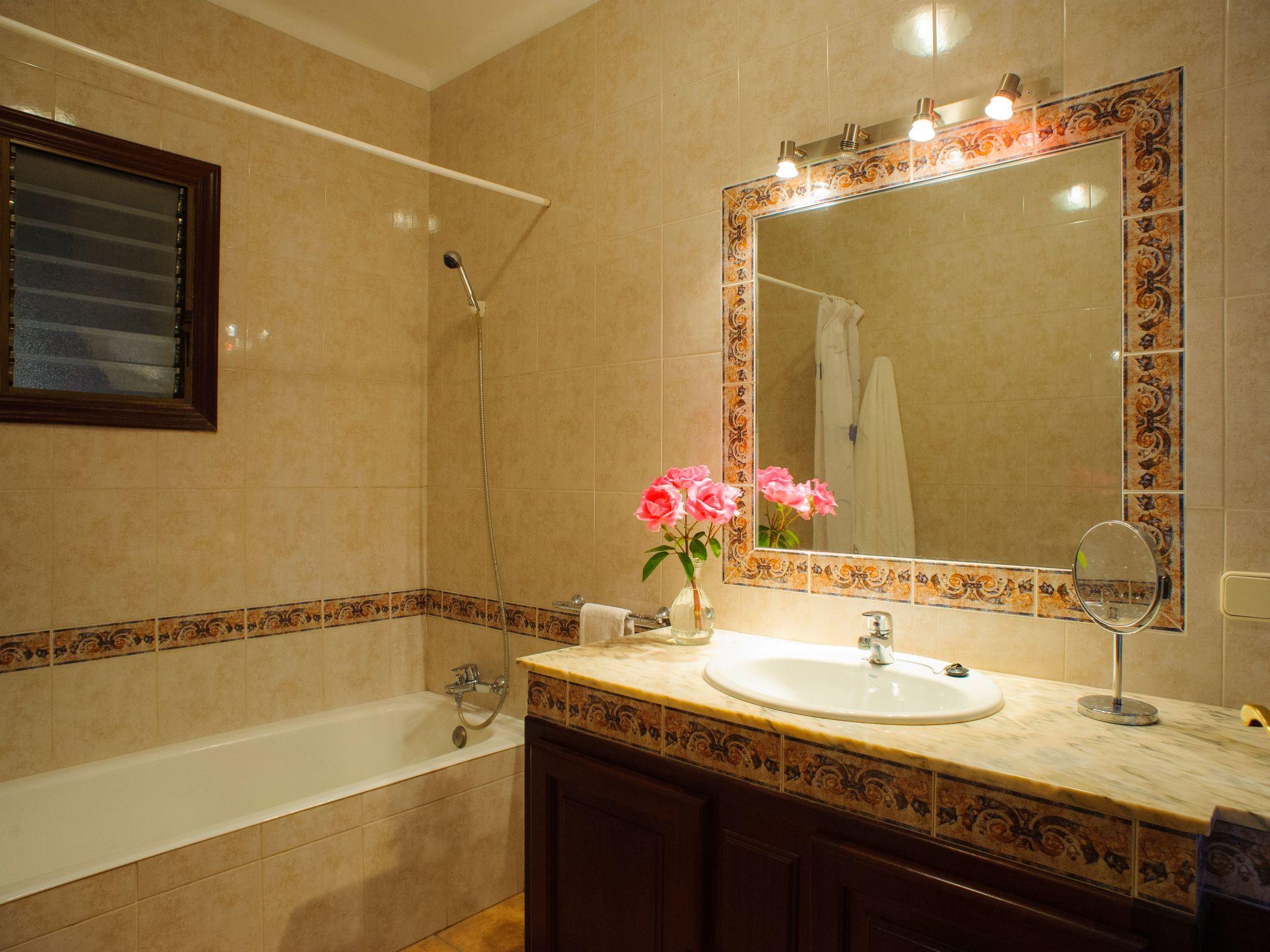 The rustic house is furnished to a high standard and offers air conditioning and central heating in all rooms. The spacious entrance area leads into the cosy, bright living and dining room with sofa area, satellite TV, DVD and a closed fireplace. Large doors lead onto the veranda with dining table, which offers a fantastic view of the entire surrounding area. In the lower area is also the very well-equipped, spacious kitchen with dining area. Service room with washing machine. There are also two double bedrooms with wonderful panoramic views and an adjoining bathroom with bathtub. A staircase leads to the upper floor with the master bedroom. This room has its own sun terrace from which the landscape can be marvelled at. A further attractive double bedroom and a single bedroom as well as a large family bathroom complete the upper floor.