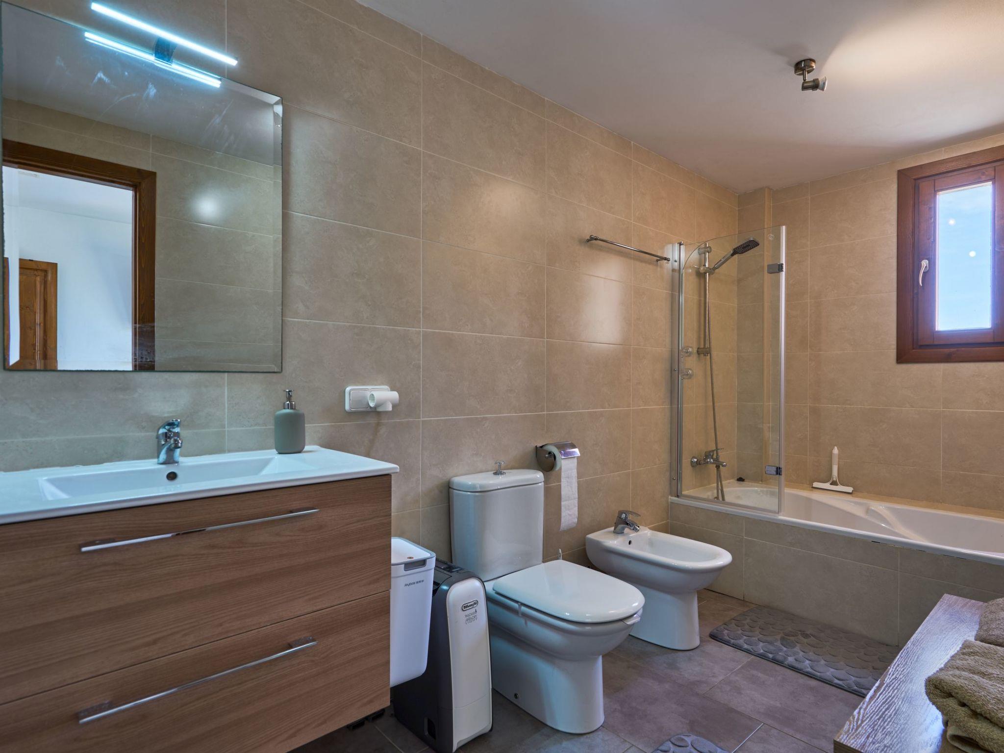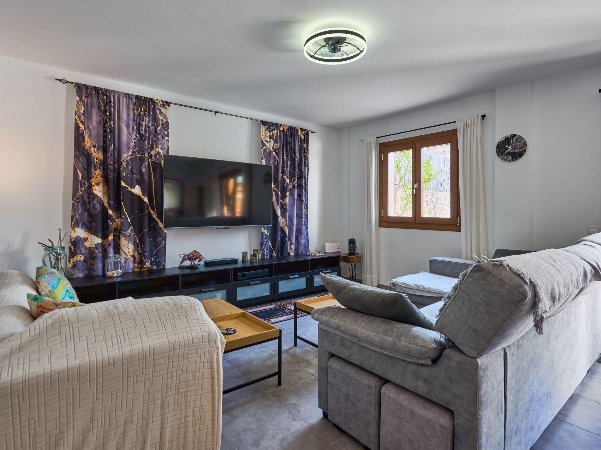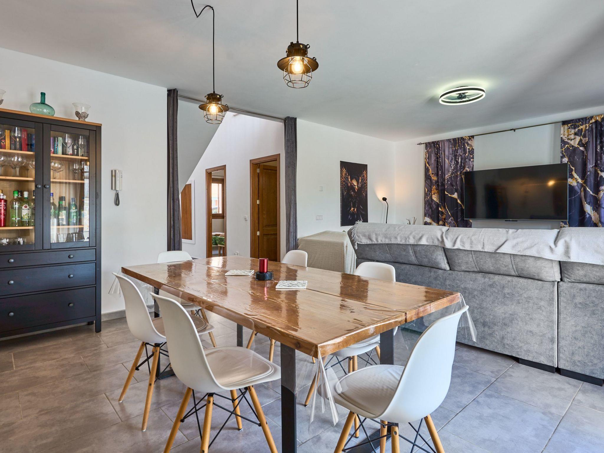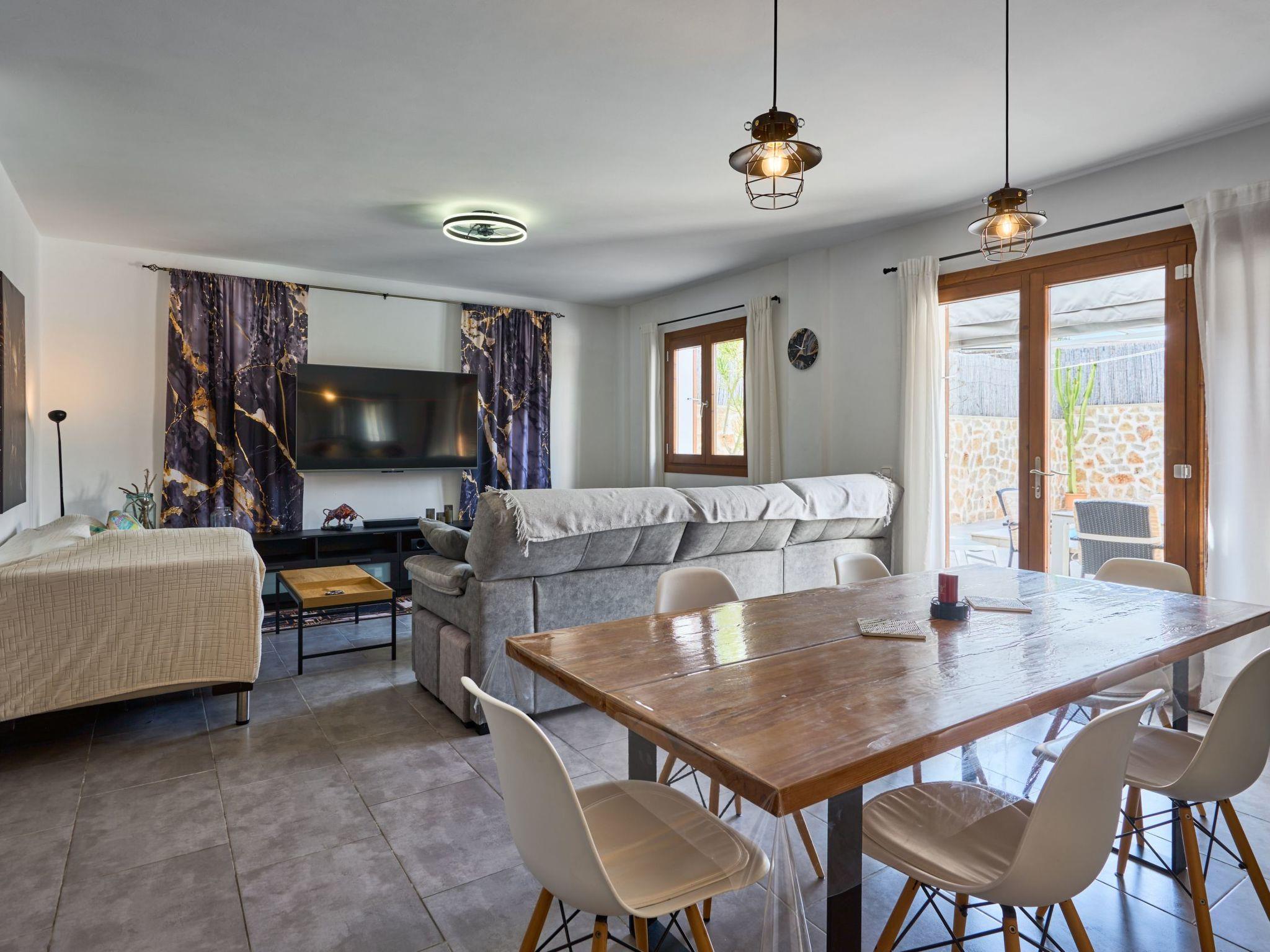 The Peral Cas Concos is a two-storey terraced house with plenty of natural light, located in a row with two other new builds. The entrance area leads to an open-plan living and dining room, equipped with a 65" satellite TV plus sound system. From here there is direct access to the pool area. The adjoining kitchen is well equipped and has a pantry. Direct access to the pool area and to a utility area with washing machine. There is also a bedroom with a separate shower room on the ground floor. A staircase leads to the first floor. From here there is access to a large terrace. The ideal place to read your favourite book or sunbathe in privacy. There are also two further double bedrooms with wall-mounted fire TVs on the upper floor. Both rooms also have their own bathroom with bath and shower.