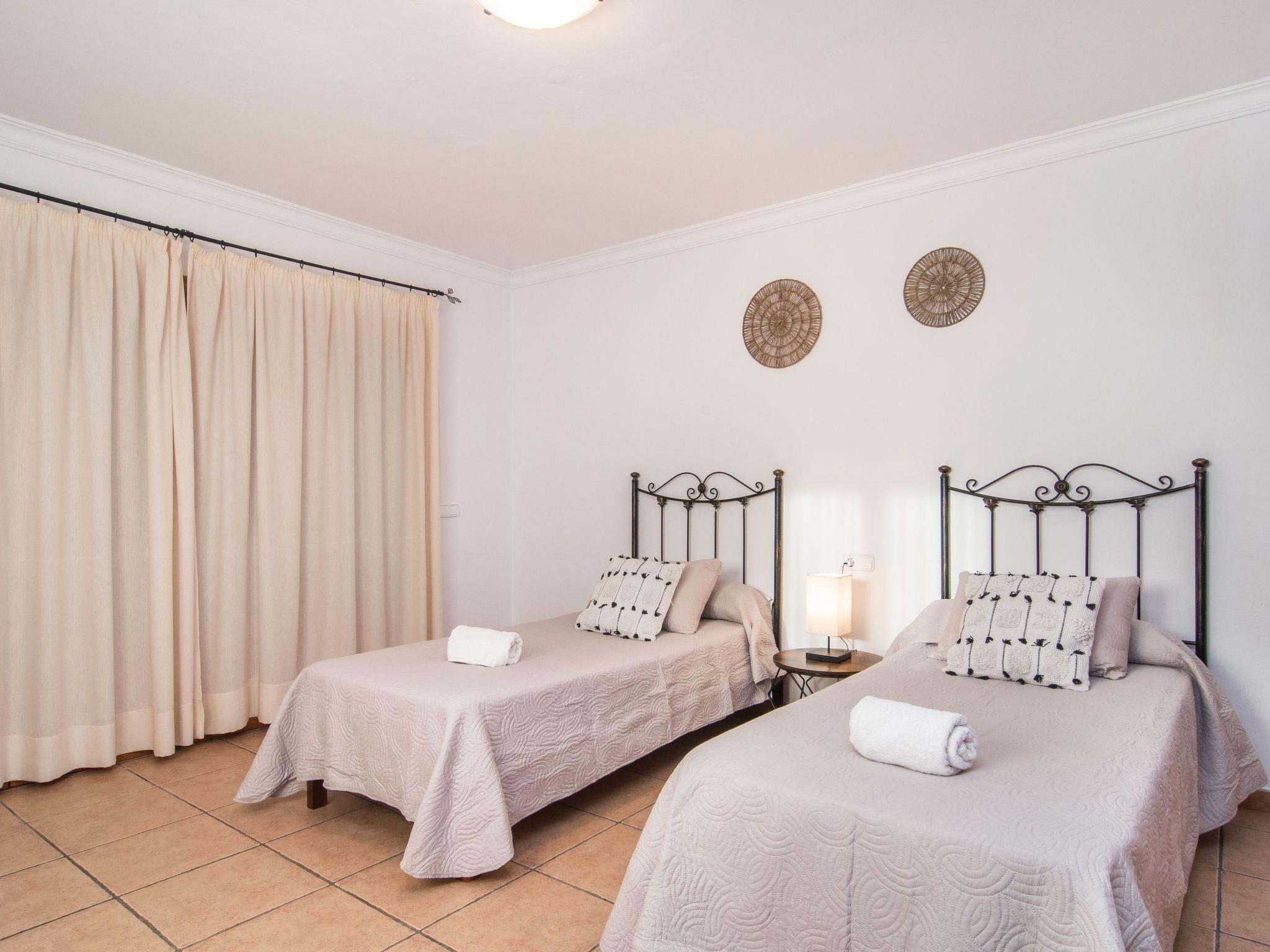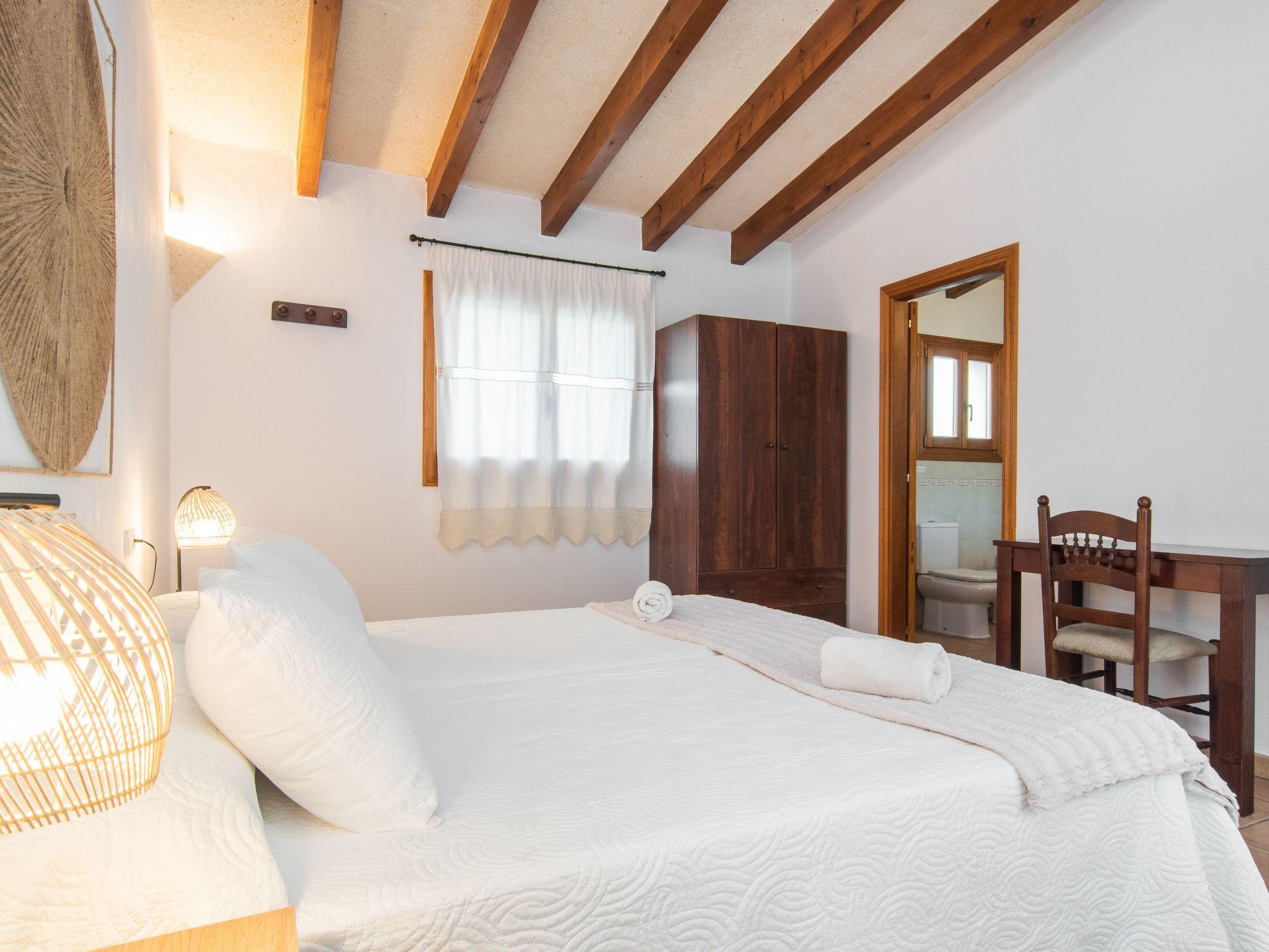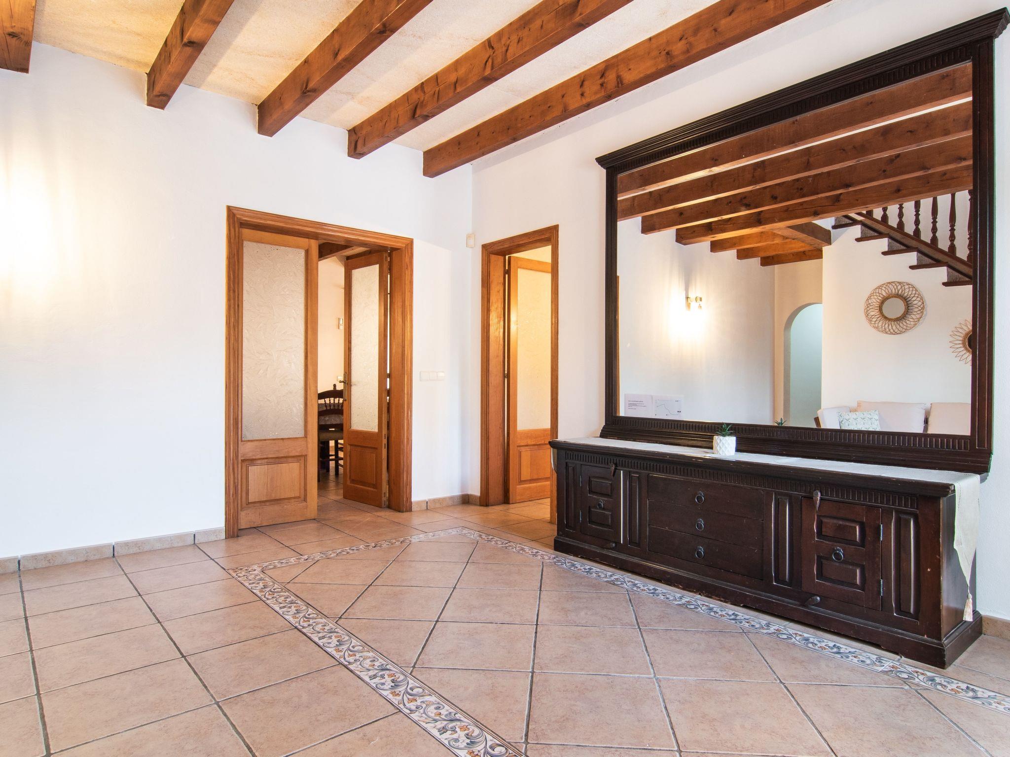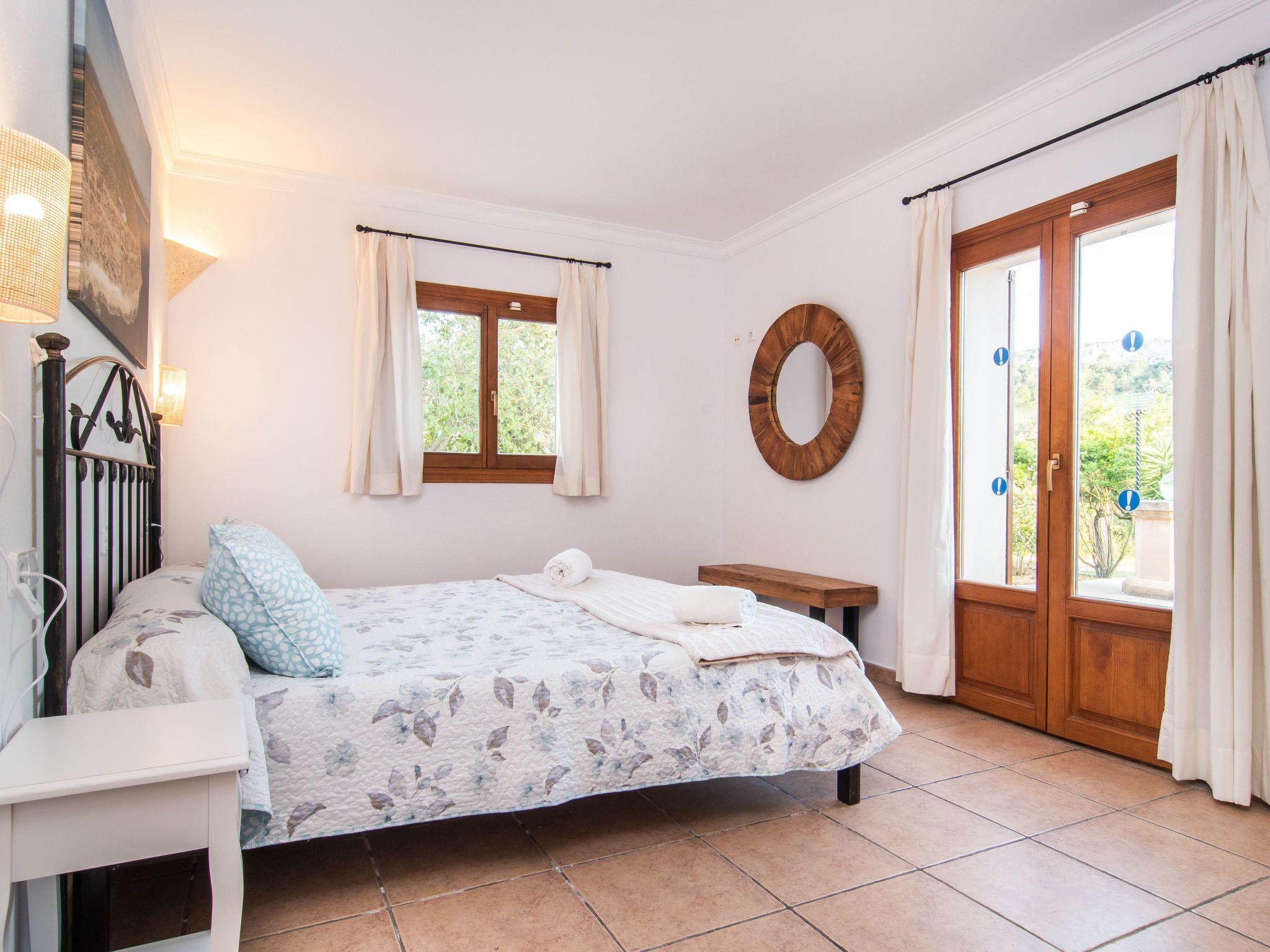 The Peris house is an attractive Mallorcan-style country house with large rooms. The terraces invite you to relax and enjoy the marvellous views over the countryside. From the entrance area there is access to a cosy living/dining area with comfortable sofas, a fireplace and a large wooden table for 10 people. From here you also have access to the covered terrace with dining area and the large kitchen, which has a pantry and a breakfast nook. Next to the dining area is a bedroom with two single beds and a shower room, which also has a washing machine and tumble dryer. On the other side of the living room there are two further bedrooms, one with two single beds and one with a double bed and access to the terrace with views over the countryside. These two bedrooms share a bathroom. From the entrance area, steps lead to the upper floor with two further bedrooms, one with a double bed and en suite bathroom, the other with two single beds and en suite bathroom. Both bedrooms share a terrace with views of the garden and pool area as well as the mountains in the distance.