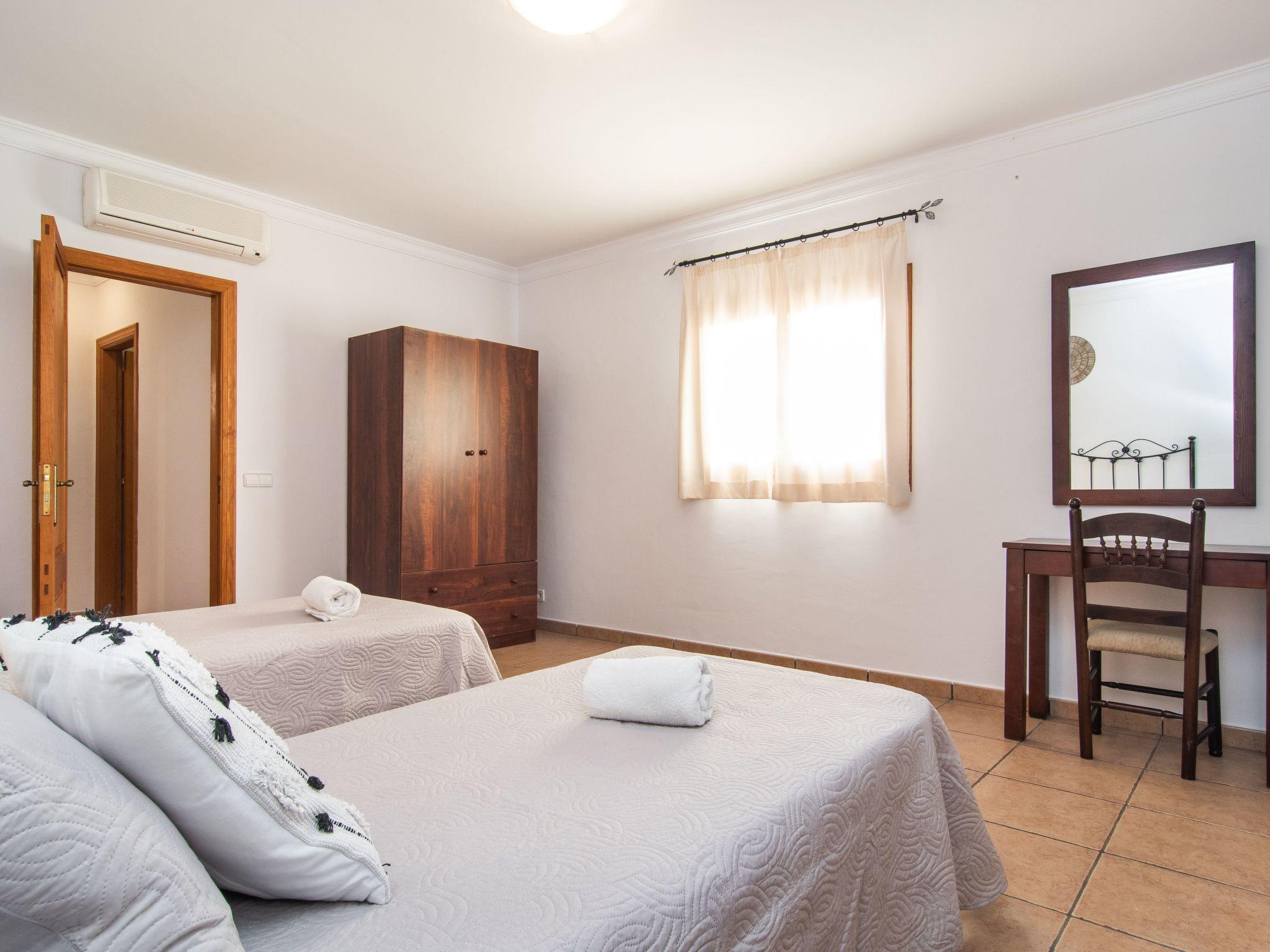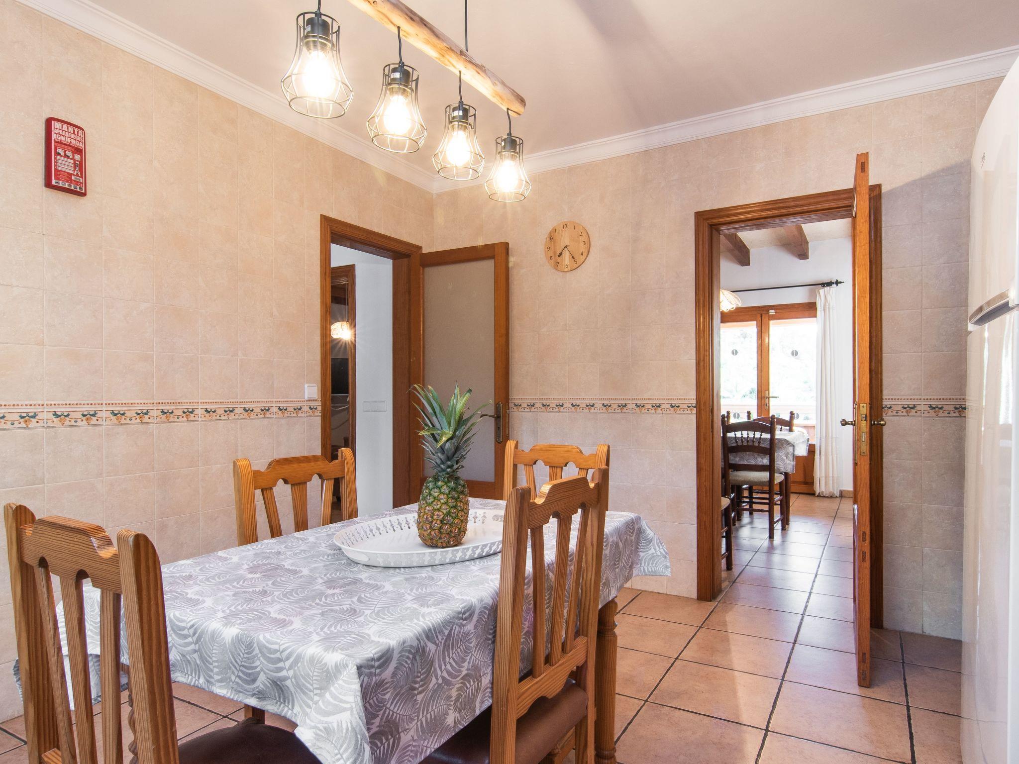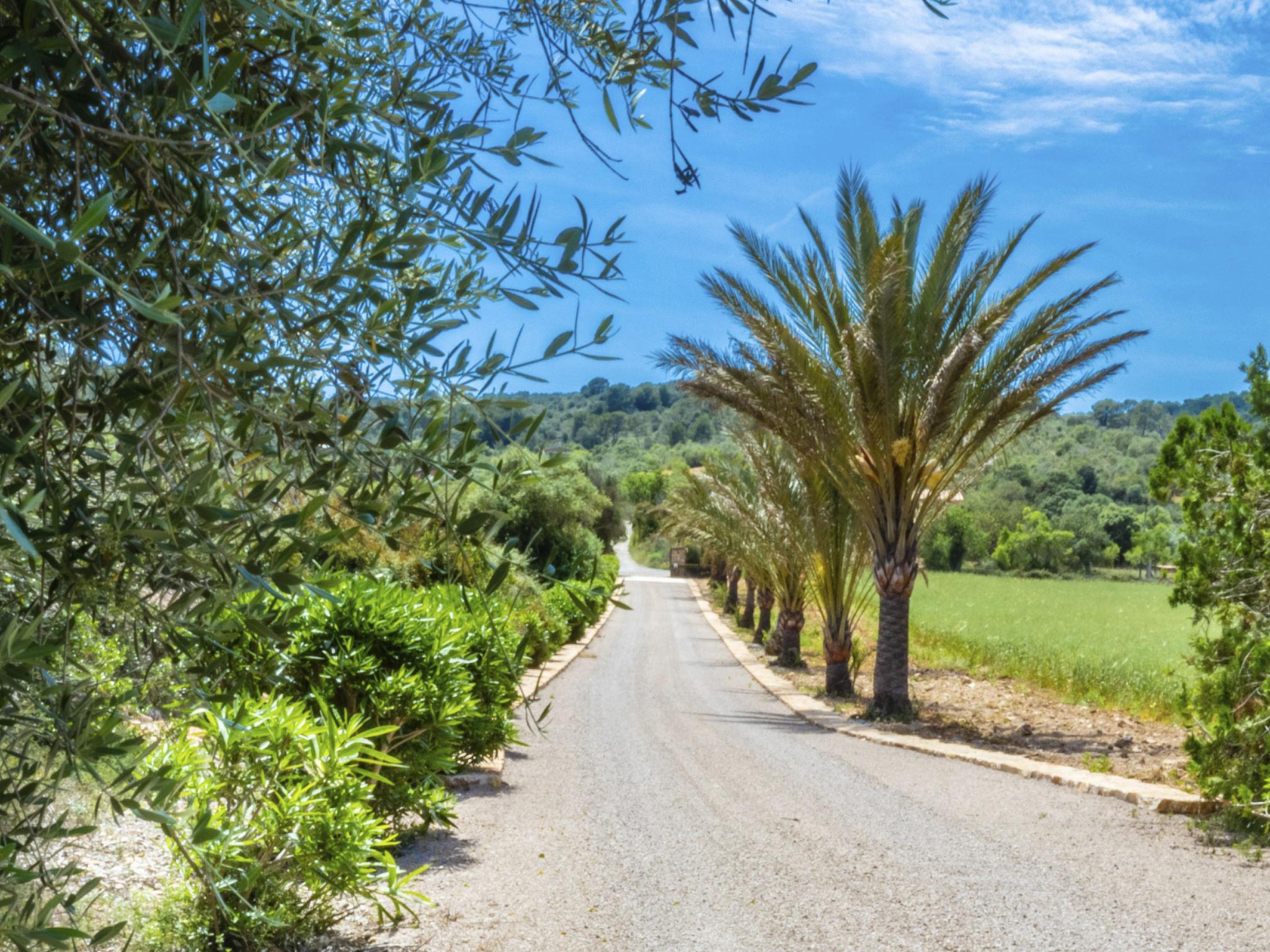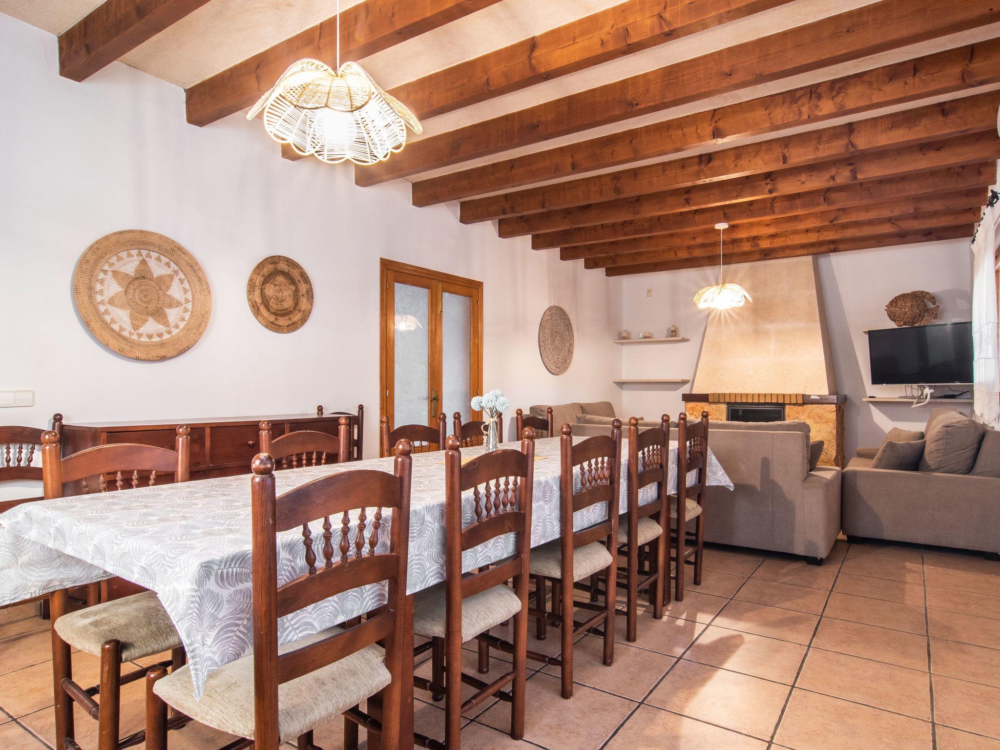 The Peris house is an attractive Mallorcan-style country house with large rooms. The terraces invite you to relax and enjoy the marvellous views over the countryside. From the entrance area there is access to a cosy living/dining area with comfortable sofas, a fireplace and a large wooden table for 10 people. From here you also have access to the covered terrace with dining area and the large kitchen, which has a pantry and a breakfast nook. Next to the dining area is a bedroom with two single beds and a shower room, which also has a washing machine and tumble dryer. On the other side of the living room there are two further bedrooms, one with two single beds and one with a double bed and access to the terrace with views over the countryside. These two bedrooms share a bathroom. From the entrance area, steps lead to the upper floor with two further bedrooms, one with a double bed and en suite bathroom, the other with two single beds and en suite bathroom. Both bedrooms share a terrace with views of the garden and pool area as well as the mountains in the distance.