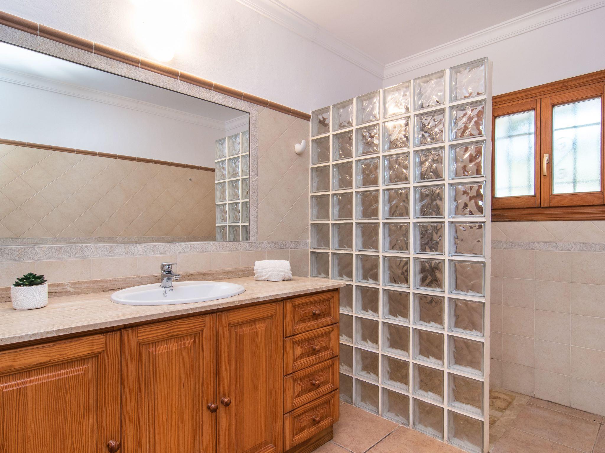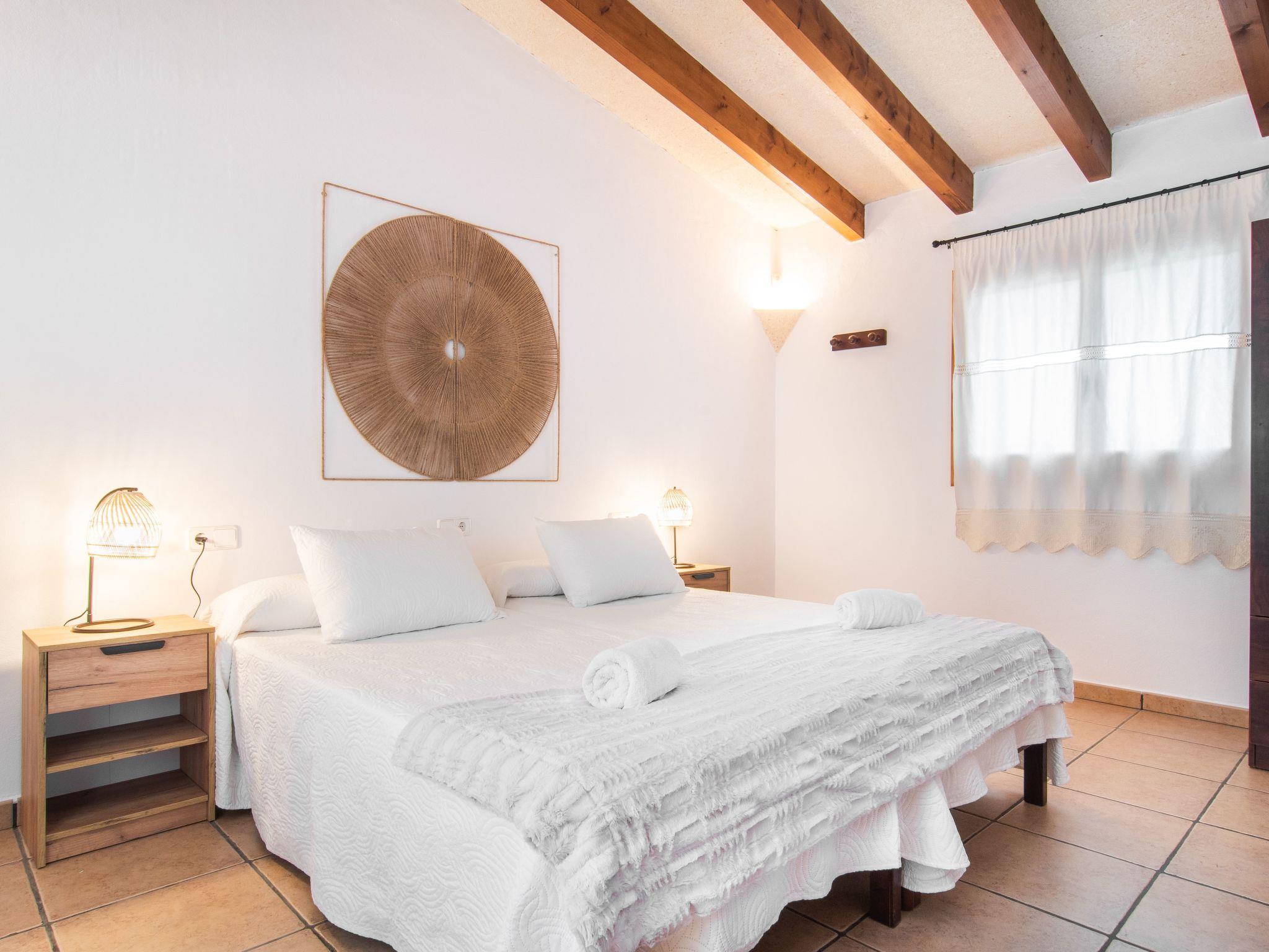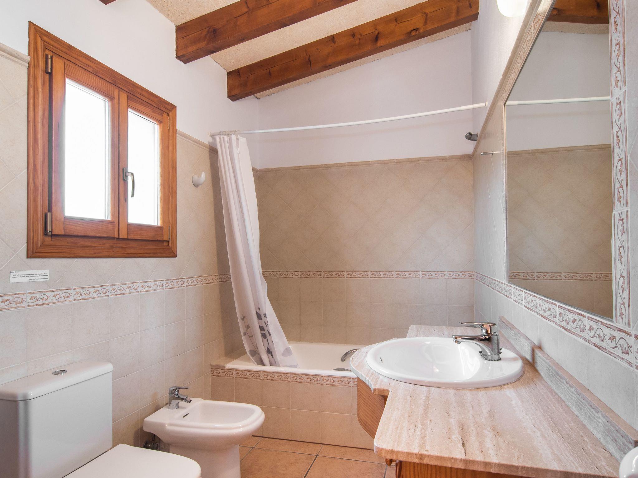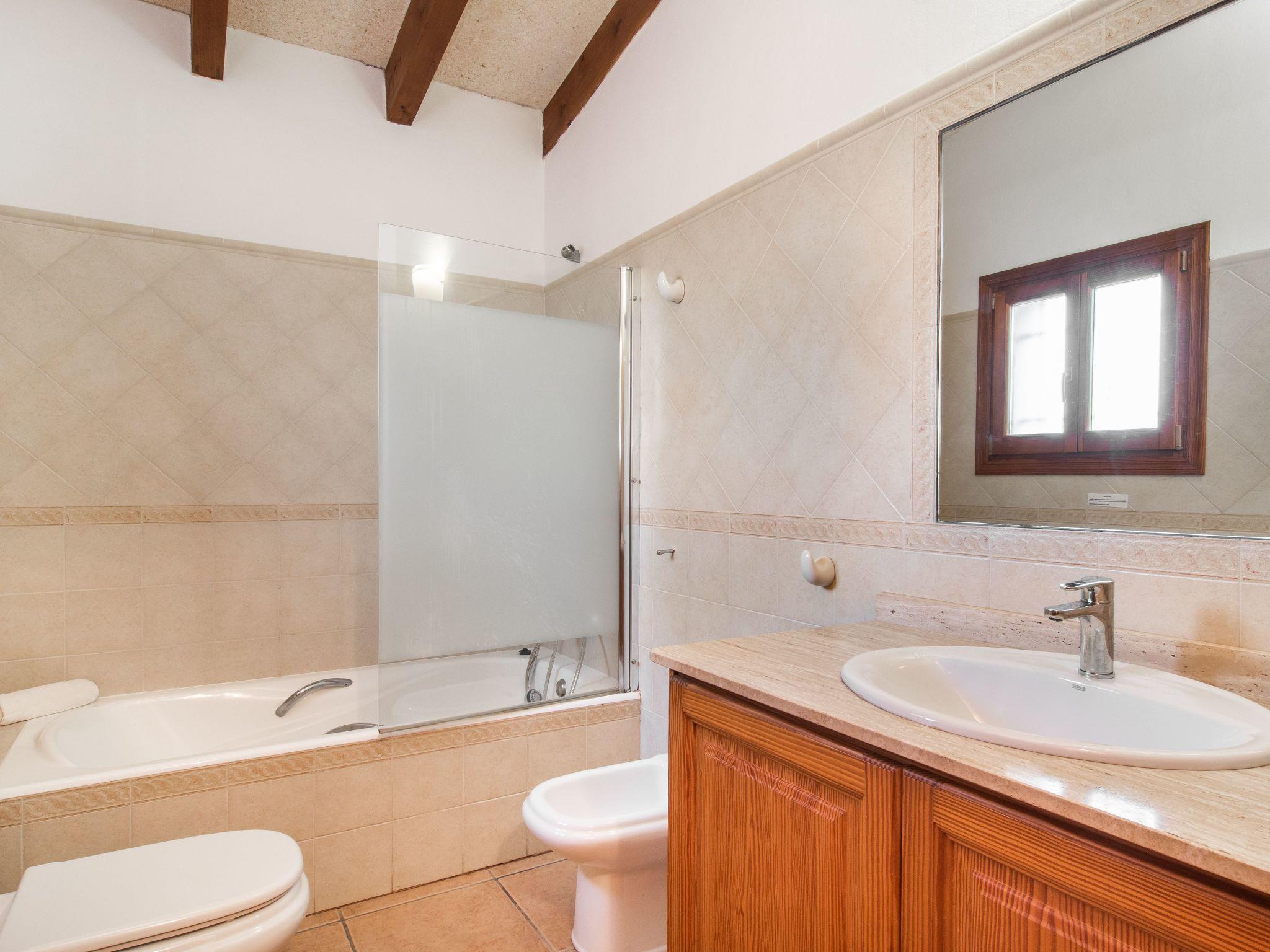 The Peris house is an attractive Mallorcan-style country house with large rooms. The terraces invite you to relax and enjoy the marvellous views over the countryside. From the entrance area there is access to a cosy living/dining area with comfortable sofas, a fireplace and a large wooden table for 10 people. From here you also have access to the covered terrace with dining area and the large kitchen, which has a pantry and a breakfast nook. Next to the dining area is a bedroom with two single beds and a shower room, which also has a washing machine and tumble dryer. On the other side of the living room there are two further bedrooms, one with two single beds and one with a double bed and access to the terrace with views over the countryside. These two bedrooms share a bathroom. From the entrance area, steps lead to the upper floor with two further bedrooms, one with a double bed and en suite bathroom, the other with two single beds and en suite bathroom. Both bedrooms share a terrace with views of the garden and pool area as well as the mountains in the distance.