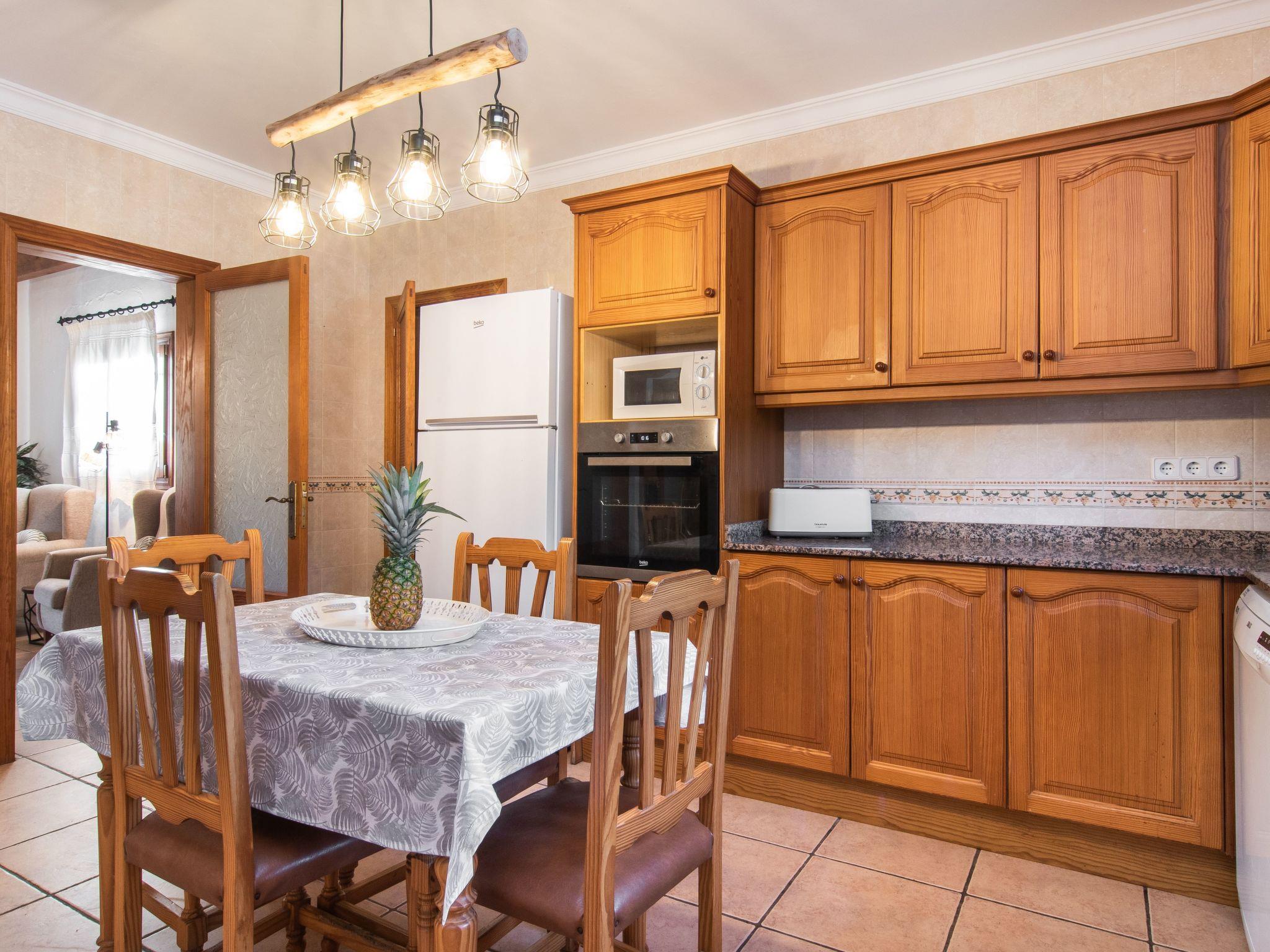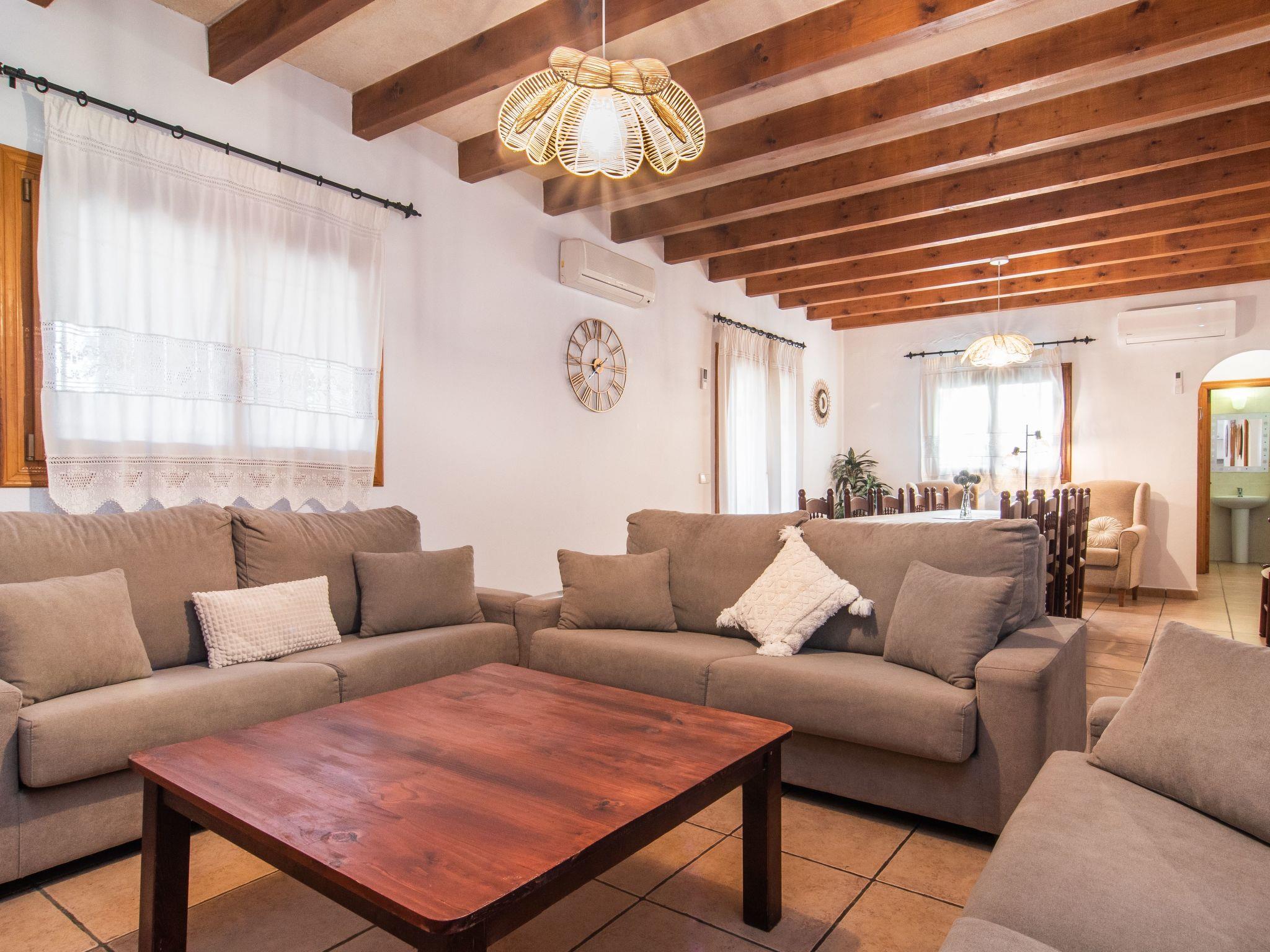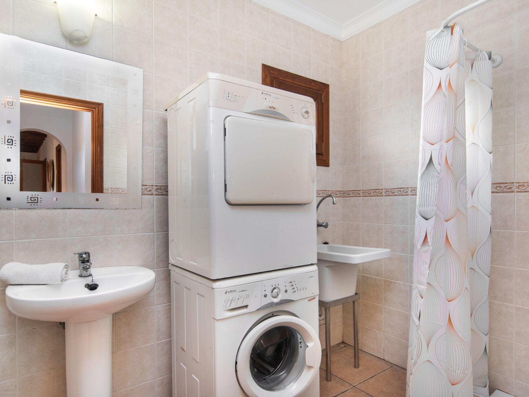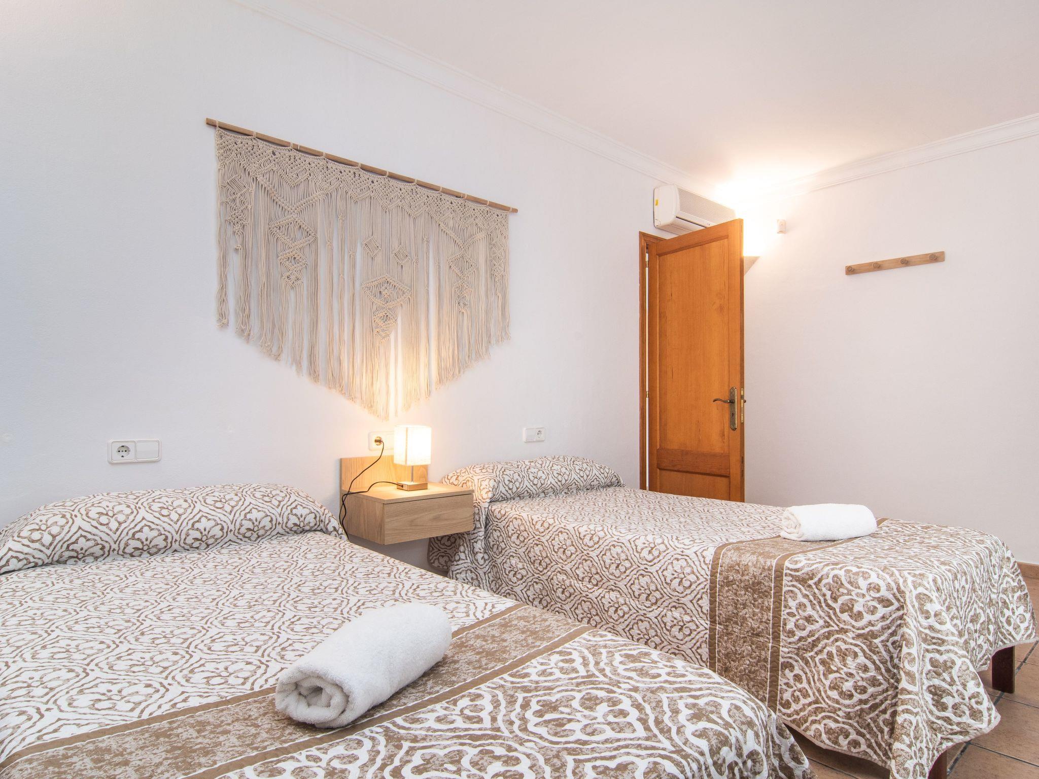 The Peris house is an attractive Mallorcan-style country house with large rooms. The terraces invite you to relax and enjoy the marvellous views over the countryside. From the entrance area there is access to a cosy living/dining area with comfortable sofas, a fireplace and a large wooden table for 10 people. From here you also have access to the covered terrace with dining area and the large kitchen, which has a pantry and a breakfast nook. Next to the dining area is a bedroom with two single beds and a shower room, which also has a washing machine and tumble dryer. On the other side of the living room there are two further bedrooms, one with two single beds and one with a double bed and access to the terrace with views over the countryside. These two bedrooms share a bathroom. From the entrance area, steps lead to the upper floor with two further bedrooms, one with a double bed and en suite bathroom, the other with two single beds and en suite bathroom. Both bedrooms share a terrace with views of the garden and pool area as well as the mountains in the distance.