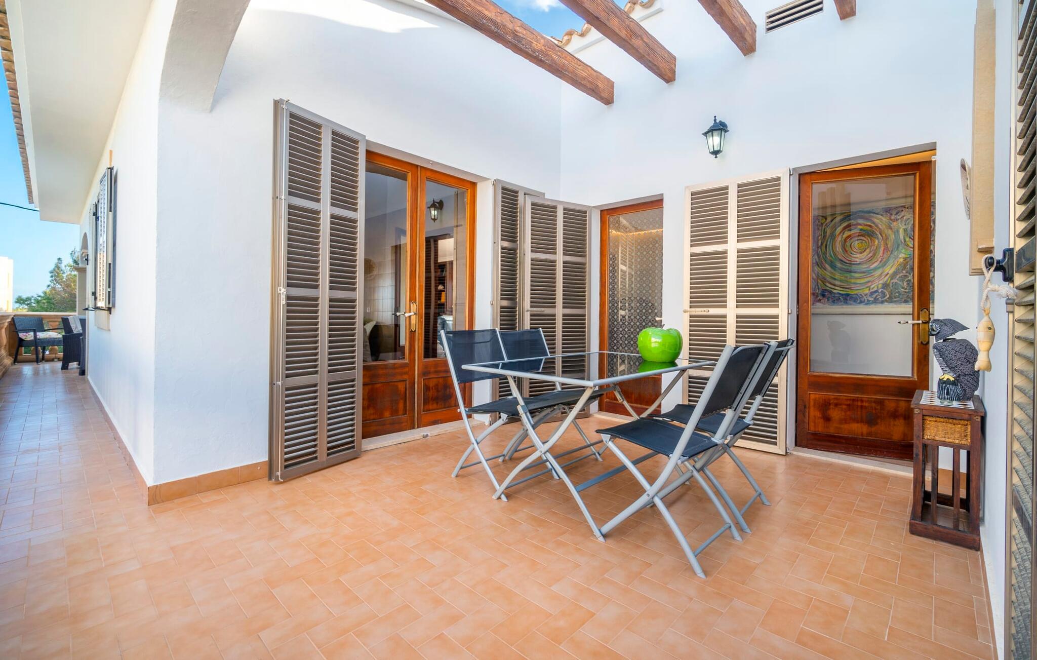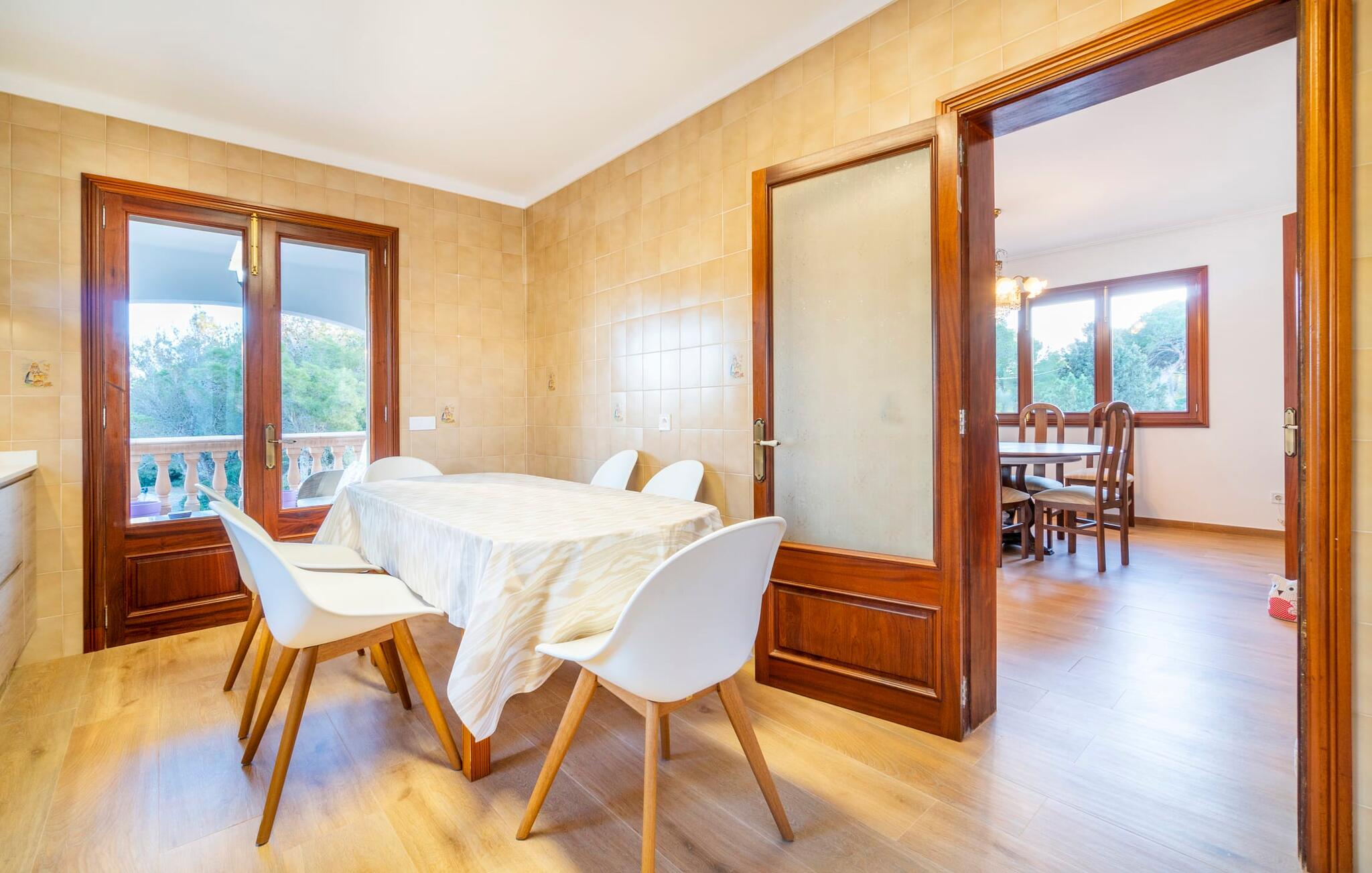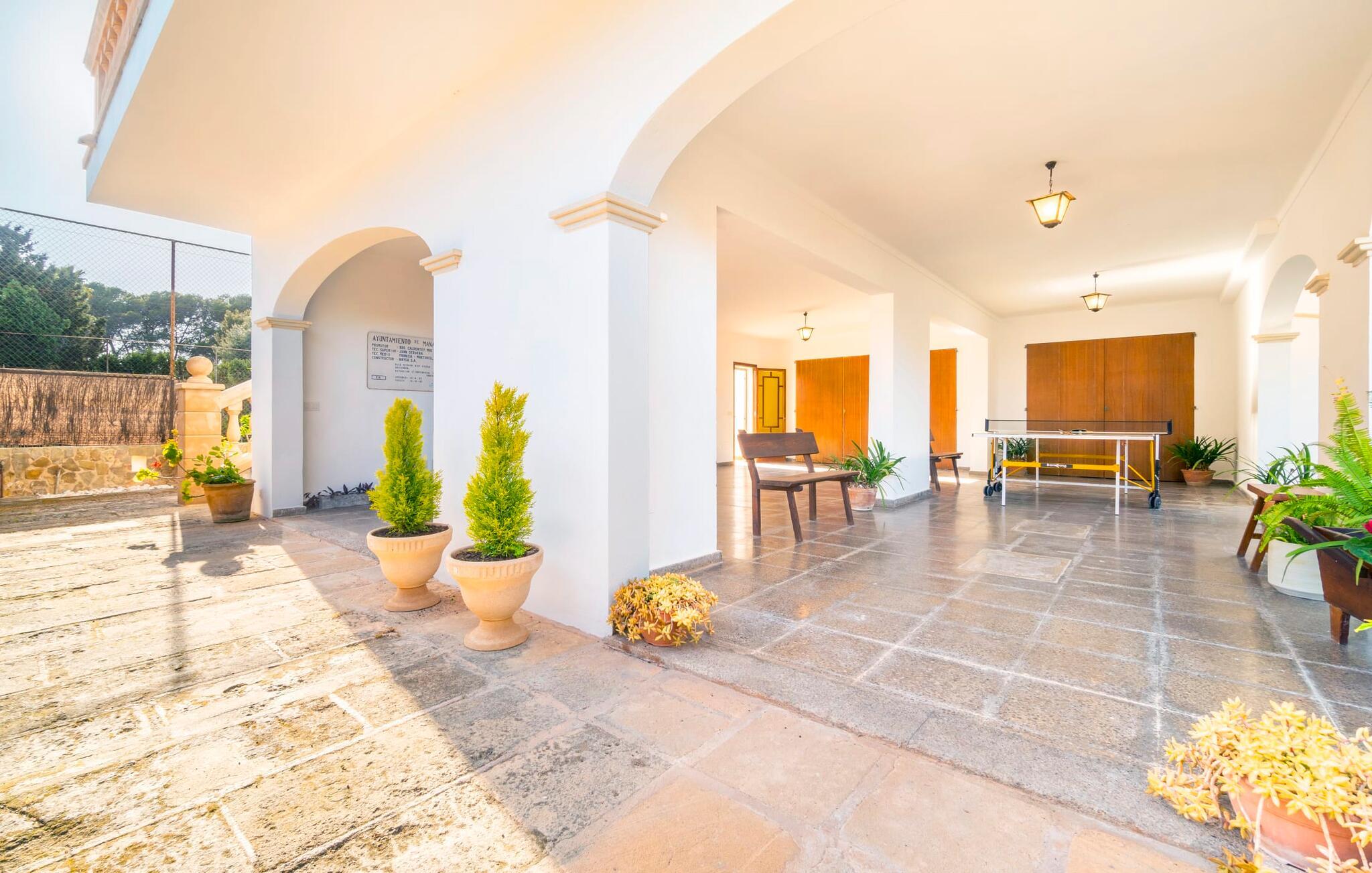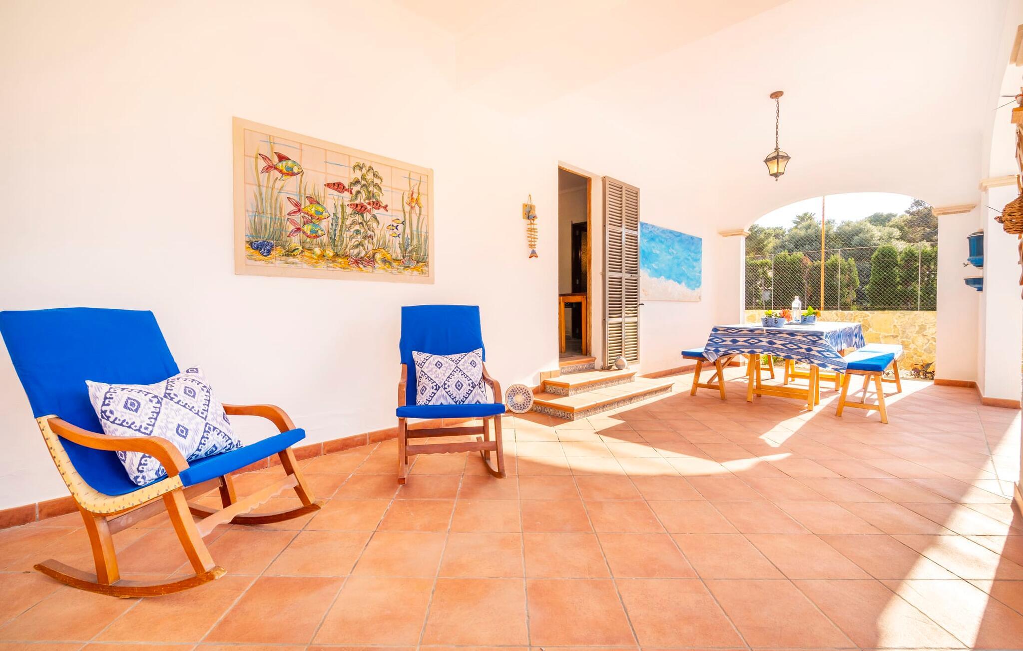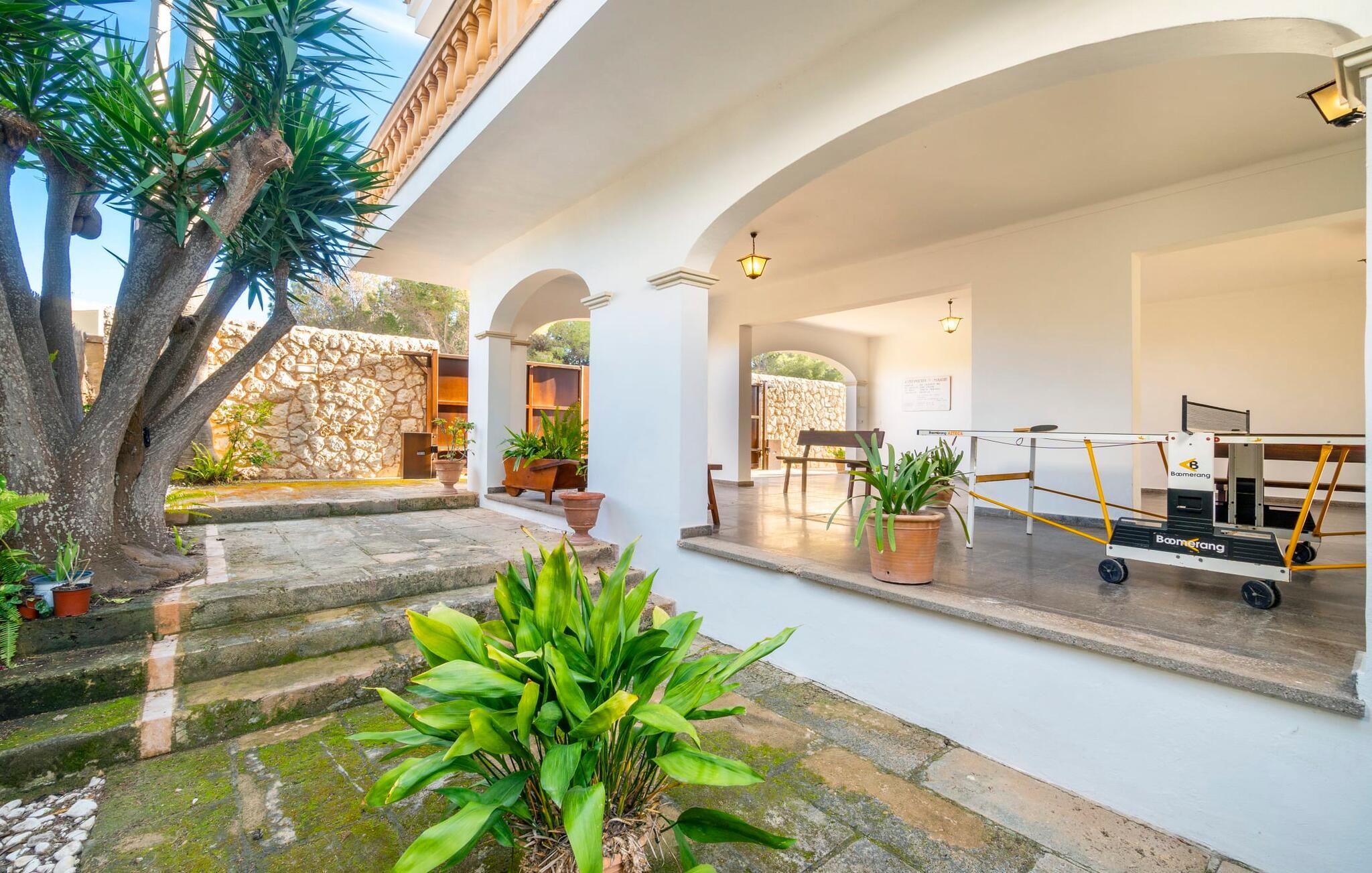 Kystvillaen "Cas Nin des Port" ligger på en udsat beliggenhed i havnebyen Porto Cristo og nær de berømte dragehuler på et næs ved fyrtårnet. Den maritime charme præger ikke kun naturhavnen, men har også en varig indflydelse på karakteren af det lyse hvide sommerhus. På trods af beliggenheden i en urbanisering, kan I nyde privatlivets fred i en solid Mallorca-villa, der er adskilt fra naboerne og beskyttet mod udsigt. Mosaikpoolen med komfortable trapper er havens centrum og fungerer som et behageligt sted at køle af. De komfortable liggestole kan placeres på den tilstødende græsplæne eller på solterrassen. I kan slappe skønt af på den skyggefulde terrasse under stuen. Overordnet set er der talrige siddemuligheder, som naturligvis også egner sig til en afslappet grillaften. Udfordr jeres medrejsende til et spil bordtennis – selv i skyggen og beskyttet mod vejret. Til siden af haveniveauet fører en trappe til en tagterrasse med spiseplads. Fra tagterrasserne er der direkte adgang til det indvendige område, som udelukkende ligger på øverste etage. Det moderne og fuldt udstyrede køkken med al mulig teknisk komfort er direkte forbundet med den udendørs spiseplads. På den anden halvdel af terrassen er der en hyggelig lounge med havudsigt, som er forbundet med stuen via en dobbeltdør. Det fine og lyse feriehus imponerer med en smuk blanding af mallorcansk tradition, som sikrer komfort og er behageligt kombineret med moderne elegance. Boligarealet er smart opdelt, så en til to familier eller seks personer kan slappe perfekt sammen. Ud over tre soveværelser med aircondition, er der et trendy indendørs badeværelse med bruseniche, et separat gæstetoilet og et udendørs badeværelse. Oplev ren feriefølelse i det private, familievenlige og veludstyrede rækkehus "Cas Nin des Port" og nyd jeres tid sammen med afslapning på Mallorca - hele året rundt og til en absolut overkommelig pris, især i den attraktive lavsæson. Den elegante villa "Cas Nin des Port" emmer af maritim charme som rækkehus med pool, grøn gårdhave og tagterrasse. Nyd havudsigten på kanten af en velholdt urbanisering. Dette er beliggende i det sydlige område af kystbyen Porto Cristo. I kan nå havet eller den smukke by med dens naturlige havn til fods. Nærheden til promenaden med talrige barer og pubber er det, der gør dette klassiske feriehus så attraktivt. Ud over den nærmeste bystrand i Porto Cristo, venter andre fantastiske bugter på jer efter en kort køretur.
