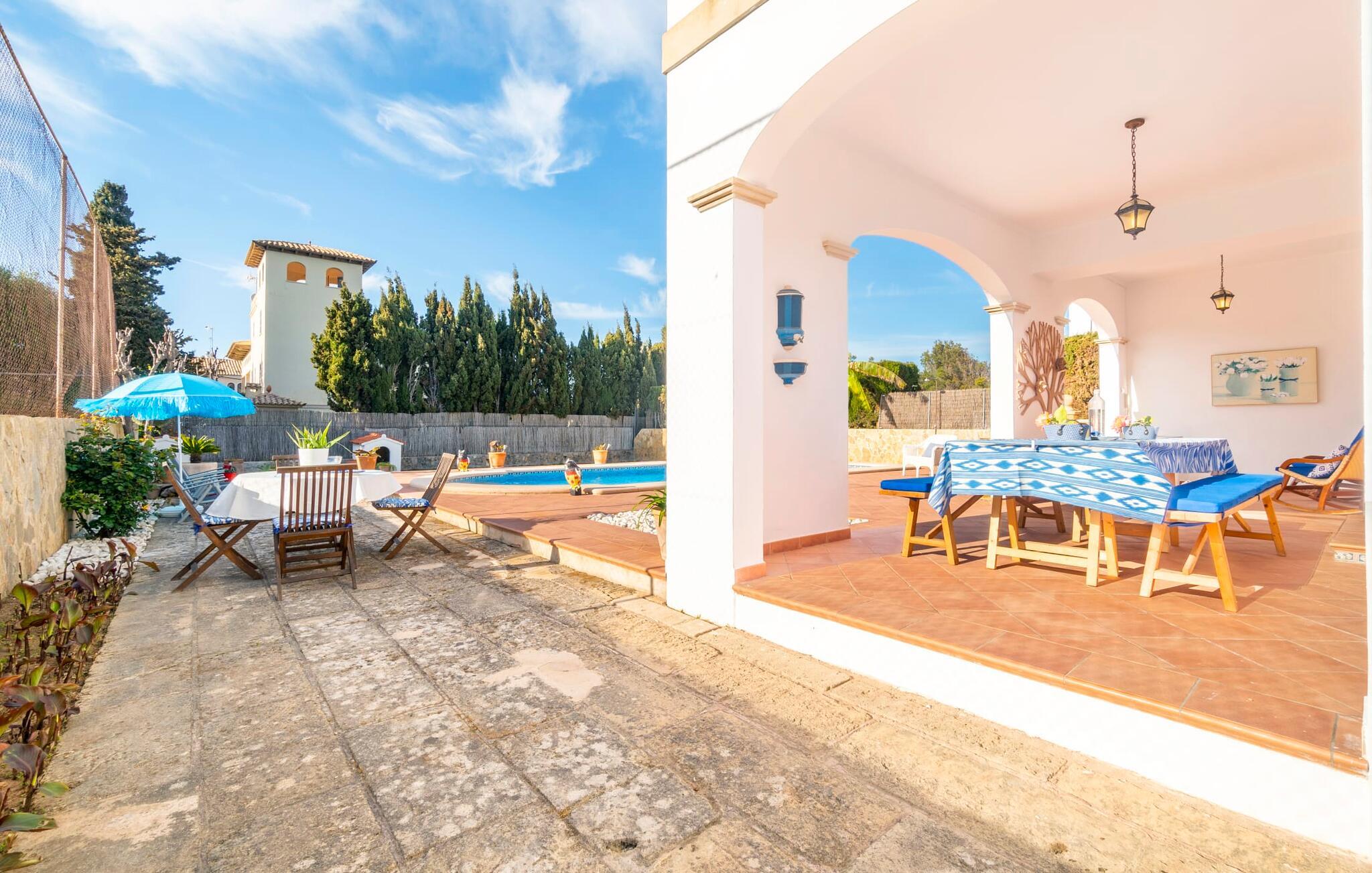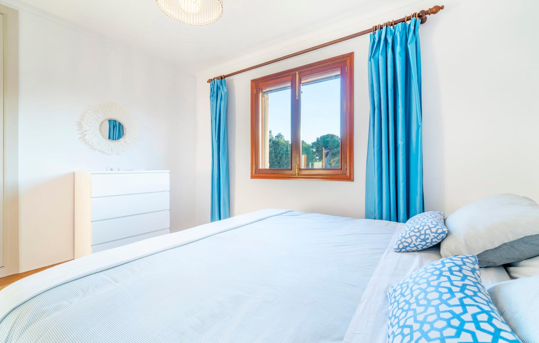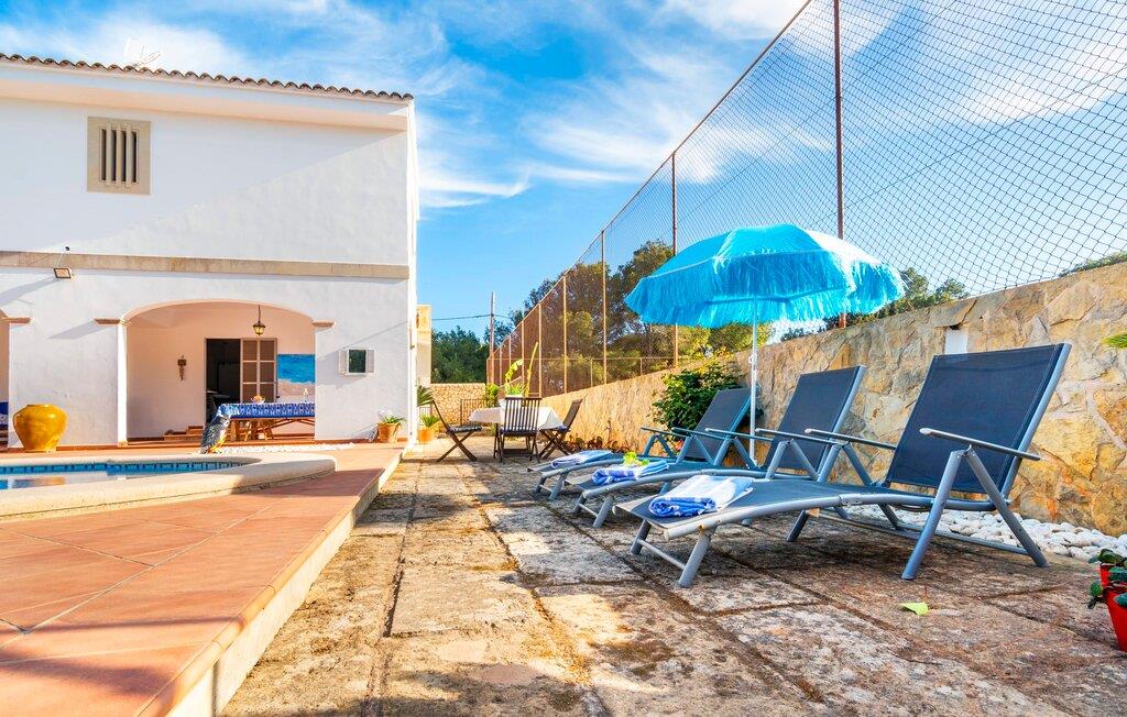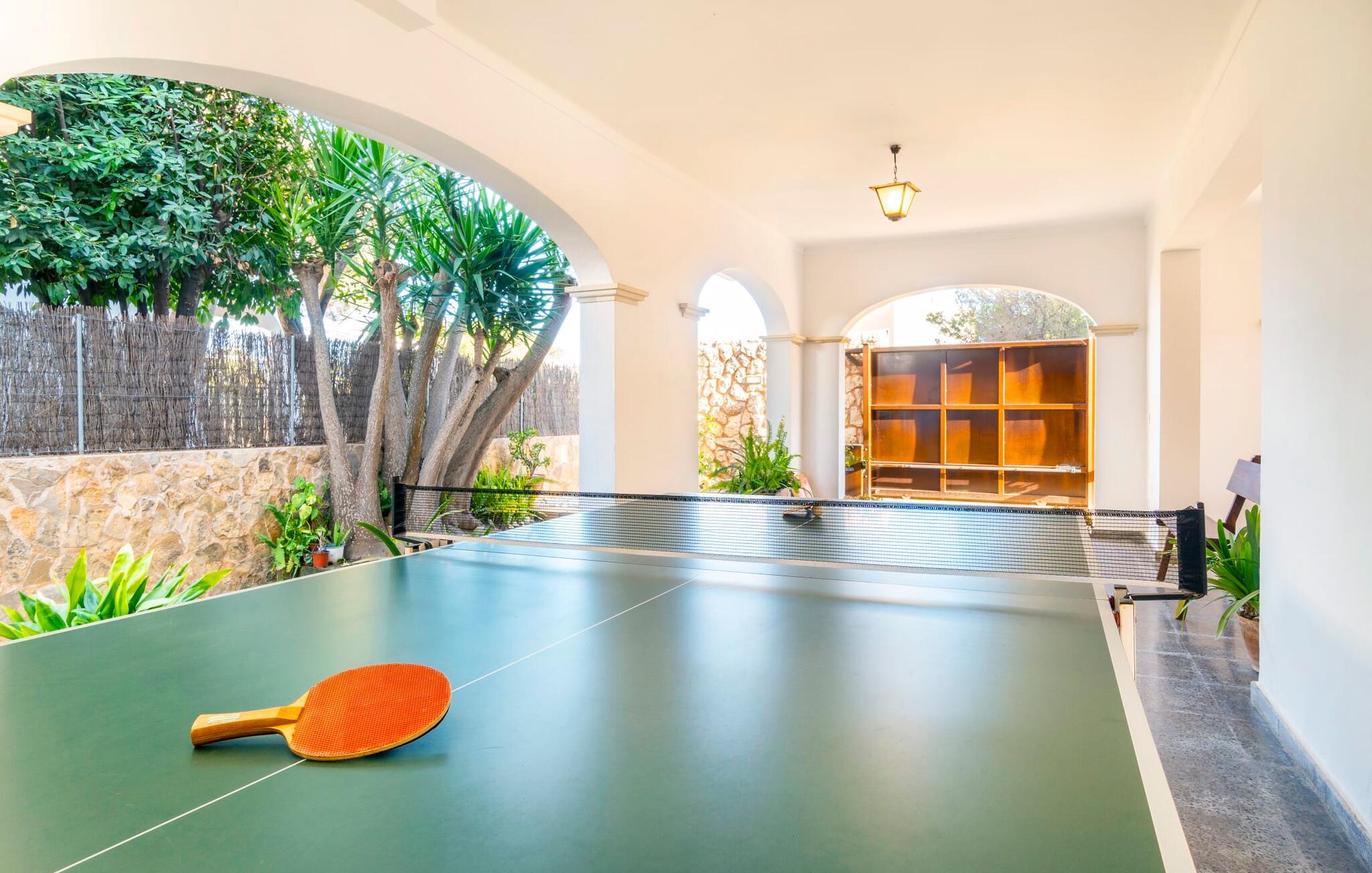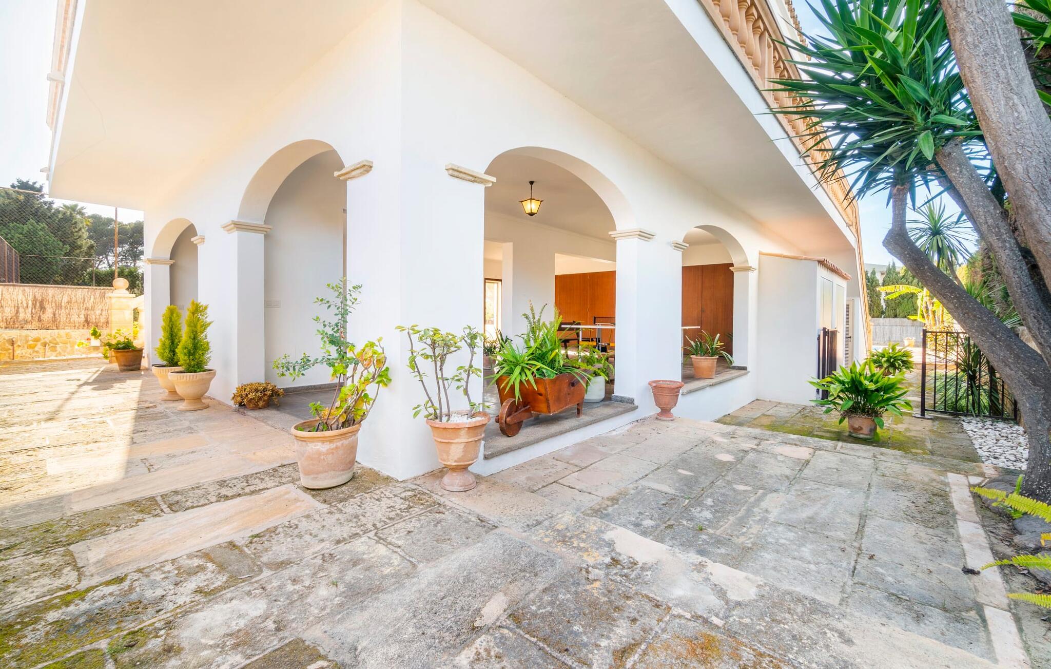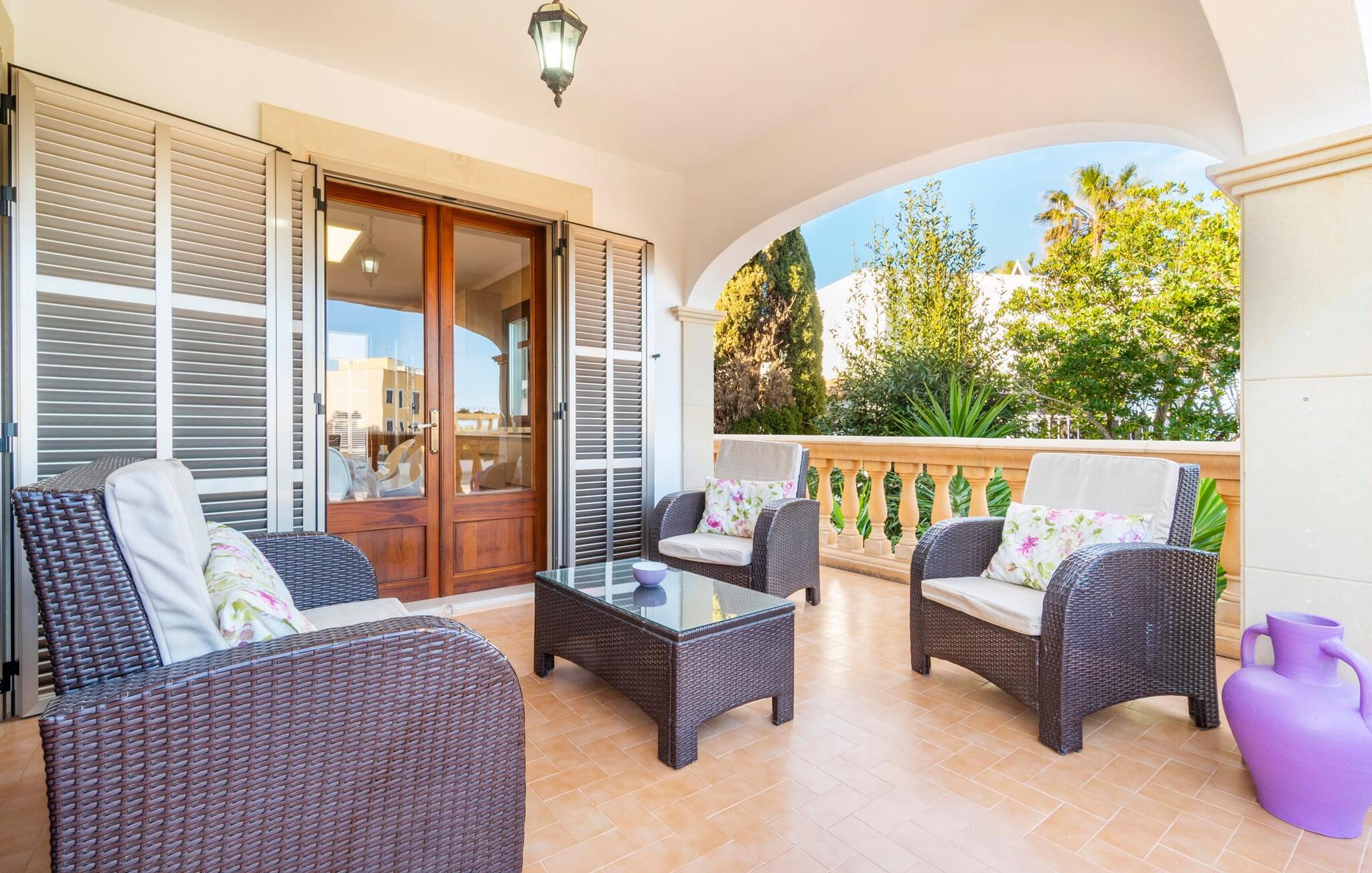 Kystvillaen "Cas Nin des Port" ligger på en udsat beliggenhed i havnebyen Porto Cristo og nær de berømte dragehuler på et næs ved fyrtårnet. Den maritime charme præger ikke kun naturhavnen, men har også en varig indflydelse på karakteren af det lyse hvide sommerhus. På trods af beliggenheden i en urbanisering, kan I nyde privatlivets fred i en solid Mallorca-villa, der er adskilt fra naboerne og beskyttet mod udsigt. Mosaikpoolen med komfortable trapper er havens centrum og fungerer som et behageligt sted at køle af. De komfortable liggestole kan placeres på den tilstødende græsplæne eller på solterrassen. I kan slappe skønt af på den skyggefulde terrasse under stuen. Overordnet set er der talrige siddemuligheder, som naturligvis også egner sig til en afslappet grillaften. Udfordr jeres medrejsende til et spil bordtennis – selv i skyggen og beskyttet mod vejret. Til siden af haveniveauet fører en trappe til en tagterrasse med spiseplads. Fra tagterrasserne er der direkte adgang til det indvendige område, som udelukkende ligger på øverste etage. Det moderne og fuldt udstyrede køkken med al mulig teknisk komfort er direkte forbundet med den udendørs spiseplads. På den anden halvdel af terrassen er der en hyggelig lounge med havudsigt, som er forbundet med stuen via en dobbeltdør. Det fine og lyse feriehus imponerer med en smuk blanding af mallorcansk tradition, som sikrer komfort og er behageligt kombineret med moderne elegance. Boligarealet er smart opdelt, så en til to familier eller seks personer kan slappe perfekt sammen. Ud over tre soveværelser med aircondition, er der et trendy indendørs badeværelse med bruseniche, et separat gæstetoilet og et udendørs badeværelse. Oplev ren feriefølelse i det private, familievenlige og veludstyrede rækkehus "Cas Nin des Port" og nyd jeres tid sammen med afslapning på Mallorca - hele året rundt og til en absolut overkommelig pris, især i den attraktive lavsæson. Den elegante villa "Cas Nin des Port" emmer af maritim charme som rækkehus med pool, grøn gårdhave og tagterrasse. Nyd havudsigten på kanten af en velholdt urbanisering. Dette er beliggende i det sydlige område af kystbyen Porto Cristo. I kan nå havet eller den smukke by med dens naturlige havn til fods. Nærheden til promenaden med talrige barer og pubber er det, der gør dette klassiske feriehus så attraktivt. Ud over den nærmeste bystrand i Porto Cristo, venter andre fantastiske bugter på jer efter en kort køretur.