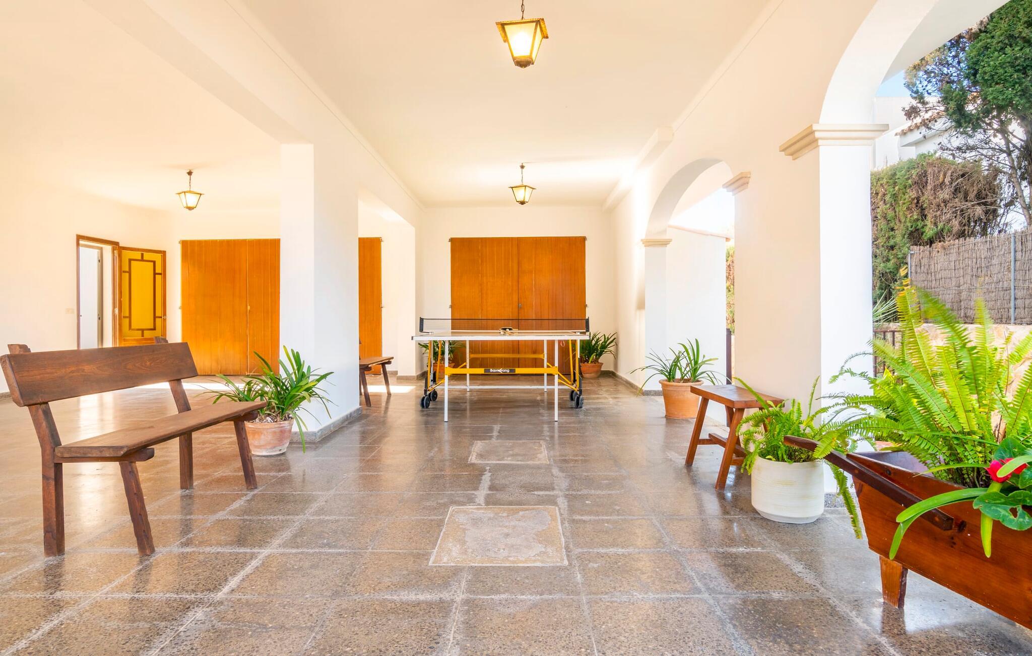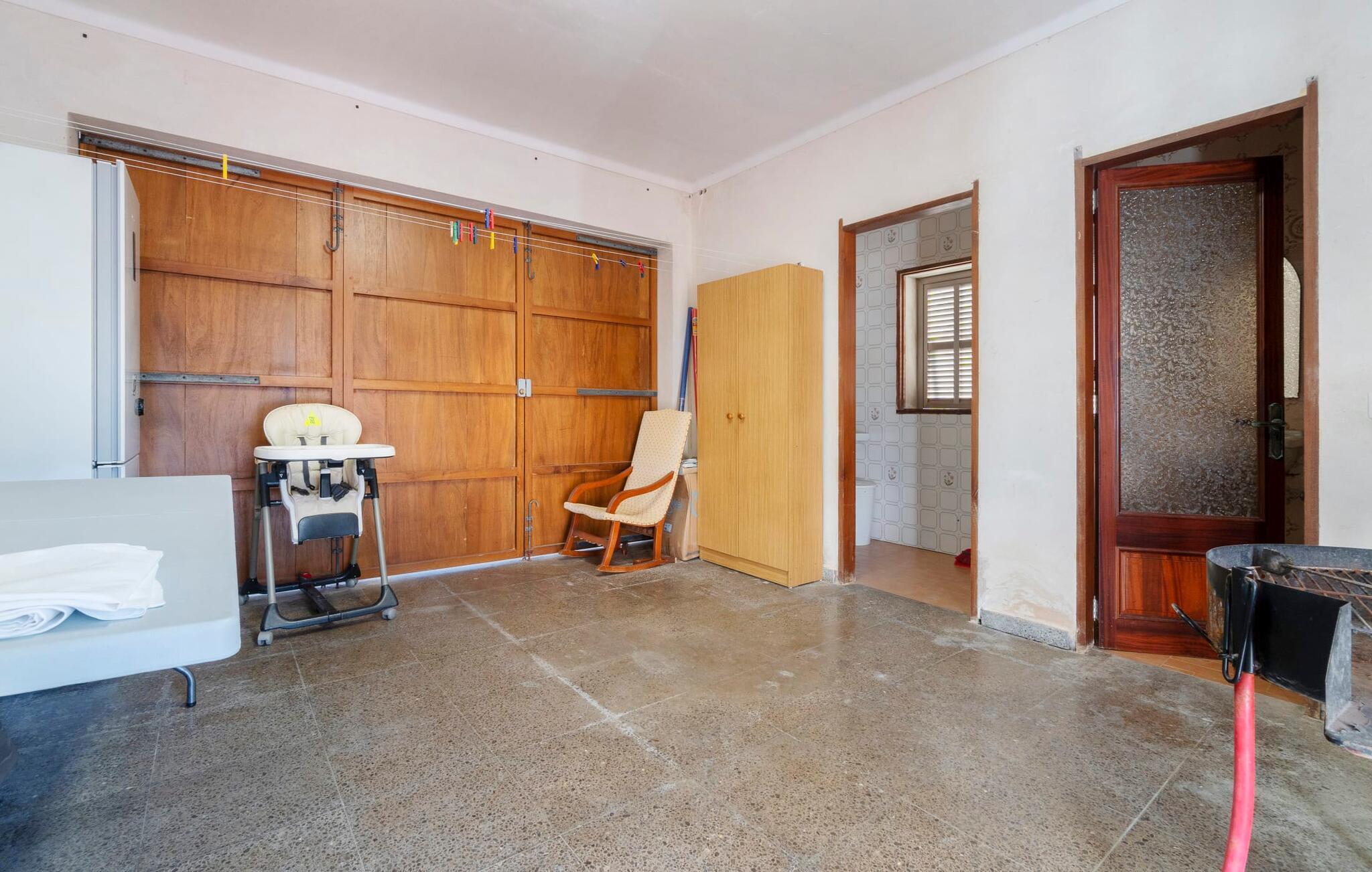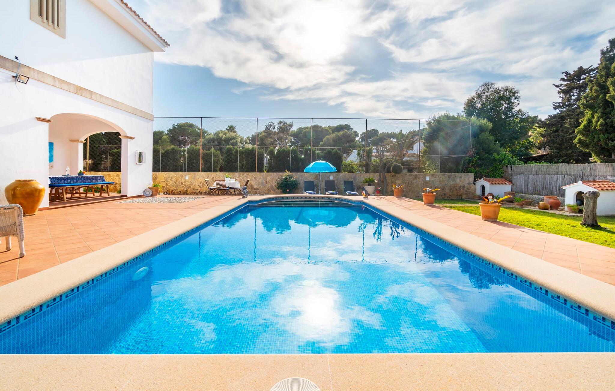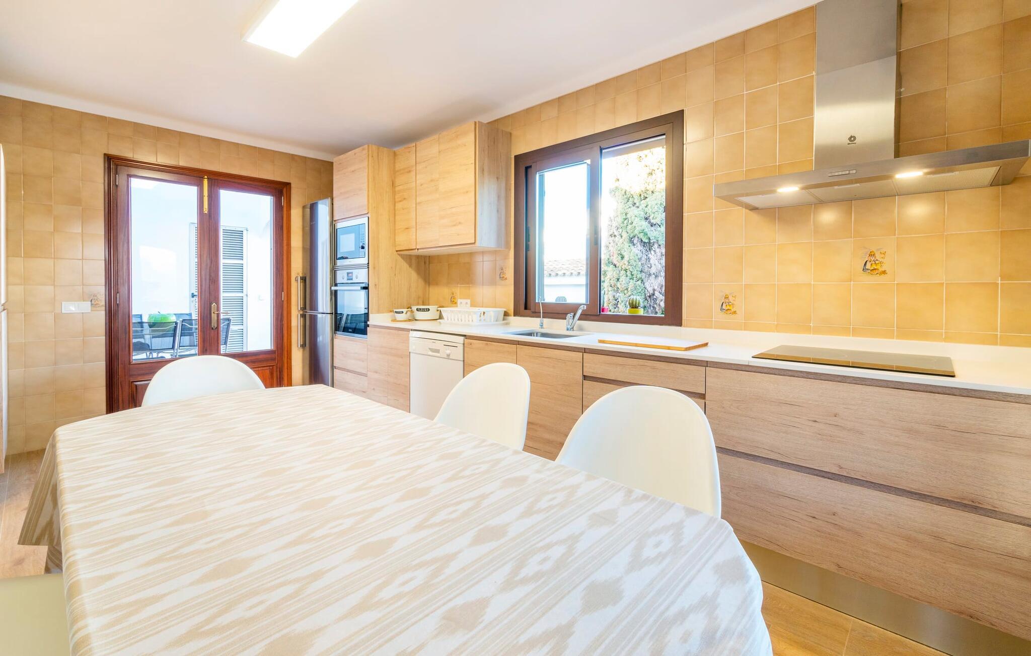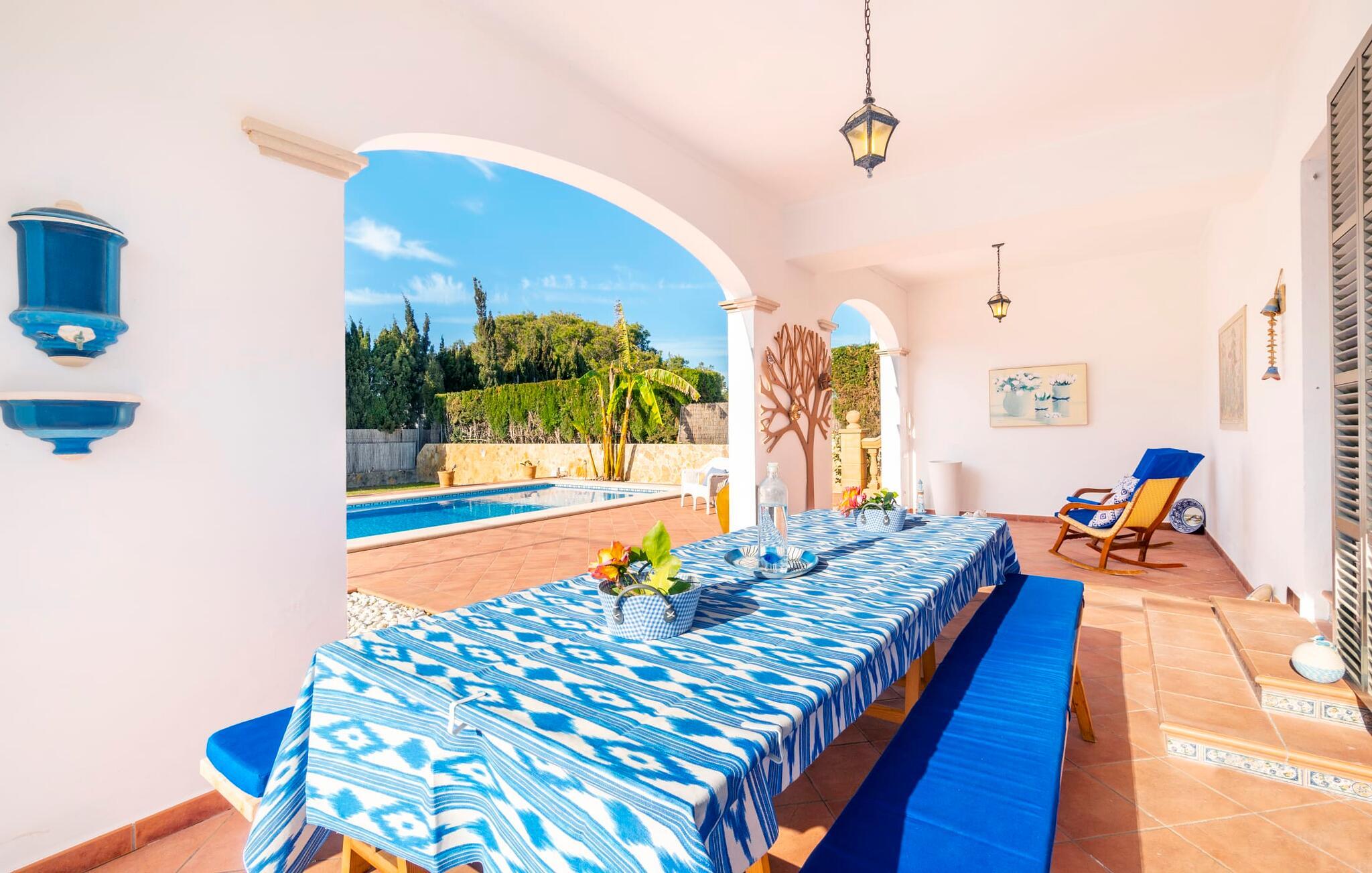 Kystvillaen "Cas Nin des Port" ligger på en udsat beliggenhed i havnebyen Porto Cristo og nær de berømte dragehuler på et næs ved fyrtårnet. Den maritime charme præger ikke kun naturhavnen, men har også en varig indflydelse på karakteren af det lyse hvide sommerhus. På trods af beliggenheden i en urbanisering, kan I nyde privatlivets fred i en solid Mallorca-villa, der er adskilt fra naboerne og beskyttet mod udsigt. Mosaikpoolen med komfortable trapper er havens centrum og fungerer som et behageligt sted at køle af. De komfortable liggestole kan placeres på den tilstødende græsplæne eller på solterrassen. I kan slappe skønt af på den skyggefulde terrasse under stuen. Overordnet set er der talrige siddemuligheder, som naturligvis også egner sig til en afslappet grillaften. Udfordr jeres medrejsende til et spil bordtennis – selv i skyggen og beskyttet mod vejret. Til siden af haveniveauet fører en trappe til en tagterrasse med spiseplads. Fra tagterrasserne er der direkte adgang til det indvendige område, som udelukkende ligger på øverste etage. Det moderne og fuldt udstyrede køkken med al mulig teknisk komfort er direkte forbundet med den udendørs spiseplads. På den anden halvdel af terrassen er der en hyggelig lounge med havudsigt, som er forbundet med stuen via en dobbeltdør. Det fine og lyse feriehus imponerer med en smuk blanding af mallorcansk tradition, som sikrer komfort og er behageligt kombineret med moderne elegance. Boligarealet er smart opdelt, så en til to familier eller seks personer kan slappe perfekt sammen. Ud over tre soveværelser med aircondition, er der et trendy indendørs badeværelse med bruseniche, et separat gæstetoilet og et udendørs badeværelse. Oplev ren feriefølelse i det private, familievenlige og veludstyrede rækkehus "Cas Nin des Port" og nyd jeres tid sammen med afslapning på Mallorca - hele året rundt og til en absolut overkommelig pris, især i den attraktive lavsæson. Den elegante villa "Cas Nin des Port" emmer af maritim charme som rækkehus med pool, grøn gårdhave og tagterrasse. Nyd havudsigten på kanten af en velholdt urbanisering. Dette er beliggende i det sydlige område af kystbyen Porto Cristo. I kan nå havet eller den smukke by med dens naturlige havn til fods. Nærheden til promenaden med talrige barer og pubber er det, der gør dette klassiske feriehus så attraktivt. Ud over den nærmeste bystrand i Porto Cristo, venter andre fantastiske bugter på jer efter en kort køretur.