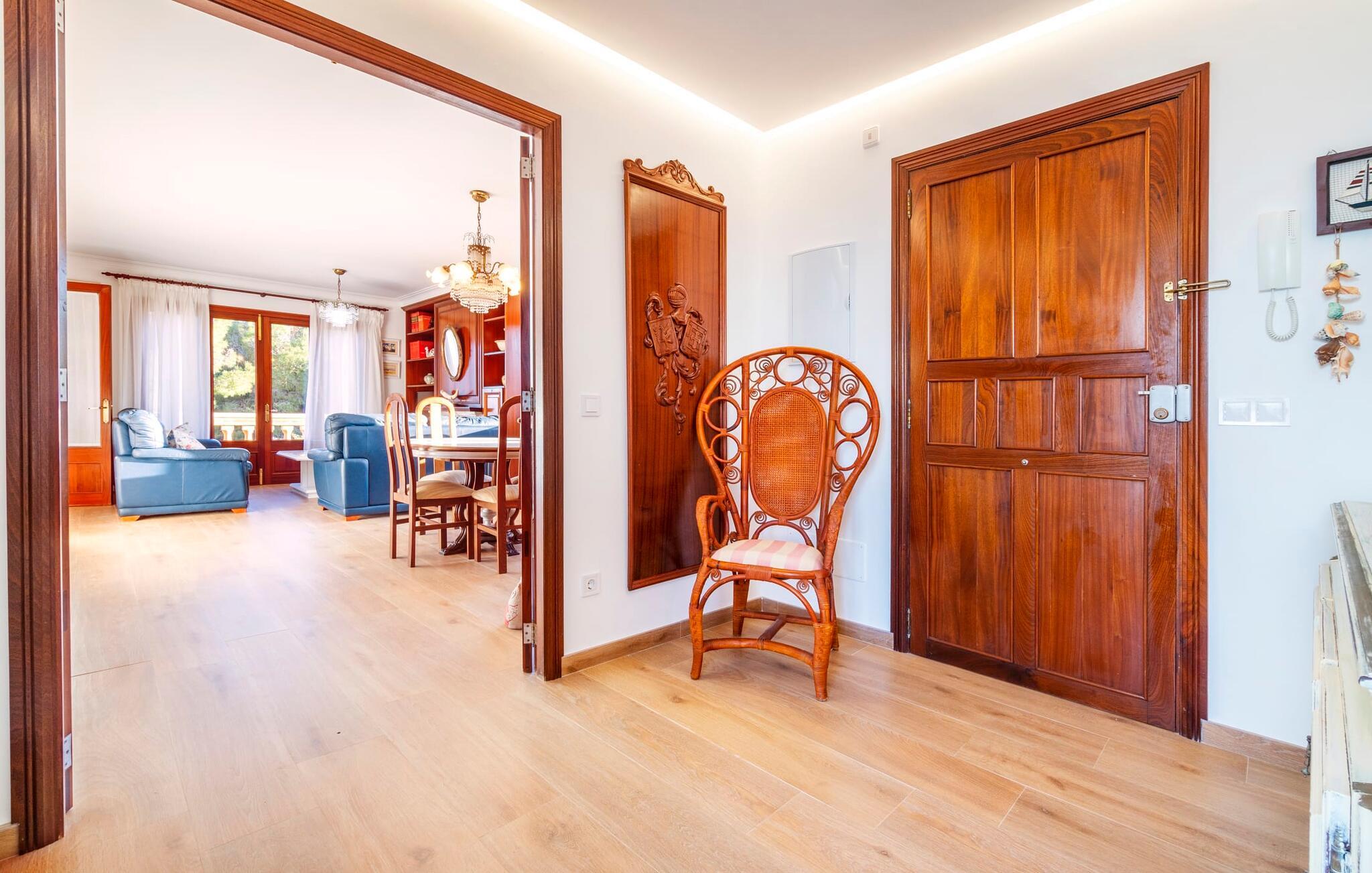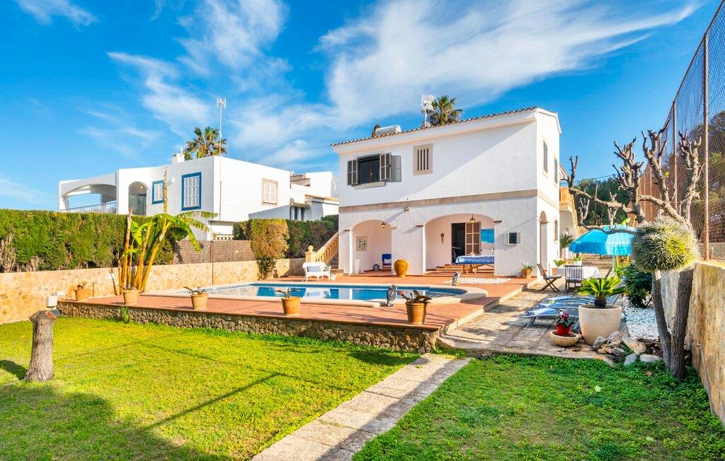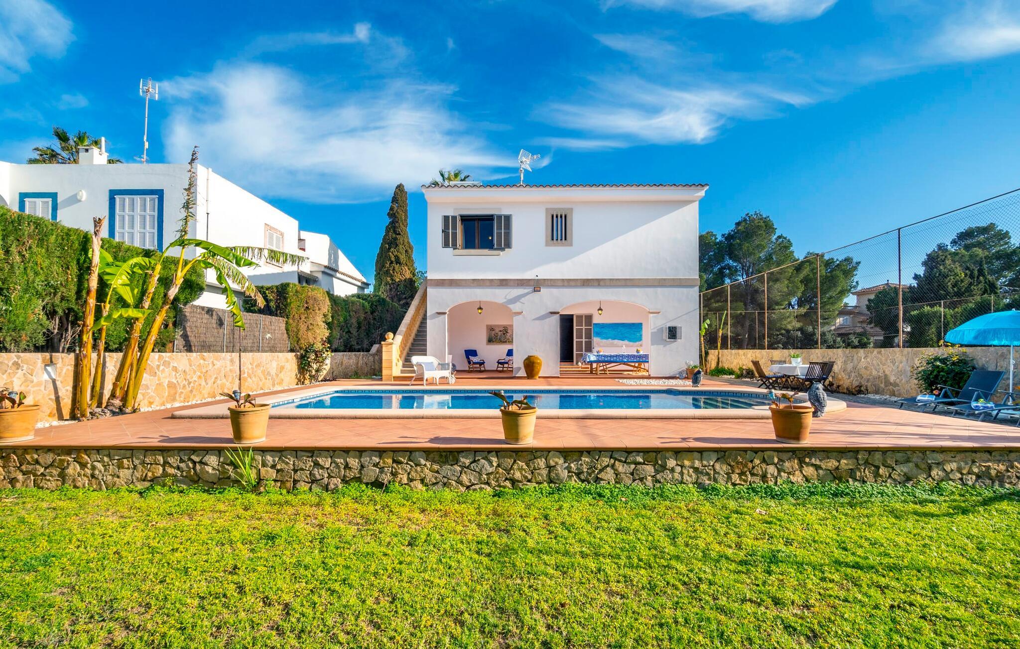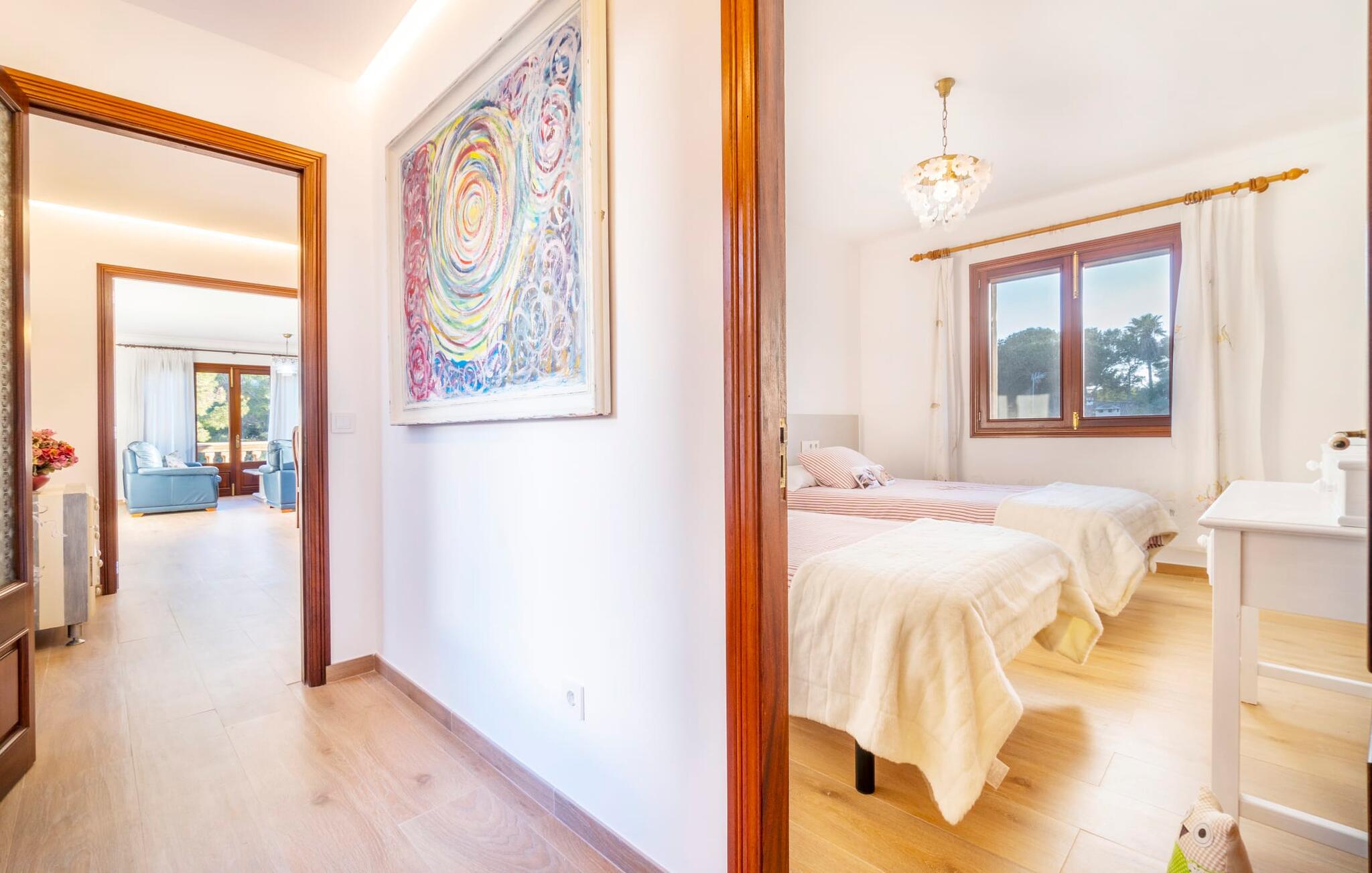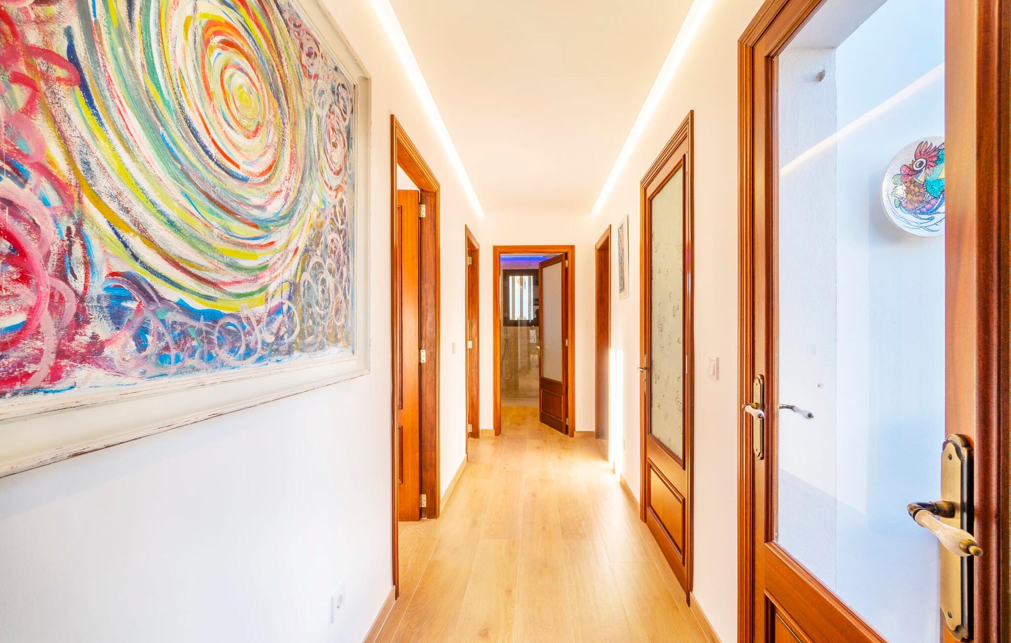 Kystvillaen "Cas Nin des Port" ligger på en udsat beliggenhed i havnebyen Porto Cristo og nær de berømte dragehuler på et næs ved fyrtårnet. Den maritime charme præger ikke kun naturhavnen, men har også en varig indflydelse på karakteren af det lyse hvide sommerhus. På trods af beliggenheden i en urbanisering, kan I nyde privatlivets fred i en solid Mallorca-villa, der er adskilt fra naboerne og beskyttet mod udsigt. Mosaikpoolen med komfortable trapper er havens centrum og fungerer som et behageligt sted at køle af. De komfortable liggestole kan placeres på den tilstødende græsplæne eller på solterrassen. I kan slappe skønt af på den skyggefulde terrasse under stuen. Overordnet set er der talrige siddemuligheder, som naturligvis også egner sig til en afslappet grillaften. Udfordr jeres medrejsende til et spil bordtennis – selv i skyggen og beskyttet mod vejret. Til siden af haveniveauet fører en trappe til en tagterrasse med spiseplads. Fra tagterrasserne er der direkte adgang til det indvendige område, som udelukkende ligger på øverste etage. Det moderne og fuldt udstyrede køkken med al mulig teknisk komfort er direkte forbundet med den udendørs spiseplads. På den anden halvdel af terrassen er der en hyggelig lounge med havudsigt, som er forbundet med stuen via en dobbeltdør. Det fine og lyse feriehus imponerer med en smuk blanding af mallorcansk tradition, som sikrer komfort og er behageligt kombineret med moderne elegance. Boligarealet er smart opdelt, så en til to familier eller seks personer kan slappe perfekt sammen. Ud over tre soveværelser med aircondition, er der et trendy indendørs badeværelse med bruseniche, et separat gæstetoilet og et udendørs badeværelse. Oplev ren feriefølelse i det private, familievenlige og veludstyrede rækkehus "Cas Nin des Port" og nyd jeres tid sammen med afslapning på Mallorca - hele året rundt og til en absolut overkommelig pris, især i den attraktive lavsæson. Den elegante villa "Cas Nin des Port" emmer af maritim charme som rækkehus med pool, grøn gårdhave og tagterrasse. Nyd havudsigten på kanten af en velholdt urbanisering. Dette er beliggende i det sydlige område af kystbyen Porto Cristo. I kan nå havet eller den smukke by med dens naturlige havn til fods. Nærheden til promenaden med talrige barer og pubber er det, der gør dette klassiske feriehus så attraktivt. Ud over den nærmeste bystrand i Porto Cristo, venter andre fantastiske bugter på jer efter en kort køretur.