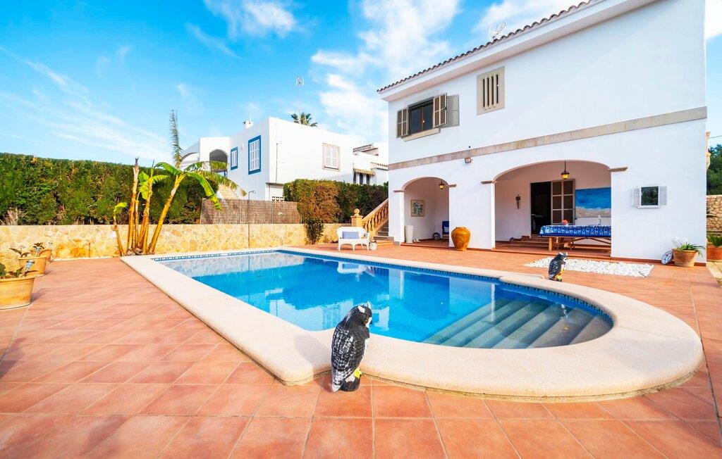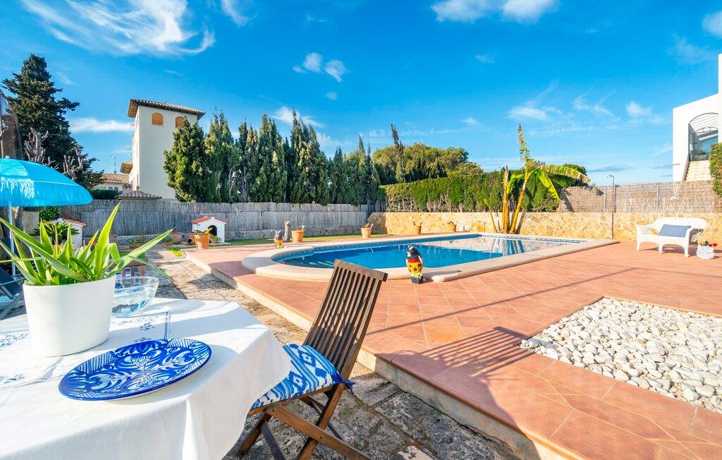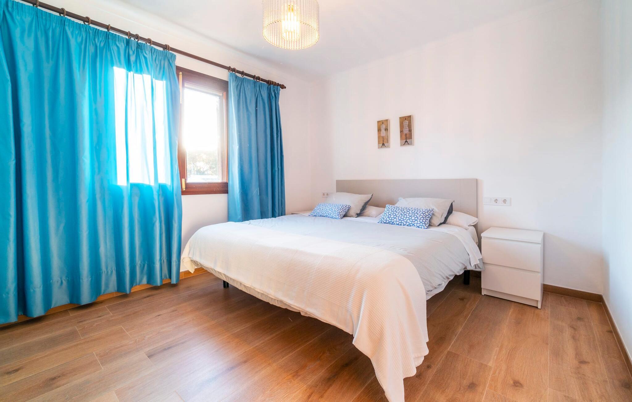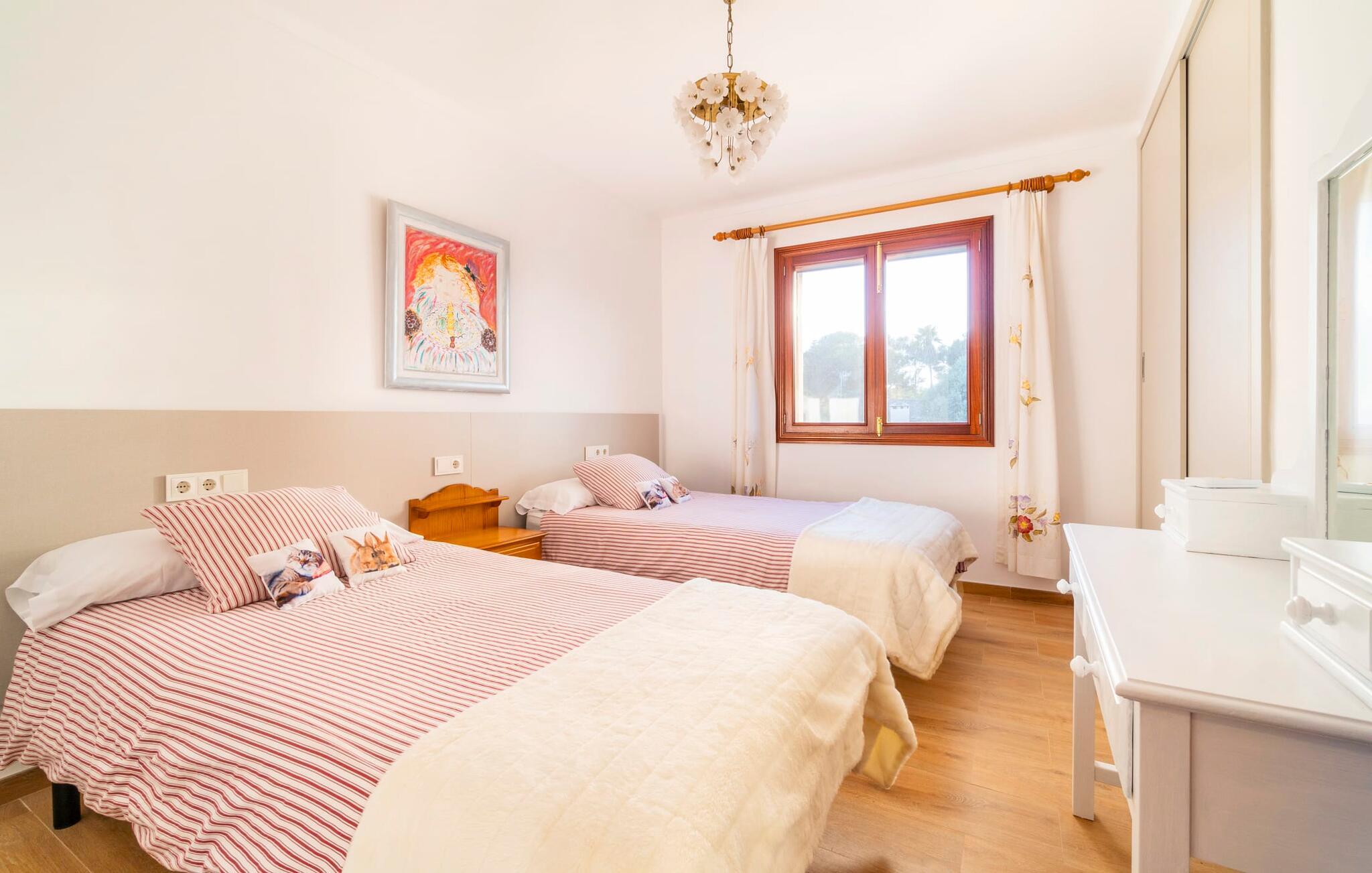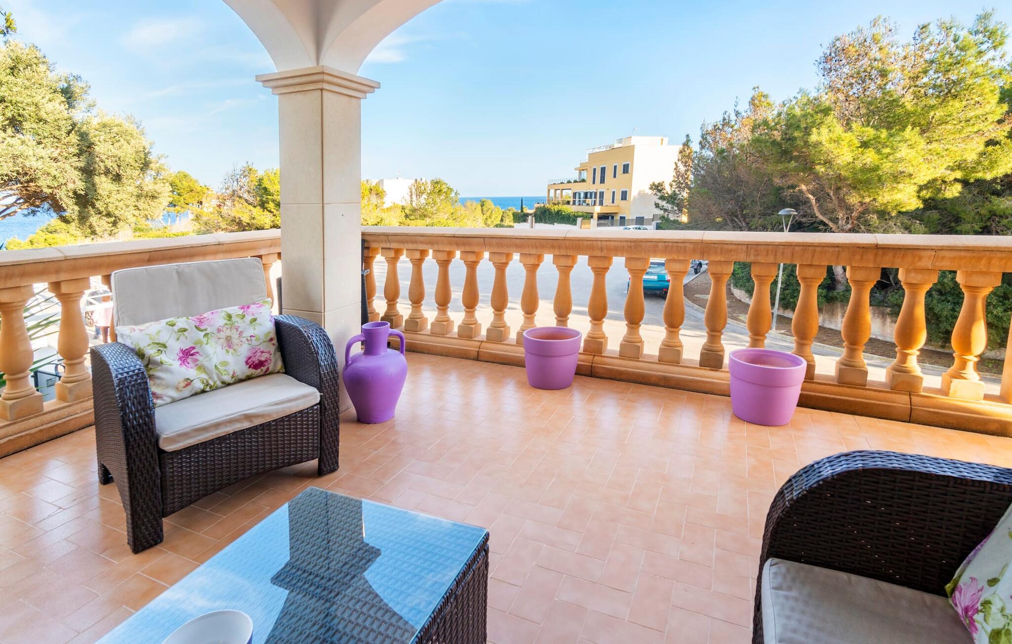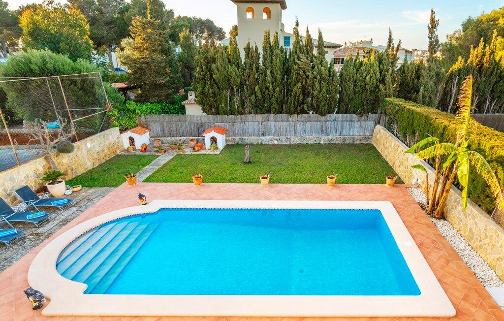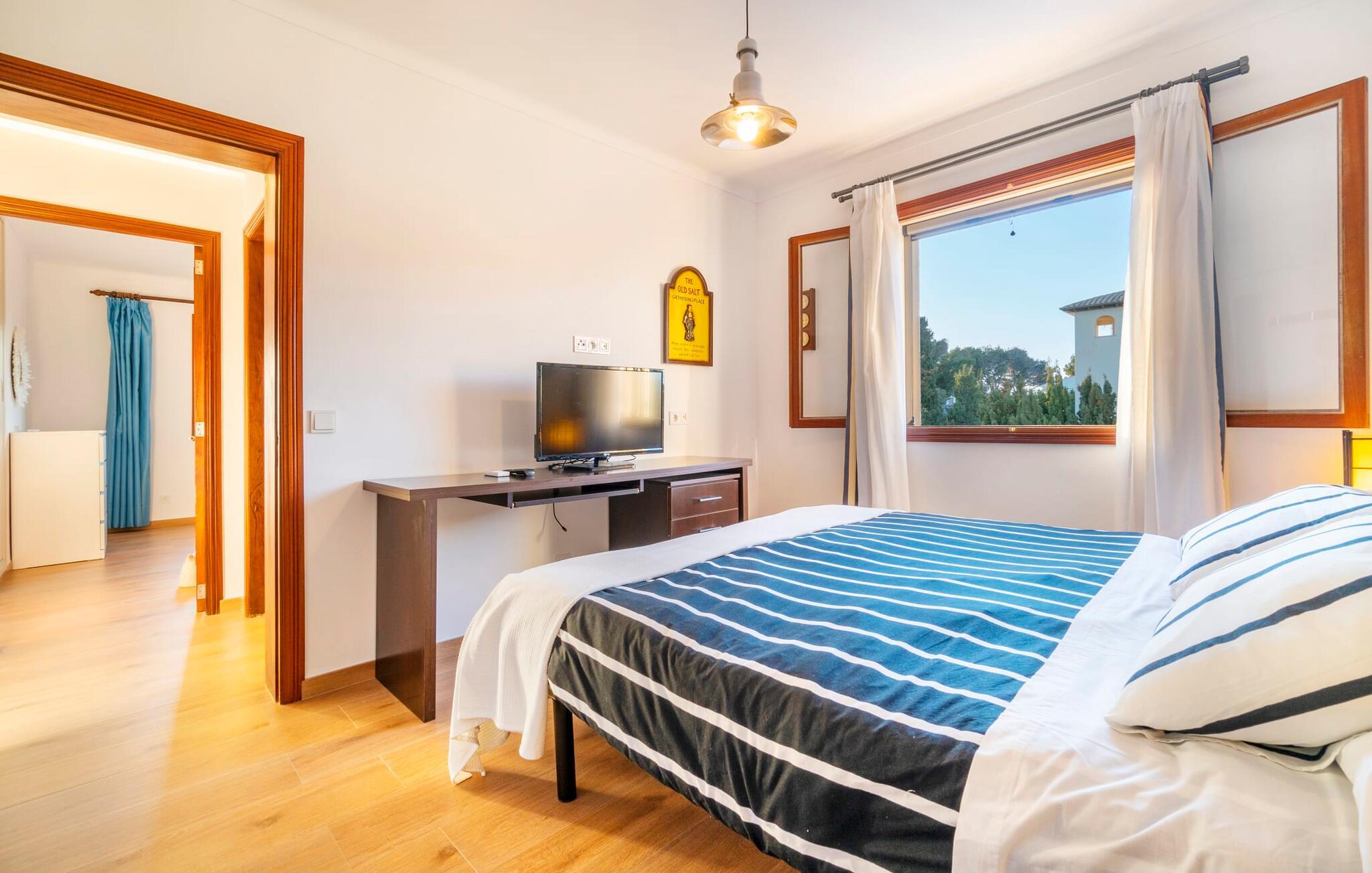 Kystvillaen "Cas Nin des Port" ligger på en udsat beliggenhed i havnebyen Porto Cristo og nær de berømte dragehuler på et næs ved fyrtårnet. Den maritime charme præger ikke kun naturhavnen, men har også en varig indflydelse på karakteren af det lyse hvide sommerhus. På trods af beliggenheden i en urbanisering, kan I nyde privatlivets fred i en solid Mallorca-villa, der er adskilt fra naboerne og beskyttet mod udsigt. Mosaikpoolen med komfortable trapper er havens centrum og fungerer som et behageligt sted at køle af. De komfortable liggestole kan placeres på den tilstødende græsplæne eller på solterrassen. I kan slappe skønt af på den skyggefulde terrasse under stuen. Overordnet set er der talrige siddemuligheder, som naturligvis også egner sig til en afslappet grillaften. Udfordr jeres medrejsende til et spil bordtennis – selv i skyggen og beskyttet mod vejret. Til siden af haveniveauet fører en trappe til en tagterrasse med spiseplads. Fra tagterrasserne er der direkte adgang til det indvendige område, som udelukkende ligger på øverste etage. Det moderne og fuldt udstyrede køkken med al mulig teknisk komfort er direkte forbundet med den udendørs spiseplads. På den anden halvdel af terrassen er der en hyggelig lounge med havudsigt, som er forbundet med stuen via en dobbeltdør. Det fine og lyse feriehus imponerer med en smuk blanding af mallorcansk tradition, som sikrer komfort og er behageligt kombineret med moderne elegance. Boligarealet er smart opdelt, så en til to familier eller seks personer kan slappe perfekt sammen. Ud over tre soveværelser med aircondition, er der et trendy indendørs badeværelse med bruseniche, et separat gæstetoilet og et udendørs badeværelse. Oplev ren feriefølelse i det private, familievenlige og veludstyrede rækkehus "Cas Nin des Port" og nyd jeres tid sammen med afslapning på Mallorca - hele året rundt og til en absolut overkommelig pris, især i den attraktive lavsæson. Den elegante villa "Cas Nin des Port" emmer af maritim charme som rækkehus med pool, grøn gårdhave og tagterrasse. Nyd havudsigten på kanten af en velholdt urbanisering. Dette er beliggende i det sydlige område af kystbyen Porto Cristo. I kan nå havet eller den smukke by med dens naturlige havn til fods. Nærheden til promenaden med talrige barer og pubber er det, der gør dette klassiske feriehus så attraktivt. Ud over den nærmeste bystrand i Porto Cristo, venter andre fantastiske bugter på jer efter en kort køretur.