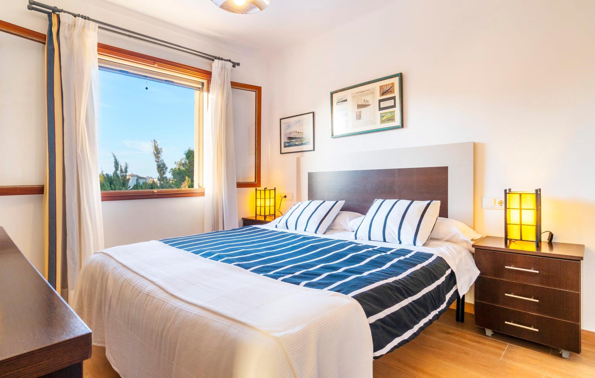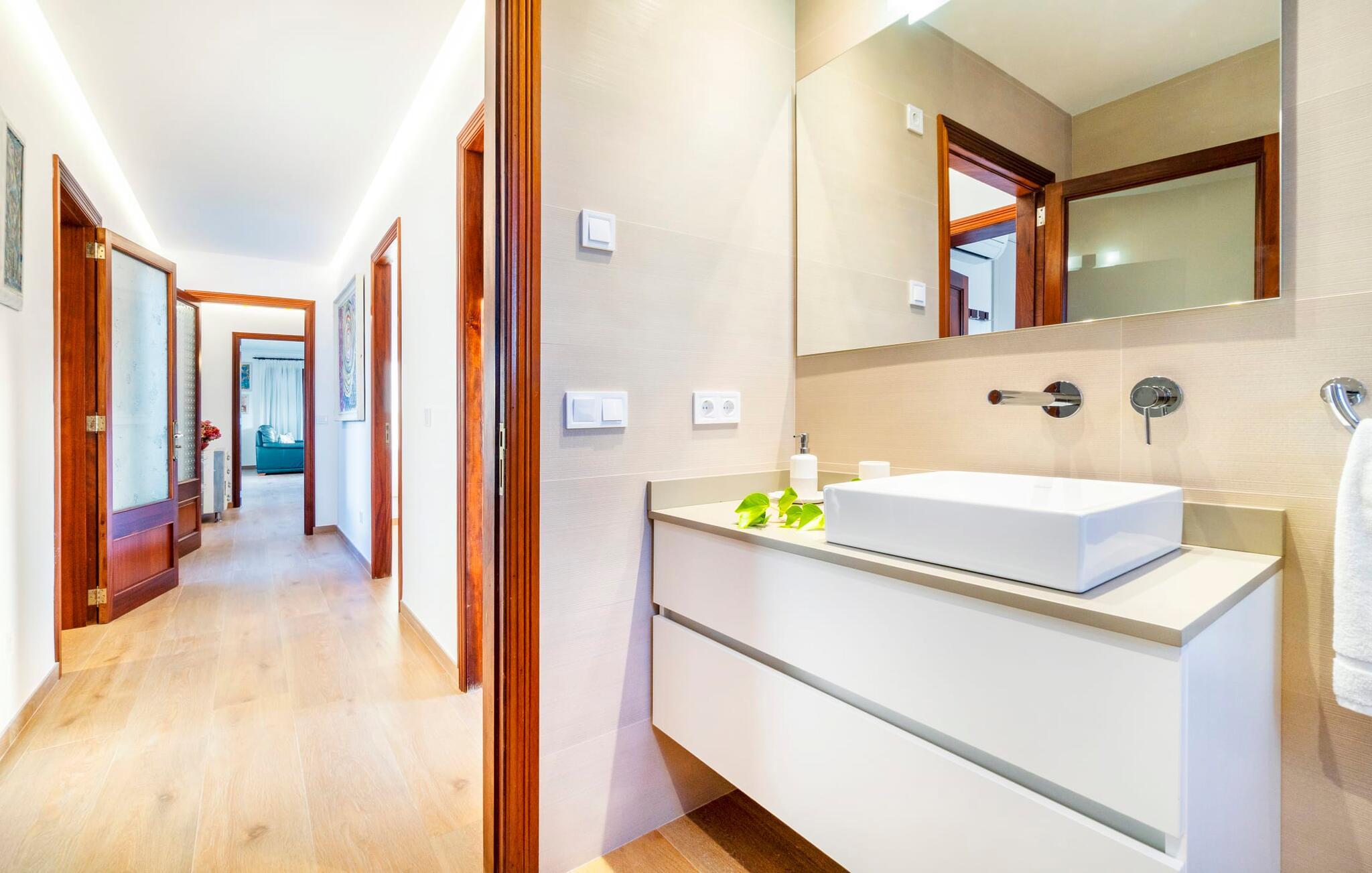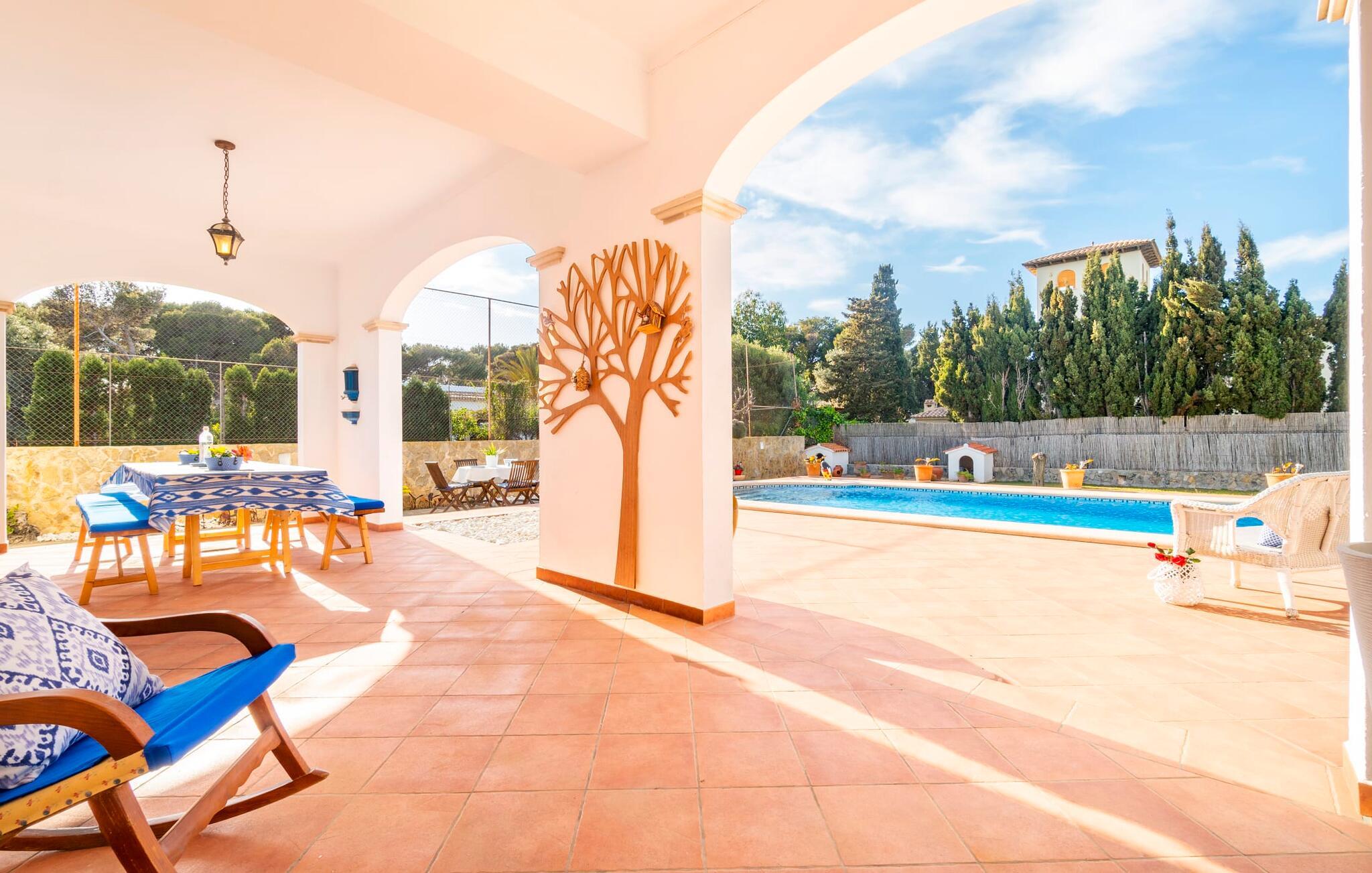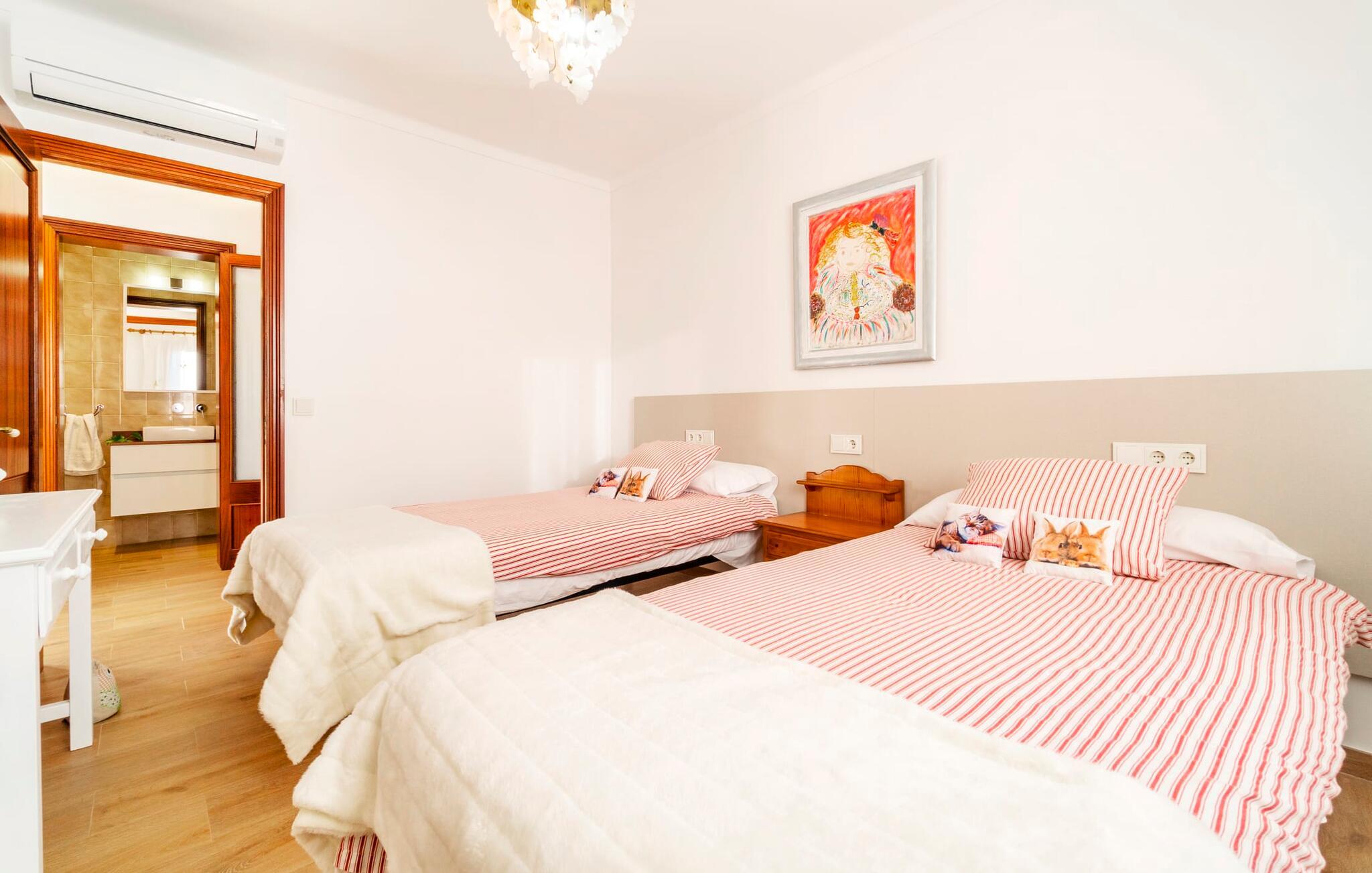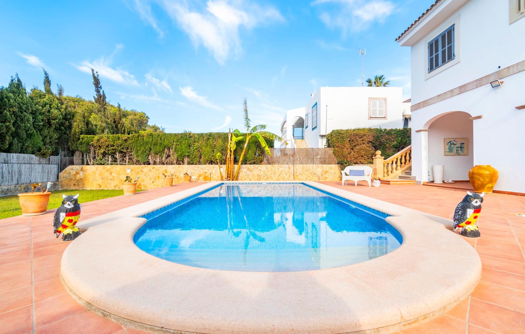 Kystvillaen "Cas Nin des Port" ligger på en udsat beliggenhed i havnebyen Porto Cristo og nær de berømte dragehuler på et næs ved fyrtårnet. Den maritime charme præger ikke kun naturhavnen, men har også en varig indflydelse på karakteren af det lyse hvide sommerhus. På trods af beliggenheden i en urbanisering, kan I nyde privatlivets fred i en solid Mallorca-villa, der er adskilt fra naboerne og beskyttet mod udsigt. Mosaikpoolen med komfortable trapper er havens centrum og fungerer som et behageligt sted at køle af. De komfortable liggestole kan placeres på den tilstødende græsplæne eller på solterrassen. I kan slappe skønt af på den skyggefulde terrasse under stuen. Overordnet set er der talrige siddemuligheder, som naturligvis også egner sig til en afslappet grillaften. Udfordr jeres medrejsende til et spil bordtennis – selv i skyggen og beskyttet mod vejret. Til siden af haveniveauet fører en trappe til en tagterrasse med spiseplads. Fra tagterrasserne er der direkte adgang til det indvendige område, som udelukkende ligger på øverste etage. Det moderne og fuldt udstyrede køkken med al mulig teknisk komfort er direkte forbundet med den udendørs spiseplads. På den anden halvdel af terrassen er der en hyggelig lounge med havudsigt, som er forbundet med stuen via en dobbeltdør. Det fine og lyse feriehus imponerer med en smuk blanding af mallorcansk tradition, som sikrer komfort og er behageligt kombineret med moderne elegance. Boligarealet er smart opdelt, så en til to familier eller seks personer kan slappe perfekt sammen. Ud over tre soveværelser med aircondition, er der et trendy indendørs badeværelse med bruseniche, et separat gæstetoilet og et udendørs badeværelse. Oplev ren feriefølelse i det private, familievenlige og veludstyrede rækkehus "Cas Nin des Port" og nyd jeres tid sammen med afslapning på Mallorca - hele året rundt og til en absolut overkommelig pris, især i den attraktive lavsæson. Den elegante villa "Cas Nin des Port" emmer af maritim charme som rækkehus med pool, grøn gårdhave og tagterrasse. Nyd havudsigten på kanten af en velholdt urbanisering. Dette er beliggende i det sydlige område af kystbyen Porto Cristo. I kan nå havet eller den smukke by med dens naturlige havn til fods. Nærheden til promenaden med talrige barer og pubber er det, der gør dette klassiske feriehus så attraktivt. Ud over den nærmeste bystrand i Porto Cristo, venter andre fantastiske bugter på jer efter en kort køretur.