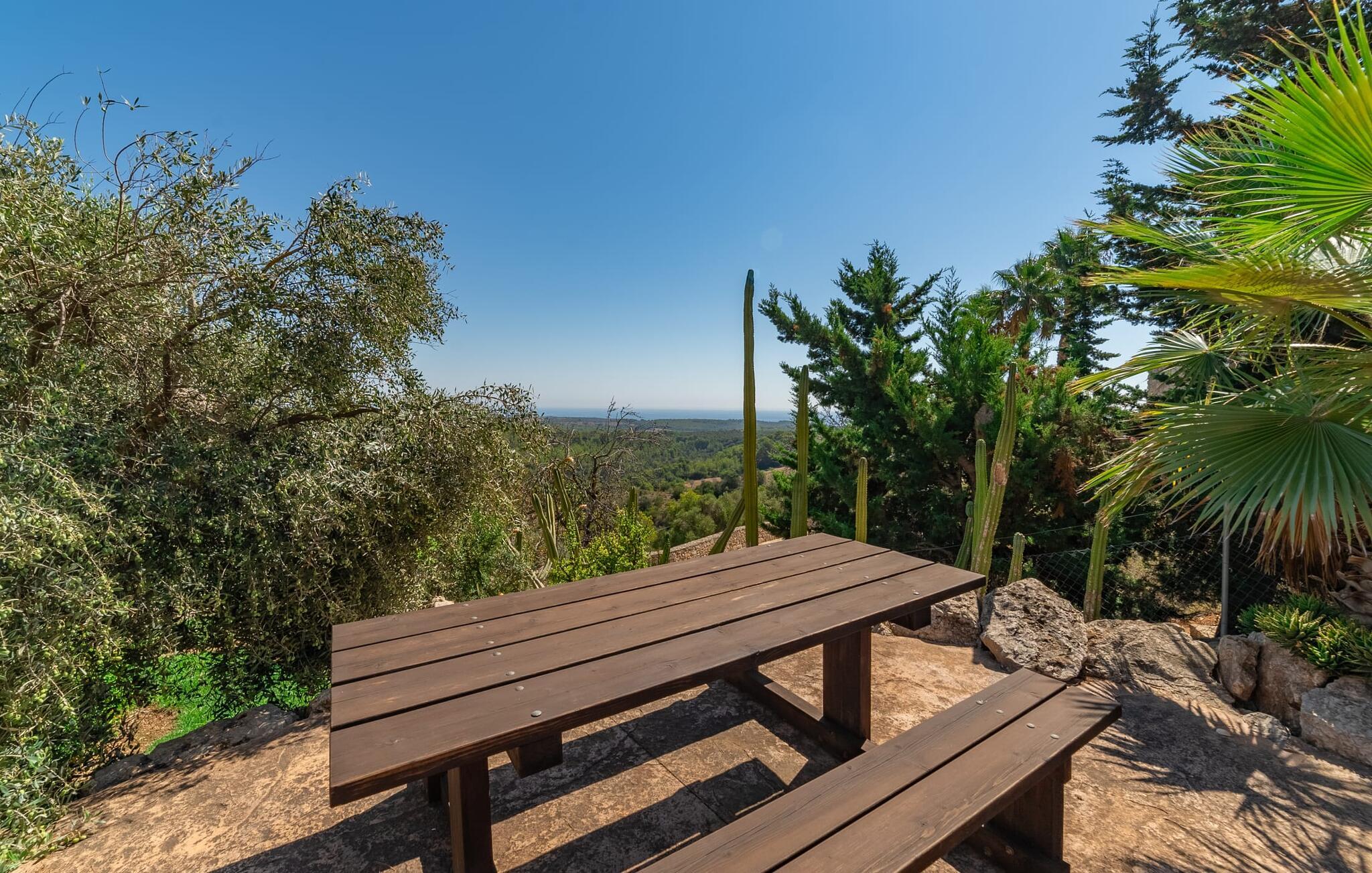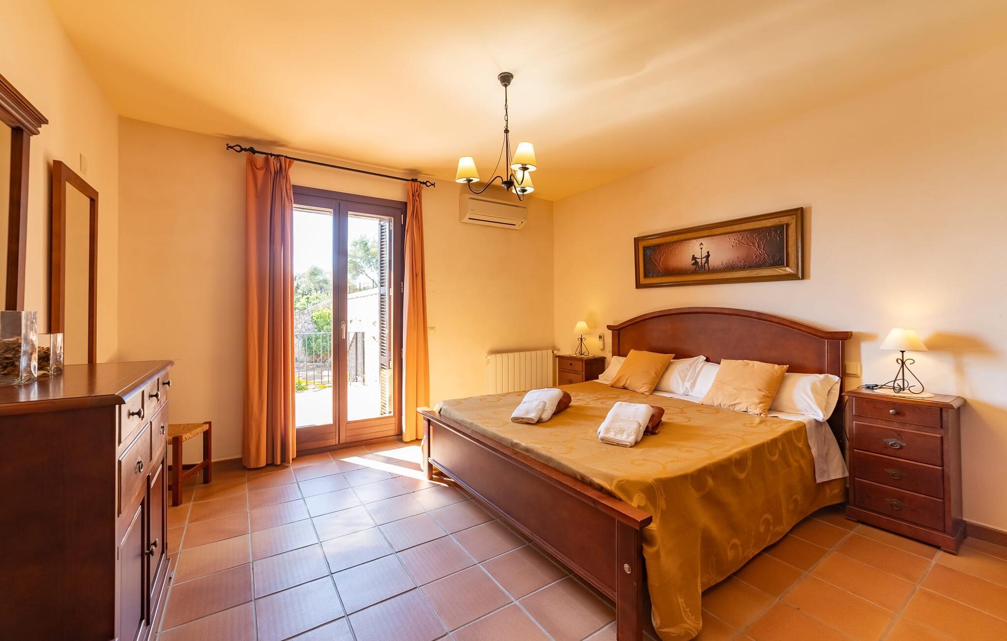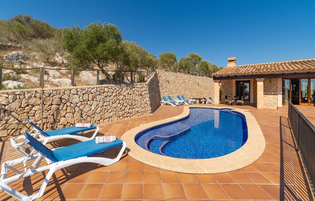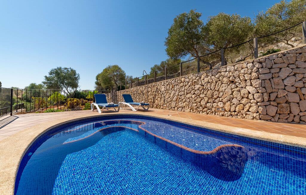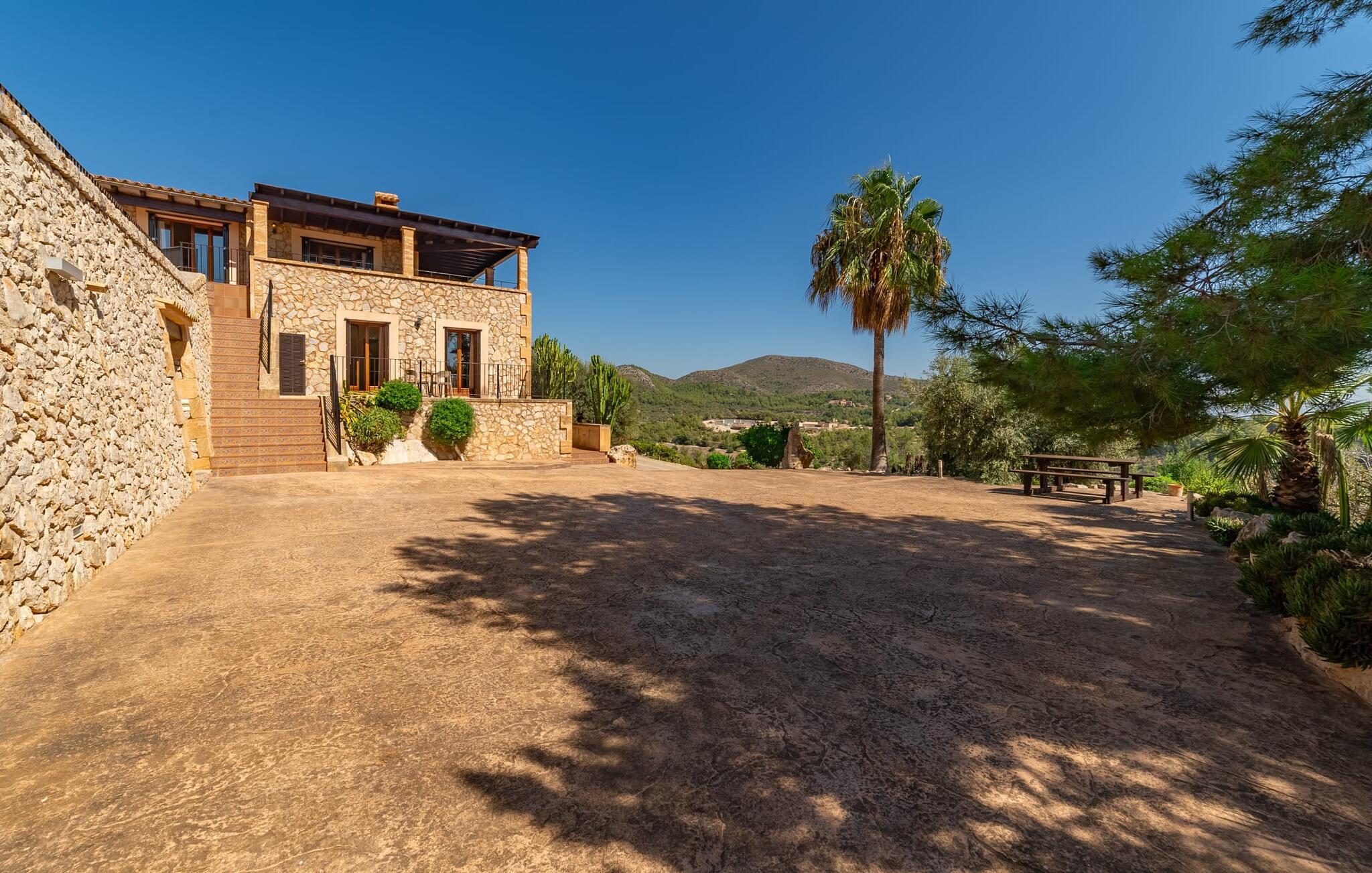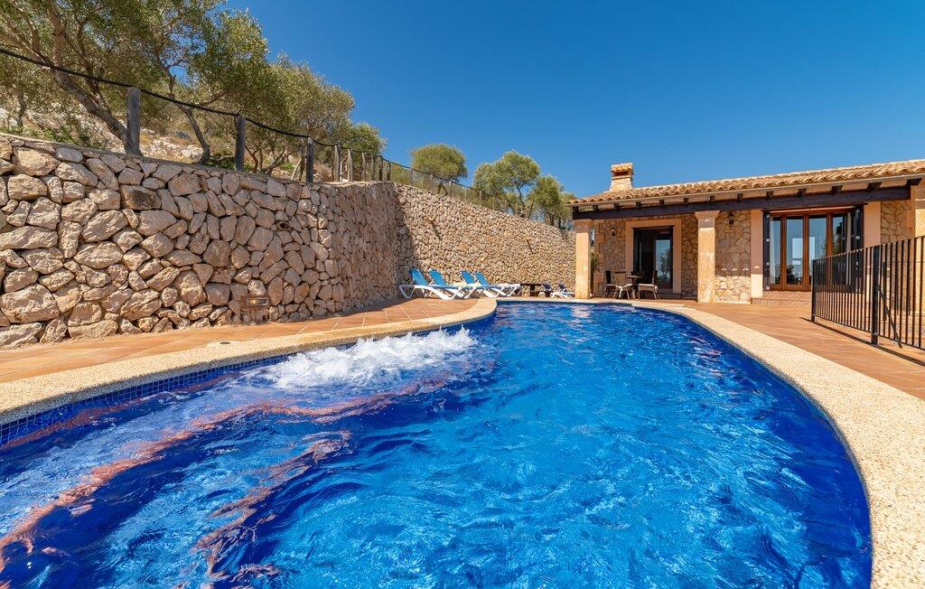Takket være sin udsatte beliggenhed på en stor bjergskråning nær Mallorcas østkyst byder det mallorcanske finca-skjul "Cas Pobler" på en spektakulær udsigt over landskabet hele vejen til havet. Indkørslen fører til en rummelig parkeringsplads. Herfra fører en udvendig trappe op til huset. Langs den øverste etage er der en poolterrasse og en overdækket veranda med spiseplads. Nyd lange solskinstimer ved saltvandspoolen. Bag huset er der endnu en stor terrasse med grill, sommerkøkken og yderligere spisepladser og en sublim udsigt over det omkringliggende landskab. Direkte over grillterrassen tilbyder en Bali-seng placeret i klippehaven et hyggeligt tilflugtssted med en betagende udsigt. Adgang til opholdsstuen sker via den nederste etage af feriefincaen. På dette niveau er der to soveværelser med dobbeltsenge med udgang til en stor balkon med vidstrakt udsigt og et badeværelse. En trappe fører til en hyggelig stue og spisestue med engelsk satellit-tv og udgang til terrassen ved poolen. Der er et rummeligt, moderne køkken med spiseplads. Der er også et stort soveværelse med eget badeværelse og privat adgang til den overdækkede veranda. Alle fire soveværelser er udstyret med aircondition og varme. Fincaen "Cas Pobler" er en meget komfortabel feriebolig hele året rundt. Feriehuset ligger på en bjergskråning 4 km nordvest for Cales de Mallorca. Adskillige små sandbugter på østkysten kan nås på 15 minutter i bil. Vall D'Or Golfklub ligger 8,5 km derfra. Både Cales de Mallorca og Manacor, 20 minutter væk i bil, byder på gode indkøbsmuligheder.