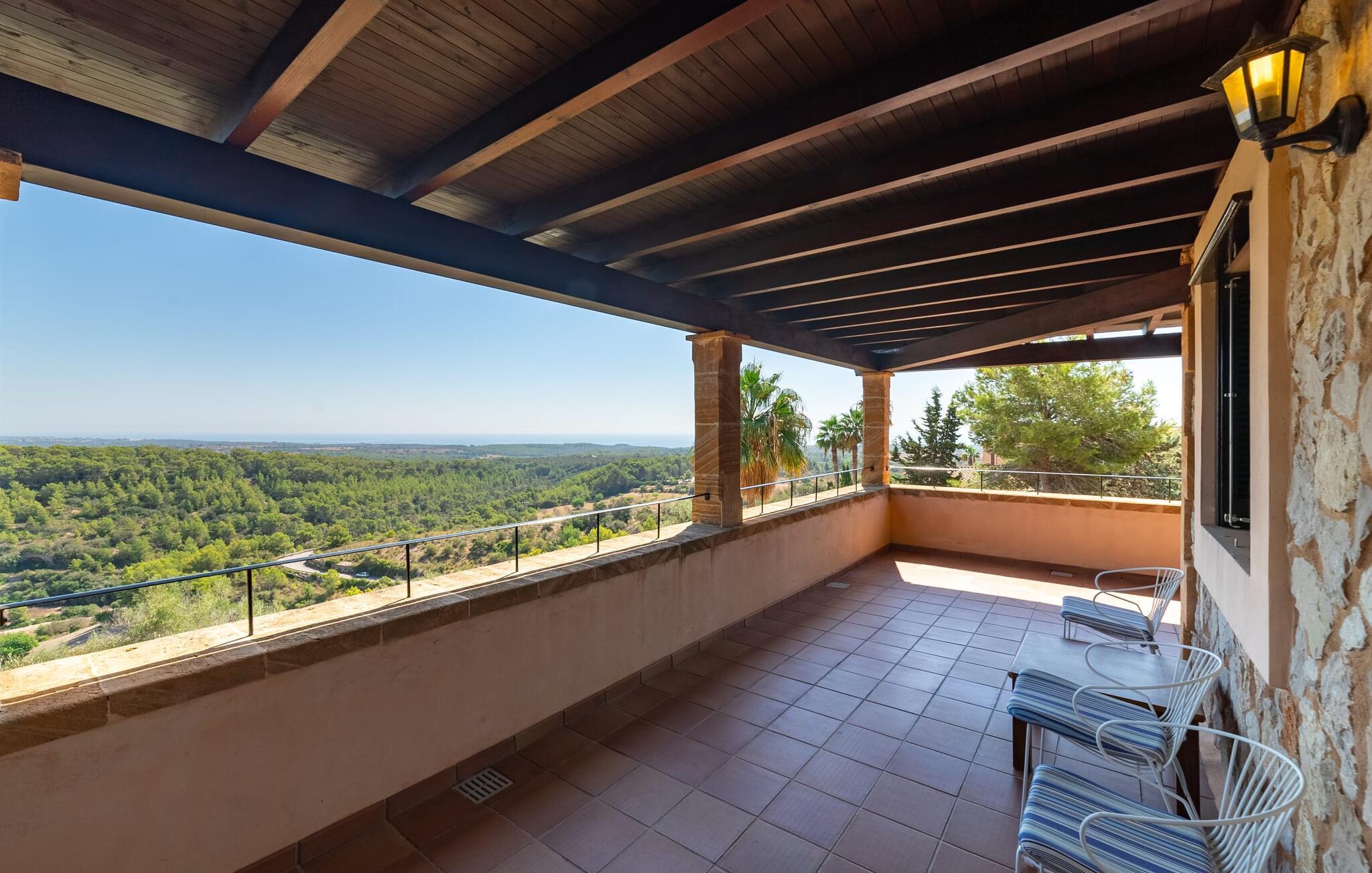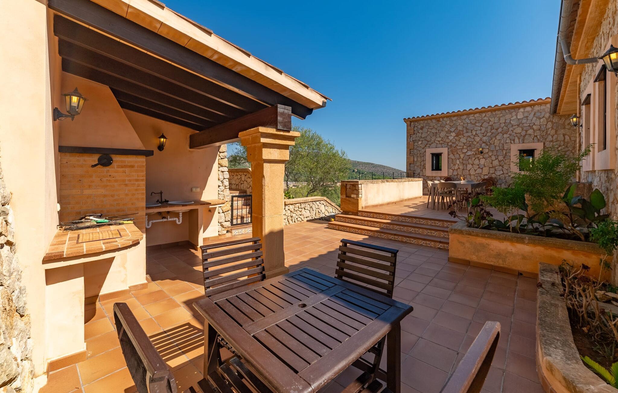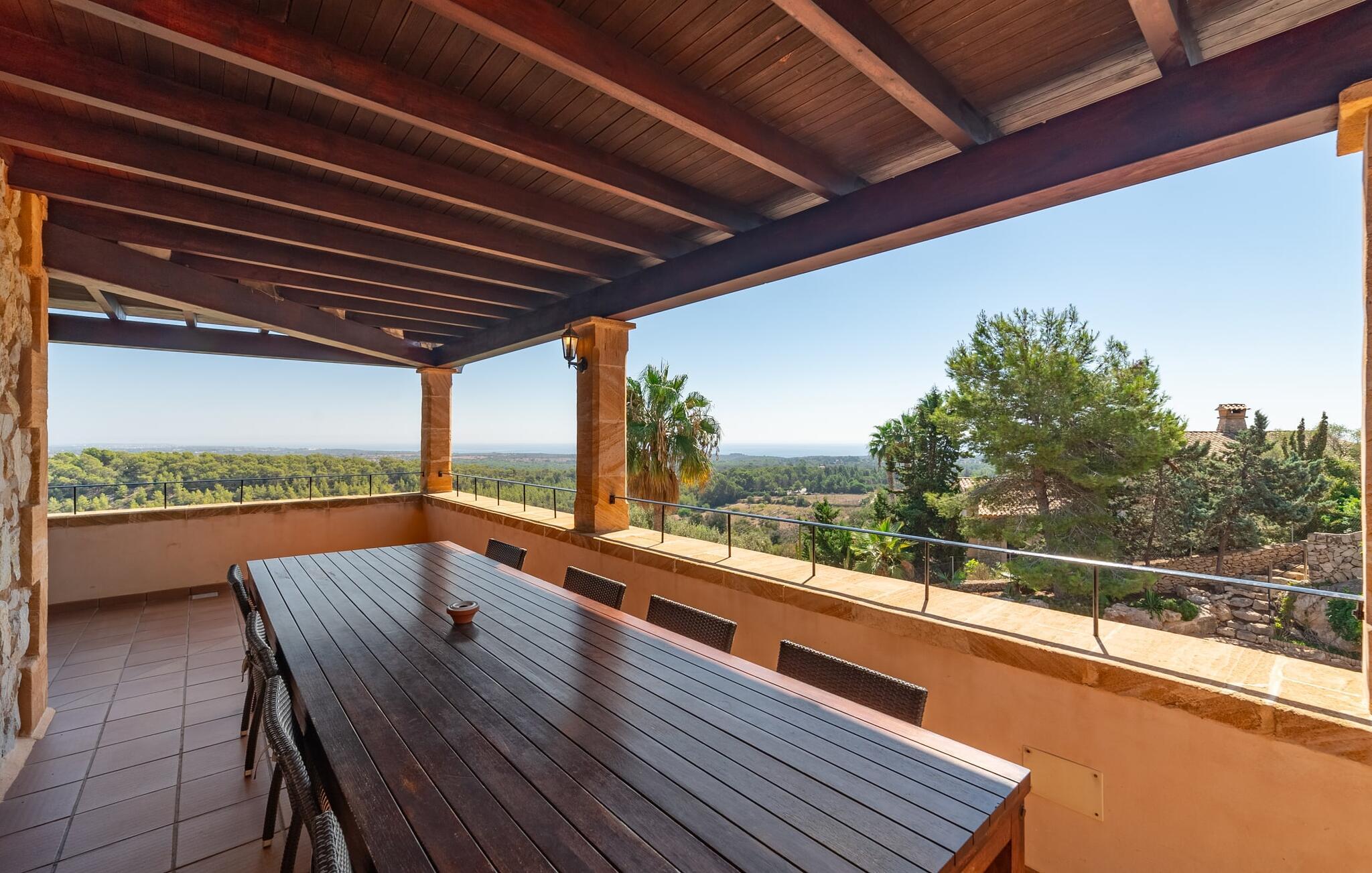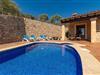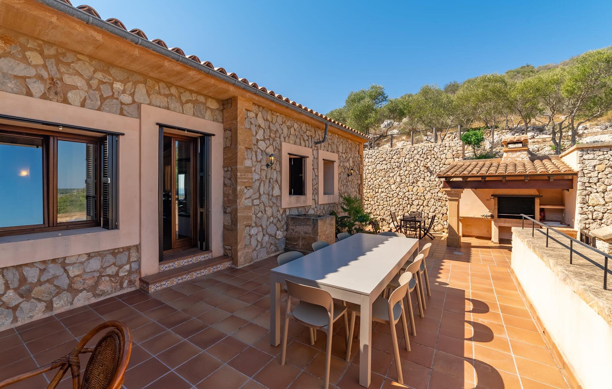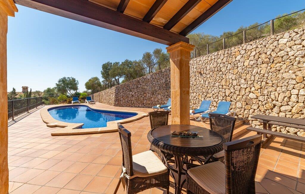 Takket være sin udsatte beliggenhed på en stor bjergskråning nær Mallorcas østkyst byder det mallorcanske finca-skjul "Cas Pobler" på en spektakulær udsigt over landskabet hele vejen til havet. Indkørslen fører til en rummelig parkeringsplads. Herfra fører en udvendig trappe op til huset. Langs den øverste etage er der en poolterrasse og en overdækket veranda med spiseplads. Nyd lange solskinstimer ved saltvandspoolen. Bag huset er der endnu en stor terrasse med grill, sommerkøkken og yderligere spisepladser og en sublim udsigt over det omkringliggende landskab. Direkte over grillterrassen tilbyder en Bali-seng placeret i klippehaven et hyggeligt tilflugtssted med en betagende udsigt. Adgang til opholdsstuen sker via den nederste etage af feriefincaen. På dette niveau er der to soveværelser med dobbeltsenge med udgang til en stor balkon med vidstrakt udsigt og et badeværelse. En trappe fører til en hyggelig stue og spisestue med engelsk satellit-tv og udgang til terrassen ved poolen. Der er et rummeligt, moderne køkken med spiseplads. Der er også et stort soveværelse med eget badeværelse og privat adgang til den overdækkede veranda. Alle fire soveværelser er udstyret med aircondition og varme. Fincaen "Cas Pobler" er en meget komfortabel feriebolig hele året rundt. Feriehuset ligger på en bjergskråning 4 km nordvest for Cales de Mallorca. Adskillige små sandbugter på østkysten kan nås på 15 minutter i bil. Vall D'Or Golfklub ligger 8,5 km derfra. Både Cales de Mallorca og Manacor, 20 minutter væk i bil, byder på gode indkøbsmuligheder.