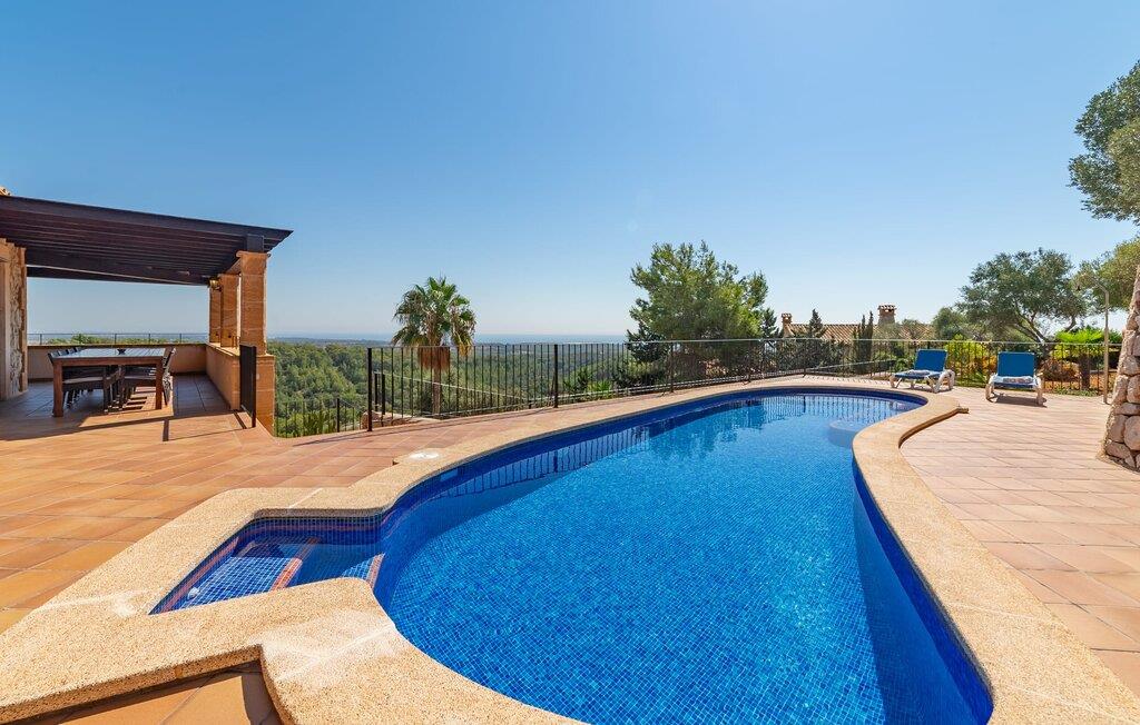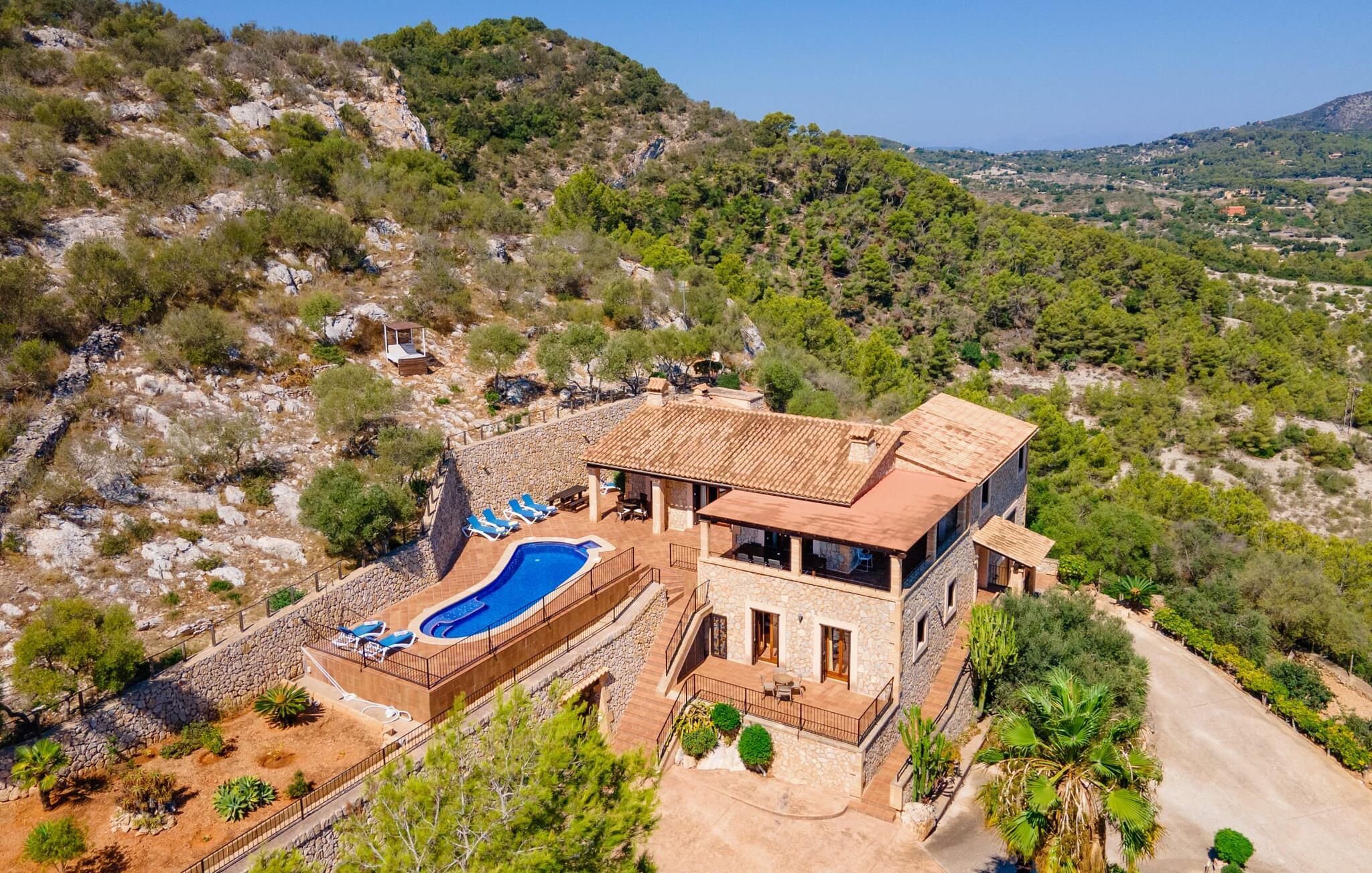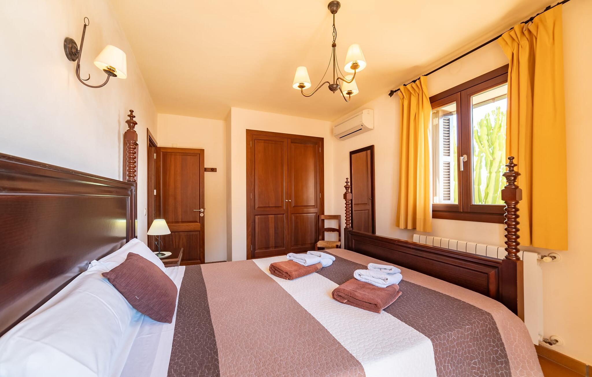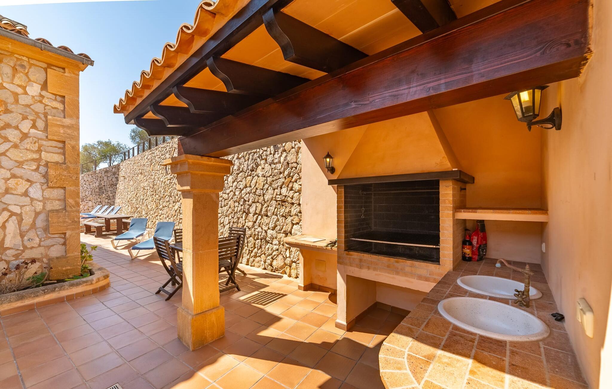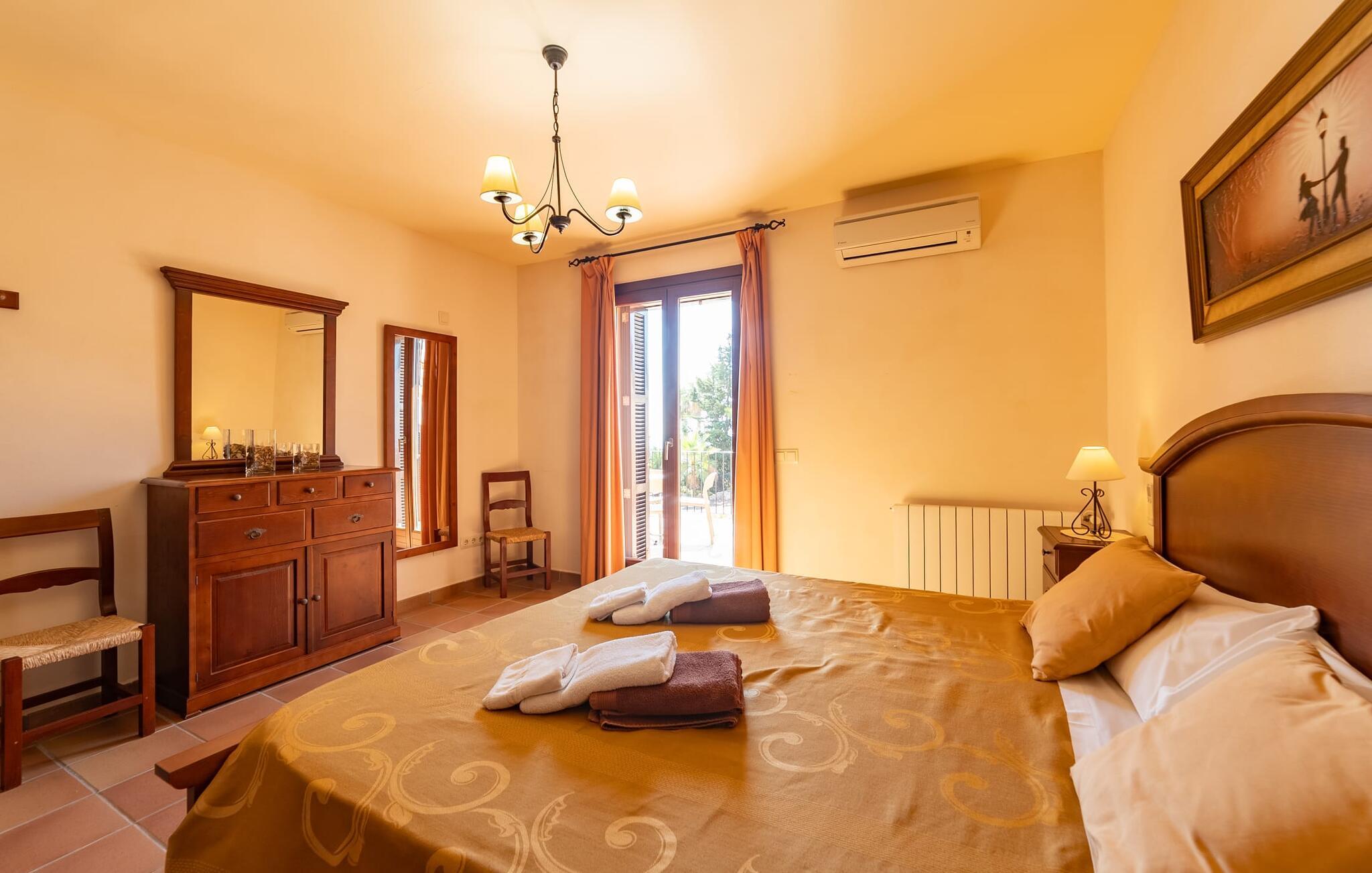 Takket være sin udsatte beliggenhed på en stor bjergskråning nær Mallorcas østkyst byder det mallorcanske finca-skjul "Cas Pobler" på en spektakulær udsigt over landskabet hele vejen til havet. Indkørslen fører til en rummelig parkeringsplads. Herfra fører en udvendig trappe op til huset. Langs den øverste etage er der en poolterrasse og en overdækket veranda med spiseplads. Nyd lange solskinstimer ved saltvandspoolen. Bag huset er der endnu en stor terrasse med grill, sommerkøkken og yderligere spisepladser og en sublim udsigt over det omkringliggende landskab. Direkte over grillterrassen tilbyder en Bali-seng placeret i klippehaven et hyggeligt tilflugtssted med en betagende udsigt. Adgang til opholdsstuen sker via den nederste etage af feriefincaen. På dette niveau er der to soveværelser med dobbeltsenge med udgang til en stor balkon med vidstrakt udsigt og et badeværelse. En trappe fører til en hyggelig stue og spisestue med engelsk satellit-tv og udgang til terrassen ved poolen. Der er et rummeligt, moderne køkken med spiseplads. Der er også et stort soveværelse med eget badeværelse og privat adgang til den overdækkede veranda. Alle fire soveværelser er udstyret med aircondition og varme. Fincaen "Cas Pobler" er en meget komfortabel feriebolig hele året rundt. Feriehuset ligger på en bjergskråning 4 km nordvest for Cales de Mallorca. Adskillige små sandbugter på østkysten kan nås på 15 minutter i bil. Vall D'Or Golfklub ligger 8,5 km derfra. Både Cales de Mallorca og Manacor, 20 minutter væk i bil, byder på gode indkøbsmuligheder.