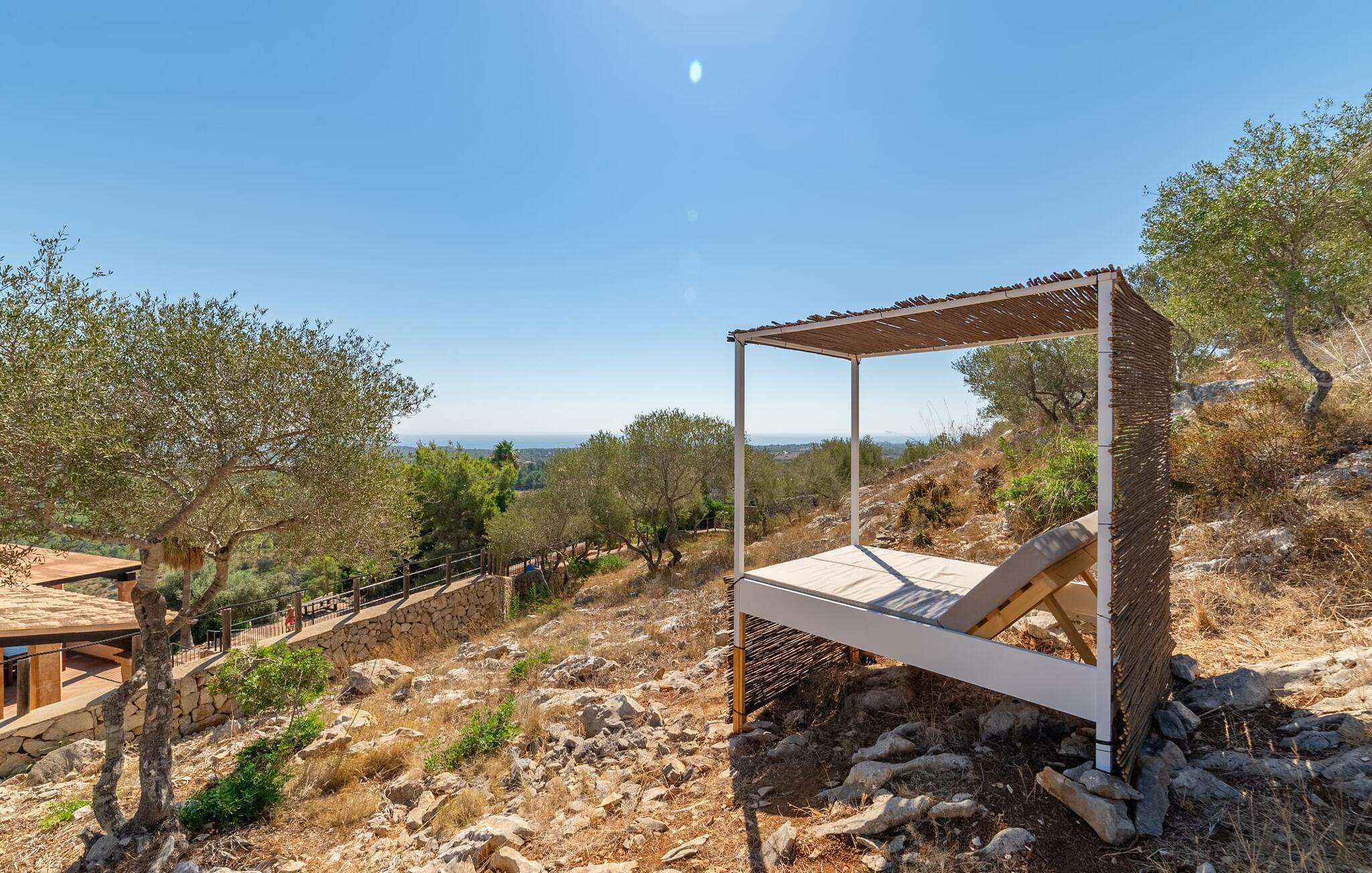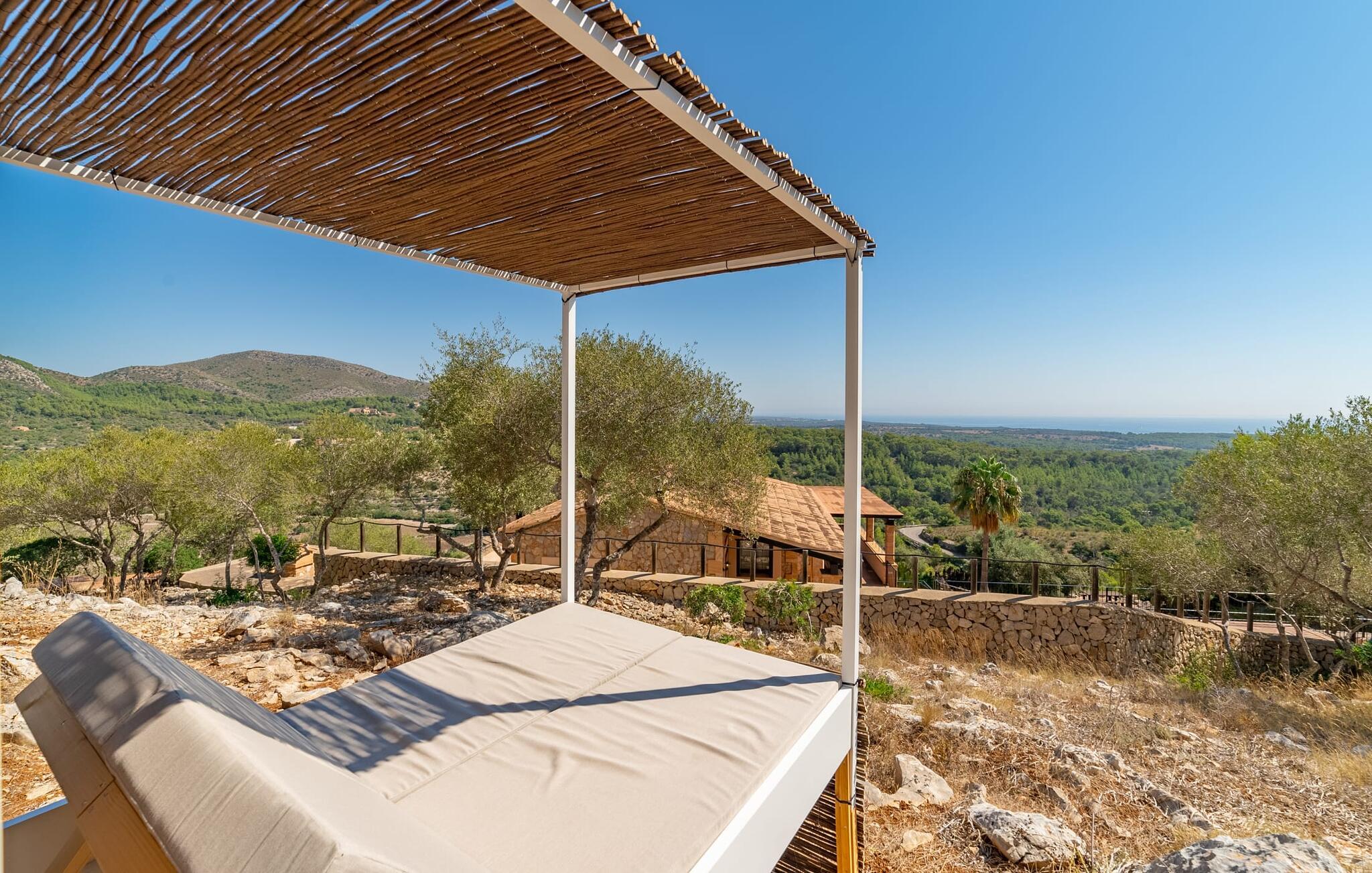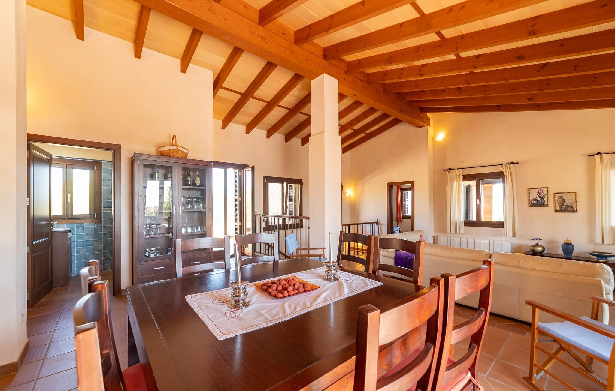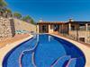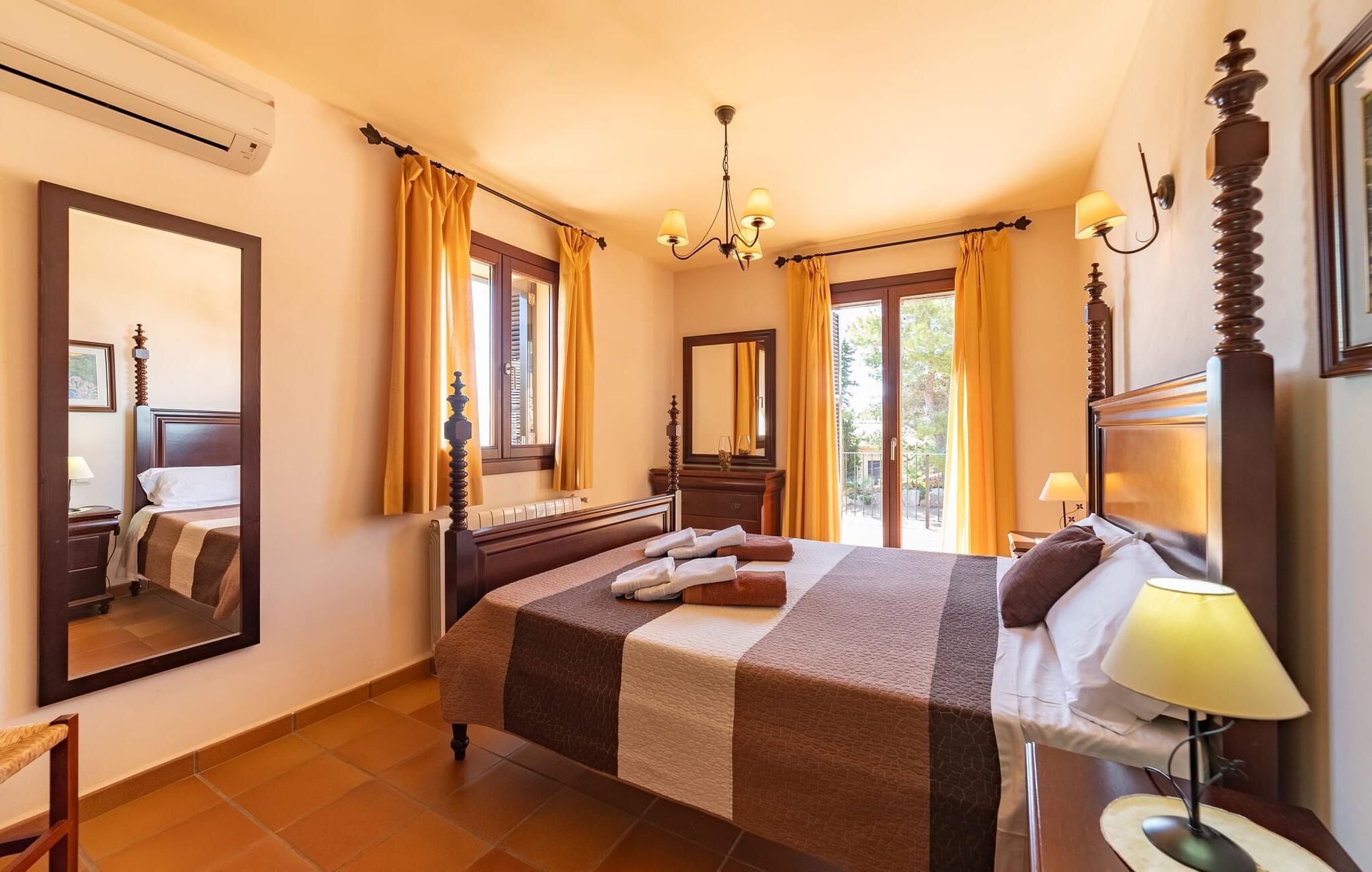 Takket være sin udsatte beliggenhed på en stor bjergskråning nær Mallorcas østkyst byder det mallorcanske finca-skjul "Cas Pobler" på en spektakulær udsigt over landskabet hele vejen til havet. Indkørslen fører til en rummelig parkeringsplads. Herfra fører en udvendig trappe op til huset. Langs den øverste etage er der en poolterrasse og en overdækket veranda med spiseplads. Nyd lange solskinstimer ved saltvandspoolen. Bag huset er der endnu en stor terrasse med grill, sommerkøkken og yderligere spisepladser og en sublim udsigt over det omkringliggende landskab. Direkte over grillterrassen tilbyder en Bali-seng placeret i klippehaven et hyggeligt tilflugtssted med en betagende udsigt. Adgang til opholdsstuen sker via den nederste etage af feriefincaen. På dette niveau er der to soveværelser med dobbeltsenge med udgang til en stor balkon med vidstrakt udsigt og et badeværelse. En trappe fører til en hyggelig stue og spisestue med engelsk satellit-tv og udgang til terrassen ved poolen. Der er et rummeligt, moderne køkken med spiseplads. Der er også et stort soveværelse med eget badeværelse og privat adgang til den overdækkede veranda. Alle fire soveværelser er udstyret med aircondition og varme. Fincaen "Cas Pobler" er en meget komfortabel feriebolig hele året rundt. Feriehuset ligger på en bjergskråning 4 km nordvest for Cales de Mallorca. Adskillige små sandbugter på østkysten kan nås på 15 minutter i bil. Vall D'Or Golfklub ligger 8,5 km derfra. Både Cales de Mallorca og Manacor, 20 minutter væk i bil, byder på gode indkøbsmuligheder.