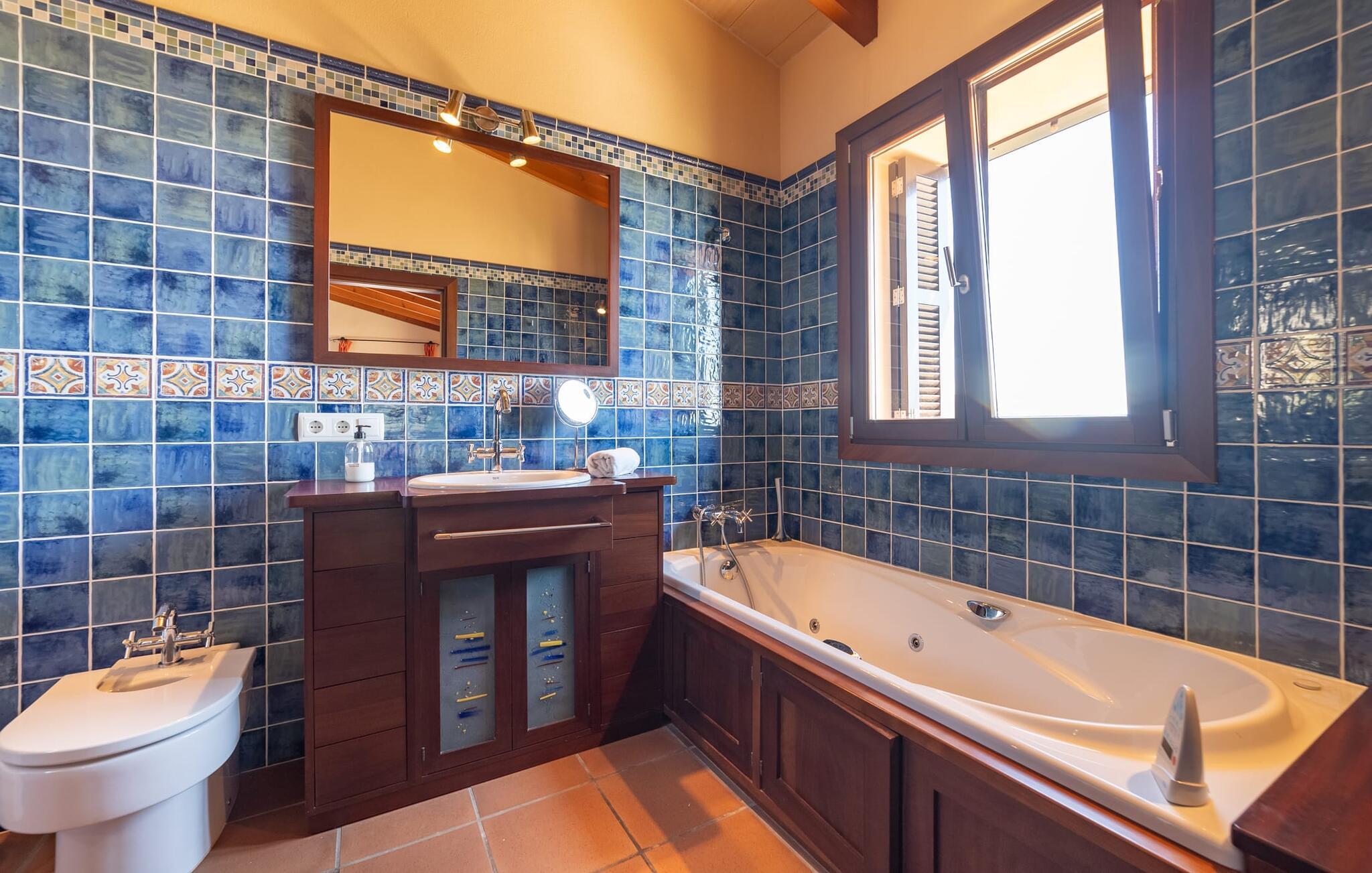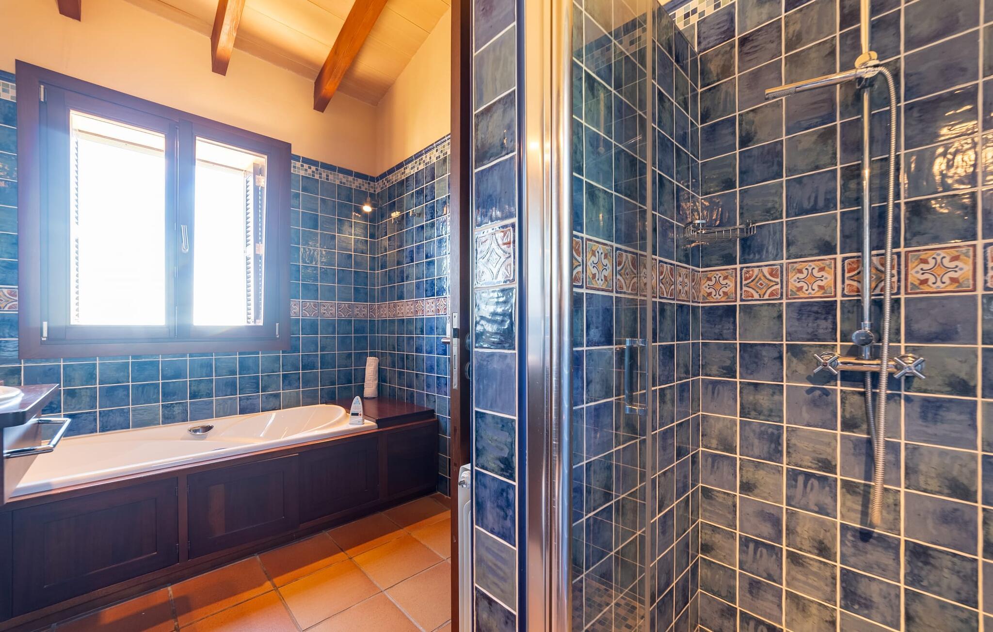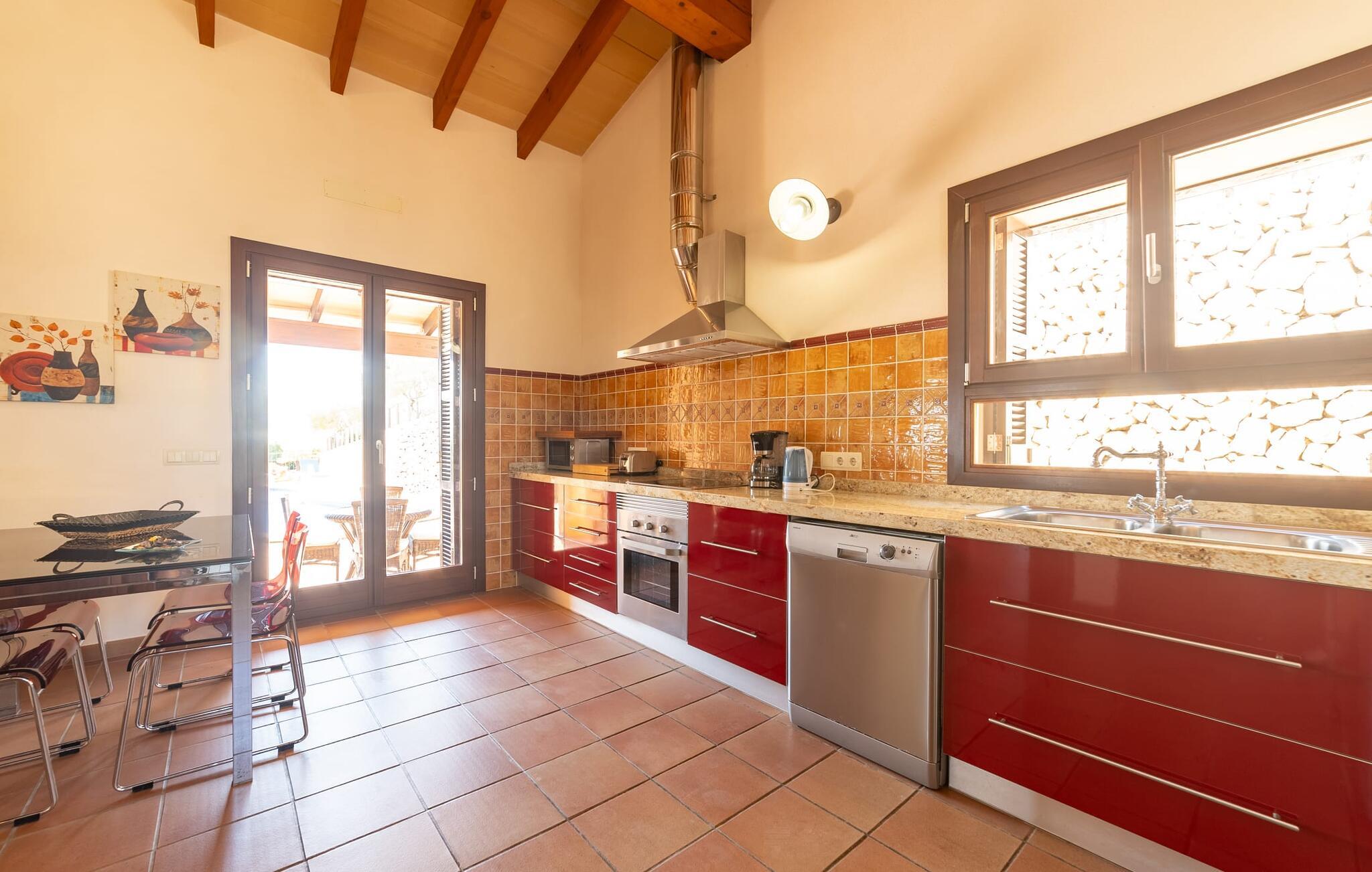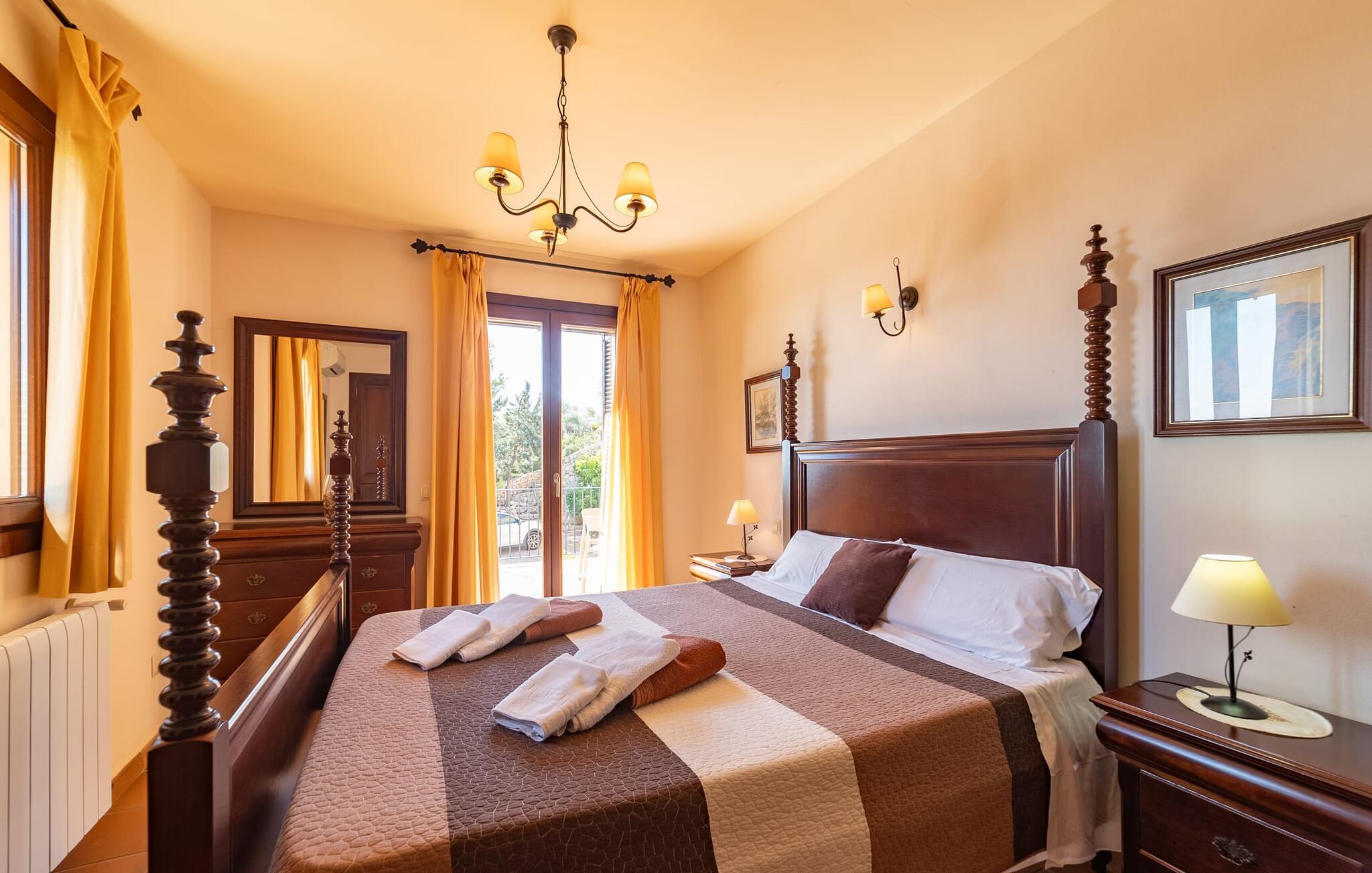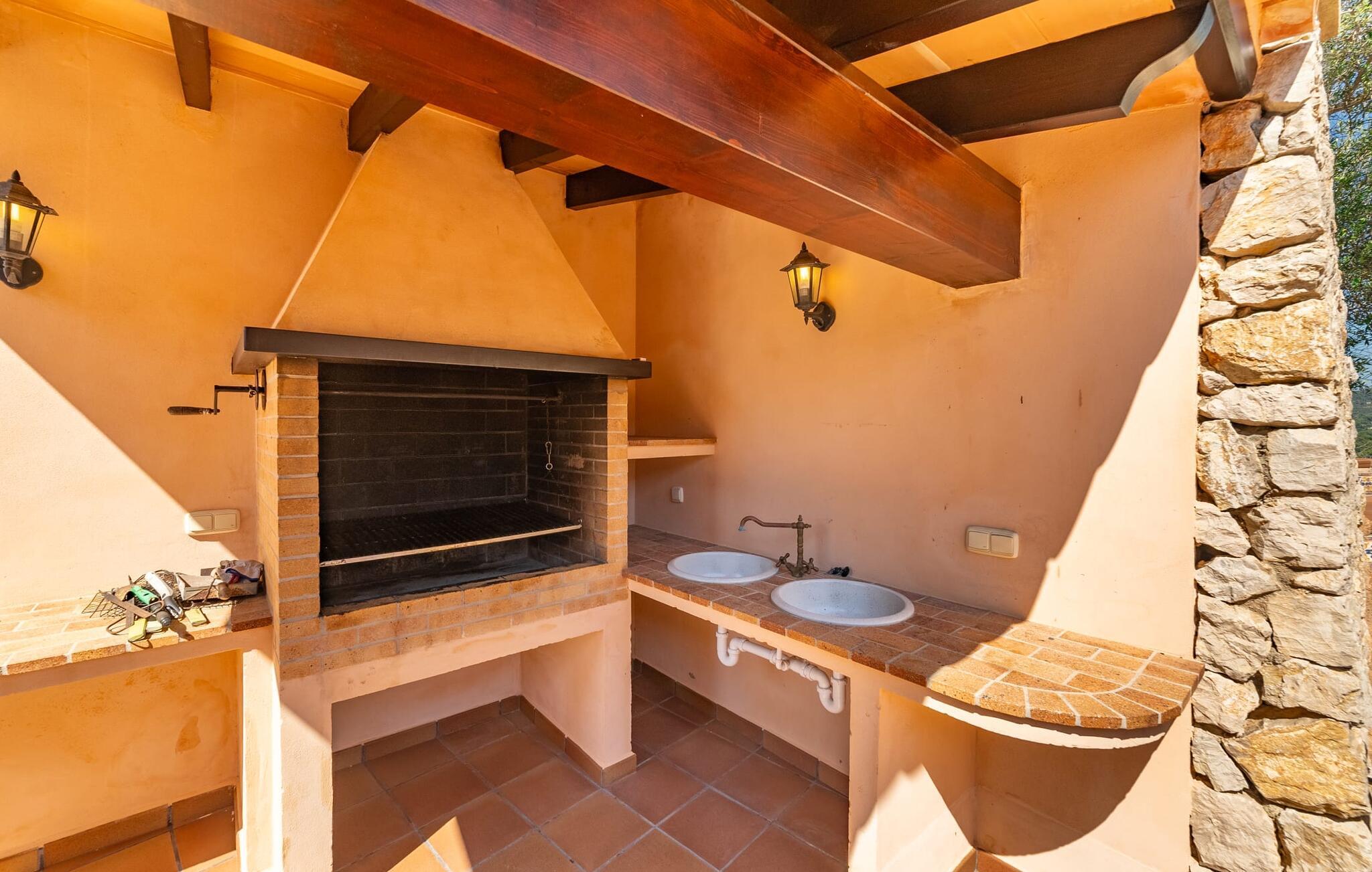 Takket være sin udsatte beliggenhed på en stor bjergskråning nær Mallorcas østkyst byder det mallorcanske finca-skjul "Cas Pobler" på en spektakulær udsigt over landskabet hele vejen til havet. Indkørslen fører til en rummelig parkeringsplads. Herfra fører en udvendig trappe op til huset. Langs den øverste etage er der en poolterrasse og en overdækket veranda med spiseplads. Nyd lange solskinstimer ved saltvandspoolen. Bag huset er der endnu en stor terrasse med grill, sommerkøkken og yderligere spisepladser og en sublim udsigt over det omkringliggende landskab. Direkte over grillterrassen tilbyder en Bali-seng placeret i klippehaven et hyggeligt tilflugtssted med en betagende udsigt. Adgang til opholdsstuen sker via den nederste etage af feriefincaen. På dette niveau er der to soveværelser med dobbeltsenge med udgang til en stor balkon med vidstrakt udsigt og et badeværelse. En trappe fører til en hyggelig stue og spisestue med engelsk satellit-tv og udgang til terrassen ved poolen. Der er et rummeligt, moderne køkken med spiseplads. Der er også et stort soveværelse med eget badeværelse og privat adgang til den overdækkede veranda. Alle fire soveværelser er udstyret med aircondition og varme. Fincaen "Cas Pobler" er en meget komfortabel feriebolig hele året rundt. Feriehuset ligger på en bjergskråning 4 km nordvest for Cales de Mallorca. Adskillige små sandbugter på østkysten kan nås på 15 minutter i bil. Vall D'Or Golfklub ligger 8,5 km derfra. Både Cales de Mallorca og Manacor, 20 minutter væk i bil, byder på gode indkøbsmuligheder.