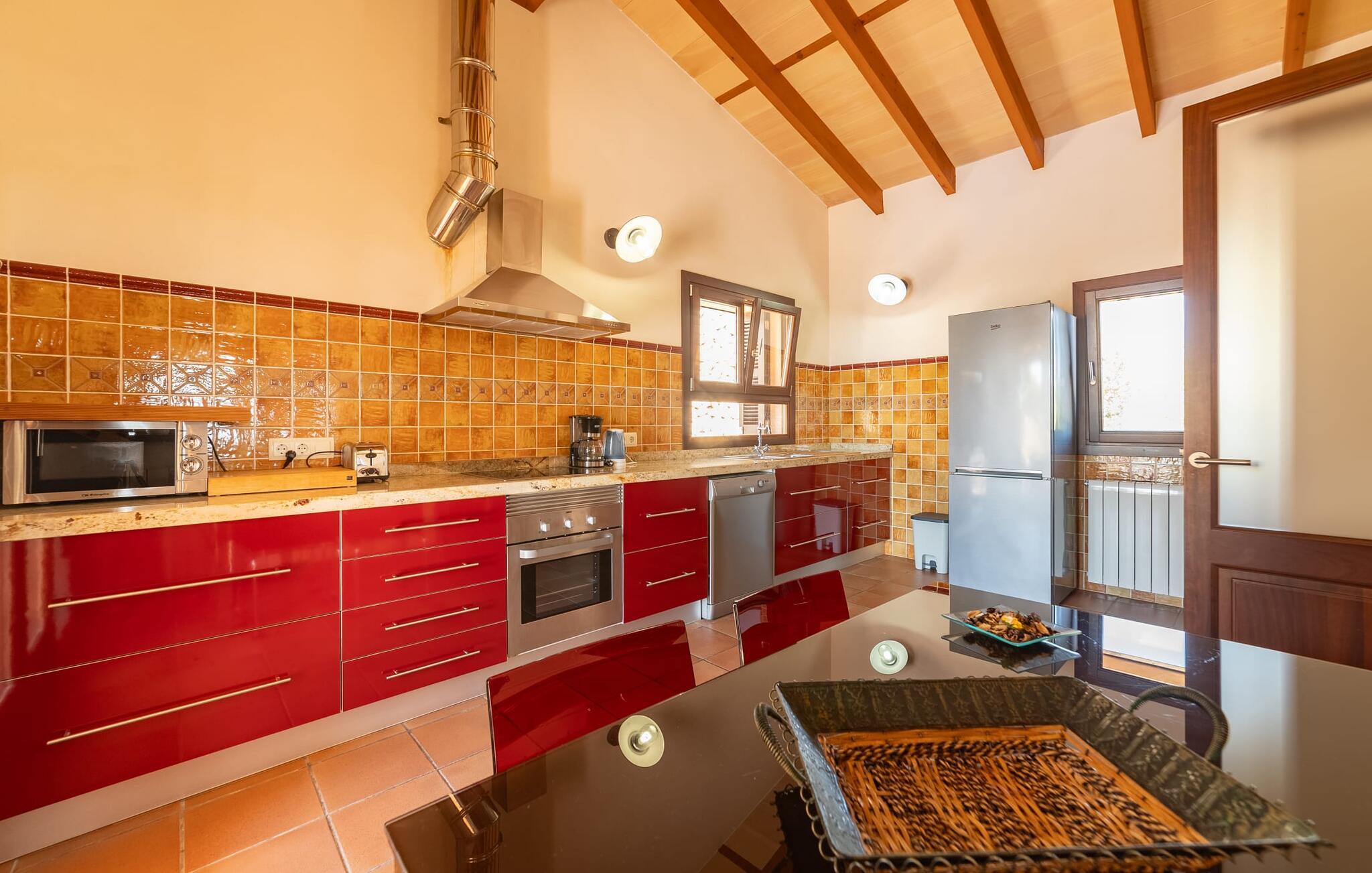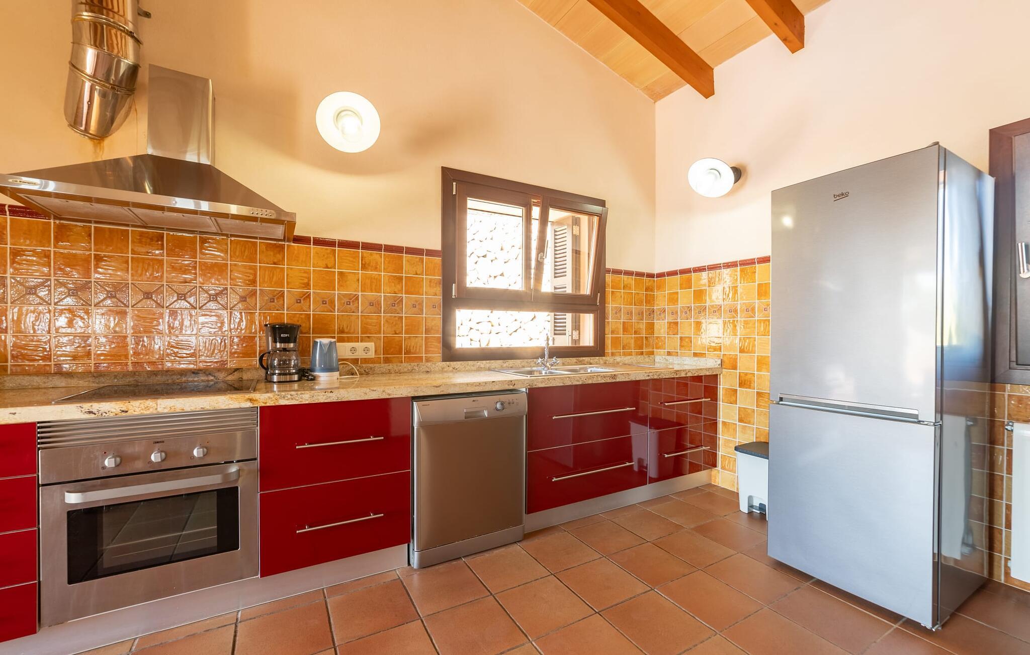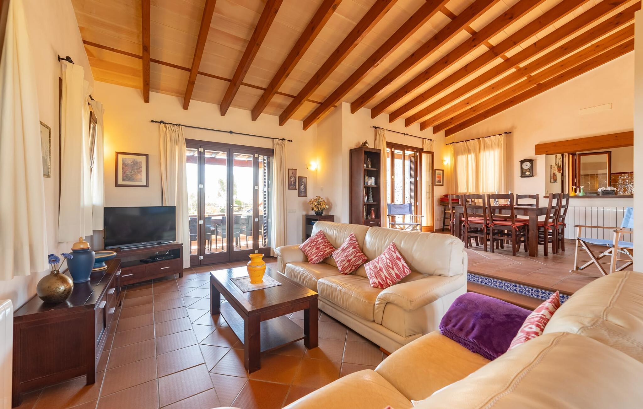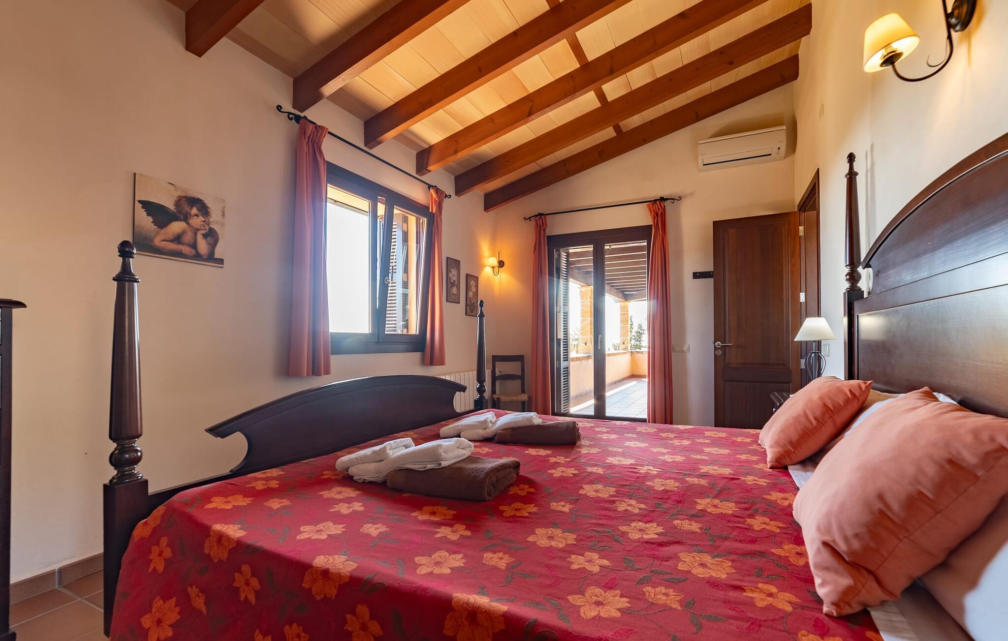 Takket være sin udsatte beliggenhed på en stor bjergskråning nær Mallorcas østkyst byder det mallorcanske finca-skjul "Cas Pobler" på en spektakulær udsigt over landskabet hele vejen til havet. Indkørslen fører til en rummelig parkeringsplads. Herfra fører en udvendig trappe op til huset. Langs den øverste etage er der en poolterrasse og en overdækket veranda med spiseplads. Nyd lange solskinstimer ved saltvandspoolen. Bag huset er der endnu en stor terrasse med grill, sommerkøkken og yderligere spisepladser og en sublim udsigt over det omkringliggende landskab. Direkte over grillterrassen tilbyder en Bali-seng placeret i klippehaven et hyggeligt tilflugtssted med en betagende udsigt. Adgang til opholdsstuen sker via den nederste etage af feriefincaen. På dette niveau er der to soveværelser med dobbeltsenge med udgang til en stor balkon med vidstrakt udsigt og et badeværelse. En trappe fører til en hyggelig stue og spisestue med engelsk satellit-tv og udgang til terrassen ved poolen. Der er et rummeligt, moderne køkken med spiseplads. Der er også et stort soveværelse med eget badeværelse og privat adgang til den overdækkede veranda. Alle fire soveværelser er udstyret med aircondition og varme. Fincaen "Cas Pobler" er en meget komfortabel feriebolig hele året rundt. Feriehuset ligger på en bjergskråning 4 km nordvest for Cales de Mallorca. Adskillige små sandbugter på østkysten kan nås på 15 minutter i bil. Vall D'Or Golfklub ligger 8,5 km derfra. Både Cales de Mallorca og Manacor, 20 minutter væk i bil, byder på gode indkøbsmuligheder.