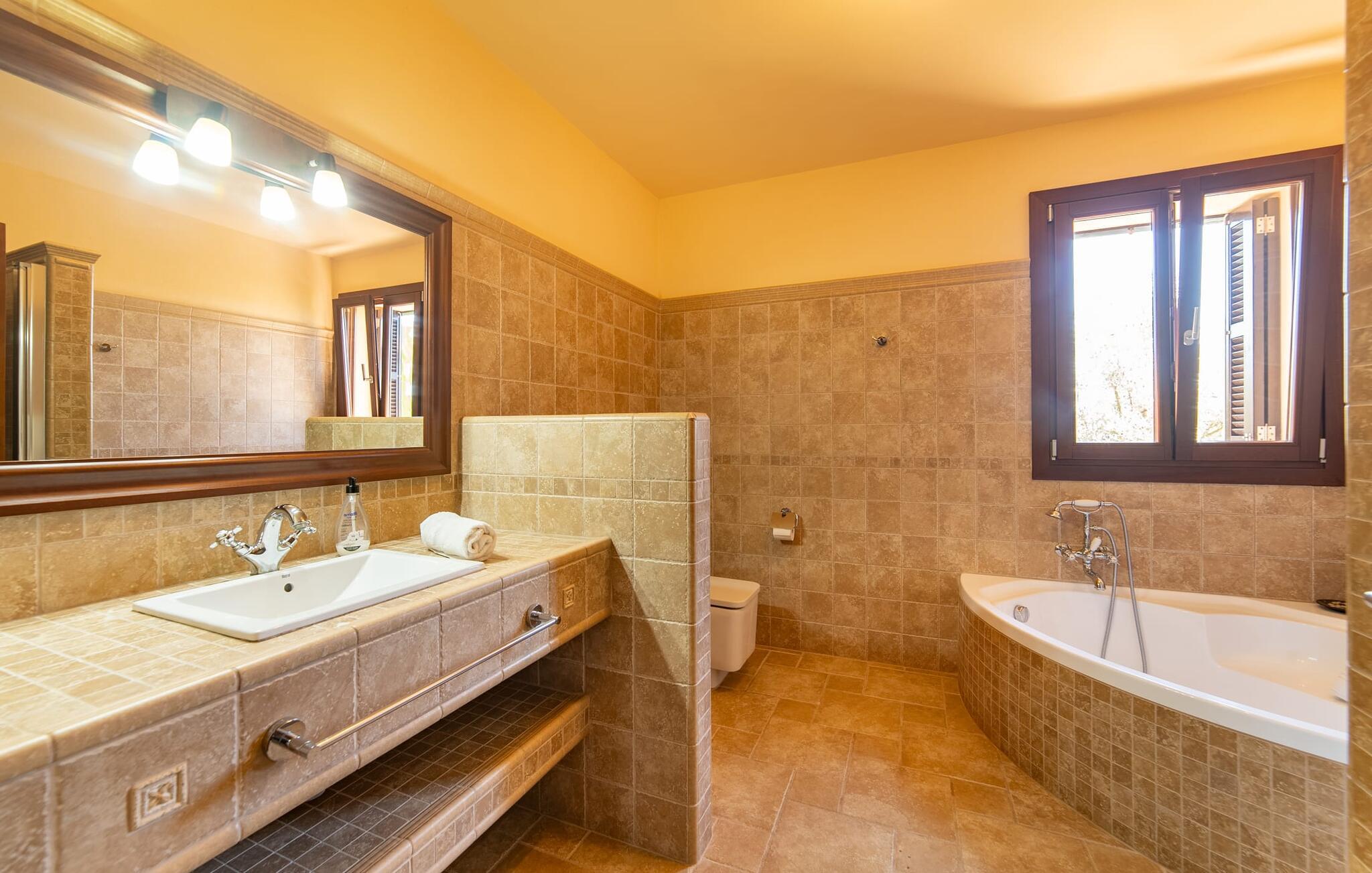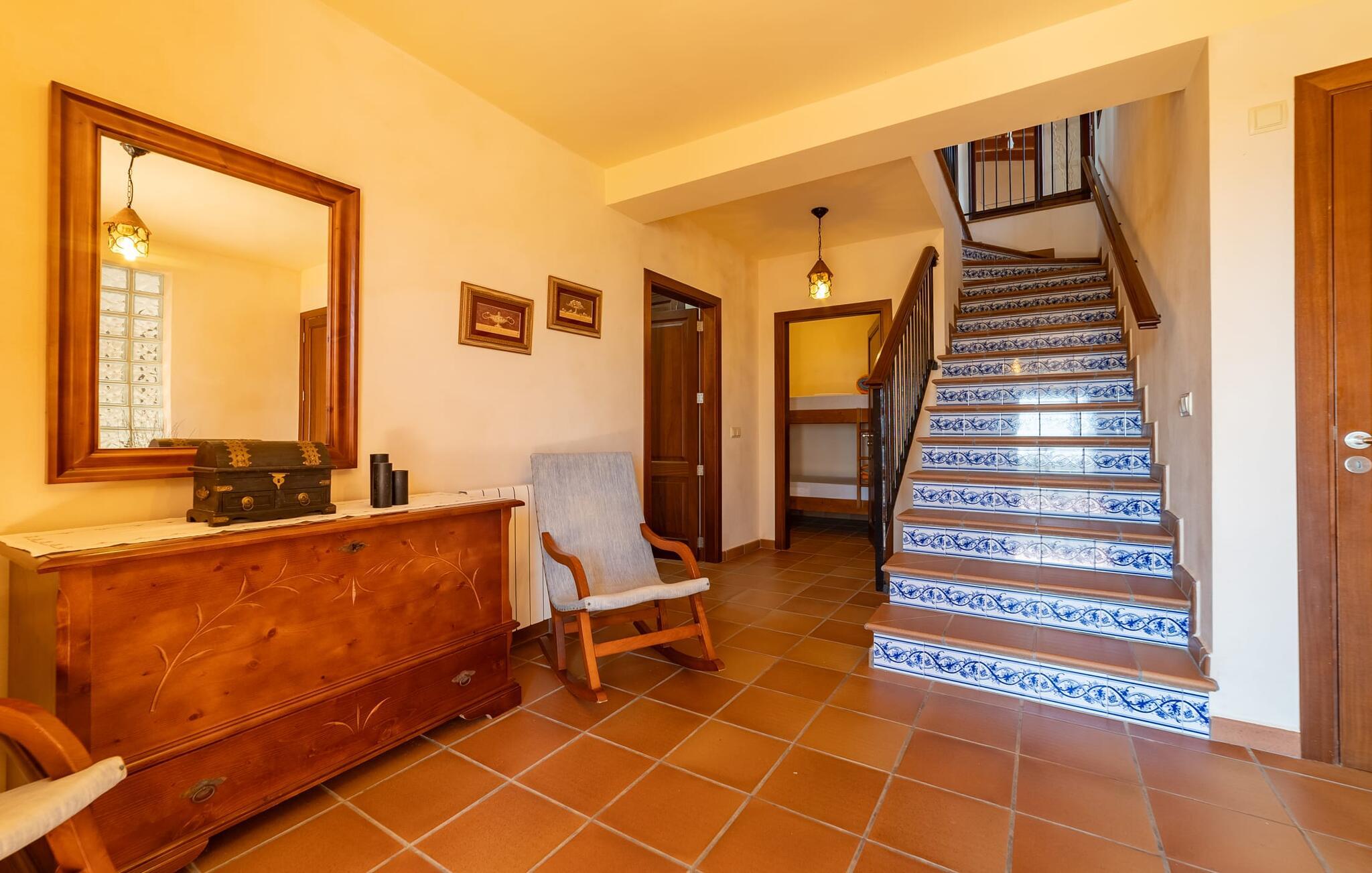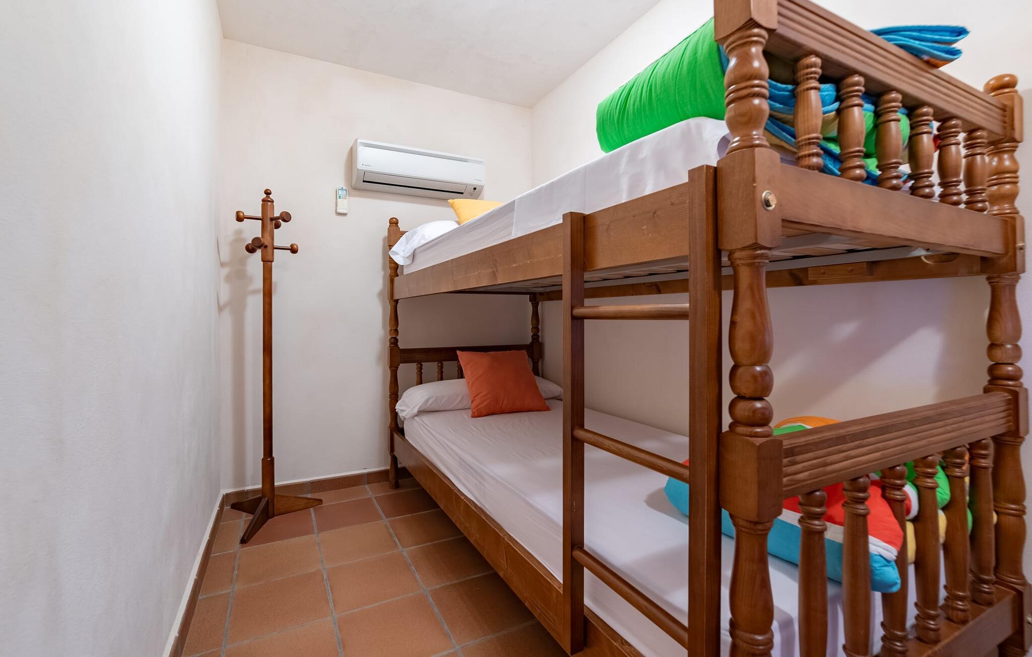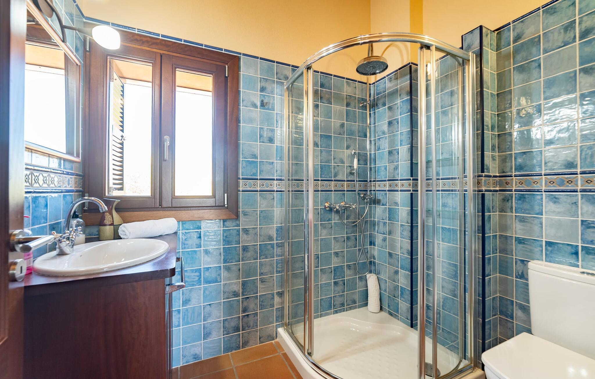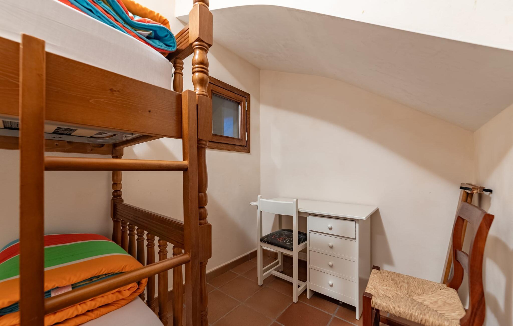Takket være sin udsatte beliggenhed på en stor bjergskråning nær Mallorcas østkyst byder det mallorcanske finca-skjul "Cas Pobler" på en spektakulær udsigt over landskabet hele vejen til havet. Indkørslen fører til en rummelig parkeringsplads. Herfra fører en udvendig trappe op til huset. Langs den øverste etage er der en poolterrasse og en overdækket veranda med spiseplads. Nyd lange solskinstimer ved saltvandspoolen. Bag huset er der endnu en stor terrasse med grill, sommerkøkken og yderligere spisepladser og en sublim udsigt over det omkringliggende landskab. Direkte over grillterrassen tilbyder en Bali-seng placeret i klippehaven et hyggeligt tilflugtssted med en betagende udsigt. Adgang til opholdsstuen sker via den nederste etage af feriefincaen. På dette niveau er der to soveværelser med dobbeltsenge med udgang til en stor balkon med vidstrakt udsigt og et badeværelse. En trappe fører til en hyggelig stue og spisestue med engelsk satellit-tv og udgang til terrassen ved poolen. Der er et rummeligt, moderne køkken med spiseplads. Der er også et stort soveværelse med eget badeværelse og privat adgang til den overdækkede veranda. Alle fire soveværelser er udstyret med aircondition og varme. Fincaen "Cas Pobler" er en meget komfortabel feriebolig hele året rundt. Feriehuset ligger på en bjergskråning 4 km nordvest for Cales de Mallorca. Adskillige små sandbugter på østkysten kan nås på 15 minutter i bil. Vall D'Or Golfklub ligger 8,5 km derfra. Både Cales de Mallorca og Manacor, 20 minutter væk i bil, byder på gode indkøbsmuligheder.