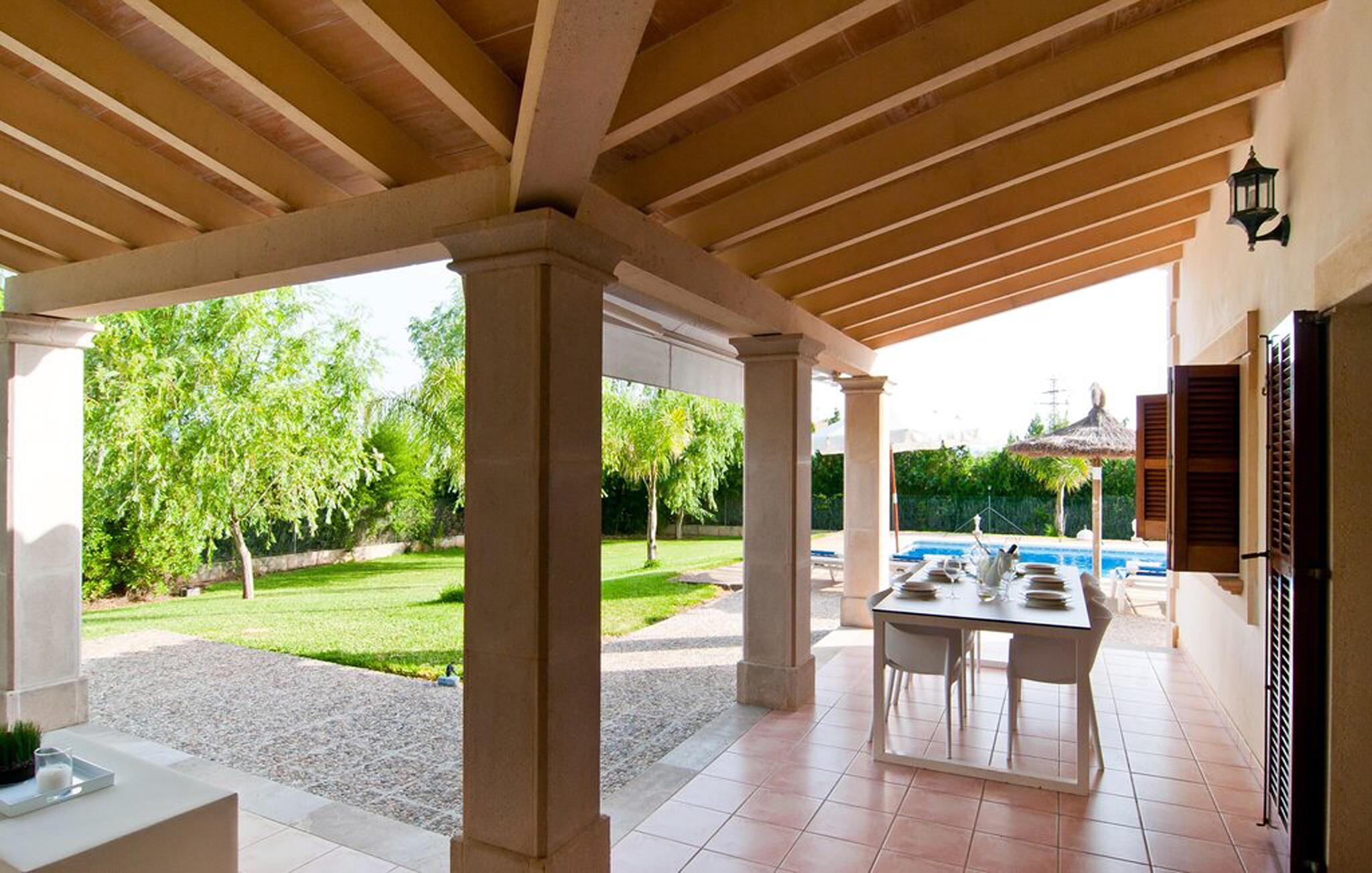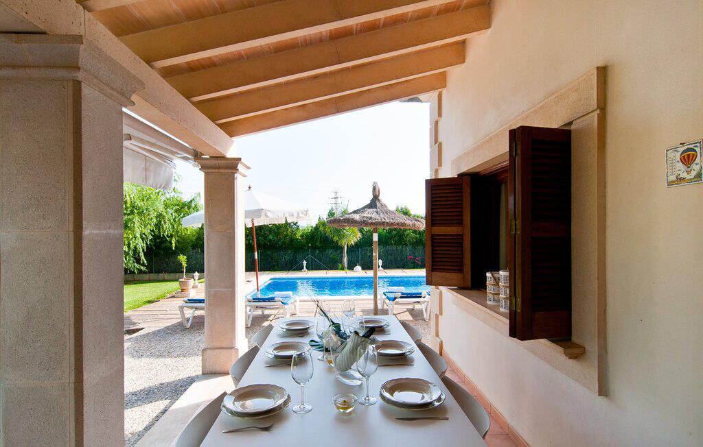 Den smukke middelhavsvilla "Cas Sabateret" har en landlig atmosfære. I kommer til via en asfalteret sti og de sidste meter fører jer ad villastien langs den smukke have. I finder to parkeringspladser, der giver skygge til jeres køretøjer, samt andre pladser ved huset. Straks man når frem til sommerhuset, fremstår den fritliggende villas abrikosfarvede facader og træskodder umiddelbart meget indbydende. Ejendommen er omgivet af en smuk have, skyggefulde træer og græsplæner. Indgangspartiet har naturstenslignende plader og er omgivet af palmer. Den afrundede pool er placeret på den private ejendom lige foran det sydvendte hus og inviterer straks til at slappe af i den varme mallorcanske sol. Poolen har en maksimal vanddybde på 1,90 m. Indgangen er via en trappe dekoreret med mosaikfliser på begge sider, hvori midten kan lege i det lave vand eller voksne kan forfriske sig med en kølig drink. Poolen er omgivet af en terrasse, hvor der er en udendørs bruser og flere liggestole med parasoller. I finder hurtigt plads til at nyde dagen med en god bog eller bare slappe af. Et højdepunkt er Bali-sengen lige ved poolen, som indbyder til at slappe af med udsigt til poolen og det grønne. Foran huset er der en overdækket terrasse med spisebord med stole og en indbydende hvid sofa. Her kan I spise godt og slappe af med venner eller familie. Hvis I vil slappe af, kan I gå til tagterrassen, som kan nås fra et af soveværelserne. Den sydlige orientering og villaens store vinduespartier sikrer venlig lysstyrke inde i huset. Sammen med den rustikke indretning og jeres møbler af høj kvalitet er dette meget hyggeligt. Bemærkelsesværdige er de fritlagte træbjælker under loftet, som tilføjer den rustikke charme, samt de typiske mallorcanske fliser i en lerfarve, der kan findes i hele huset. Fra det venlige indgangsparti går man direkte ind i den tilstødende stue og spisestue, hvor der er et stort spisebord i træ. Rotanstolene med deres lyse hynder inviterer jer til at tilbringe lange aftener sammen. Så I kan bruge en hyggelig aften med at se tv fra den lyse sofa. I det fuldt udstyrede køkken er der en anden stor spiseplads, der inviterer til at lave mad aftener sammen. Køkkenet tilbyder gæsterne alle de bekvemmeligheder, I normalt ville finde derhjemme: opvaskemaskine, ovn, komfur, køleskab/fryser, mikroovn, elkedel og kaffemaskine. De fire venlige og attraktive værelser er smagfuldt indrettede. Sengene på 1,90 x 2,0 m inviterer jer til at sove godt. Der er i alt fire rummelige badeværelser, alle en-suite, det ene med jacuzzi og gæstetoilet. Tre soveværelser er i stueetagen og et på øverste etage med udgang til tagterrassen, hvorfra I har en smuk udsigt over poolen. Villaen ligger i en smuk, landlig beliggenhed nær byen Muro. I kan gå her om søndagen til det ugentlige marked. Der er yderligere indkøbsmuligheder i Can Picafort. I den nordlige del, som er domineret af turisme, er der smukke sandstrande. Bugterne Alcúdia og Pollença kan nås hurtigt. Der er vandremuligheder i nærheden og også i Tramuntana-bjergene. Bemærk venligst, at denne ejendom ikke accepterer ungdomsgrupper eller polterabender. En ungdomsgruppe på denne ejendom består af personer i alderen [30] eller yngre. Book ikke denne ejendom, hvis I er en ungdomsgruppe eller polterabend, da jeres reservation vil blive afvist, når den er booket, hvilket også kan være tilfældet ved ankomst til ejendommen eller under jeres ophold, og I vil ikke modtage en refusion