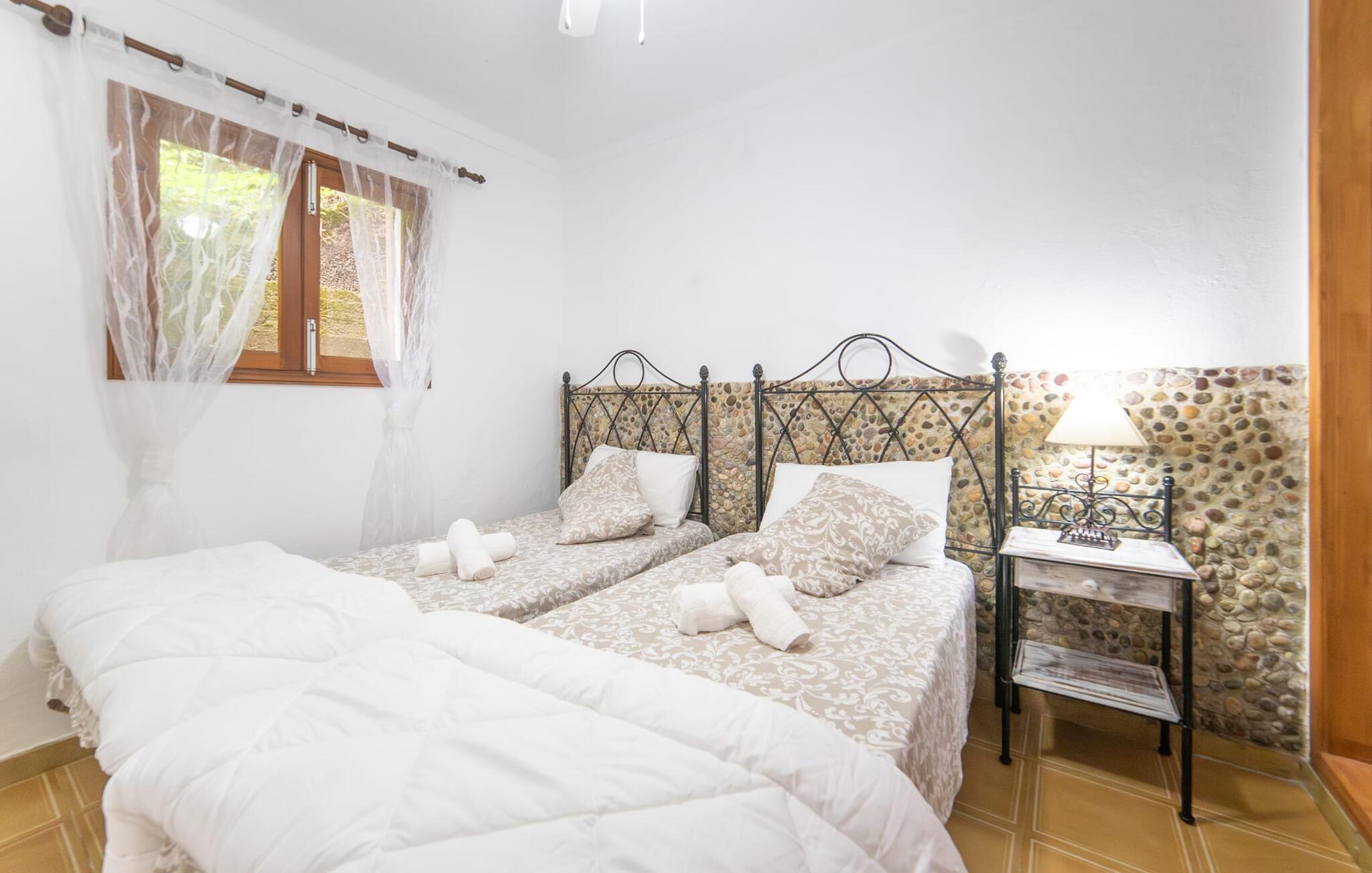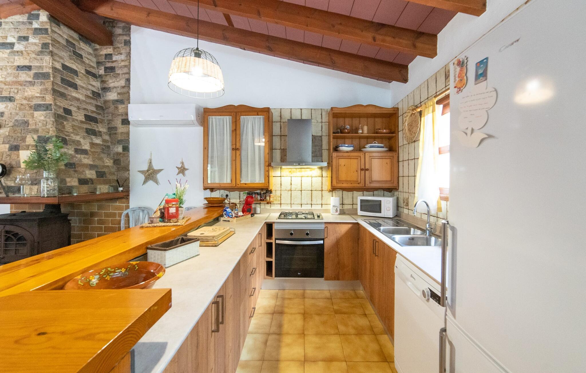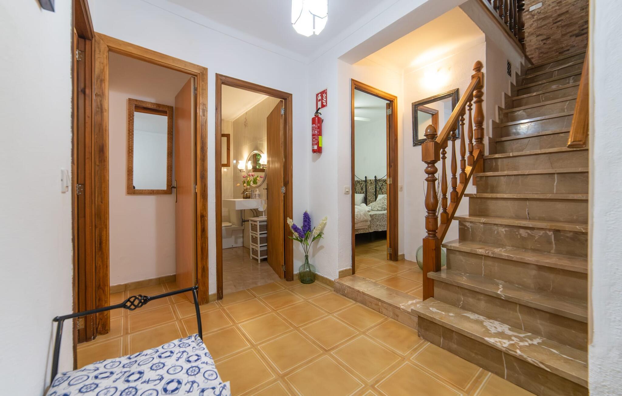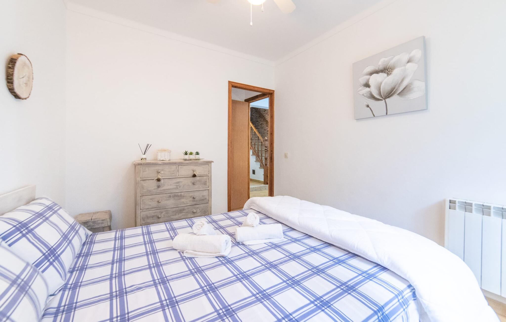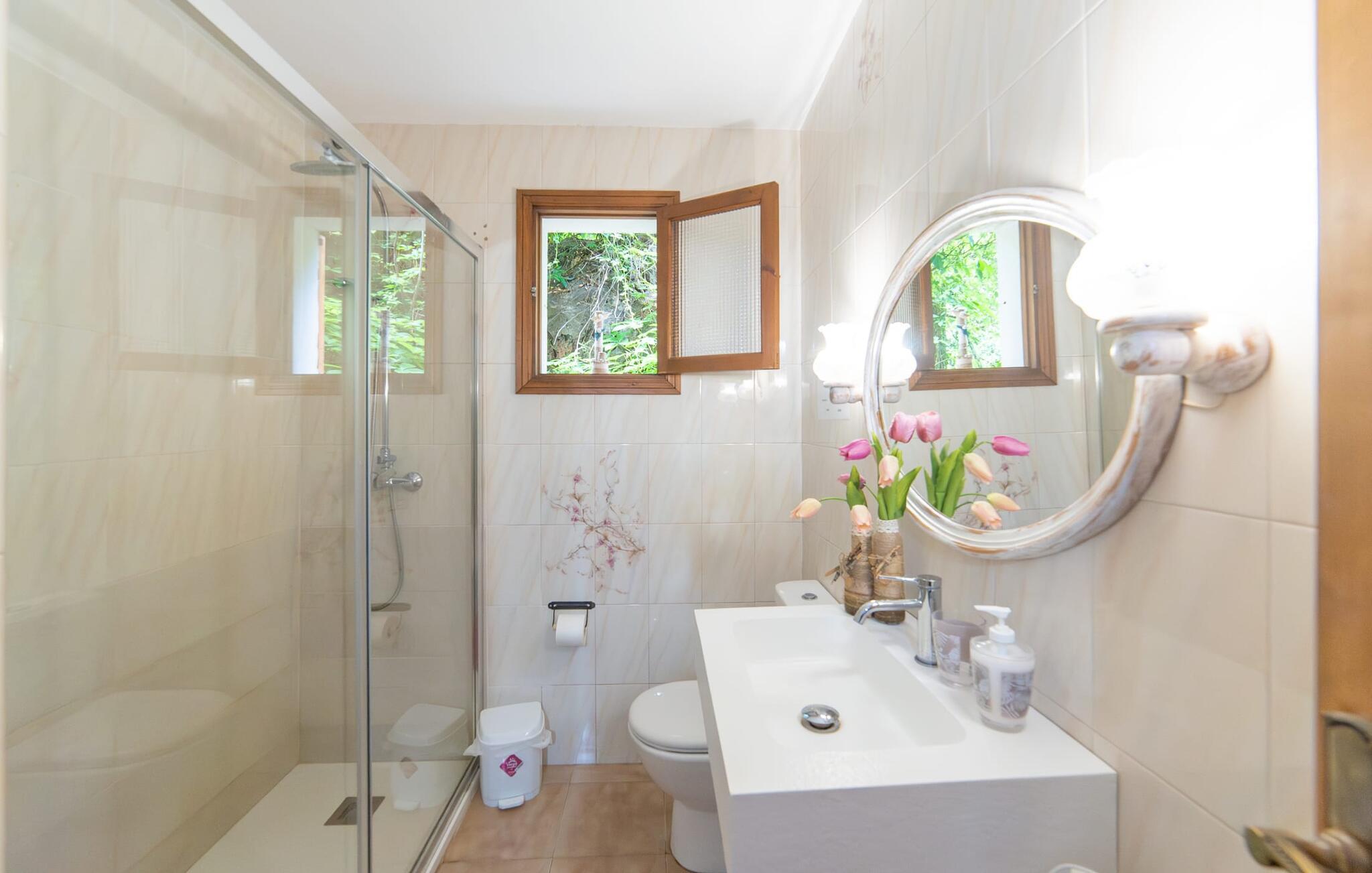 Bjerghytten "Cas Sito" i den nordlige del af Mallorca ligger i den vilde natur i Tramuntana-bjergene. Det giver jer den sjældne mulighed for at vågne op midt i et spektakulært verdensarvssted. Gamle oliventræer og frodige grønne planter danner en skyggefuld jungle omkring de afsondrede terrasser på bjergsidens ejendom, hvilket gør det nemt at slappe af. Selv i de varme sommermåneder. Adgang til ejendommen sker via en indkørsel og de to terrasser på forsiden af huset. Mens den første terrasse byder på en rustik spiseplads i skyggen af frodig vegetation, tilbyder den anden terrasse en fantastisk udsigt over den imponerende bjergfront. Haven byder på en muret grill, et solrigt, afskærmet område med liggestole og flere andre komfortable spisepladser. Indenfor strækker opholdsrummet sig over to plan. Hovedindgangen fører til det øverste niveau med en åben opholdsstue med pejs, spiseplads og et rummeligt, fuldt udstyret køkken. Området har varm/kold aircondition. En trappe fører jer ned til underetagen. Takket være beliggenheden på bjergsiden har de tre dobbeltværelser også udsigt til haven. De tre velholdte soveområder deler et moderne badeværelse med brus. Huset er udstyret med radiatorer, så vandrere og cyklister kan finde et hyggeligt fristed efter lange ture. Bjerghuset ligger på en bjergskråning med frodig natur i centrum af Tramuntana-bjergene i den nordlige del af Mallorca. Cala Tuent-bugten og dens restaurant ligger 13 minutters gang eller 3 minutter i bil. Der er interessante cykel- og vandreruter, for eksempel til reservoirerne Gorg Blau og Cúber.