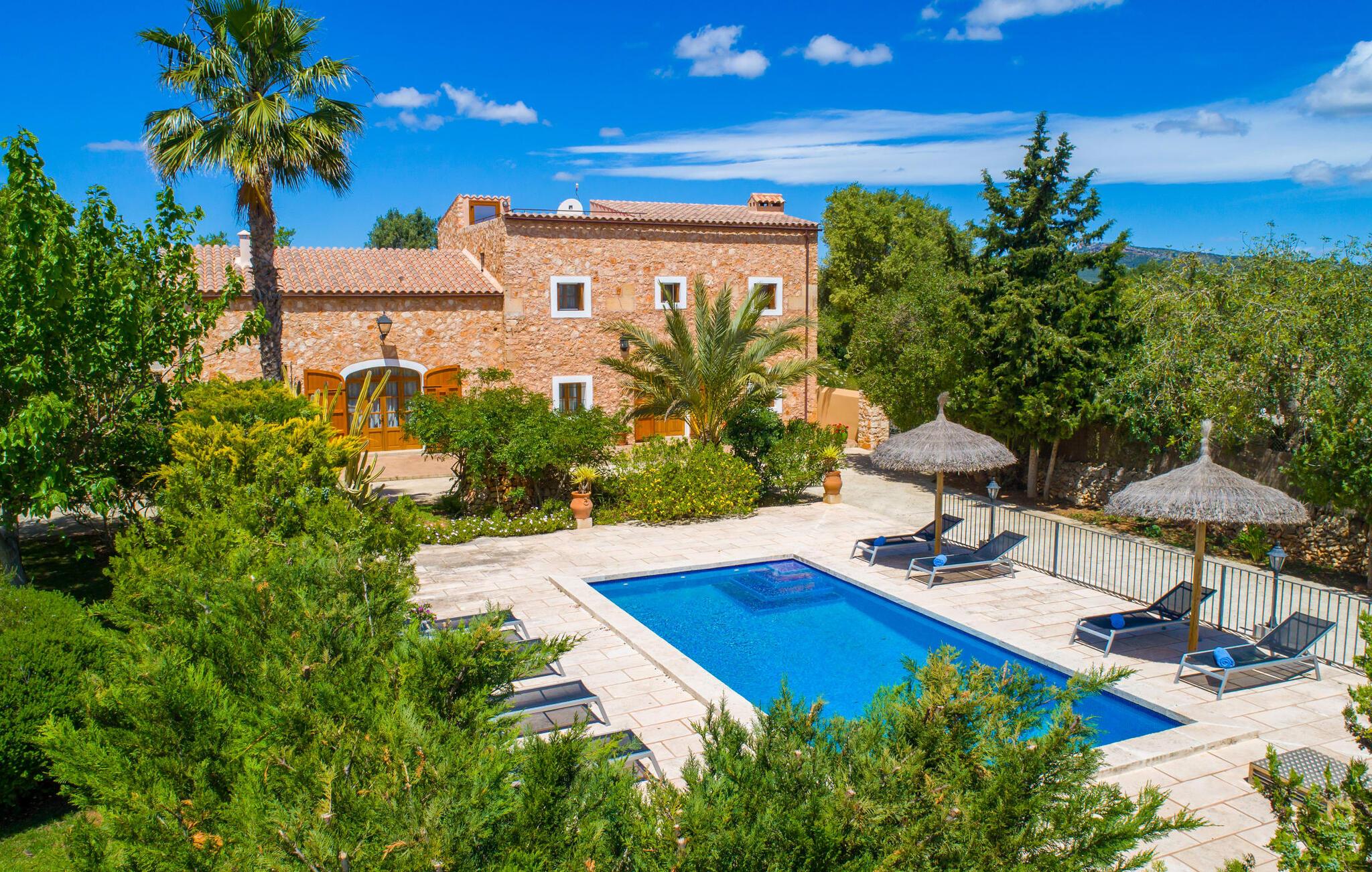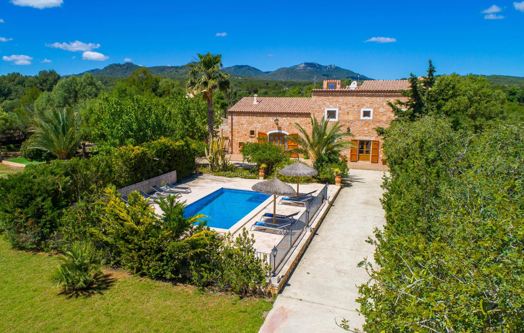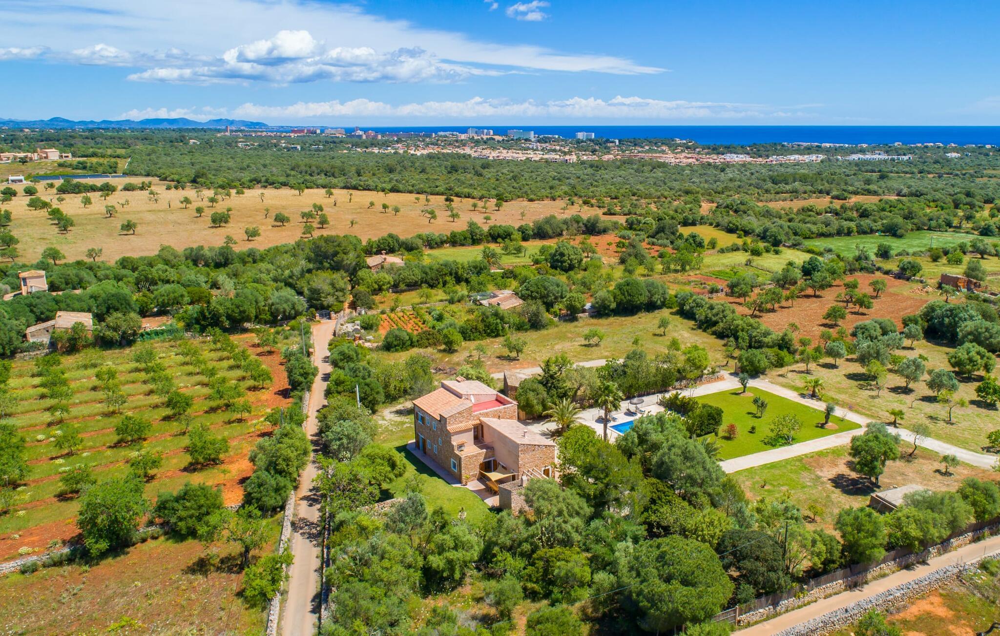 Villaen “Cas Verros” med dens imponerende indkørsel, der fører fra indgangsporten til villaen, står arkitektonisk ganske frækt i kontrast til de andre, mere traditionelt opførte mallorcanske villaer og henter i stedet inspiration fra naboøen Ibiza. Det er en kubistisk affære, med hvidkalkede massive stenvinduer og dørkarme, der fremhæver den ibizanske indflydelse. Derudover har ejendommen en meget smuk naturstensfacade, der rejser sig imponerende og giver villaen sit særligt maleriske udseende. Et stort terrasselandskab strækker sig over hele husets forside. Det smelter næsten problemfrit sammen i en solterrasse, som igen omgiver den 32 m² store pool. Terrasselandskabet afrundes af en forhøjet tagterrasse med en vidunderlig udsigt over poolen og den omkringliggende have og endda til havet. De udvendige finish er førsteklasses. Se venligst de udvendige billeder og liggestolene. Flere høje palmer runder harmonisk helhedsindtrykket af, og endnu en ærværdig træbestand giver behagelig naturlig skygge ved poolen. Der er et separat lille grillhus udenfor, som ligger i umiddelbar nærhed af poolen. Grillentusiaster vil få noget for pengene med denne installationsmulighed. Gå ind i villaen gennem en stor indgangsdør i massivt træ og ind i husets foyer. Vi fortsætter ind i opholdsstuen med spiseplads og køkken - naturligvis fuldt udstyret med vaskemaskine, opvaskemaskine, køleskab, tørretumbler og meget mere - og til de forskellige soveværelser, der alle er udstyret med aircondition. Villaen har fire soveværelser og byder på plads nok til op til otte gæster. Hvis I rejser med en baby, er en barneseng og en høj stol til rådighed. Huset byder også på fire badeværelser, hvoraf tre er en-suite. Derfor er privatlivets fred garanteret uden begrænsninger, selv når enheden er på fuld kapacitet. Villaen er smagfuldt indrettet overalt og opfylder jeres høje forventninger til luksus under en villaferie på Mallorca. Der er også aircondition, varme, satellit-tv og WiFi. Villaens indre er lige så høj kvalitet og udstyret med alle de nødvendige faciliteter som udearealet. Placeringen af villaen er perfekt for alle, der ønsker at tilbringe en helt afslappende ferie væk fra byens stress og jag. Beliggende i en rolig beliggenhed midt i et smukt landskab, er dette feriehus ideel til lange gåture eller udflugter i naturen. Entusiastiske vandrere får også noget for pengene. Og hvis I foretrækker noget lidt mere urbant, kan I nå det lille feriested Felanitx i bil på ingen tid. Uanset om det er restauranter, caféer og små butikker eller det traditionelle mallorcanske ugentlige marked - et besøg er det værd. Flere strande og en smuk havnepromenade kan hurtigt og nemt nås. Placeringen af denne ejendom er næsten uovertruffen i vores store portefølje. Villa "Cas Verros" modtager vores højeste anbefaling. Den smukke og meget moderne naturstensvilla "Cas Verros" ligger tæt på stranden og byder på udsigt over havet. Villaen er beliggende på den sydlige del af øen, ved porten til fiskerbyen Portocolom. Der er kun få minutters kørsel til den maleriske havnepromenade med barer, restauranter og supermarkeder. De lokale fine sandbugter (Calas de Mallorca) kan også nås hurtigt.
