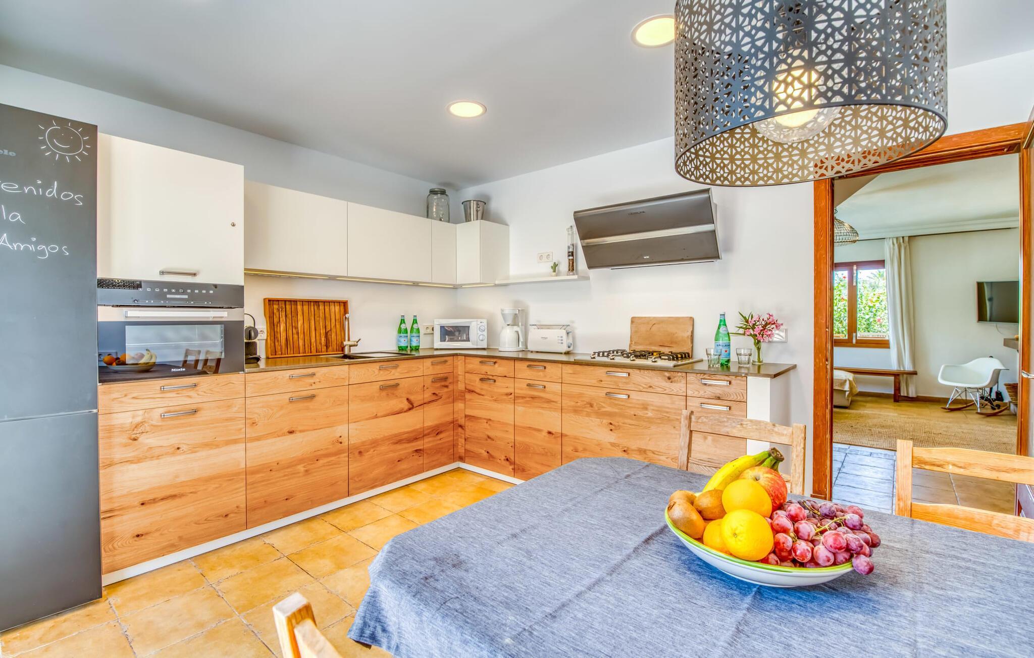 En række vidunderlige udendørs siddepladser, en privat pool og mulighed for at slentre til havet efter behag - alt dette og meget mere bliver til virkelighed i villaen "Casa Amigos". Terrassen lige ved siden af huset er indrammet af buer og behageligt luftig - et fantastisk morgenmadssted eller et skyggefuldt tilflugtssted efter et langt solbad. På den 650 m² store grund kan man sidde eller ligge under åben himmel mange andre steder, for eksempel ved poolen, der - tilgængelig via en bred trappe - inviterer til afkøling i ny og næ. Hvis det er nødvendigt, kan du også nyde varmt vand i den praktiske udendørs bruser - en velkommen udendørs bruser efter et besøg på stranden. Det smukke spisebord foran køkkenet scorer point med sine korte afstande til borddækning. Tagterrassen med lounge, stole og liggestole byder på en vid udsigt. Dette er et Fincallorca feriehus. Husets indretning er stilfuldt hyggeligt, med lyse vægge, gulve og tekstiler, smagfulde møbler og nøje og nænsomt udvalgte dekorationer. I den rummelige stue er der plads til omfattende afslapning med gode samtaler eller knitren fra pejsen om aftenen. I det flotte spisekøkken finder du fuldt udstyret køkken og dekorative skabsfronter i træ samt spiseplads. Der er også to indbydende dobbeltværelser og et badeværelse på denne stueetage. Et af disse soveværelser er også en gennemgang til vaskerummet. På øverste etage er der yderligere to soveværelser, som igen deler et badeværelse. To små familier eller par kunne sagtens dele de to etager. Aircondition og loftsventilatorer sikrer behagelige temperaturer i alle rum selv om natten. Villaen "Casa Amigos", "Vennernes Hus" - et charmerende tilflugtssted ved havet for op til seks feriegæster. Den charmerende villa "Casa Amigos" er beliggende i en urbanisering nær Cala Llombards på Mallorcas sydspids. På grund af sin beliggenhed på en lille gade, kan forskellige linjer nemt nås. Santanyi ligger kun 7 km væk, hvor du vil finde adskillige supermarkeder, butikker, restauranter og barer. Ikke langt fra Santanyi ligger Cap de Ses Salines, som markerer Mallorcas sydligste punkt. Indbydende strande såsom Calo des Moro eller Cala Llombards ligger kun 1 til 2 km væk.