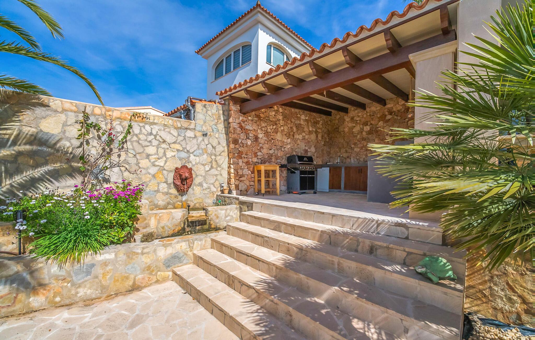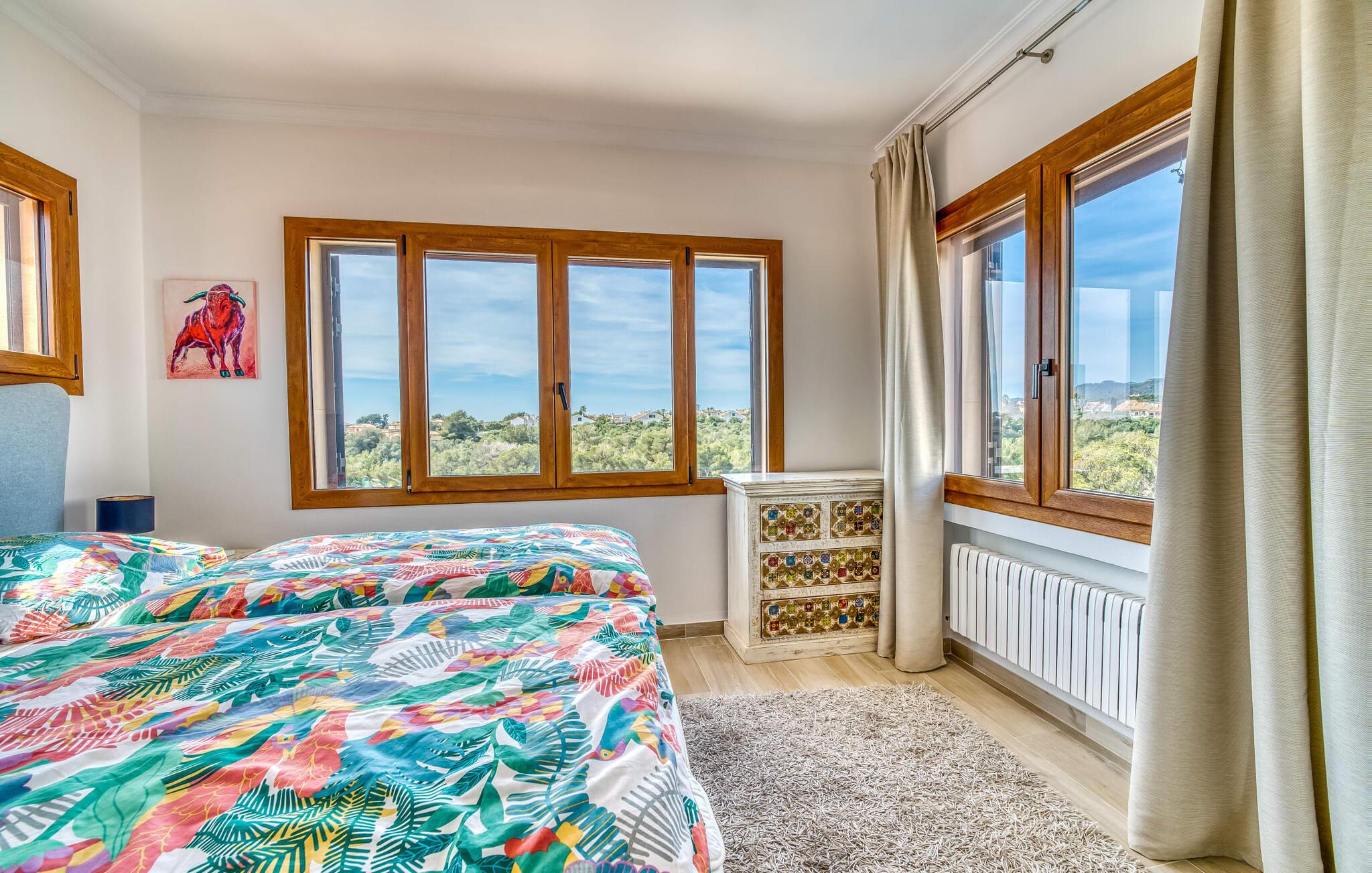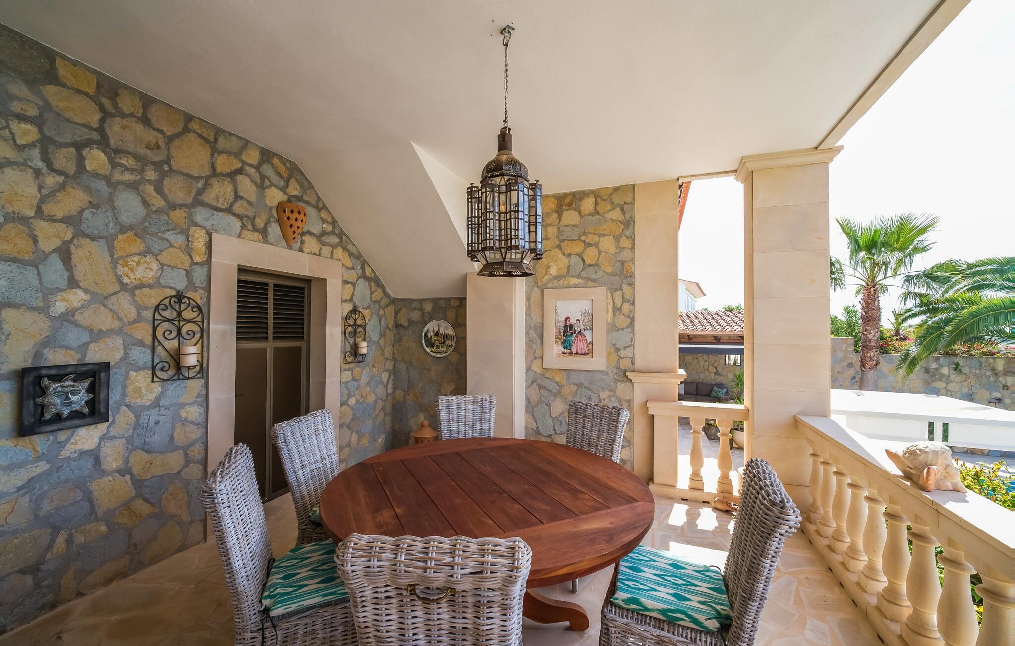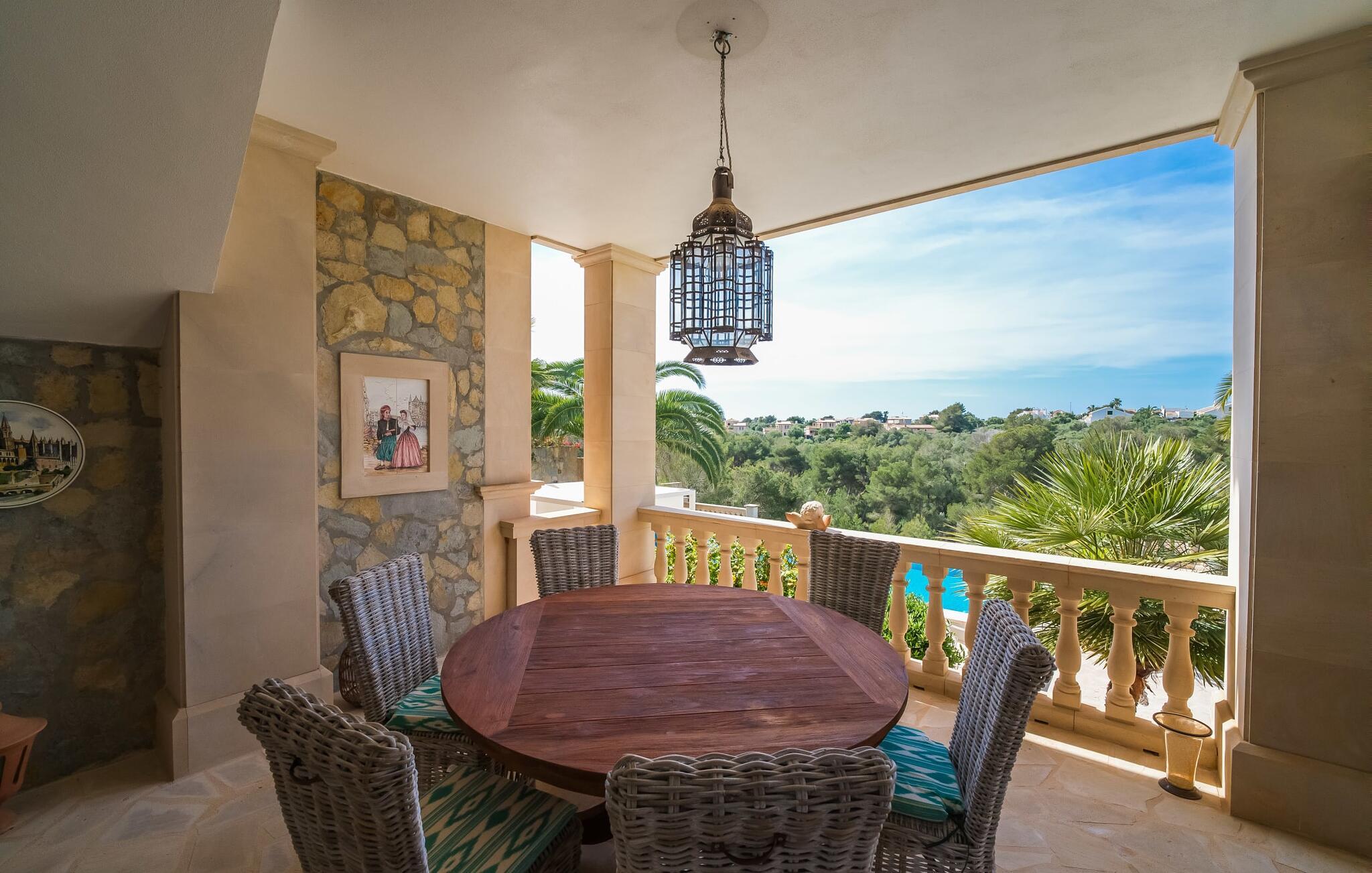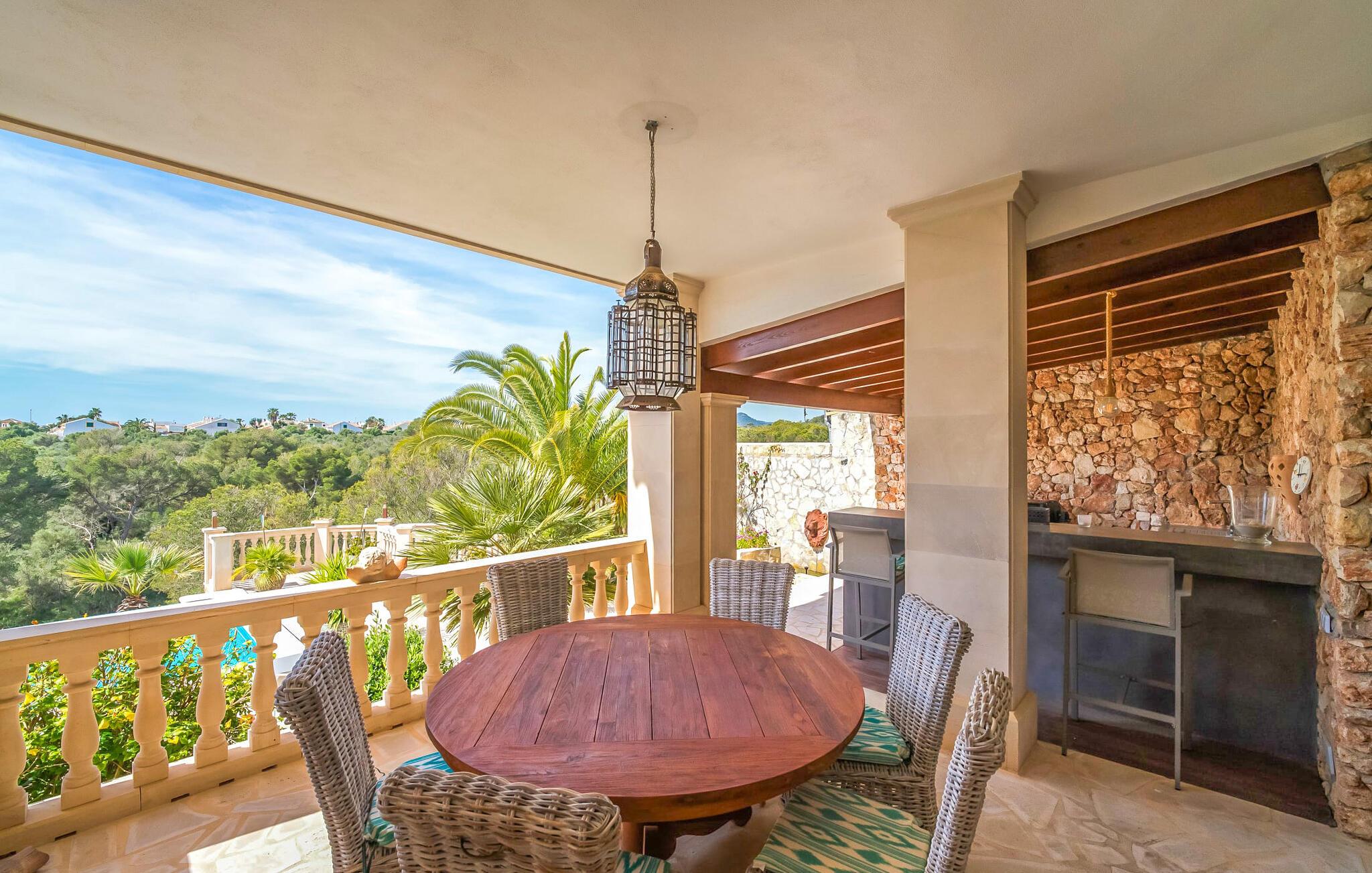 Oplev paradis i den luksuriøse villa "Casa Crefeld Vall d'Aran 21". Denne fantastiske ejendom har et smukt anlagt udendørs område, der er indbegrebet af mallorcansk luksus, komplet med palmer og en betagende udsigt. Nyd den klorfrie infinity-pool med komfortable liggestole og slap af i det udsøgt møblerede overdækkede loungeområde. Det fuldt udstyrede udekøkken med opvaskemaskine, gaskomfur og mobil gasgrill gør selvforplejning til en fornøjelse. To overdækkede terrasser med spisepladser på forskellige niveauer giver god plads til sammenkomster. Ideel til familier eller venner, denne villa ligger tæt på stranden og tilbyder en unik blanding af stil og komfort. Indenfor finder I en hyggelig stue med pejs og spiseplads, som åbner ud til en solrig altan. Det trendy udstyret køkken opfylder de høje standarder for en førsteklasses mallorcansk villa. Privatliv kommer først i denne fuldt klimatiserede bolig. De smukt designede værelser er spredt over forskellige niveauer og har hver et moderne badeværelse. Fordyb jer i en fantastisk atmosfære i "Casa Crefeld Vall d'Aran 21" og nyd en ferie fuld af afslapning og nydelse i det autentiske sydlige Mallorca. Omgivet af palmer og med udsigt over fyrreskoven troner den adelige villa "Casa Crefeld Vall d'Aran 21" over den smukke landsby Cala Murada på det sydlige Mallorca. Indkøbsmuligheder kan findes i det nærliggende landsbycenter. Stranden af samme navn ligger kun 1,7 km væk. Andre dele af det naturligt smukke Calas de Mallorca, herunder Sa Marçal, er omkring 15 minutter væk.